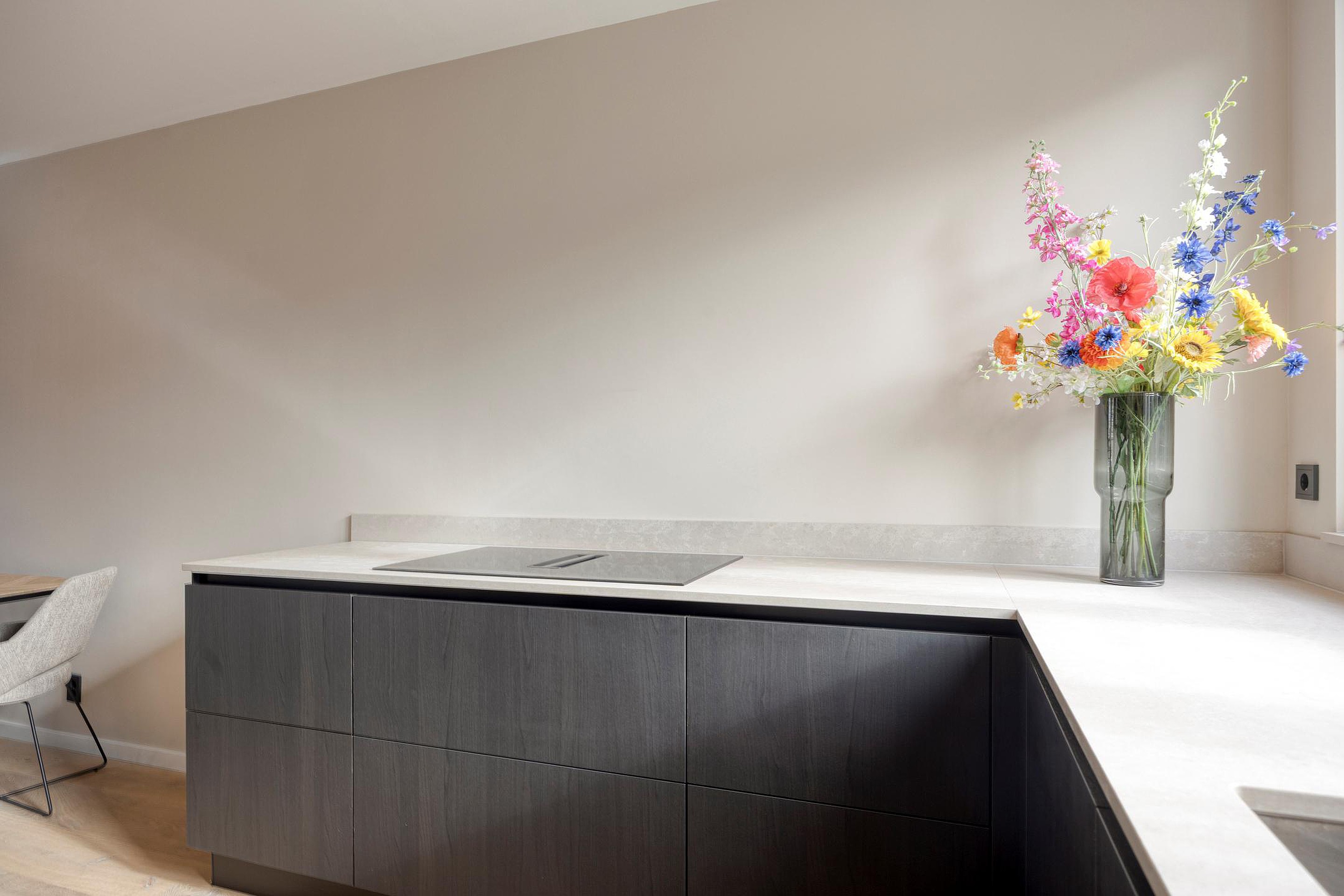 Aan de achterzijde ligt de vernieuwde open keuken (2024), modern uitgevoerd en compleet met diverse inbouwapparatuur en geïntegreerde afzuiging. Vanuit de hal stap je zo de tuin in.