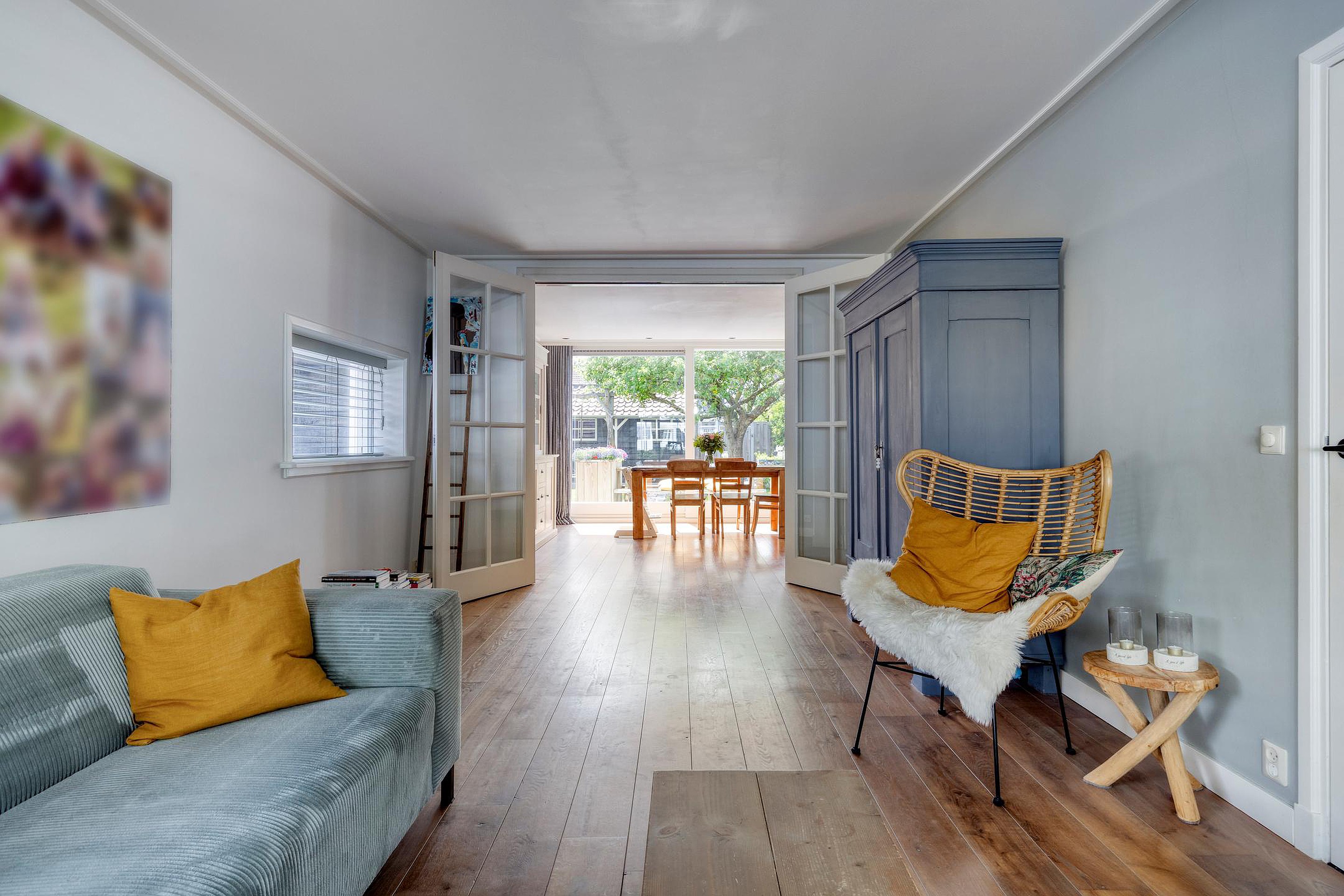 De royale woonkamer en eetkamer zijn voorzien van een sfeervolle houten vloer en grote raampartijen met HR++ beglazing, wat zorgt voor veel lichtinval.
