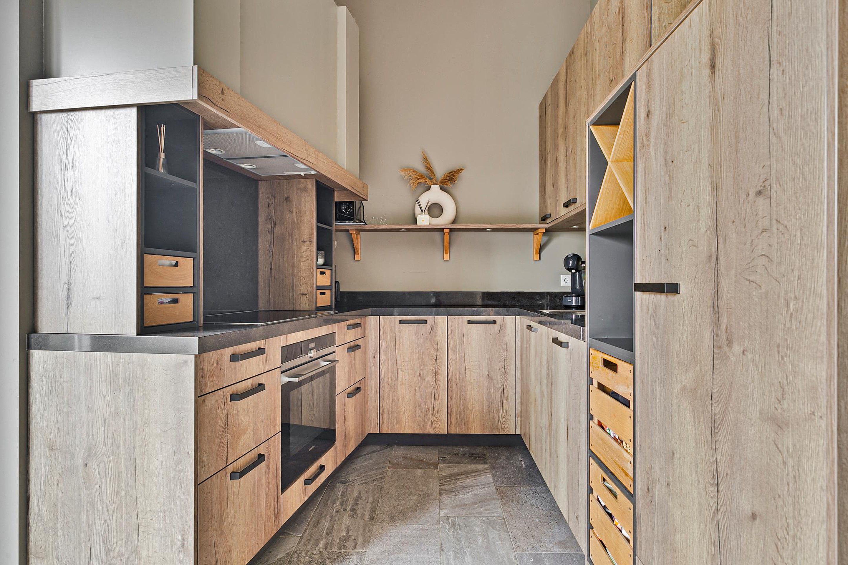 De luxe U-vormige keuken is een heerlijke plek voor iedereen die van koken houdt. Voorzien van o.a. een inductiekookplaat, vaatwasser en veel kast- en werkruimte. Dankzij de open indeling houd je altijd contact met je gezelschap.