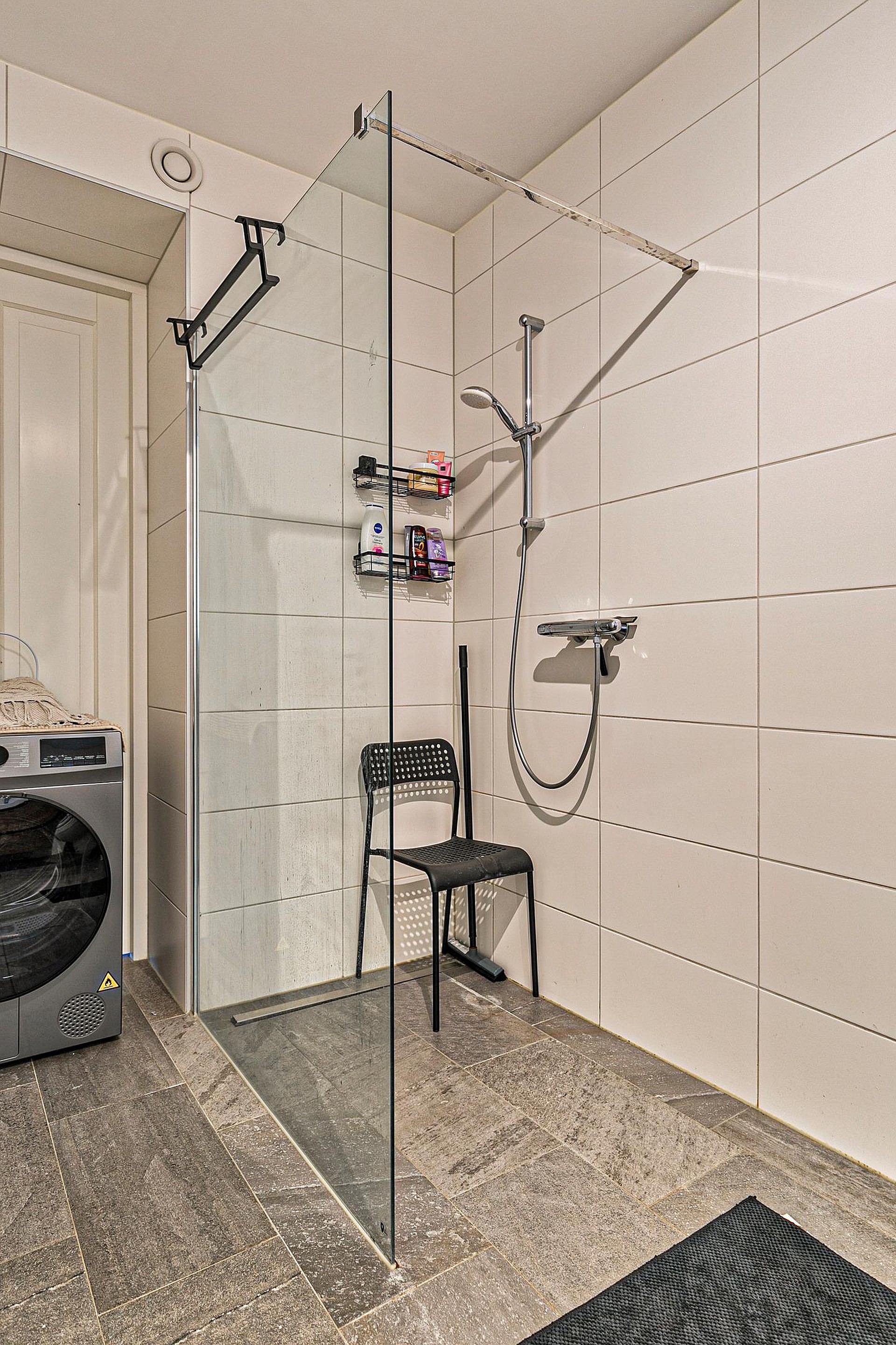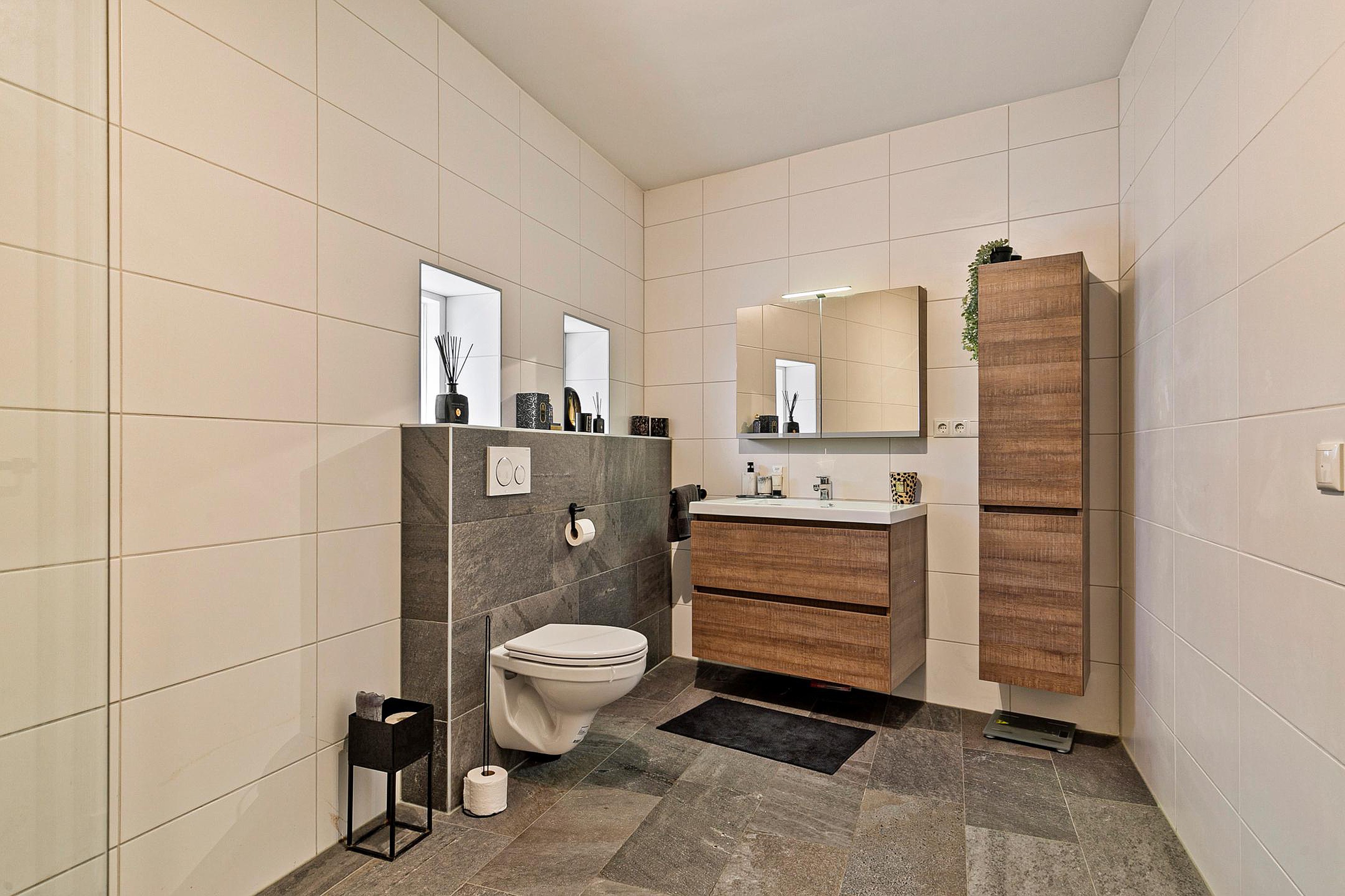 De moderne badkamer is strak afgewerkt en uitgerust met een ruime inloopdouche, een stijlvol badkamermeubel en een tweede toilet.