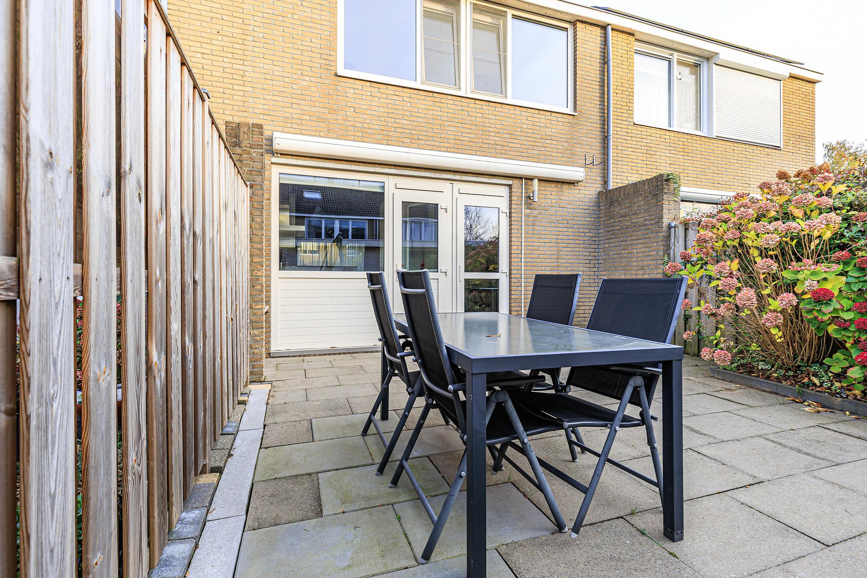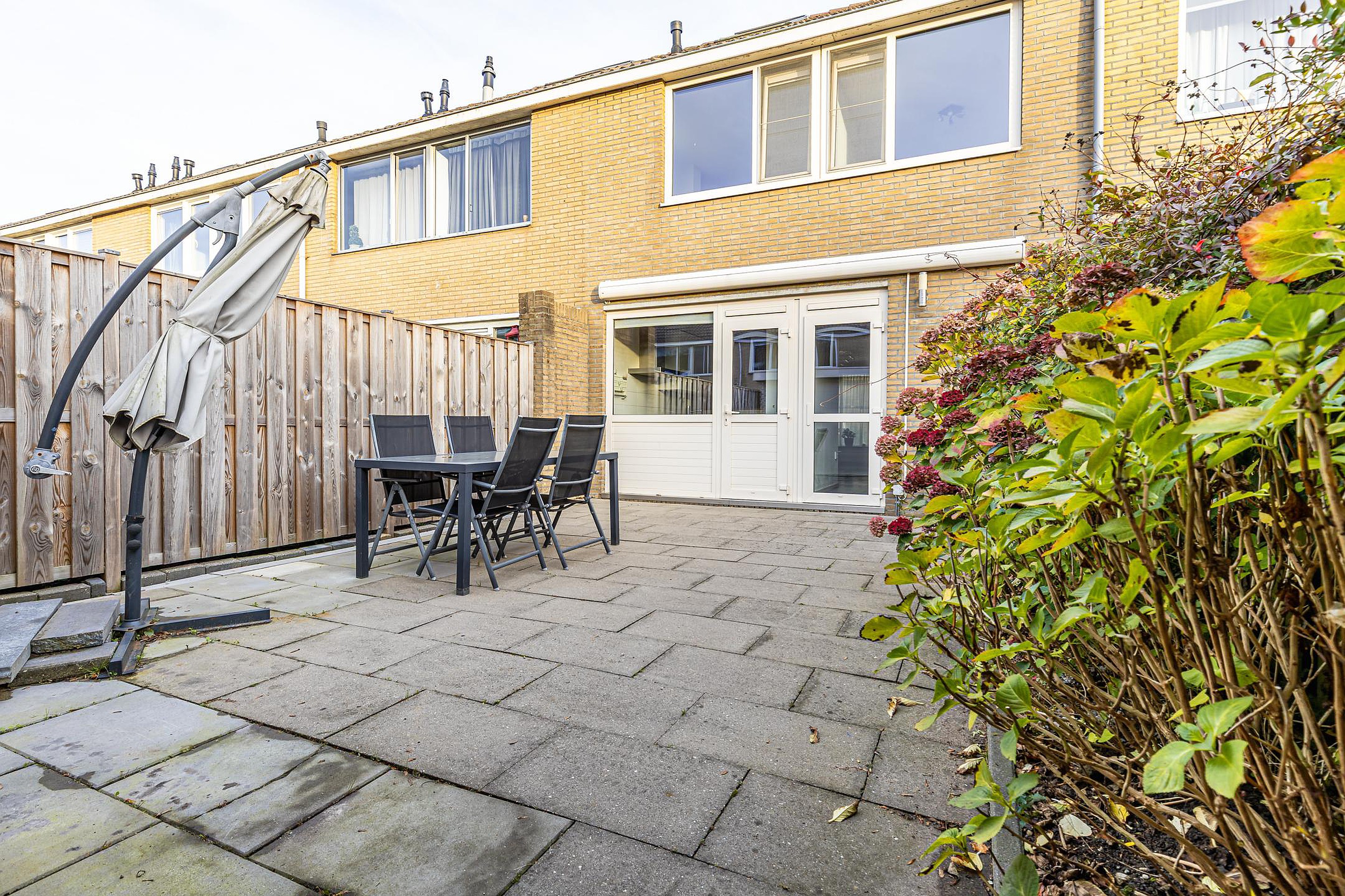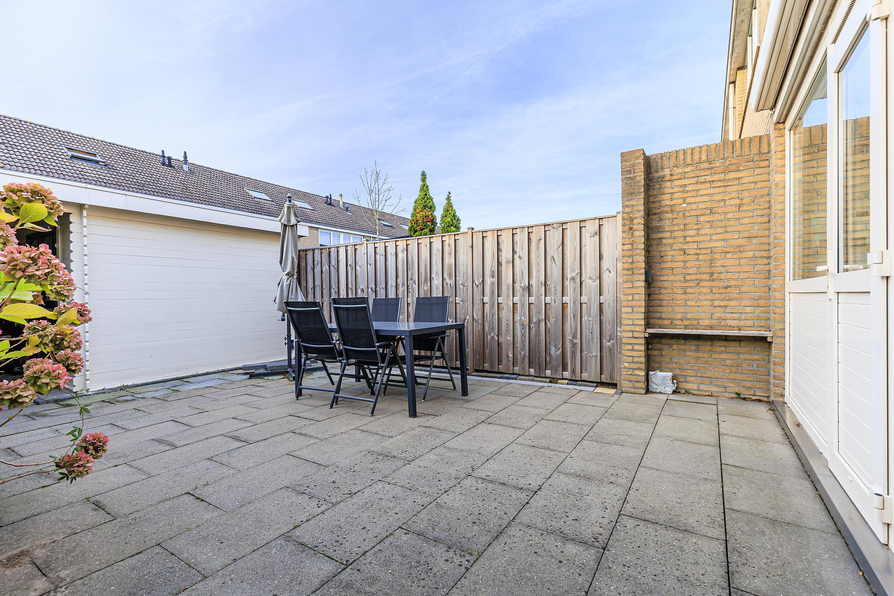 De achtertuin op het westen is verzorgd aangelegd en beschikt over een overkapping, stenen berging en achterom. Dankzij de ligging op het westen geniet je hier van de middag- en avondzon — ideaal voor lange zomeravonden. Aan de voorzijde van de woning ligt een groen speelveld, waar kinderen veilig kunnen spelen en waar je vrij uitzicht hebt.