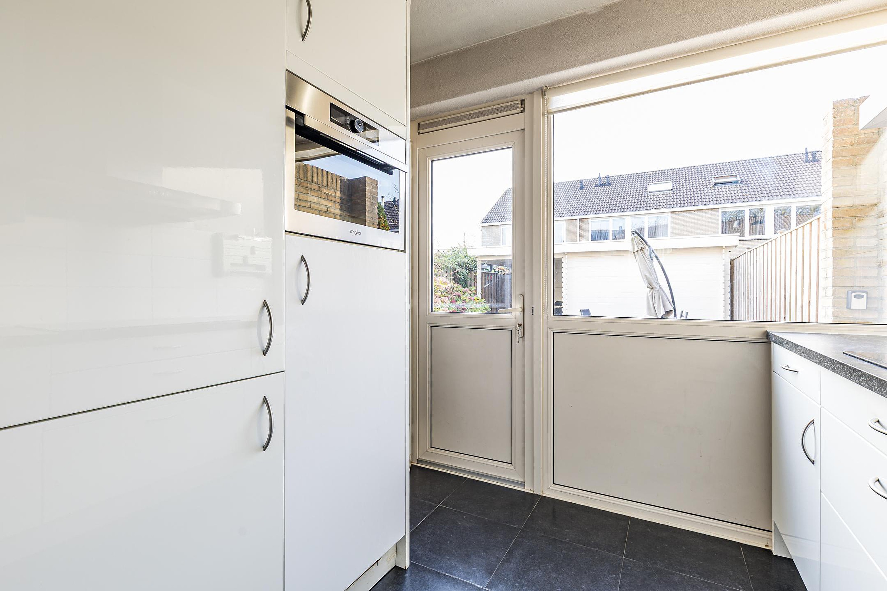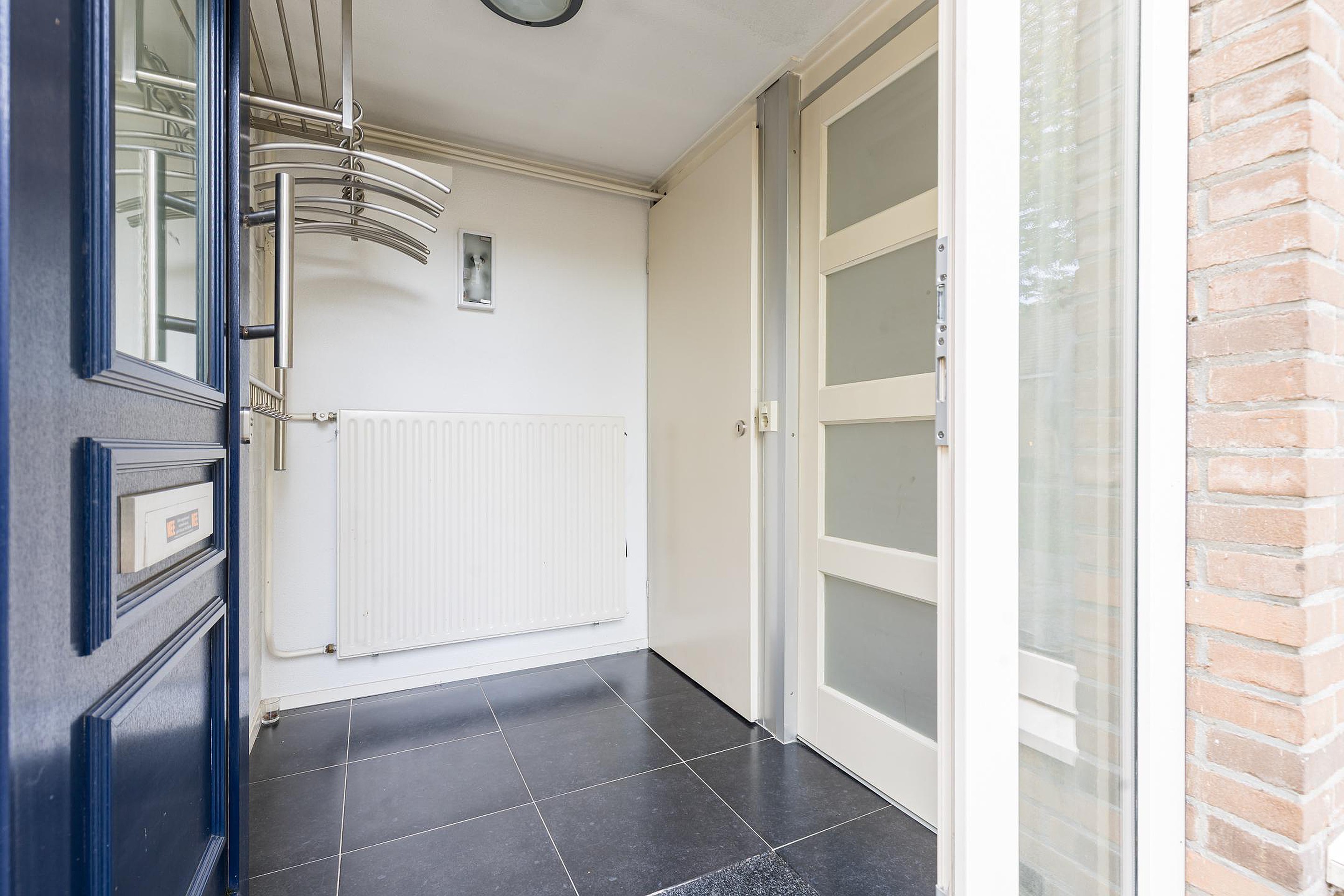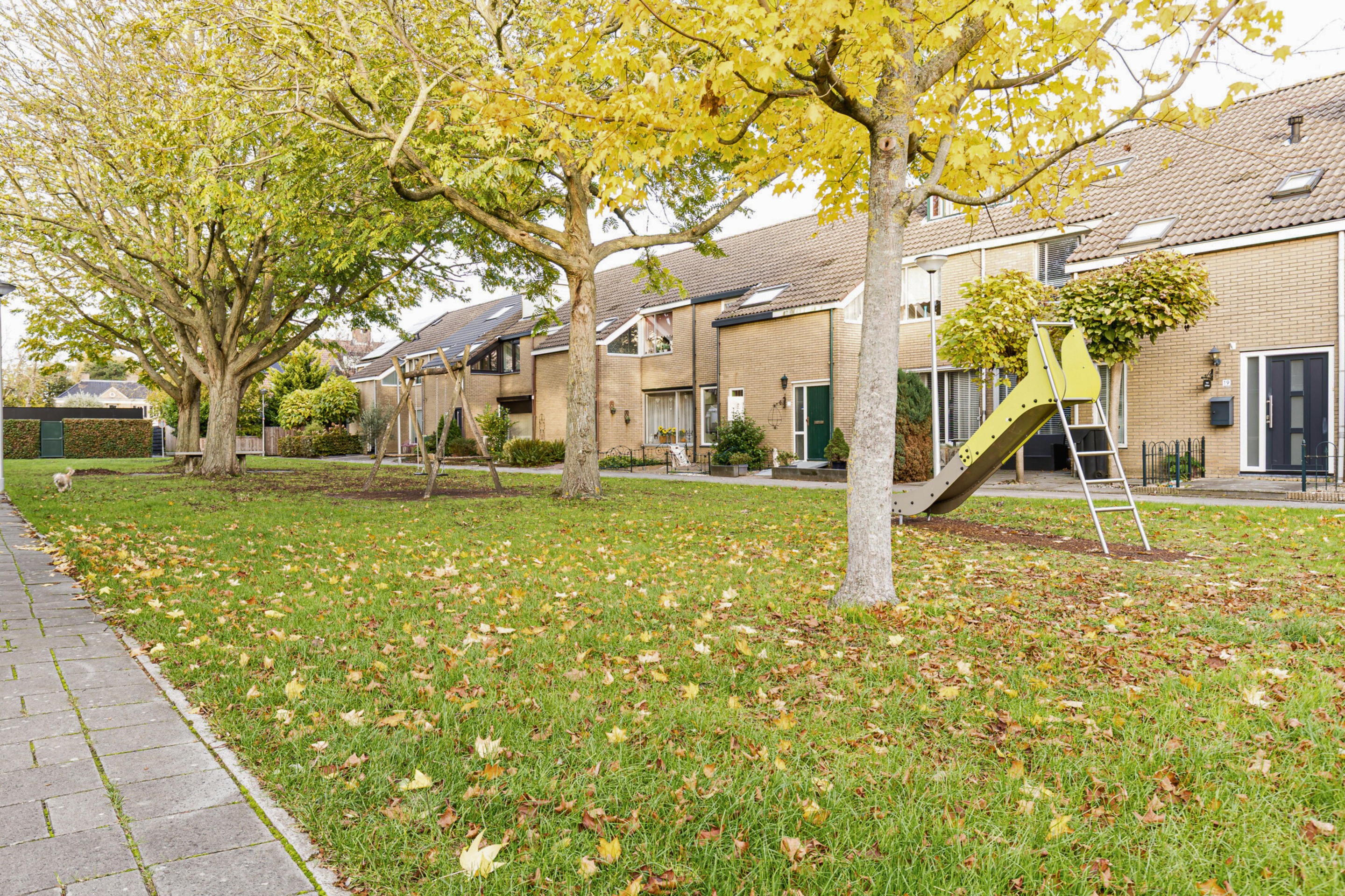 De achtertuin op het westen is verzorgd aangelegd en beschikt over een overkapping, stenen berging en achterom. Dankzij de ligging op het westen geniet je hier van de middag- en avondzon — ideaal voor lange zomeravonden. Aan de voorzijde van de woning ligt een groen speelveld, waar kinderen veilig kunnen spelen en waar je vrij uitzicht hebt.