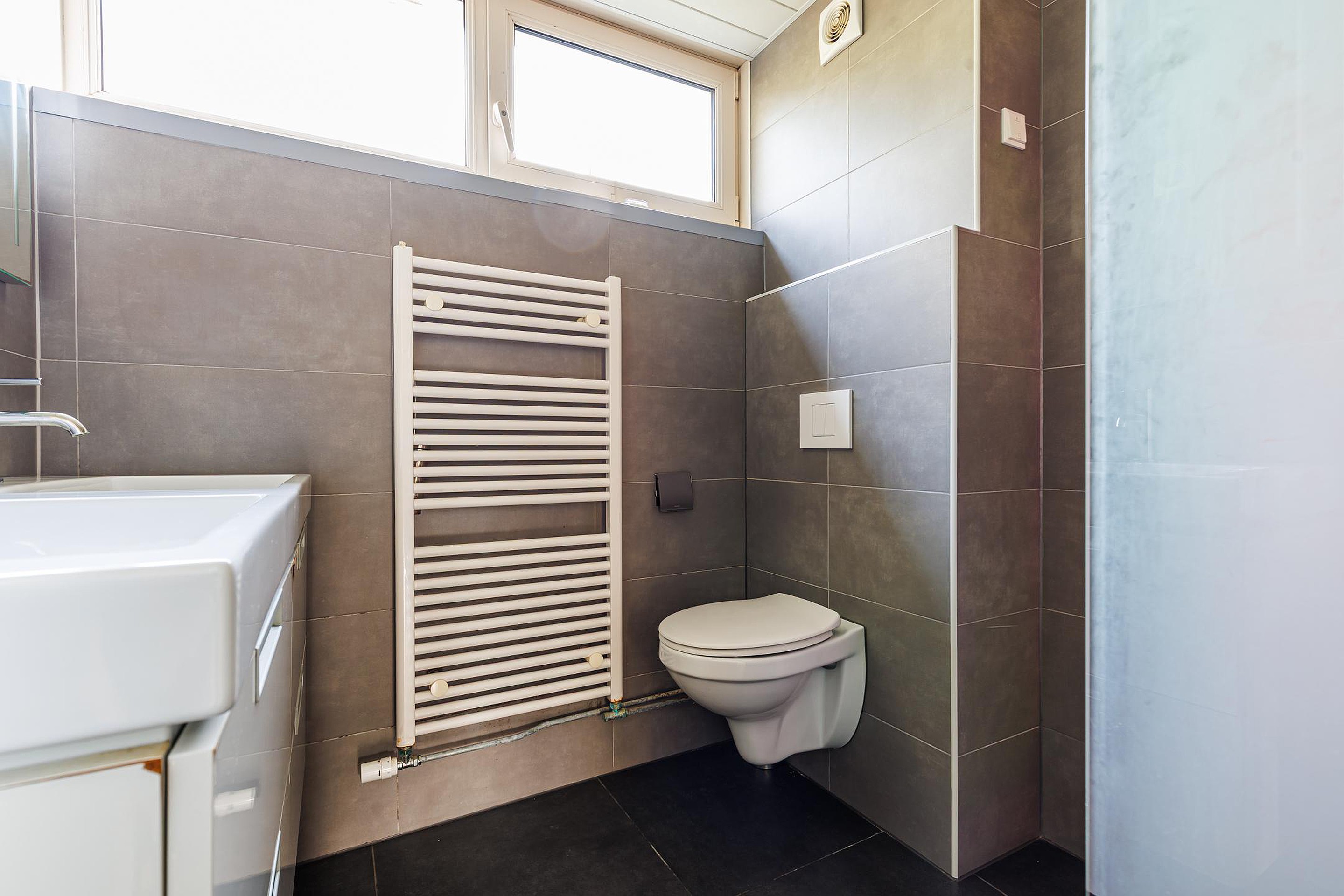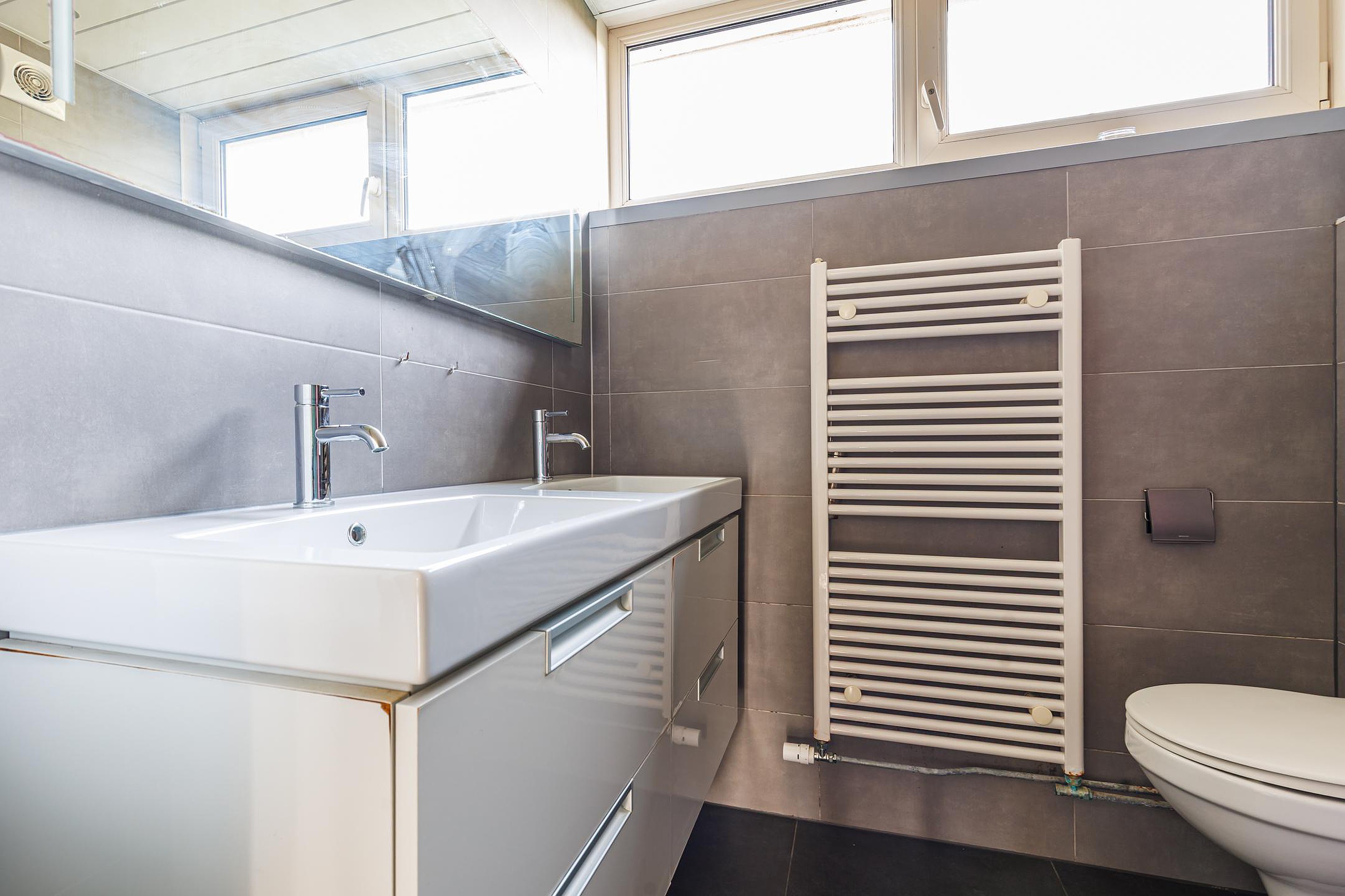 De overloop biedt toegang tot drie goed bemeten slaapkamers en de badkamer. Deze is modern uitgevoerd en uitgerust met een ruime inloopdouche, toilet, dubbele wastafel met meubel, verlichte spiegel, handdoekradiator en een verlaagd plafond met inbouwspots.