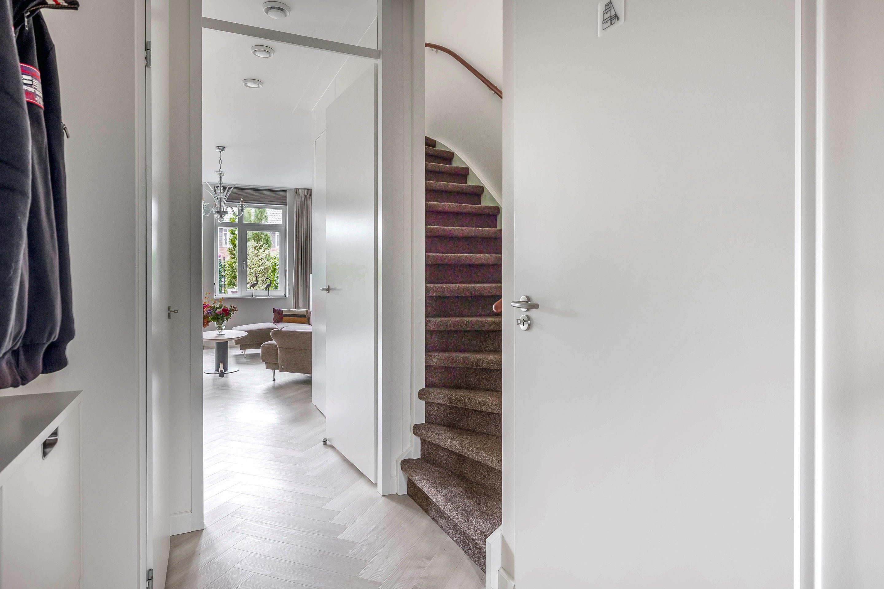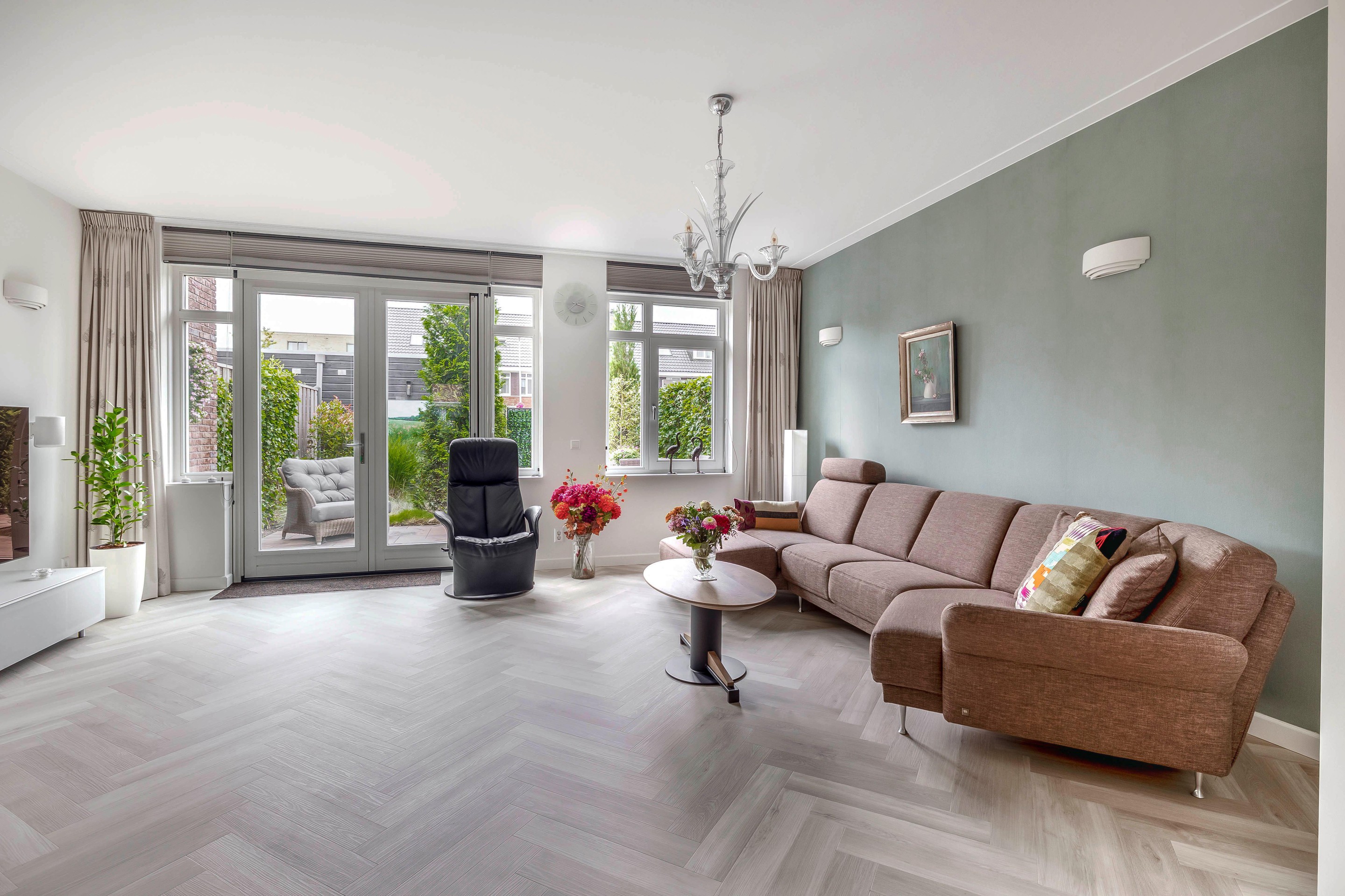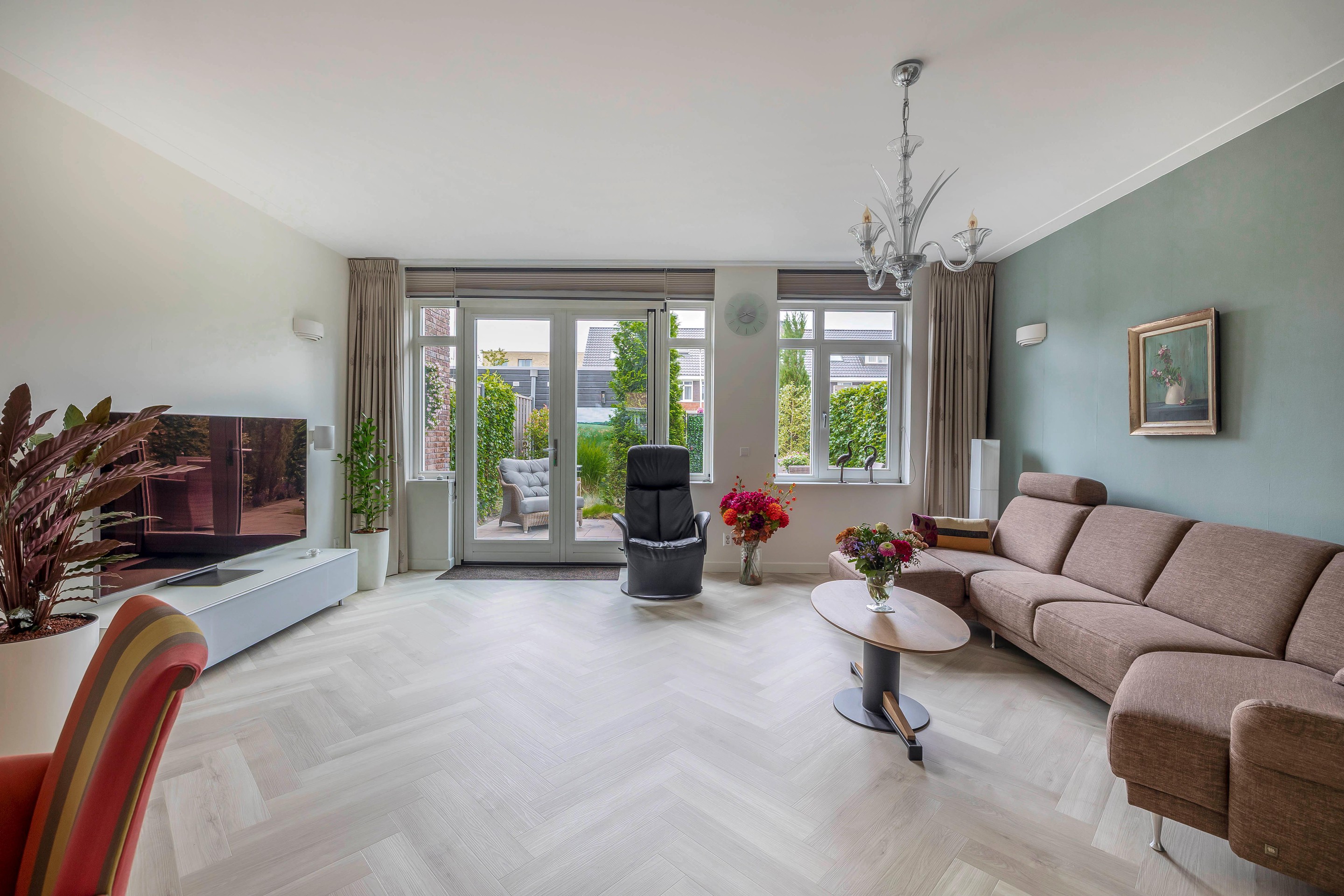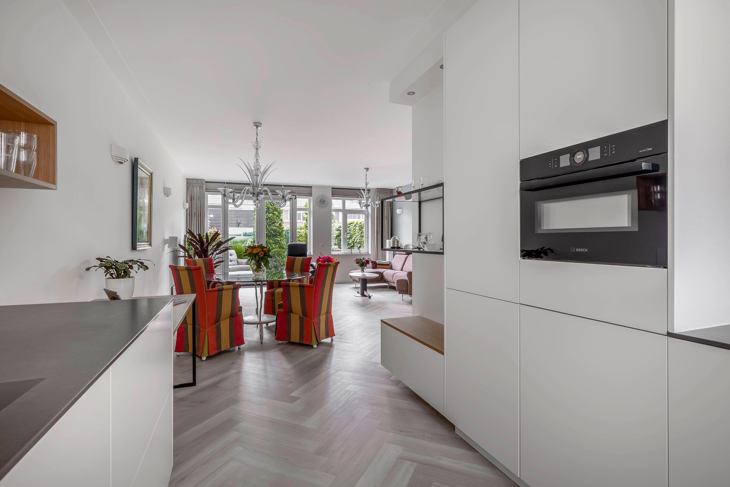 Bij binnenkomst in de woonkamer valt de hoeveelheid ruimte en licht direct op. De ruime woonkamer ligt aan de achterzijde van de woning en is voorzien van een uitbouw van 1,2 meter. De dubbele openslaande deuren leiden naar de tuin op het zuiden met een ruim terras. De trapkast is voorzien van een greeploze deur in de stijl van de ambachtelijke maatwerk keuken.