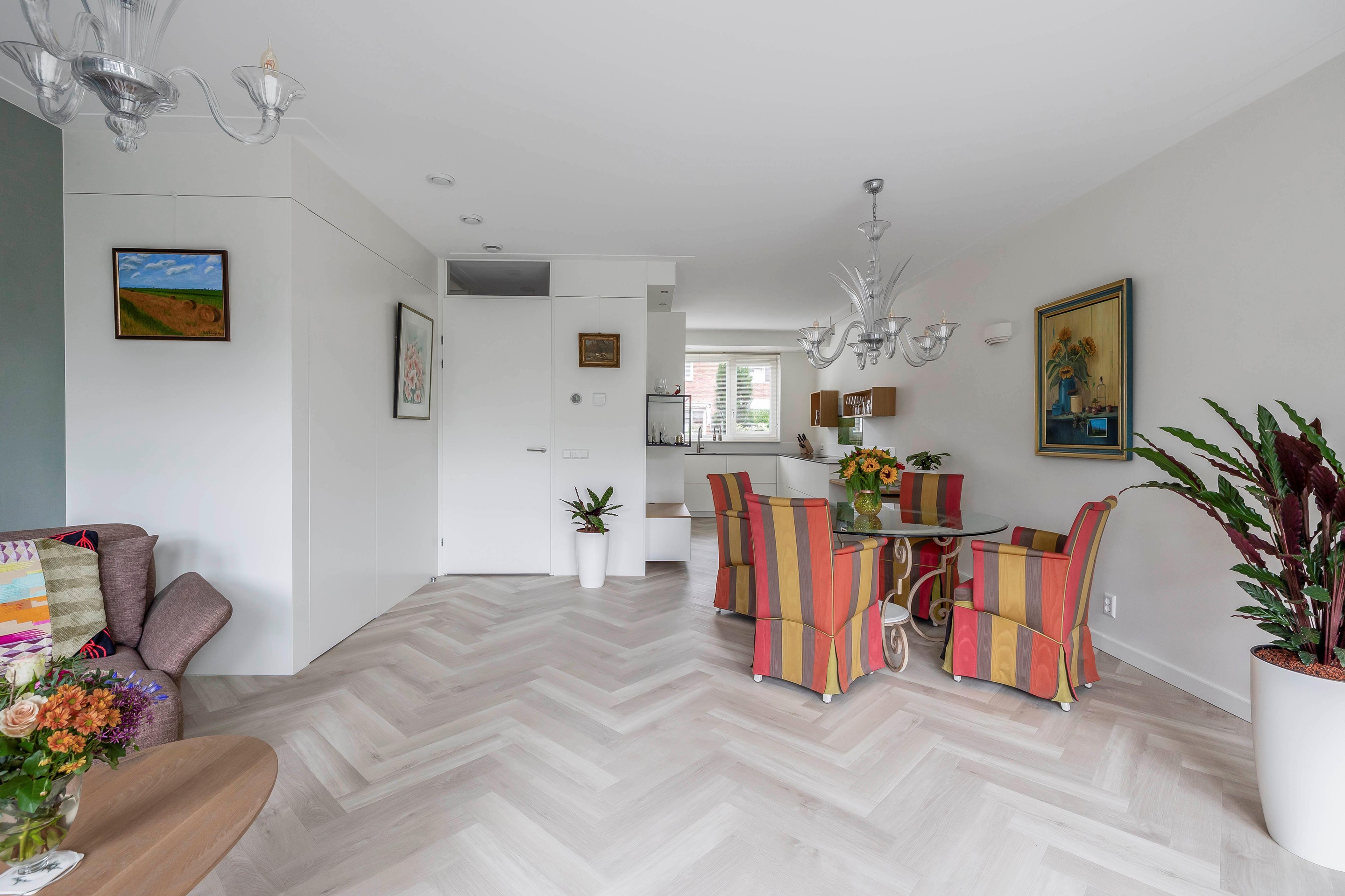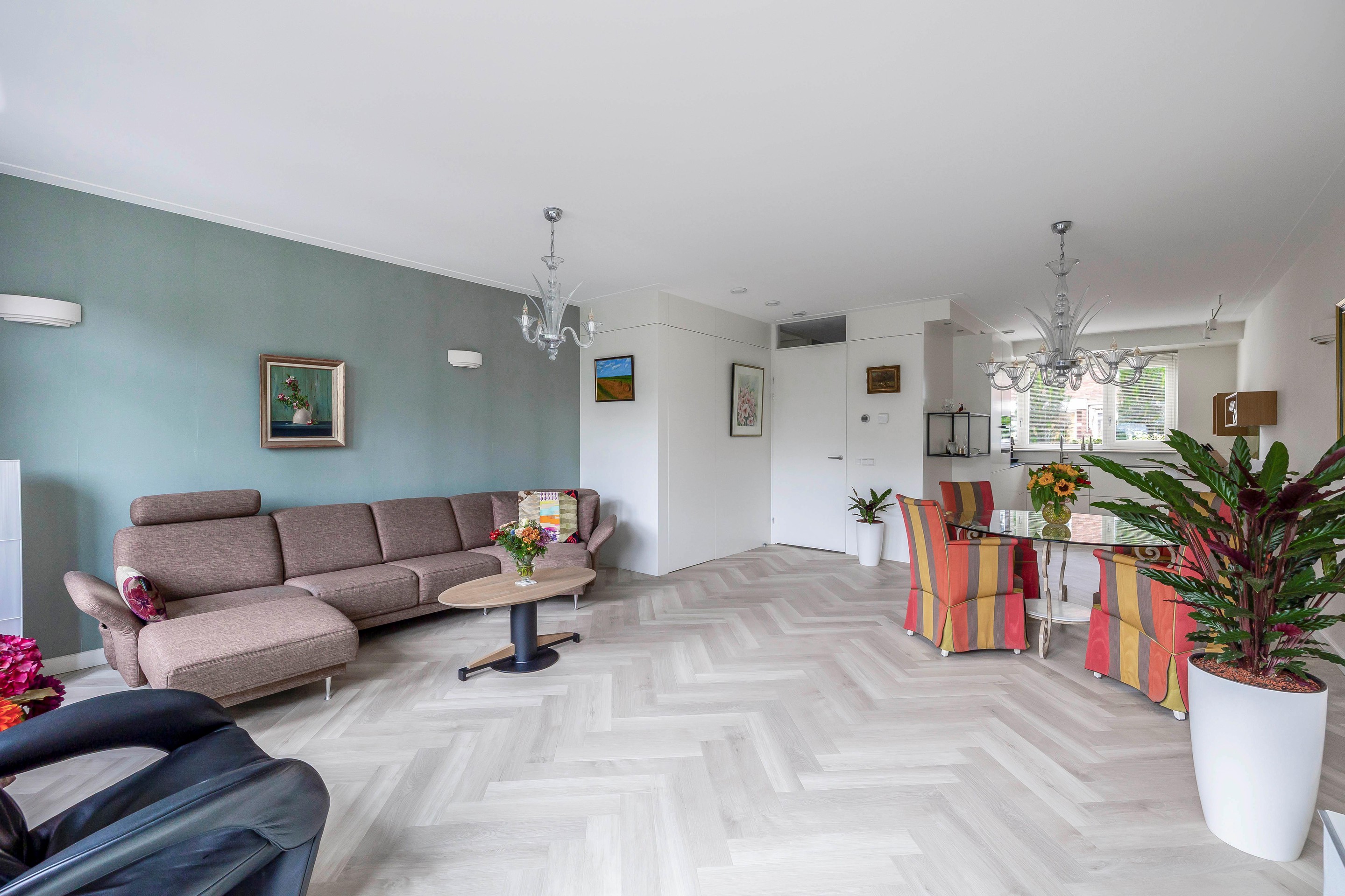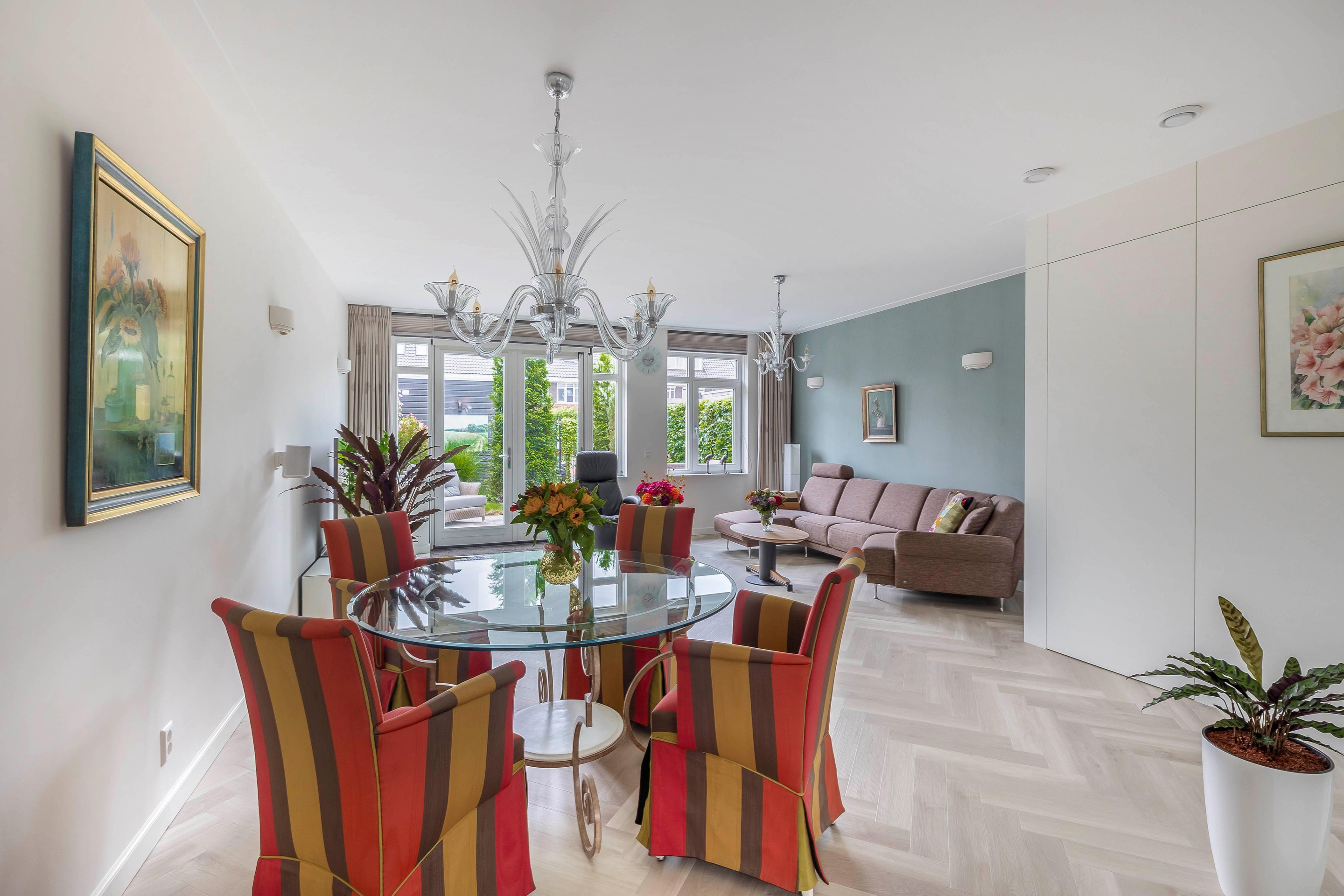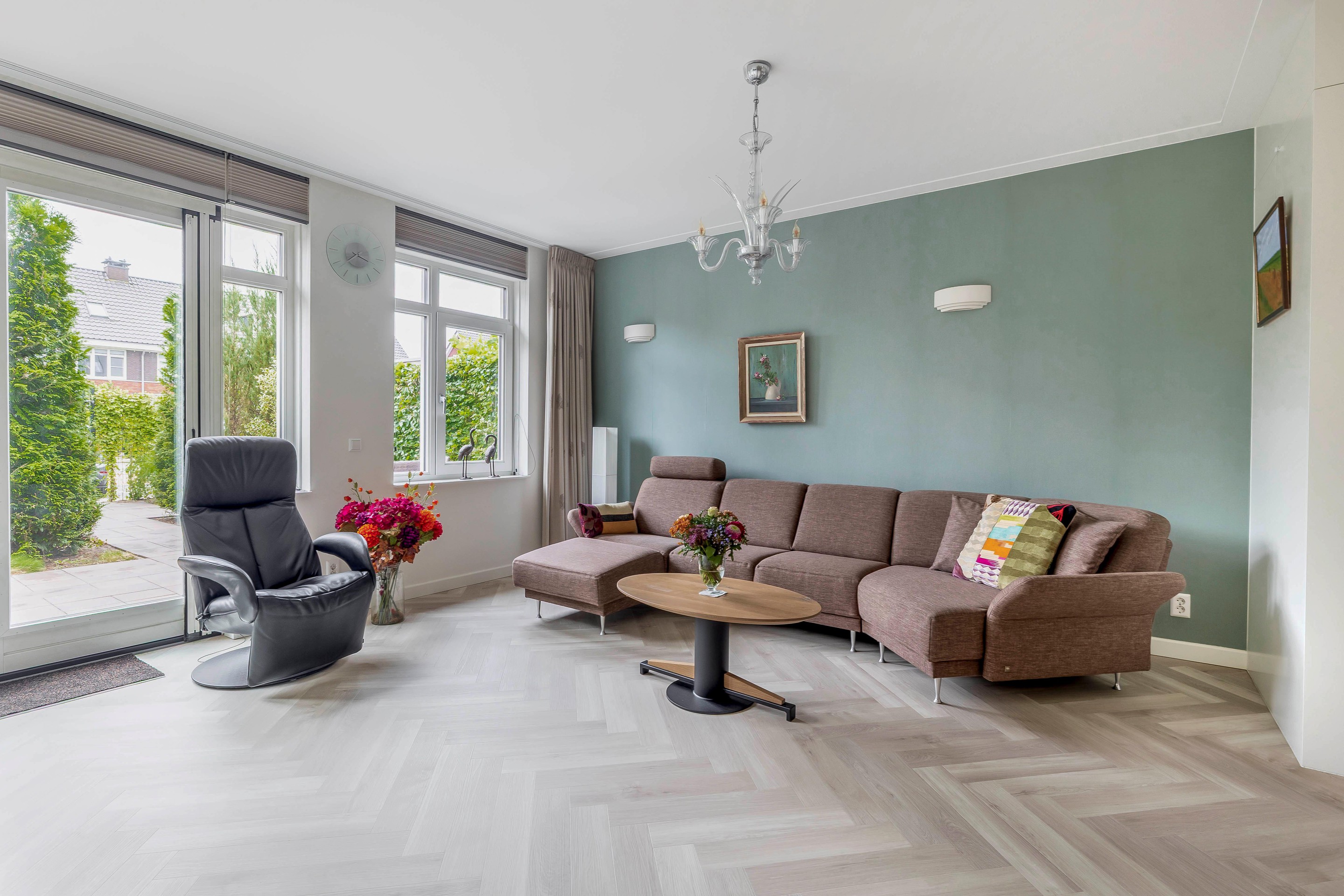 Bij binnenkomst in de woonkamer valt de hoeveelheid ruimte en licht direct op. De ruime woonkamer ligt aan de achterzijde van de woning en is voorzien van een uitbouw van 1,2 meter. De dubbele openslaande deuren leiden naar de tuin op het zuiden met een ruim terras. De trapkast is voorzien van een greeploze deur in de stijl van de ambachtelijke maatwerk keuken.