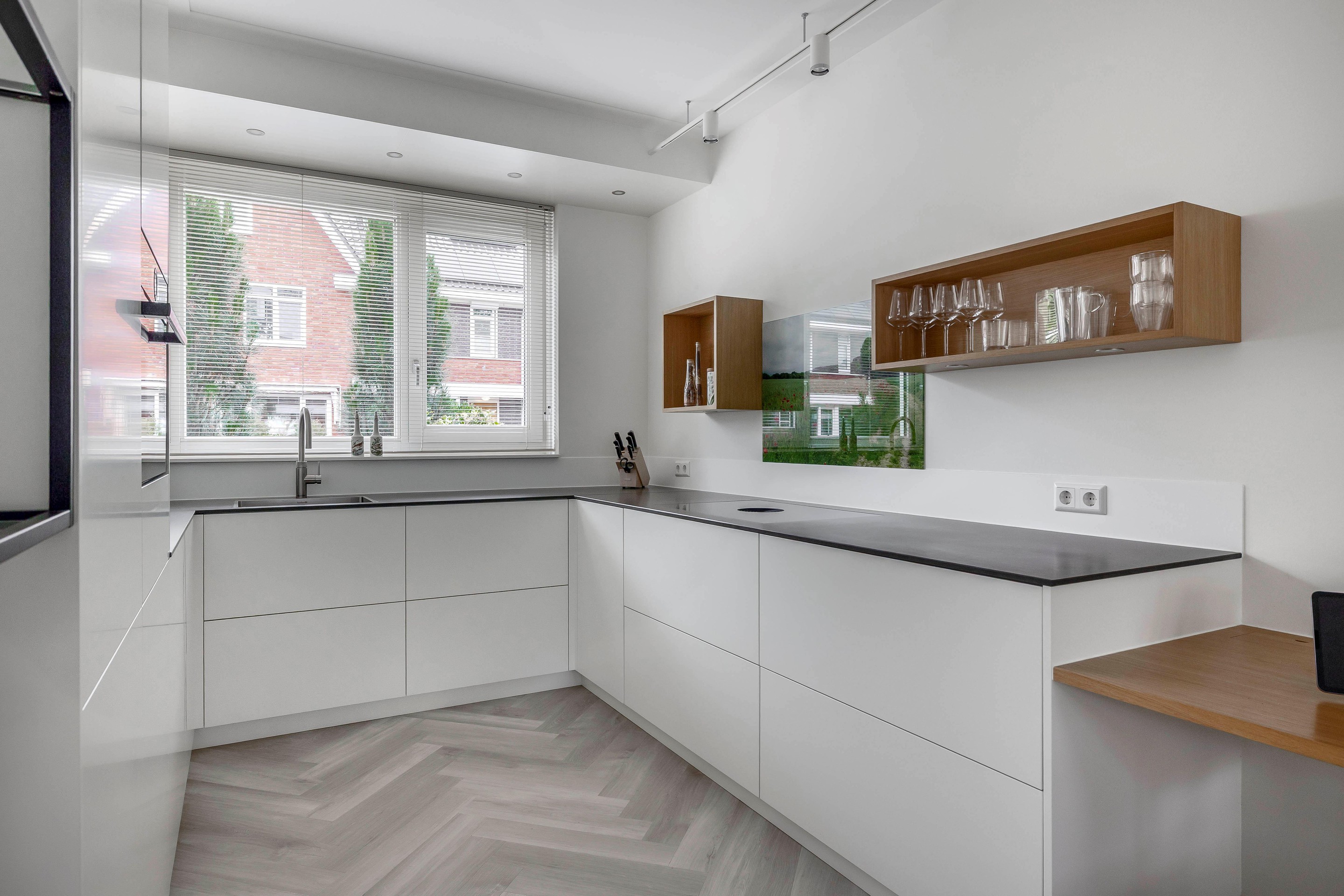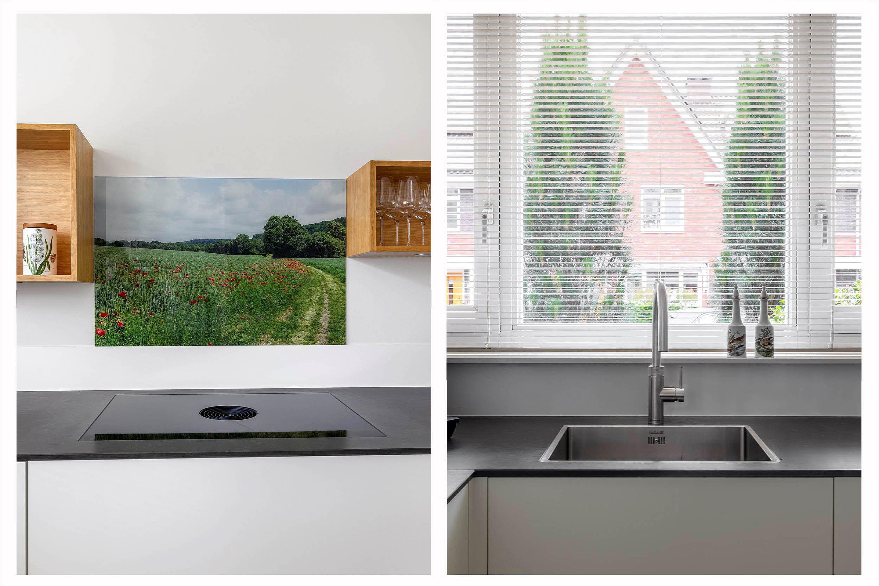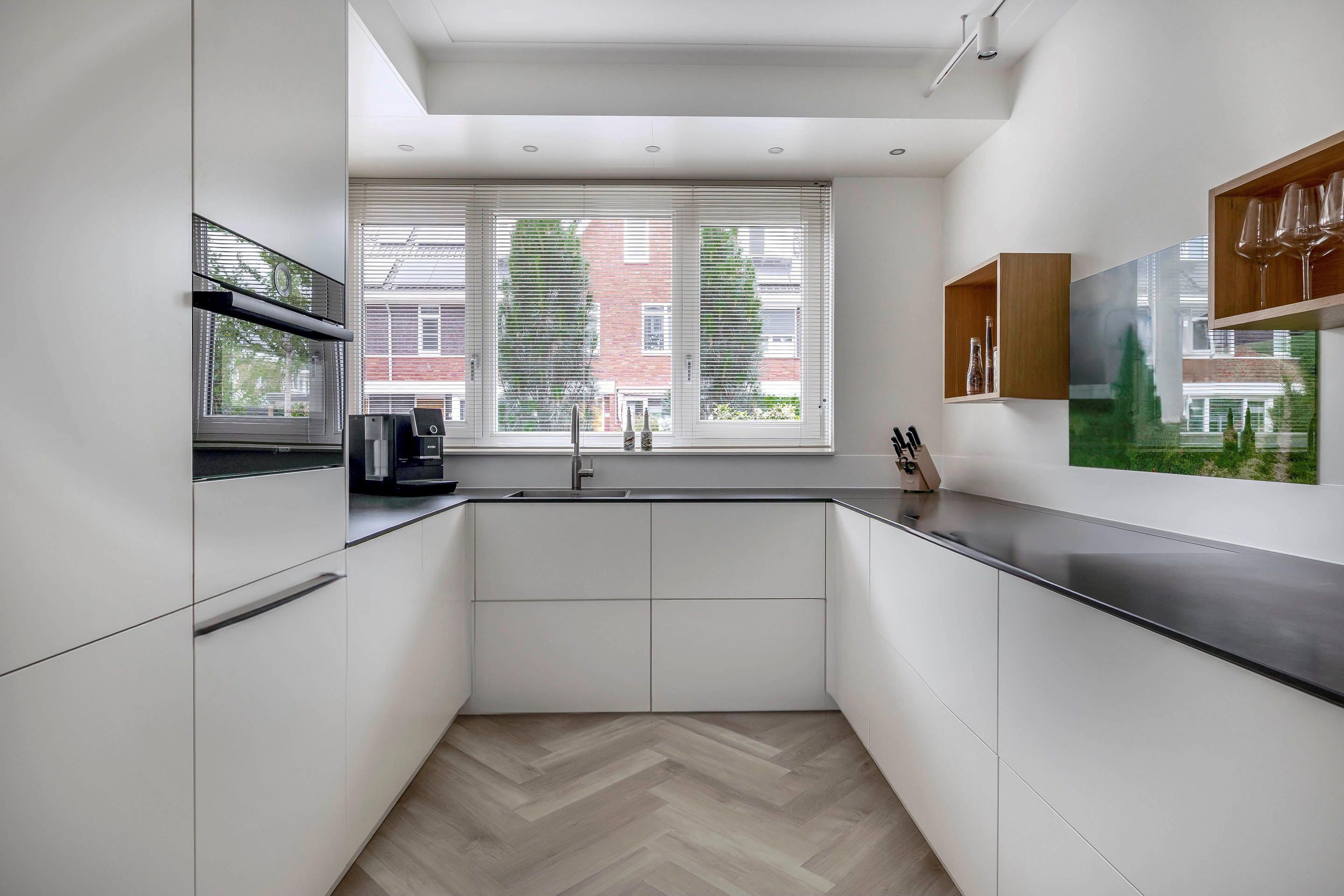 Aan de voorzijde van de woning ligt de keuken. Deze ambachtelijk gemaakte keuken sluit mooi aan op de woonkamer door de details in het ontwerp. De keuken is voorzien van alle benodigde apparatuur. Een inductiekookplaat van Bora met kookveldafzuiging, Quooker heetwaterkraan, combimagnetron (Bosch), ingebouwde vaatwasser (Siemens) en een koel/vriescombinatie (Siemens). Daarnaast biedt de u-vormige keuken een ruim composiet werkblad en veel kastruimte. In het verlengde van het werkblad is een handig verlaagd eiken werkblad aanwezig om te gebruiken voor het ontbijt of als thuiswerkplek.