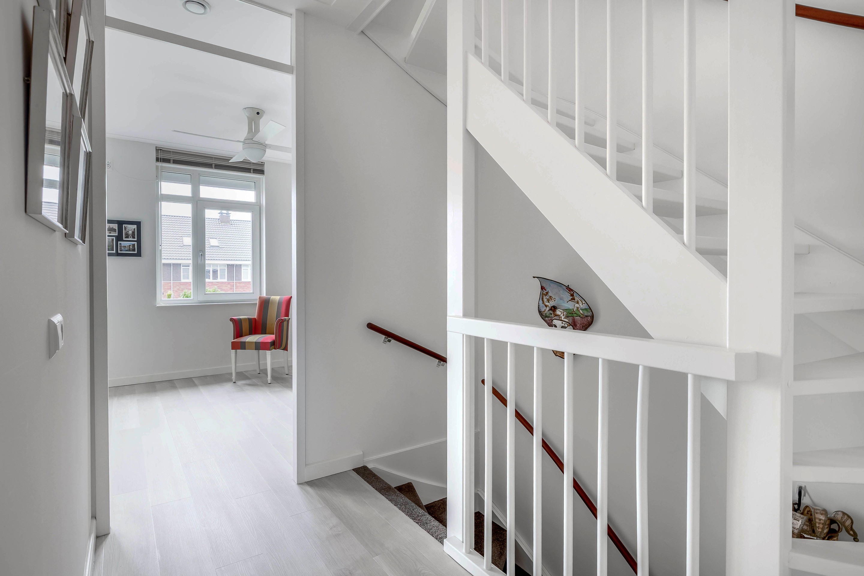 Eerste verdieping Vanaf de overloop is er toegang tot alle ruimtes. Slaapkamer 1 ligt aan de voorzijde van de woning, een ruime kamer met natuurlijke lichtinval. Aan de achterzijde van de woning is slaapkamer 2. Deze kamer is voorzien van rolluiken en is ook te splitsen in 2 slaapkamers of slaapkamer met inloopkast.