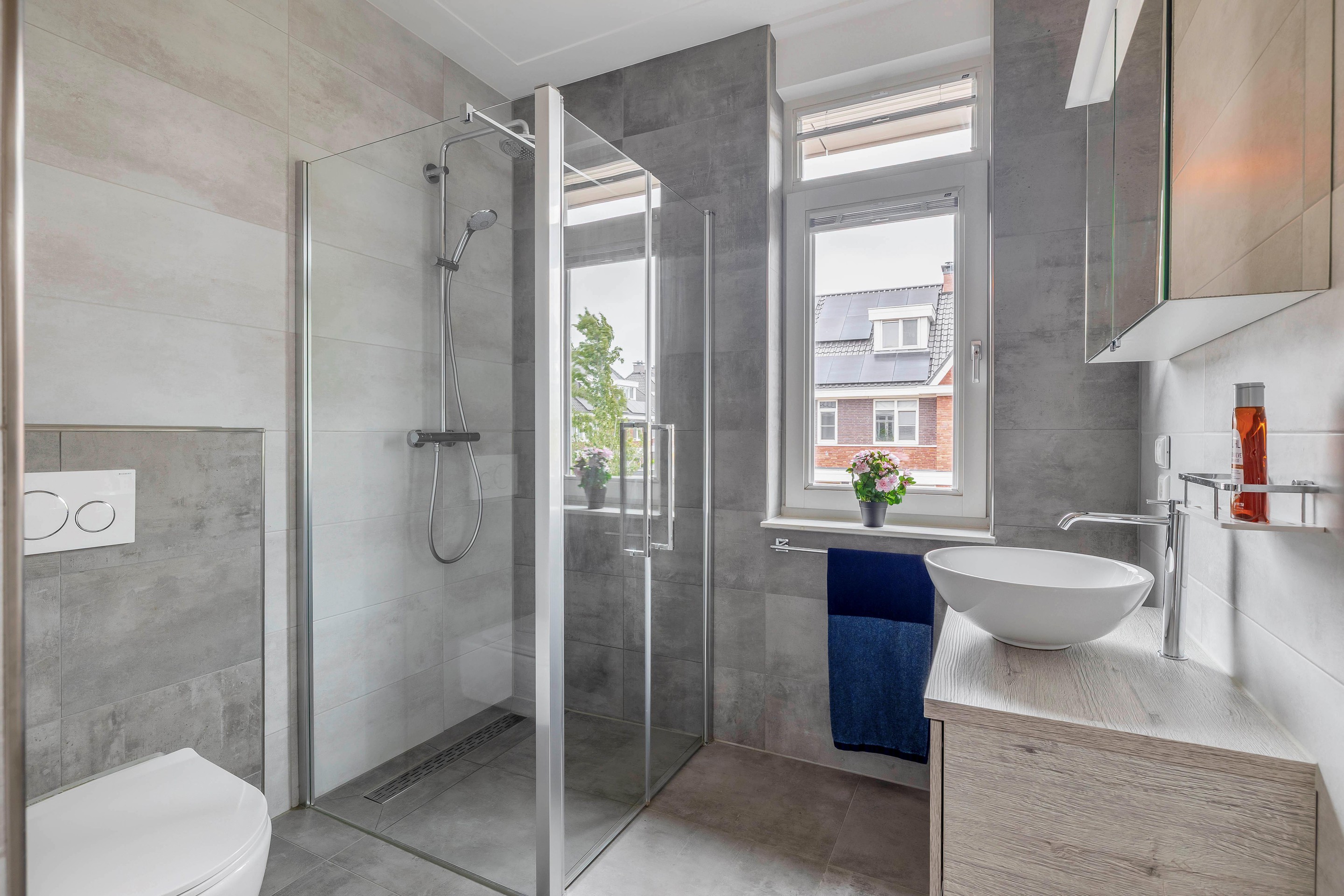 De badkamer is aan de voorzijde van de woning gesitueerd. De badkamer heeft een zeer moderne afwerking en is voorzien van een douchecabine met regendouche en handdouche, een badkamermeubel met spiegelkast en een wandcloset.