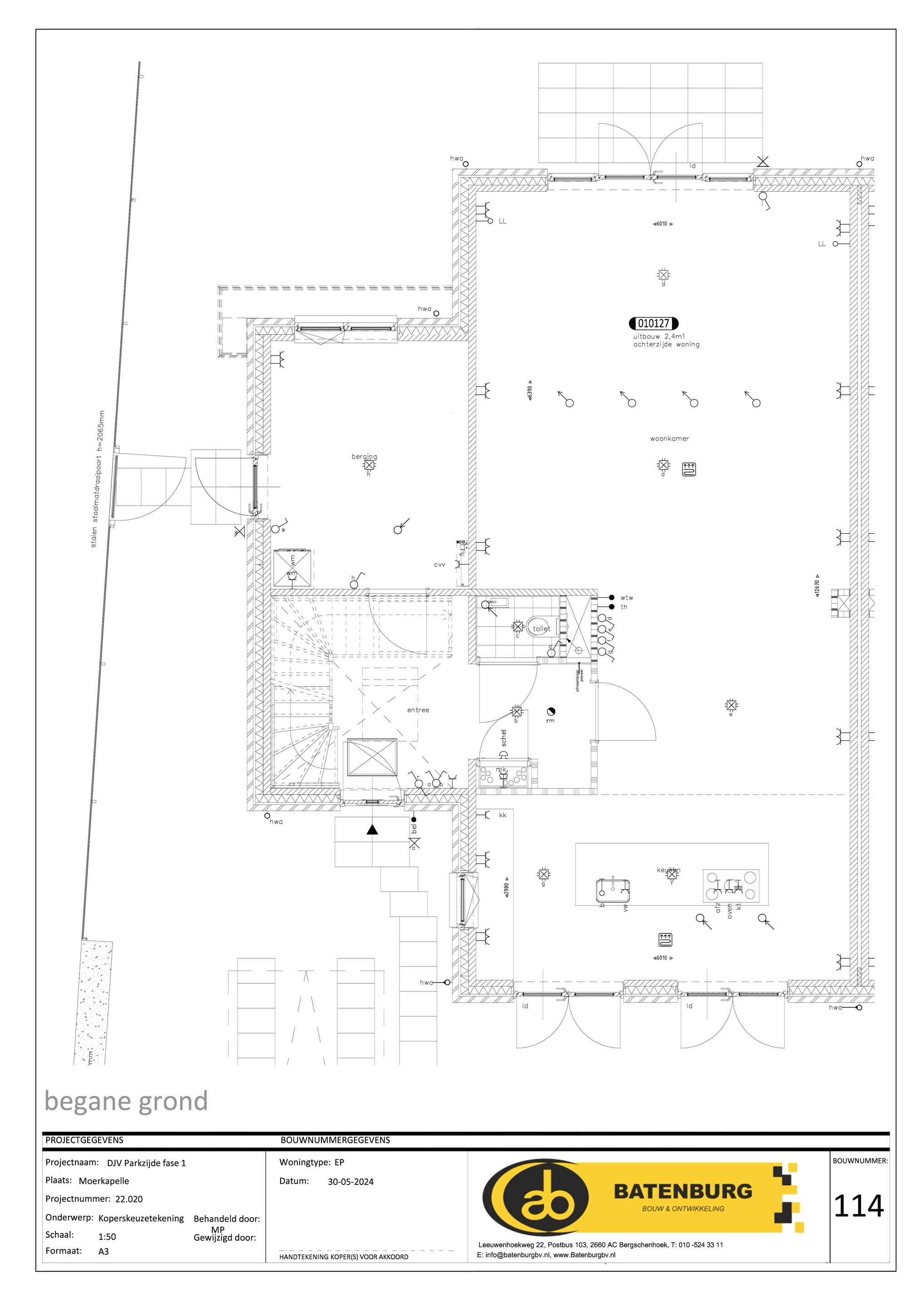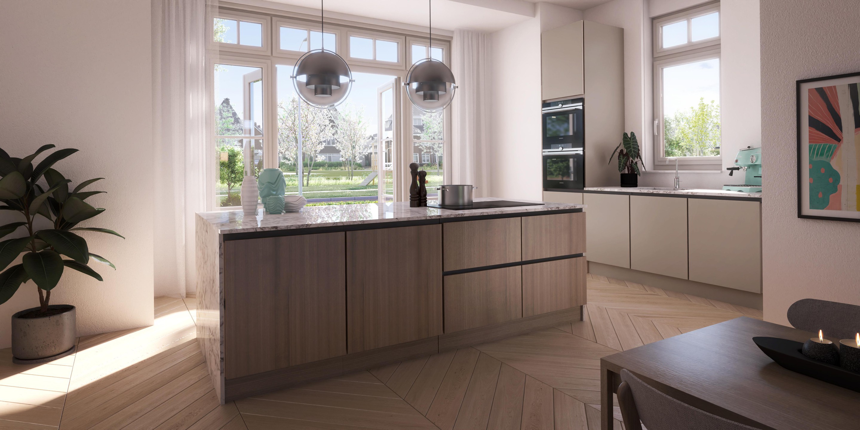 De begane grond is volledig gericht op ruimte en licht (plafondhoogte 3,65m). De woonkeuken bevindt zich aan de voorzijde en beschikt over openslaande deuren richting de voortuin. Hierdoor ontstaat een fijne plek voor een koffie in de zon. De keuken is niet inbegrepen, waardoor je deze volledig naar eigen wens kunt ontwerpen, met ruimte voor een kookeiland en royale eettafel.