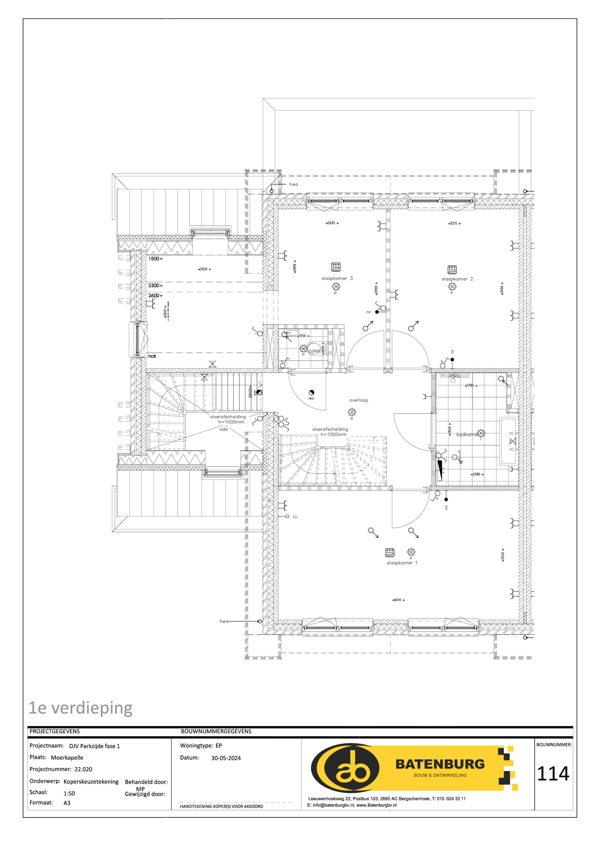 Eerste verdieping Op de eerste verdieping bevinden zich drie volwaardige slaapkamers en een comfortabele badkamer. De eerste verdieping heeft een plafondhoogte van 2,62 meter. De slaapkamer aan de achterzijde beschikt over een eigen inloopkast en profiteert van de bijzondere gevelvorm. Hierdoor ontstaat een prettige indeling met extra opberg- en inrichtingsmogelijkheden. De badkamer en het toilet worden casco opgeleverd, dus kunt u naar eigen wens inrichten en afwerken.