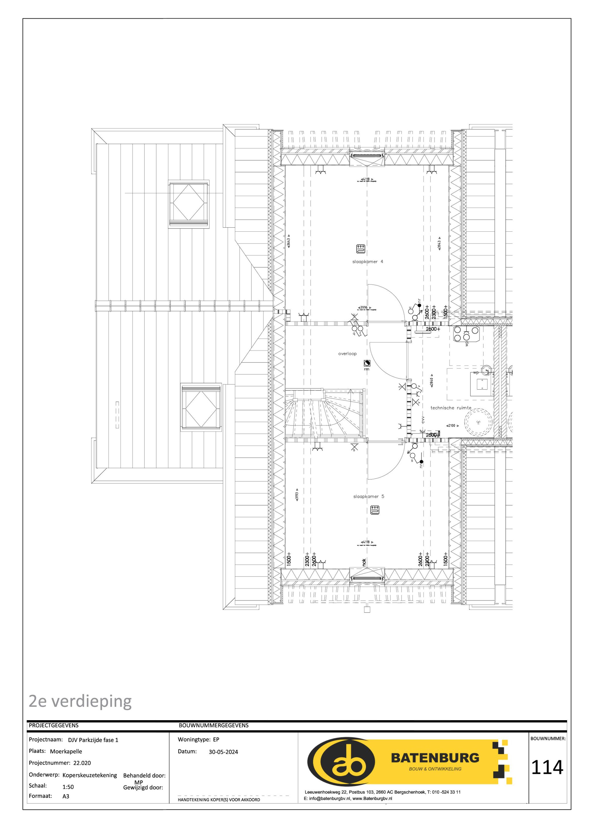Tweede verdieping De tweede verdieping vormt een volwaardige woonlaag en is volledig ingedeeld. Hier bevinden zich nog twee extra (slaap)kamers, waarmee de woning in totaal over vijf kamers beschikt. Dankzij de hoogte en de kapvorm is dit een ideale verdieping voor kinderen, gasten, kantoorruimte of hobby’s. De aanwezigheid van technische ruimte en warmtepompinstallatie is netjes weggewerkt waardoor de bruikbaarheid van de zolder optimaal blijft.
