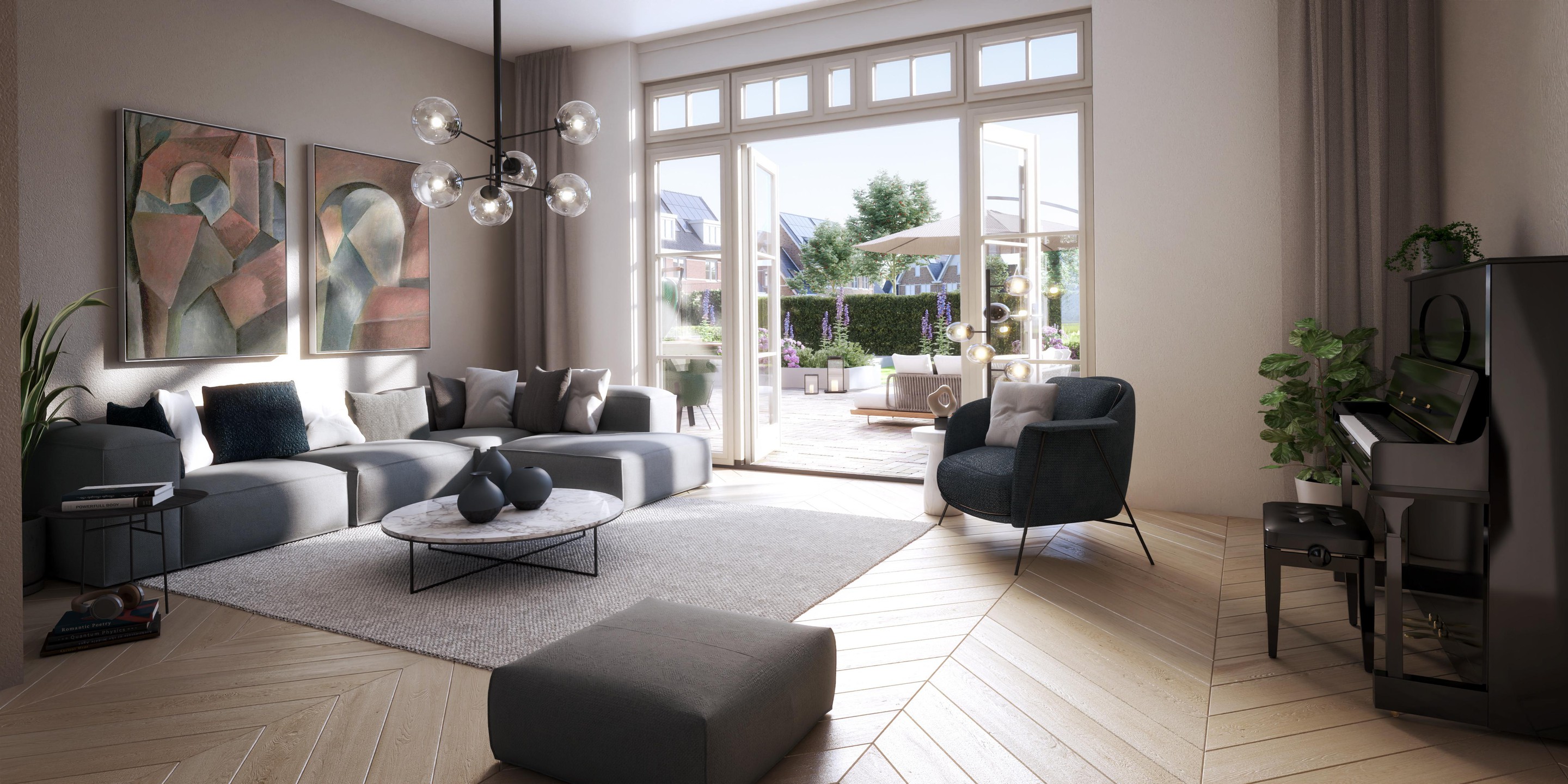 Aan de achterzijde ligt de extra grote woonkamer, mede dankzij de uitbouw van 2,40 meter, met openslaande deuren naar de achtertuin. De plafondhoogte (circa 3,65 meter) geeft de gehele verdieping een bijzonder ruimtelijke uitstraling die in nieuwbouw zelden wordt aangetroffen.