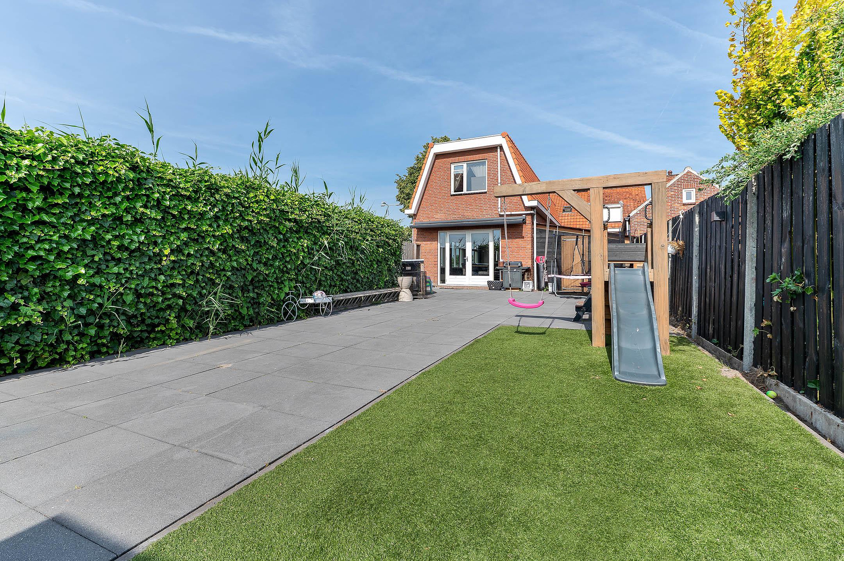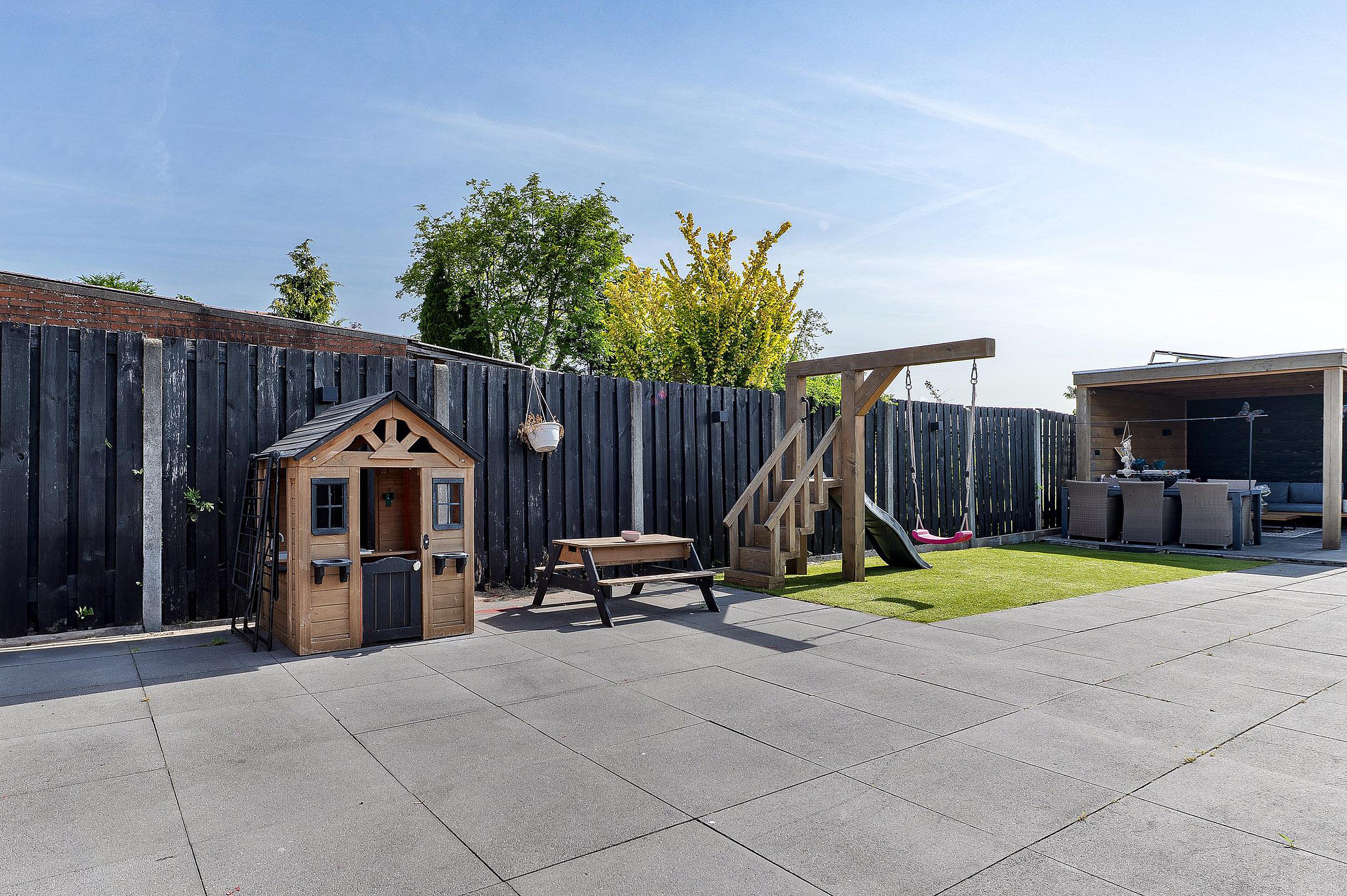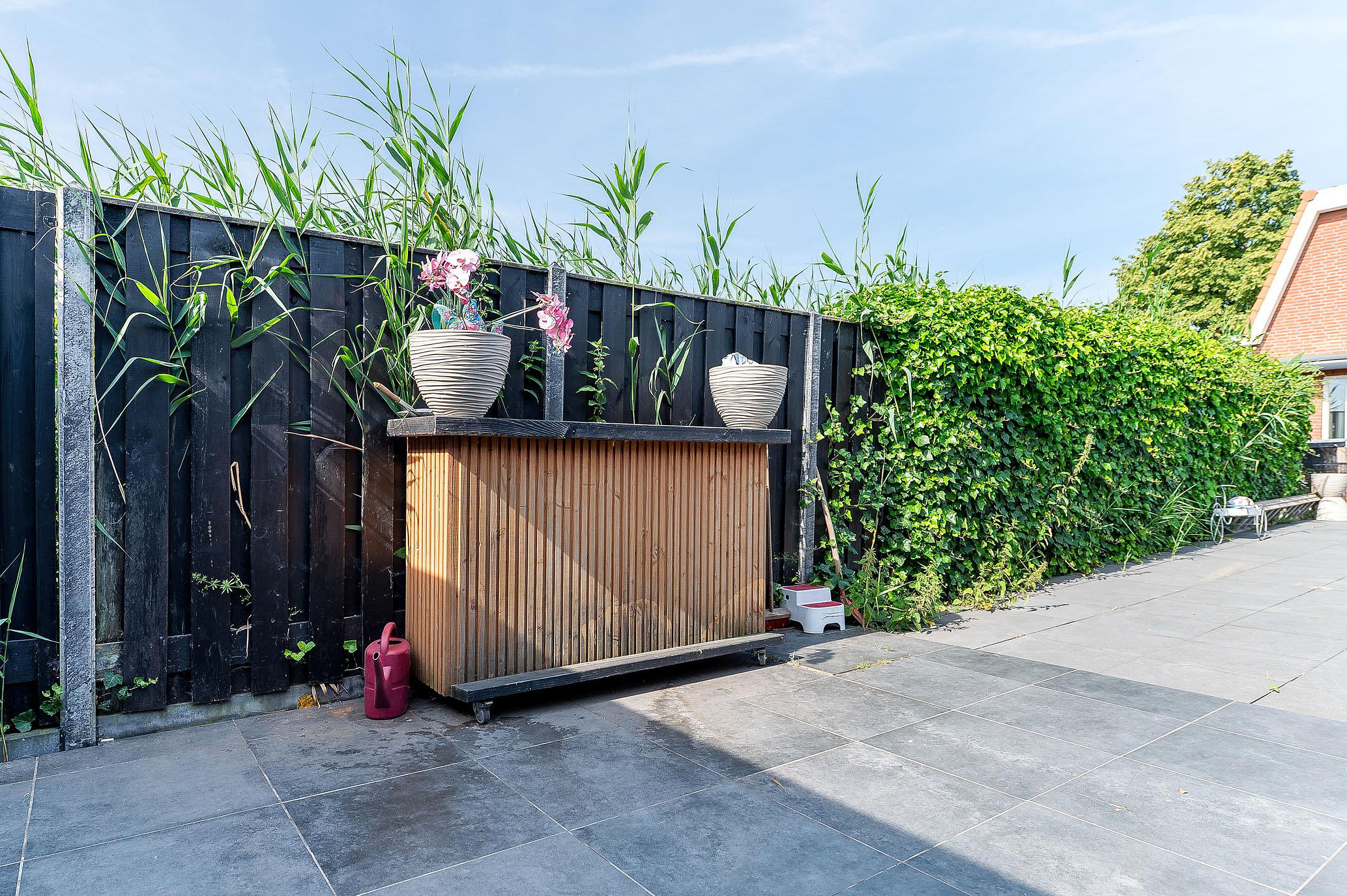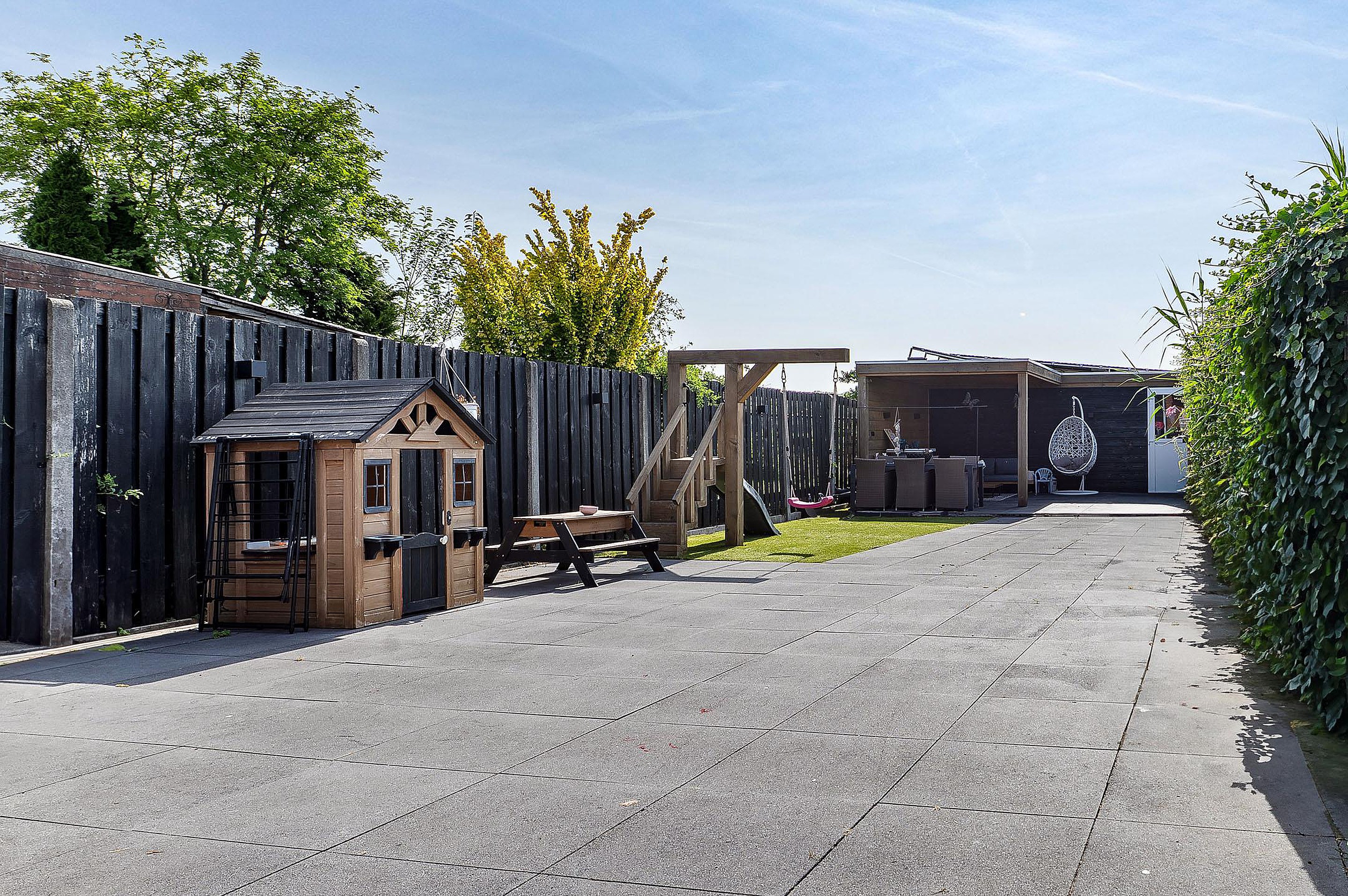 De onderhoudsvriendelijke achtertuin is zonnig gelegen en voorzien van een overkapping en brede achterom. Het geïsoleerde bijgebouw (met 12 zonnepanelen) is multifunctioneel inzetbaar, bijvoorbeeld als werk- of hobbyruimte.