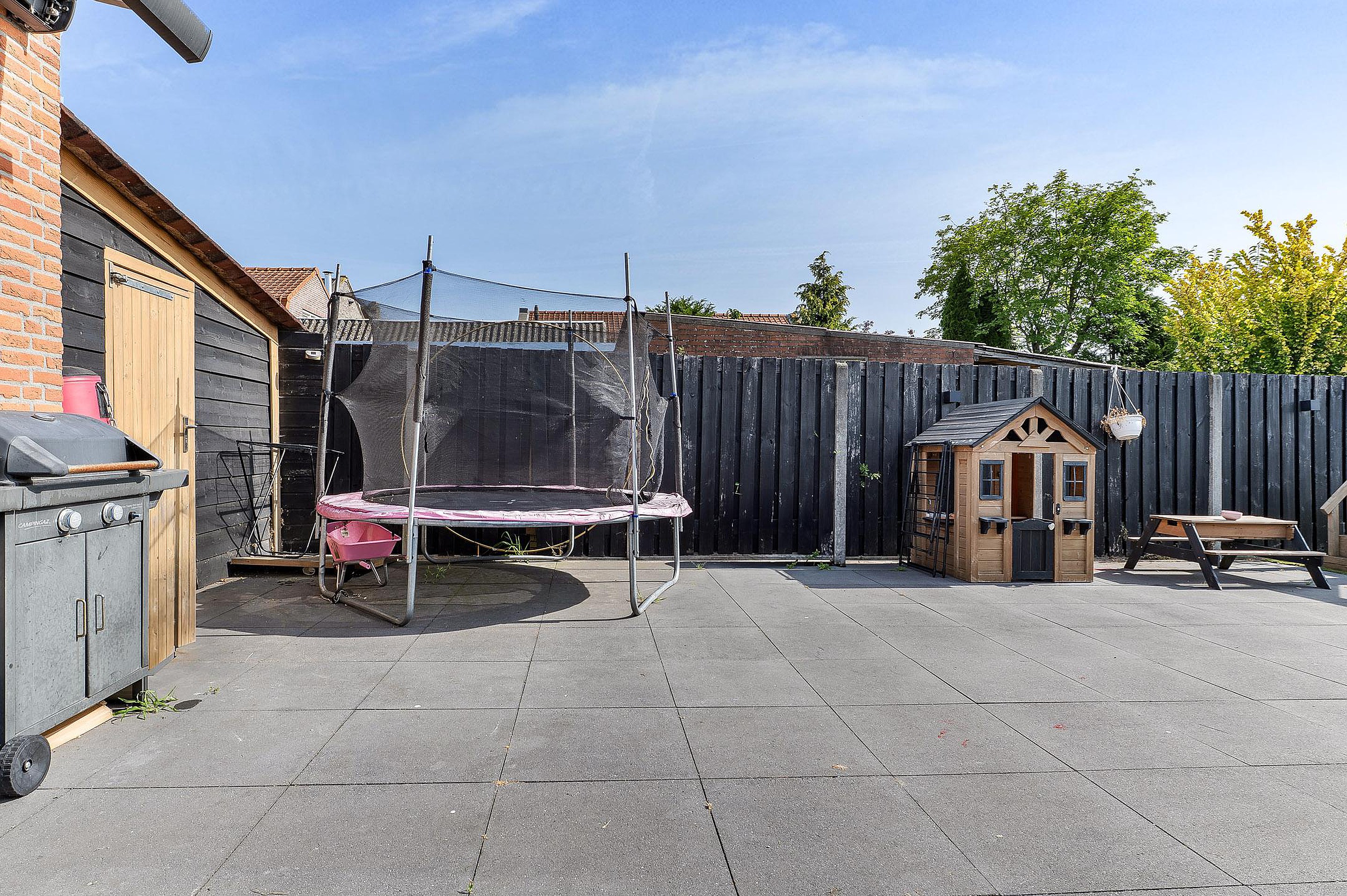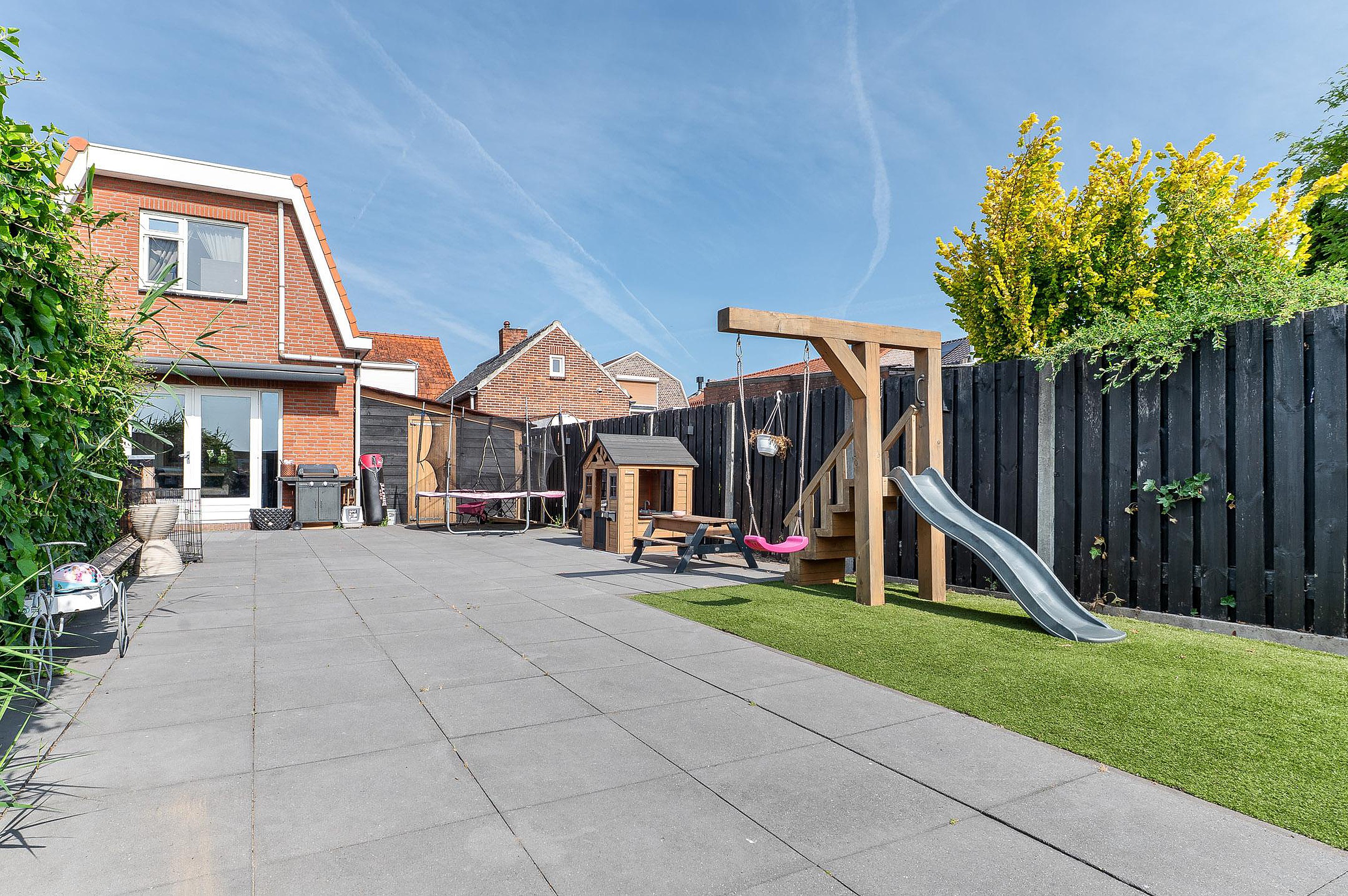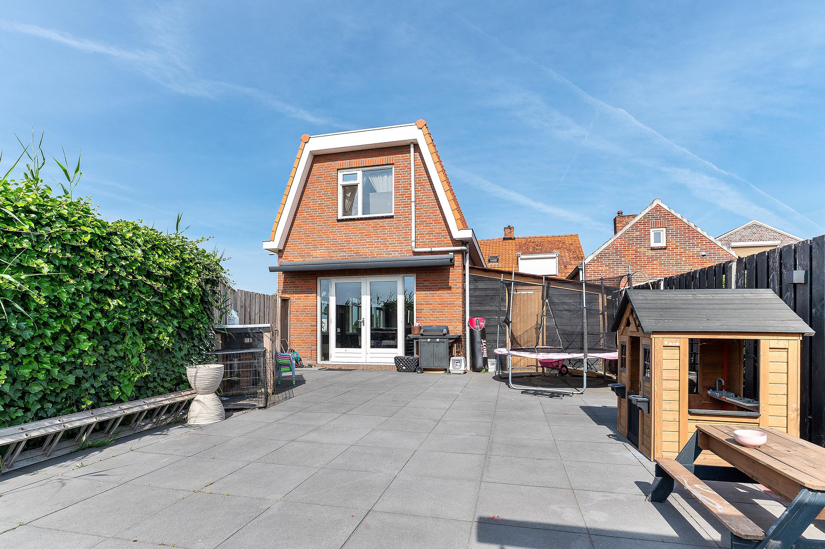 De onderhoudsvriendelijke achtertuin is zonnig gelegen en voorzien van een overkapping en brede achterom. Het geïsoleerde bijgebouw (met 12 zonnepanelen) is multifunctioneel inzetbaar, bijvoorbeeld als werk- of hobbyruimte.