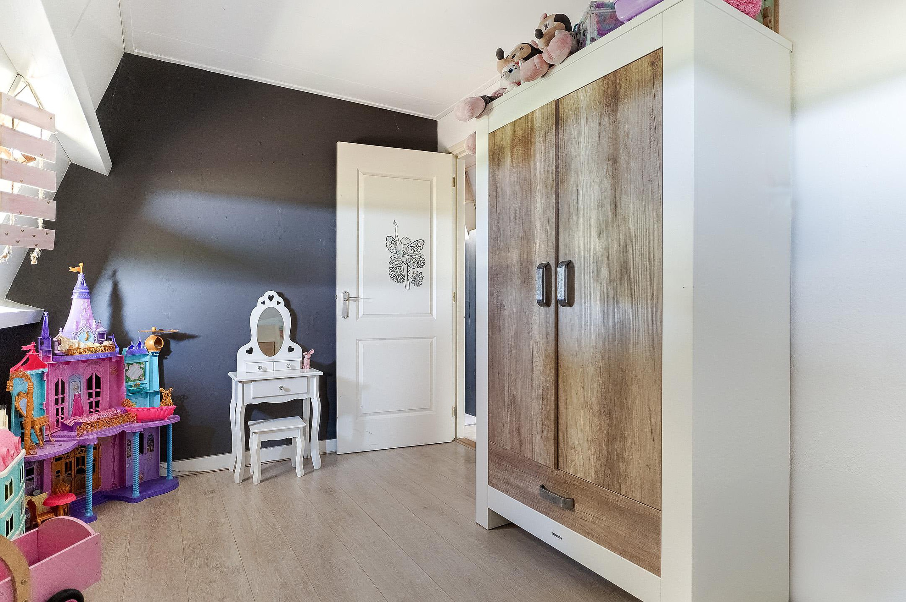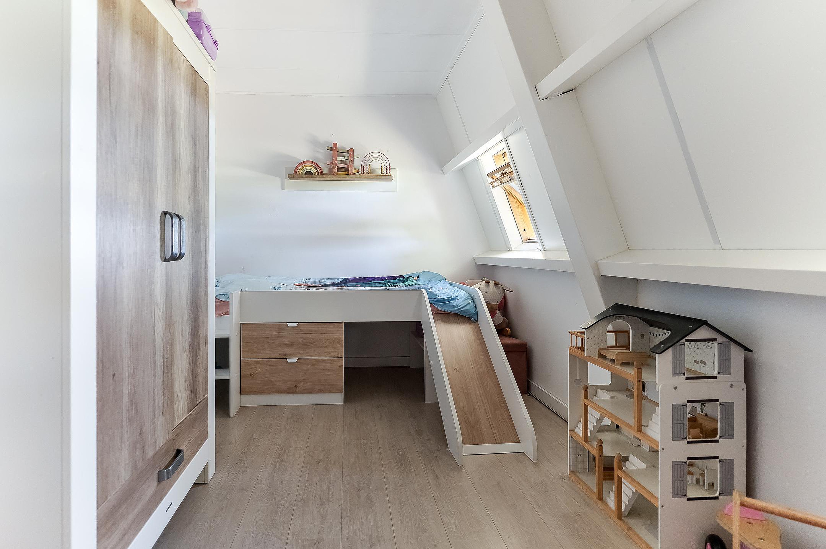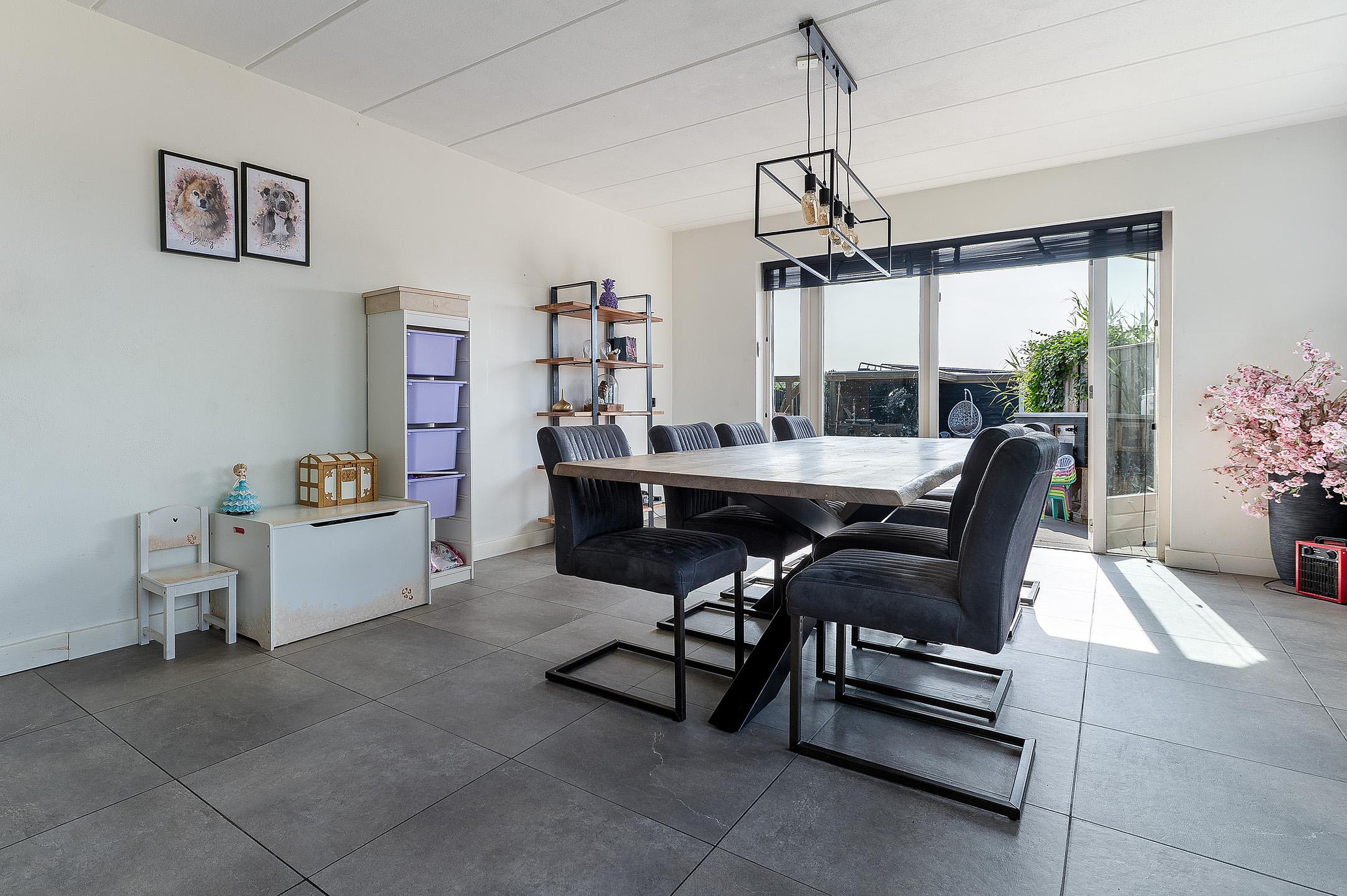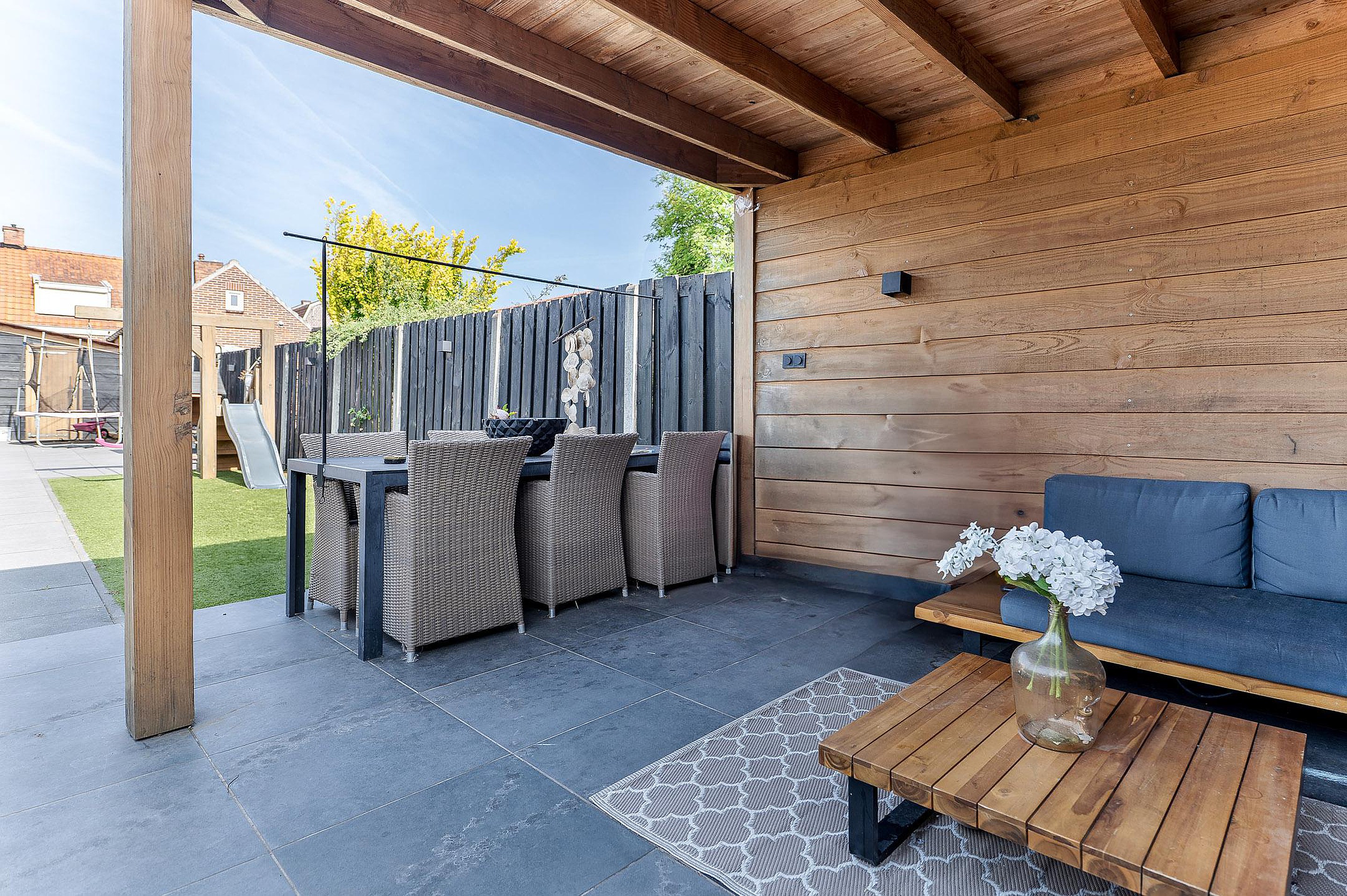 De onderhoudsvriendelijke achtertuin is zonnig gelegen en voorzien van een overkapping en brede achterom. Het geïsoleerde bijgebouw (met 12 zonnepanelen) is multifunctioneel inzetbaar, bijvoorbeeld als werk- of hobbyruimte.