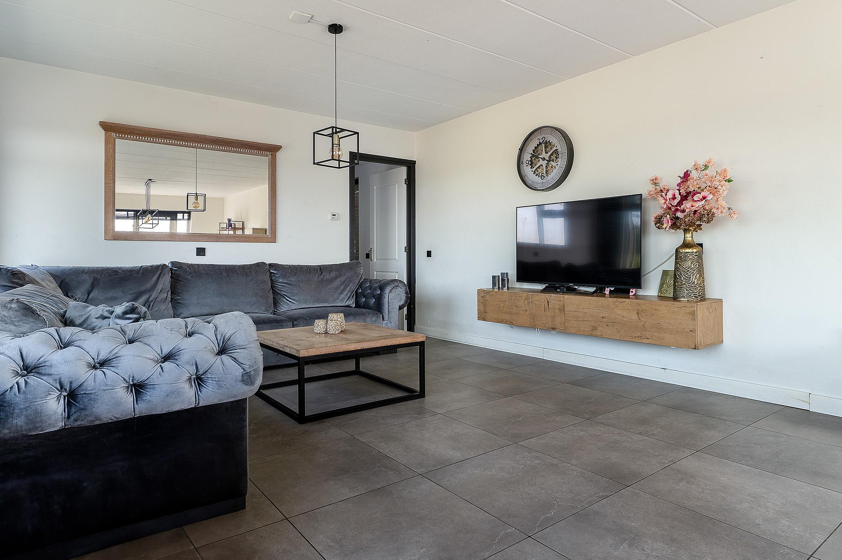 De lichte, royale woonkamer beschikt over een tegelvloer, rolluiken en openslaande tuindeuren naar de zonnige achtertuin met vrij uitzicht.