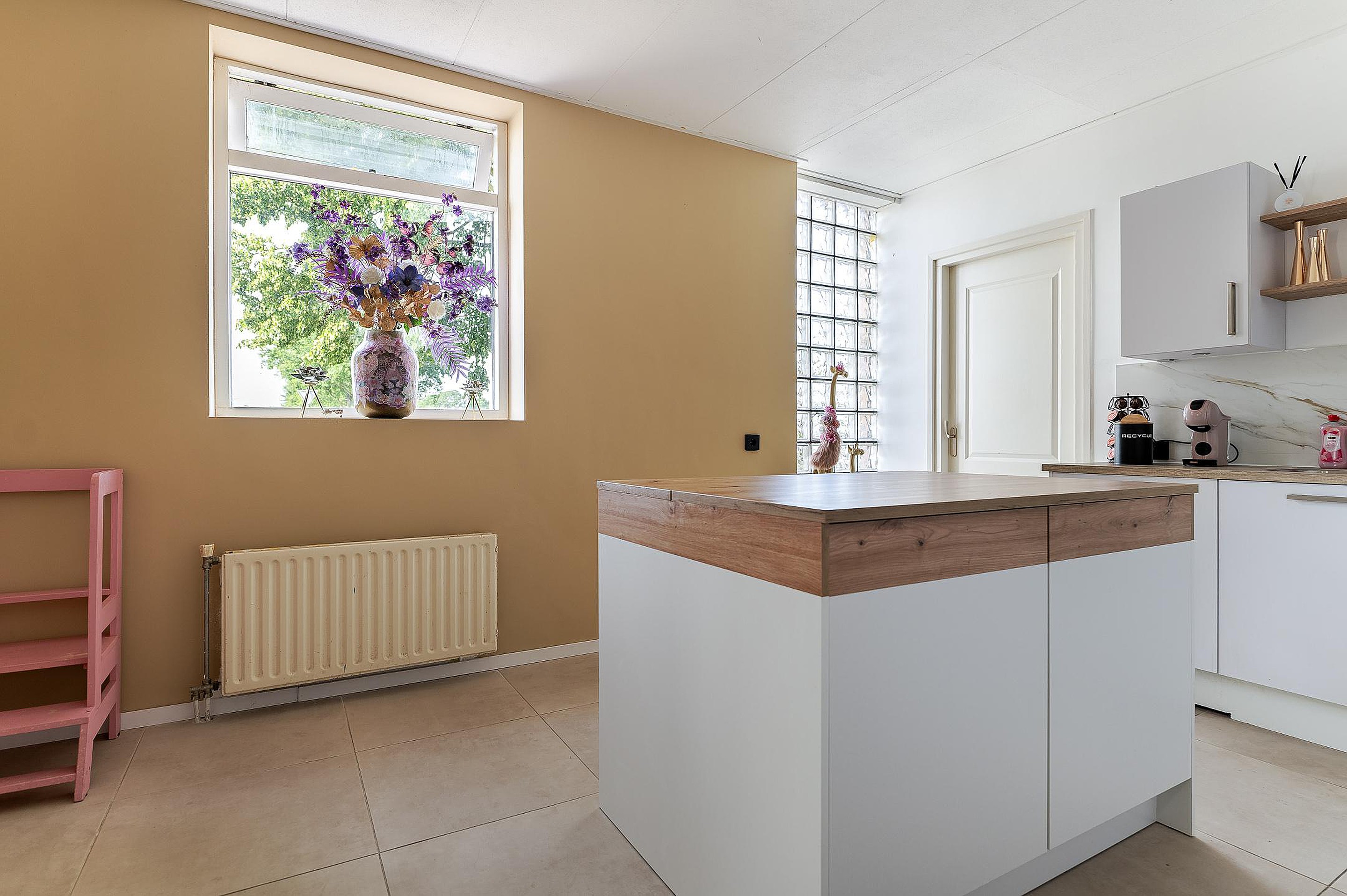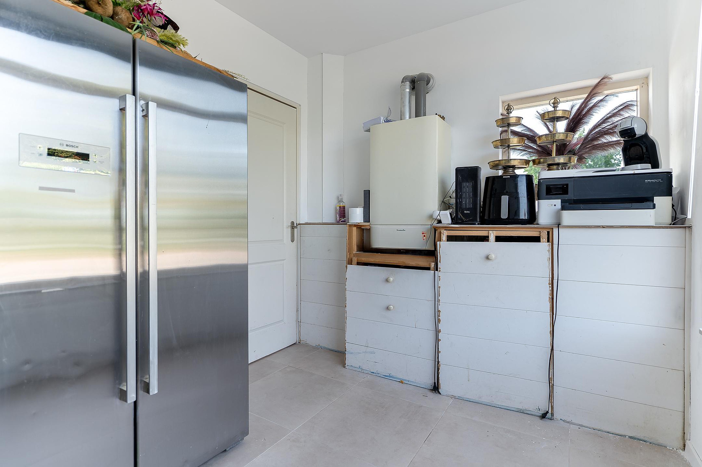 Via de hal bereikt u het vernieuwde toilet (2023), de woonkeuken en woonkamer. De moderne keuken is recent vernieuwd en voorzien van diverse inbouwapparatuur. Aansluitend bevindt zich een praktische bijkeuken met witgoedaansluitingen en cv-installatie (2002), welke vervangen dient te worden.