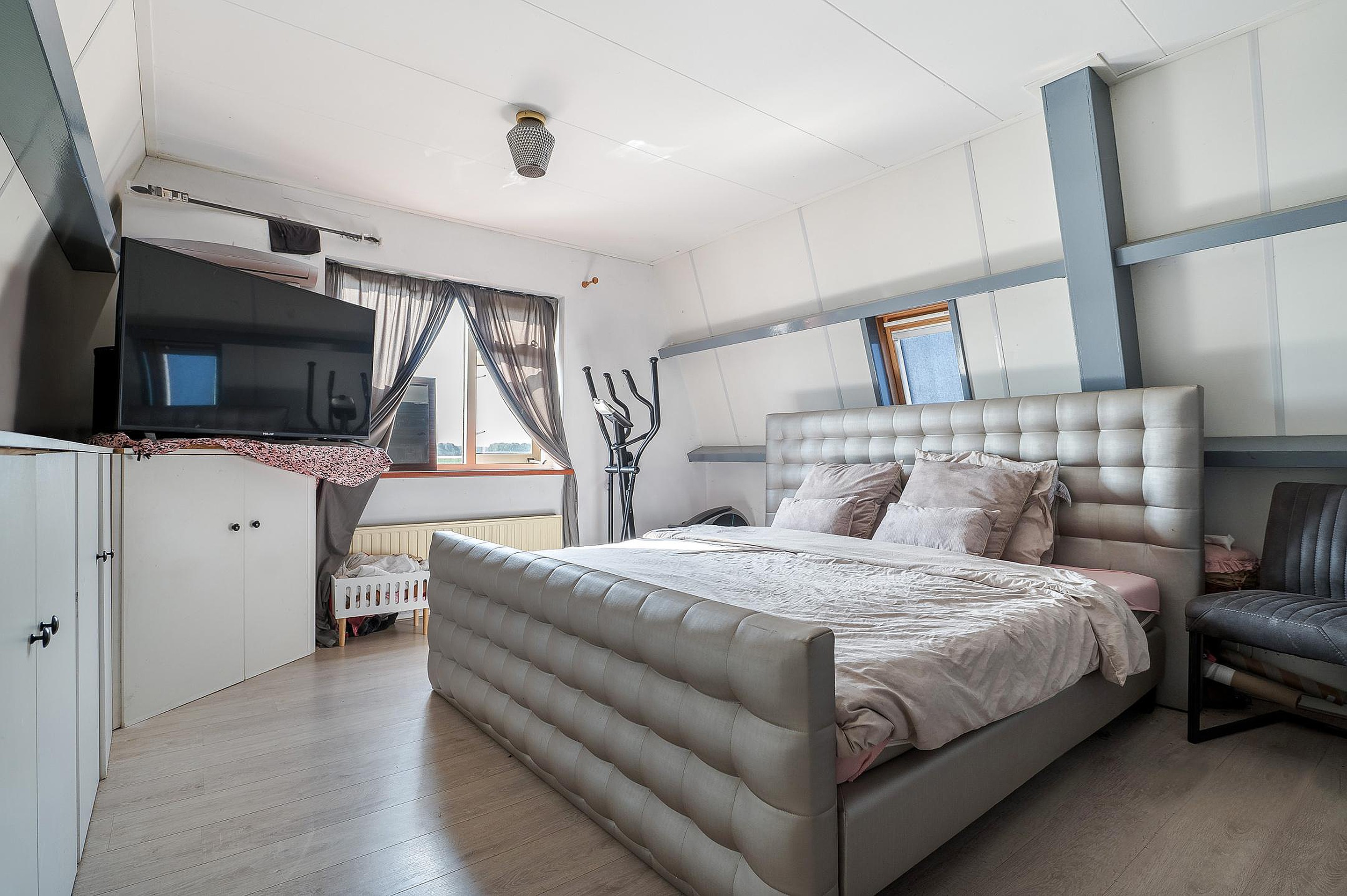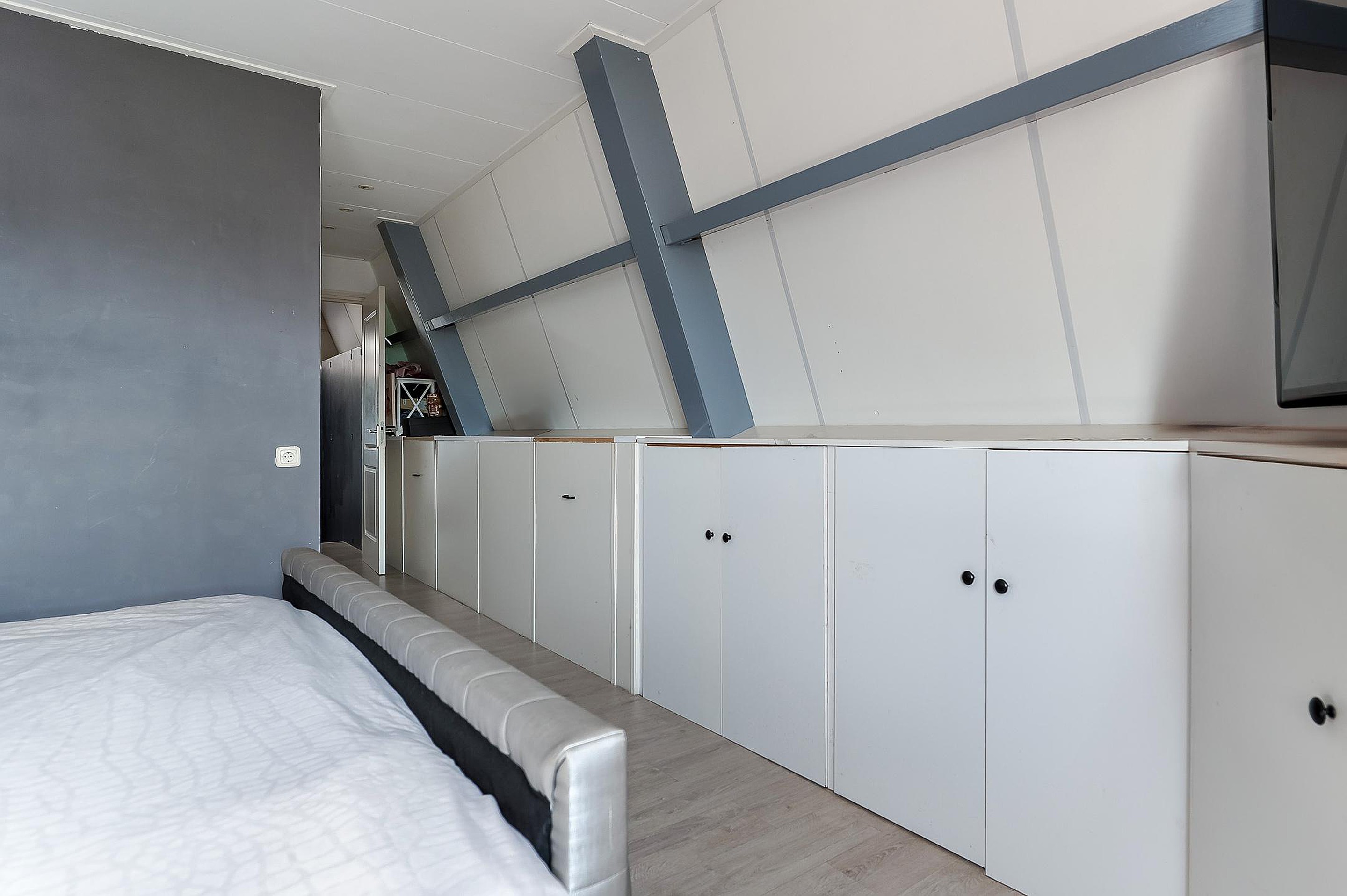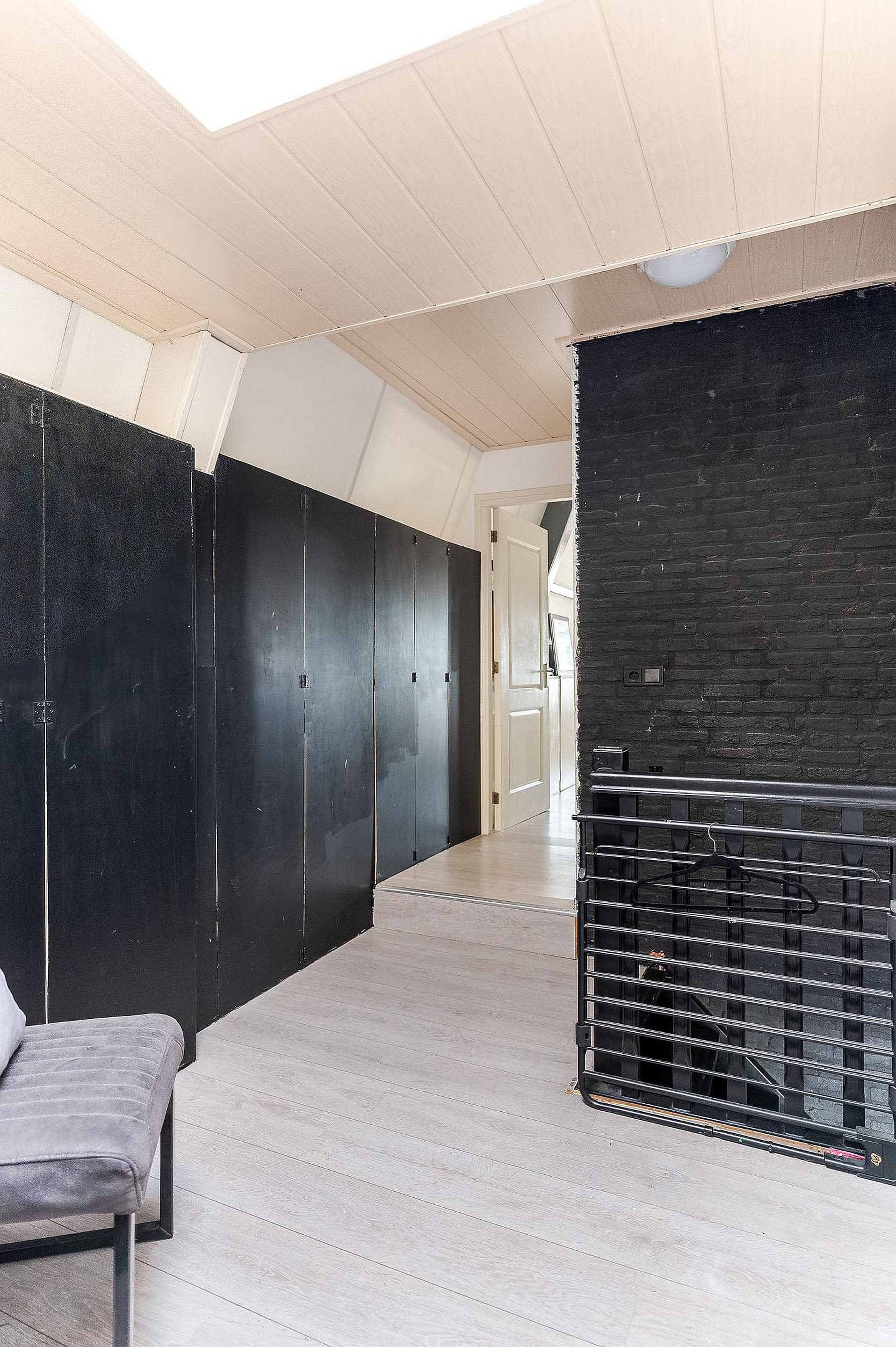 Overloop met vaste kasten en toegang tot drie ruime slaapkamers, waarvan de grootste is voorzien van airconditioning. De badkamer is compleet ingericht met ligbad, douche, wastafelmeubel en tweede toilet.