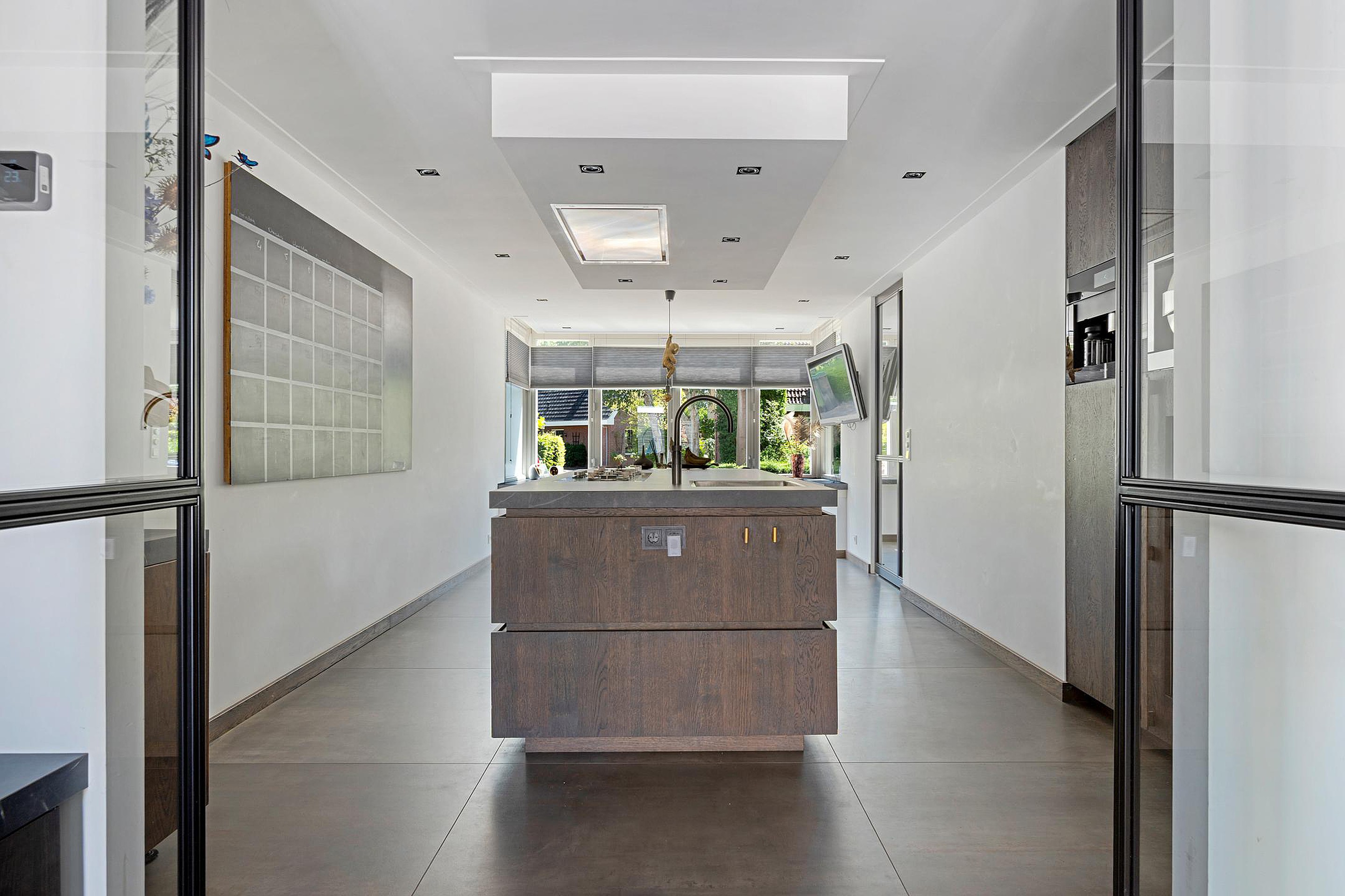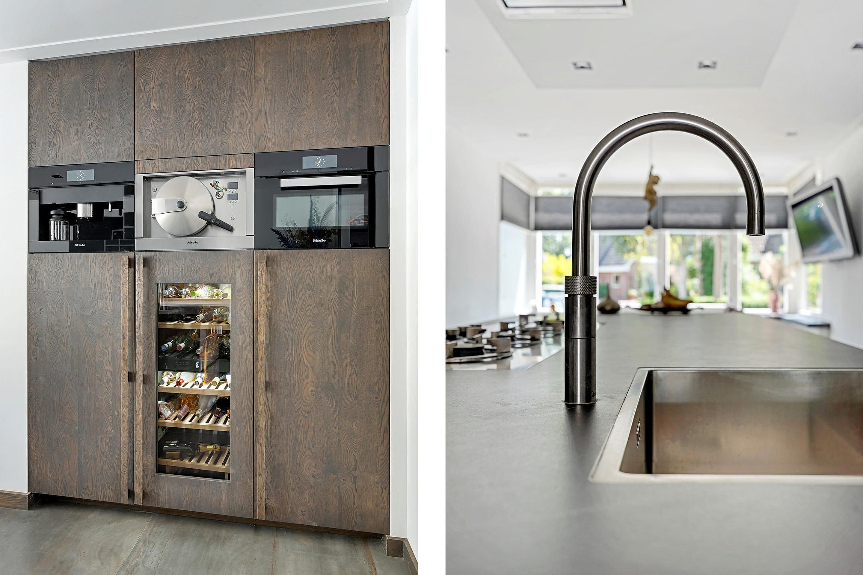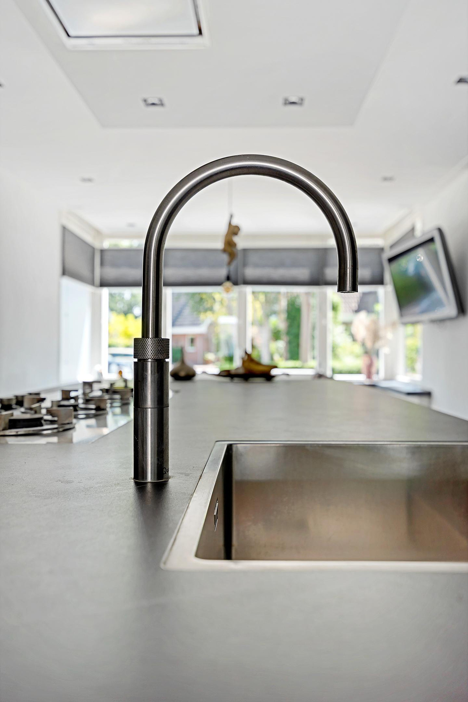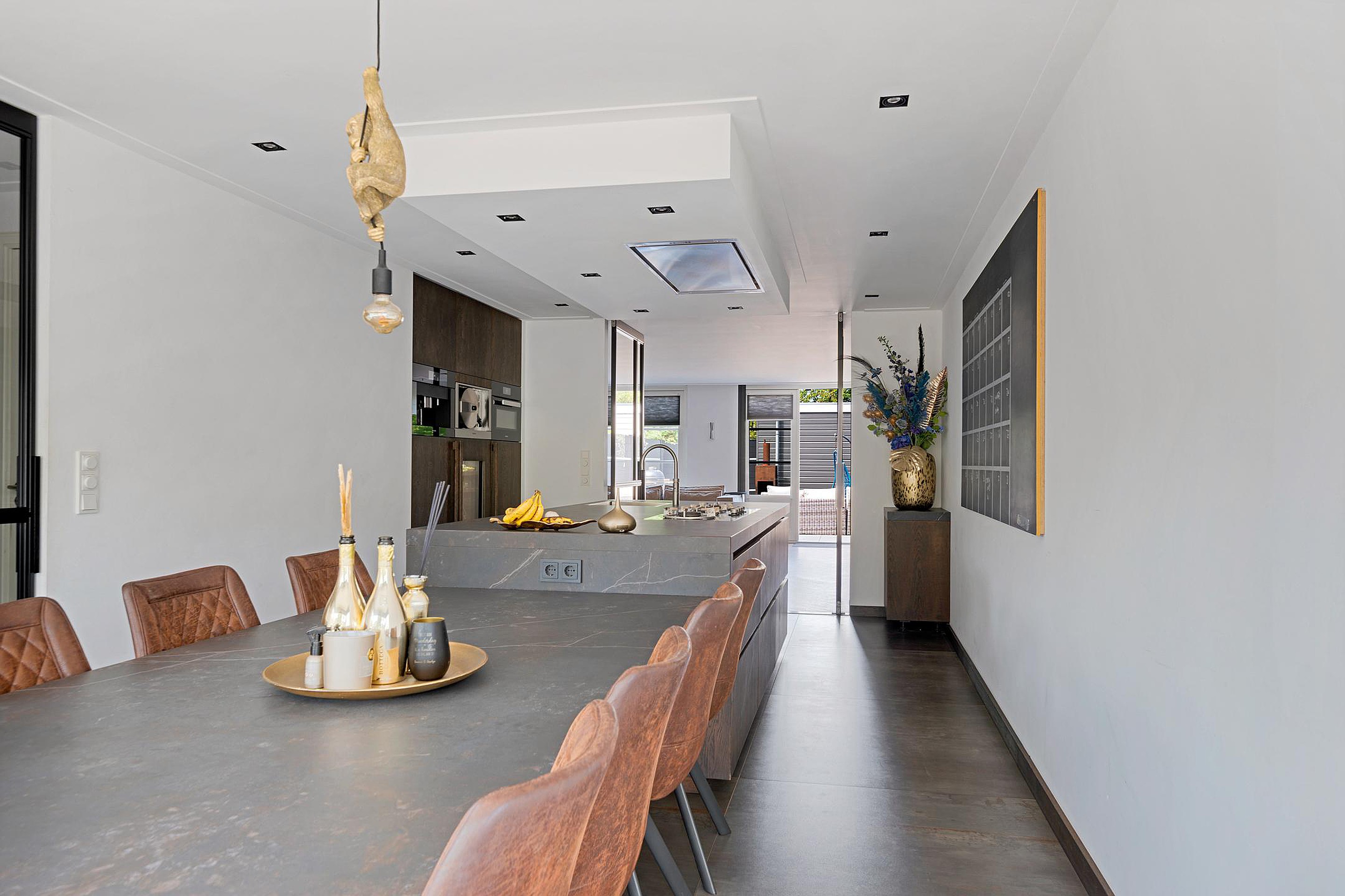 De woning is zowel aan de voor- als achterzijde flink uitgebouwd, waardoor er bijzonder veel leefruimte is ontstaan op de begane grond. Via de hal, met nieuwe meterkast en zeer mooi afgewerkte toiletruimte, loop je via de stalen deur de grote woonkeuken aan de voorzijde van de woning in. Direct vallen de prachtige gietvloer en het stoere aanrechtblad van Dekton op. Dit onderhoudsvrije natuurstenen blad loopt door in een ruime eettafel. Een prachtig geheel. In deze moderne keuken ontbreekt het je uiteraard aan niets. Een dubbele koelkast met vriezer, een strak vormgegeven 4-pits gasfornuis, vaatwasser, koffiemachine, ruime klimaatkast voor alle wijnen, een oven, magnetron, hogedruk stoomoven en koffiemachine van Miele zijn in deze handgemaakte keuken te vinden.