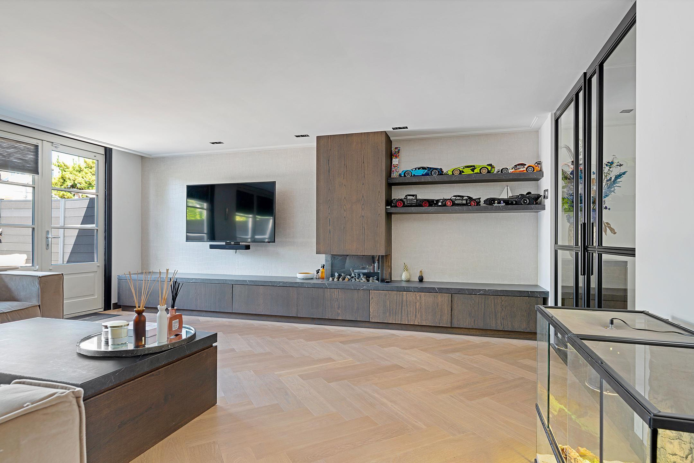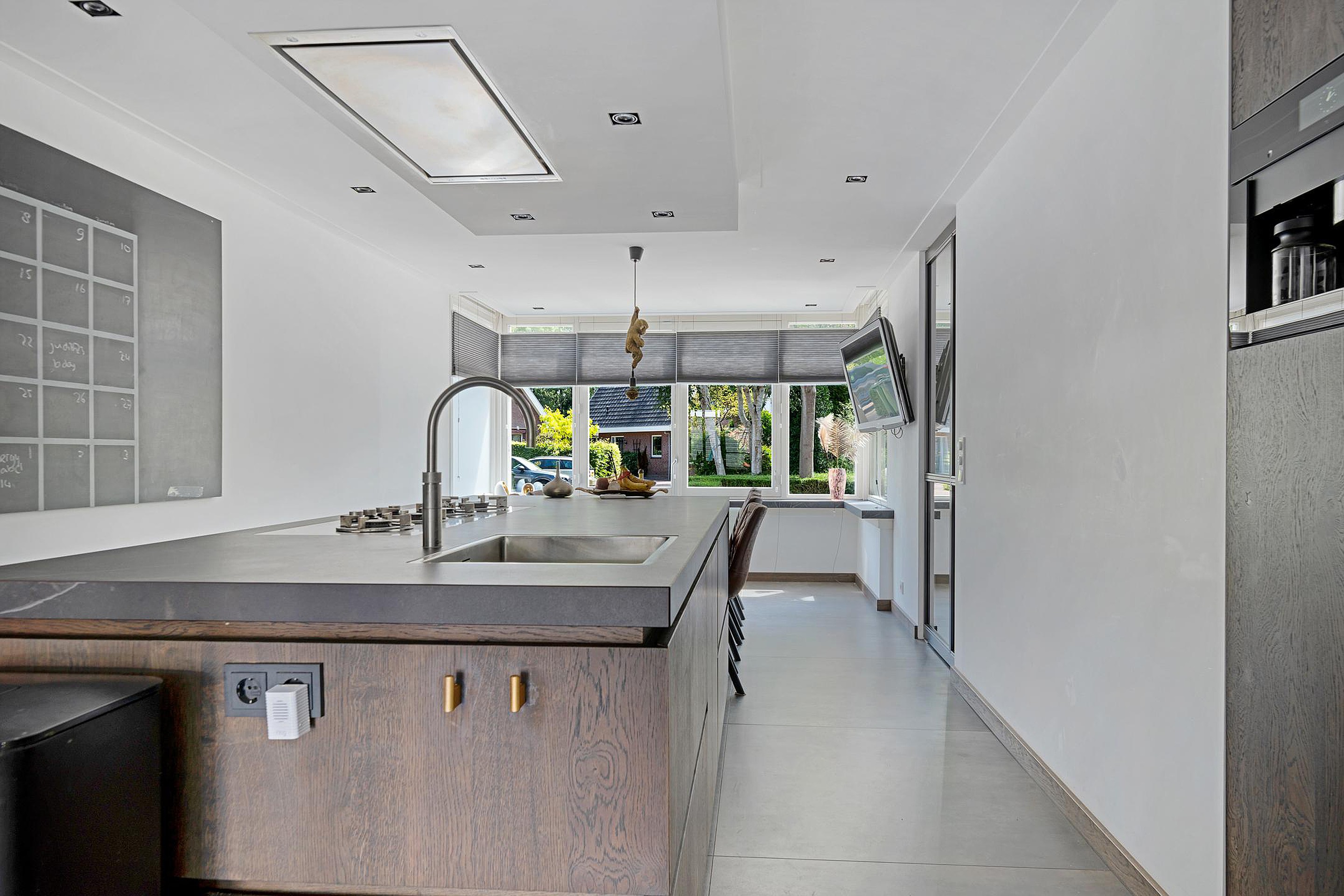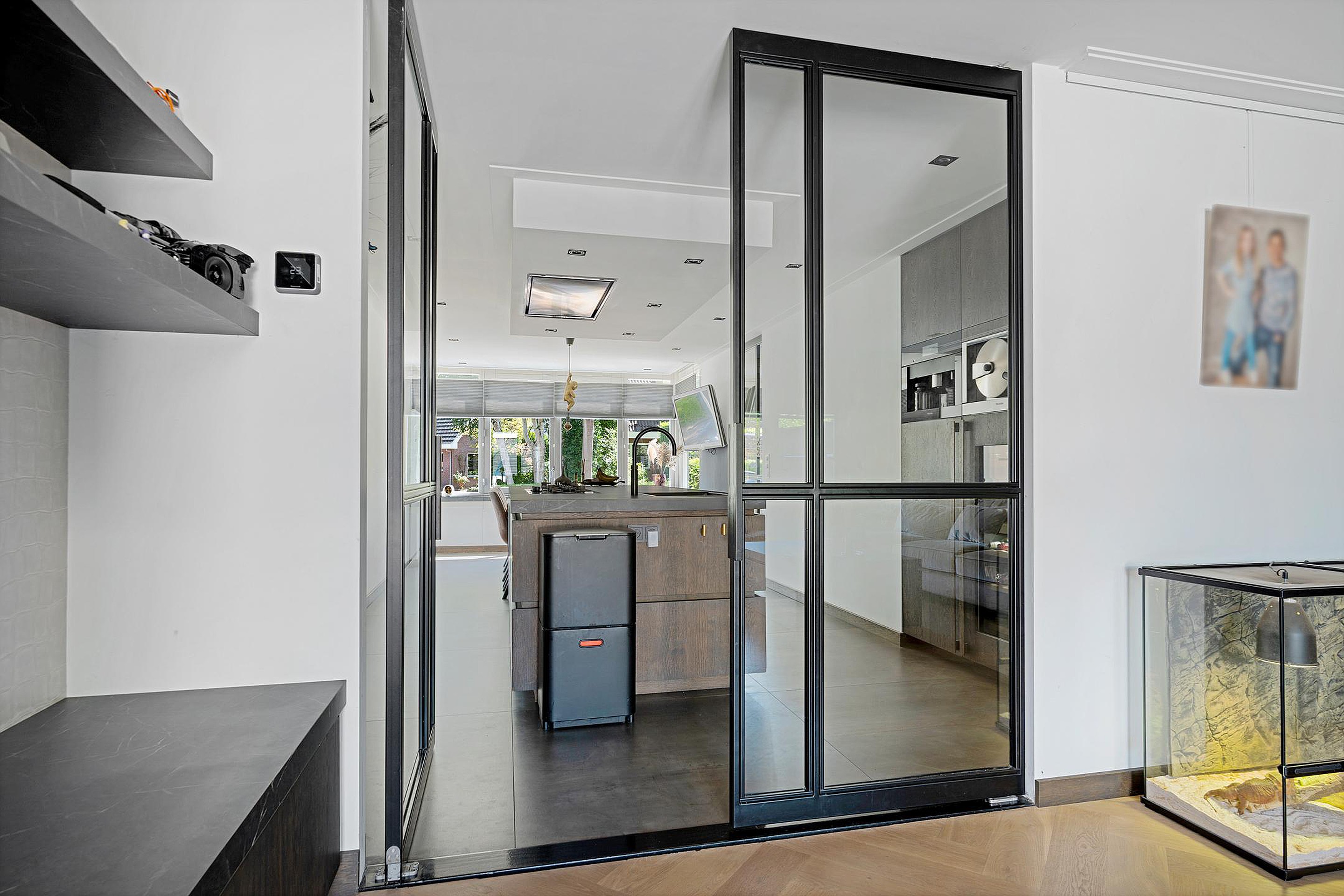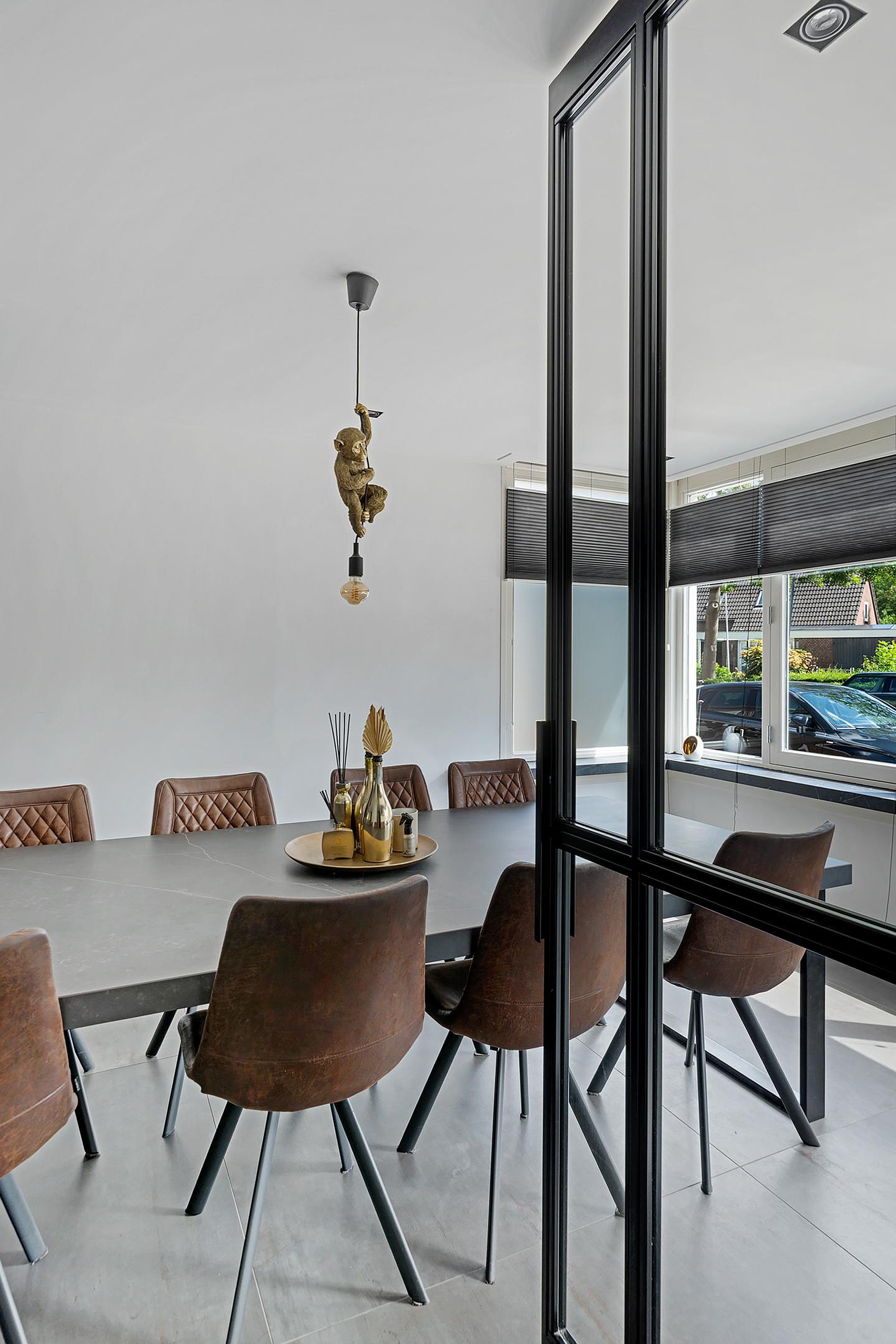 De woning is zowel aan de voor- als achterzijde flink uitgebouwd, waardoor er bijzonder veel leefruimte is ontstaan op de begane grond. Via de hal, met nieuwe meterkast en zeer mooi afgewerkte toiletruimte, loop je via de stalen deur de grote woonkeuken aan de voorzijde van de woning in. Direct vallen de prachtige gietvloer en het stoere aanrechtblad van Dekton op. Dit onderhoudsvrije natuurstenen blad loopt door in een ruime eettafel. Een prachtig geheel. In deze moderne keuken ontbreekt het je uiteraard aan niets. Een dubbele koelkast met vriezer, een strak vormgegeven 4-pits gasfornuis, vaatwasser, koffiemachine, ruime klimaatkast voor alle wijnen, een oven, magnetron, hogedruk stoomoven en koffiemachine van Miele zijn in deze handgemaakte keuken te vinden.