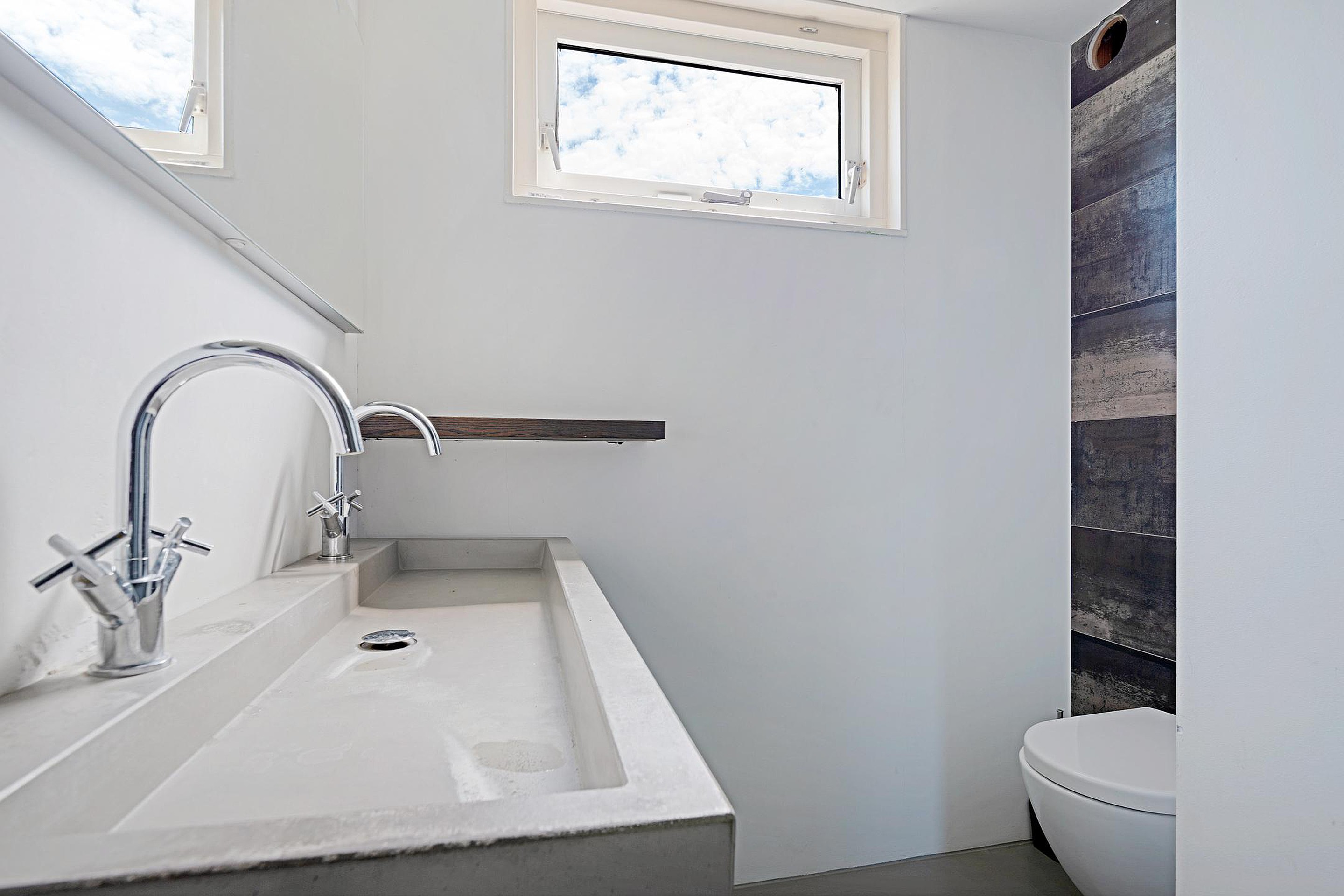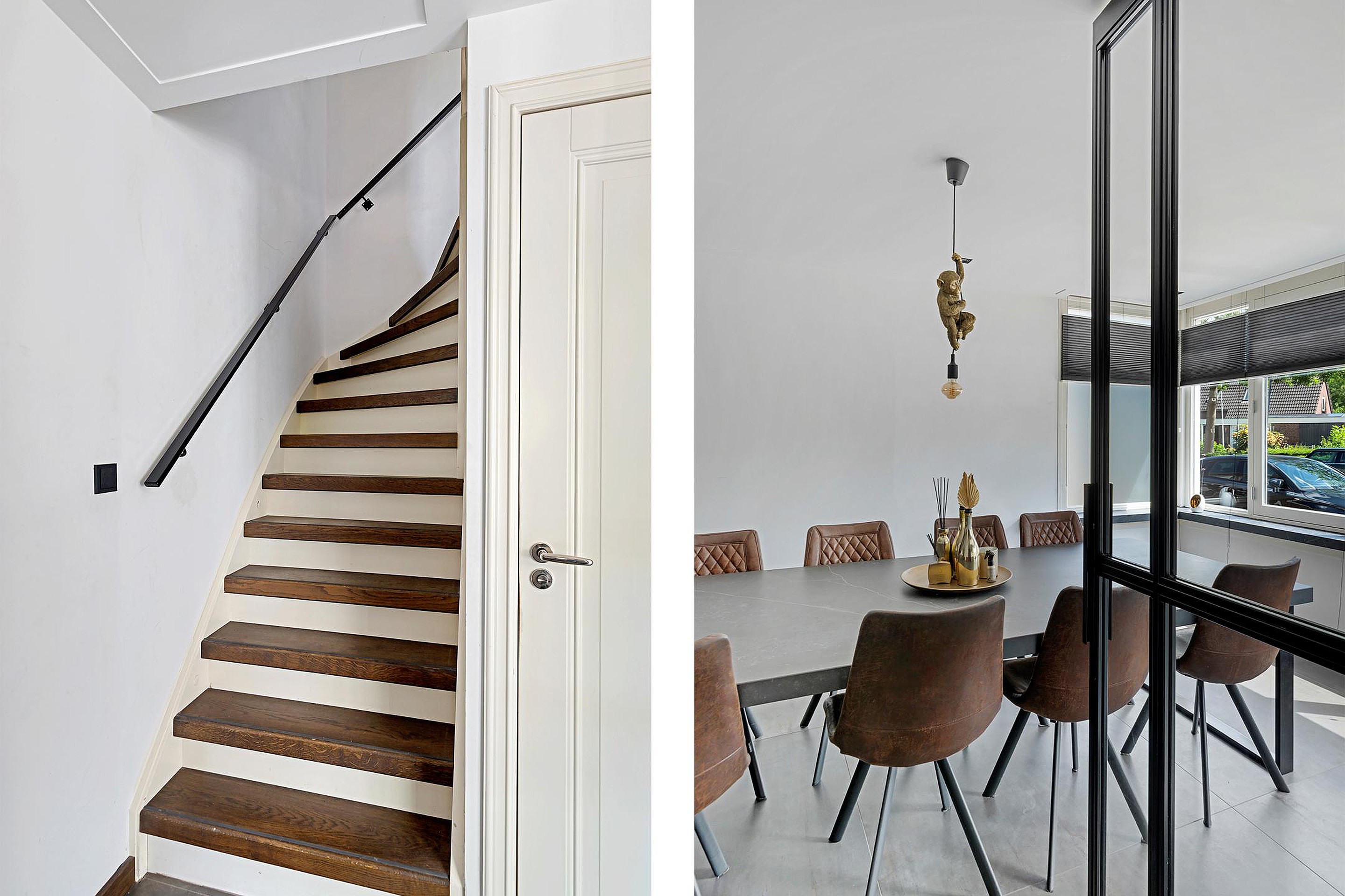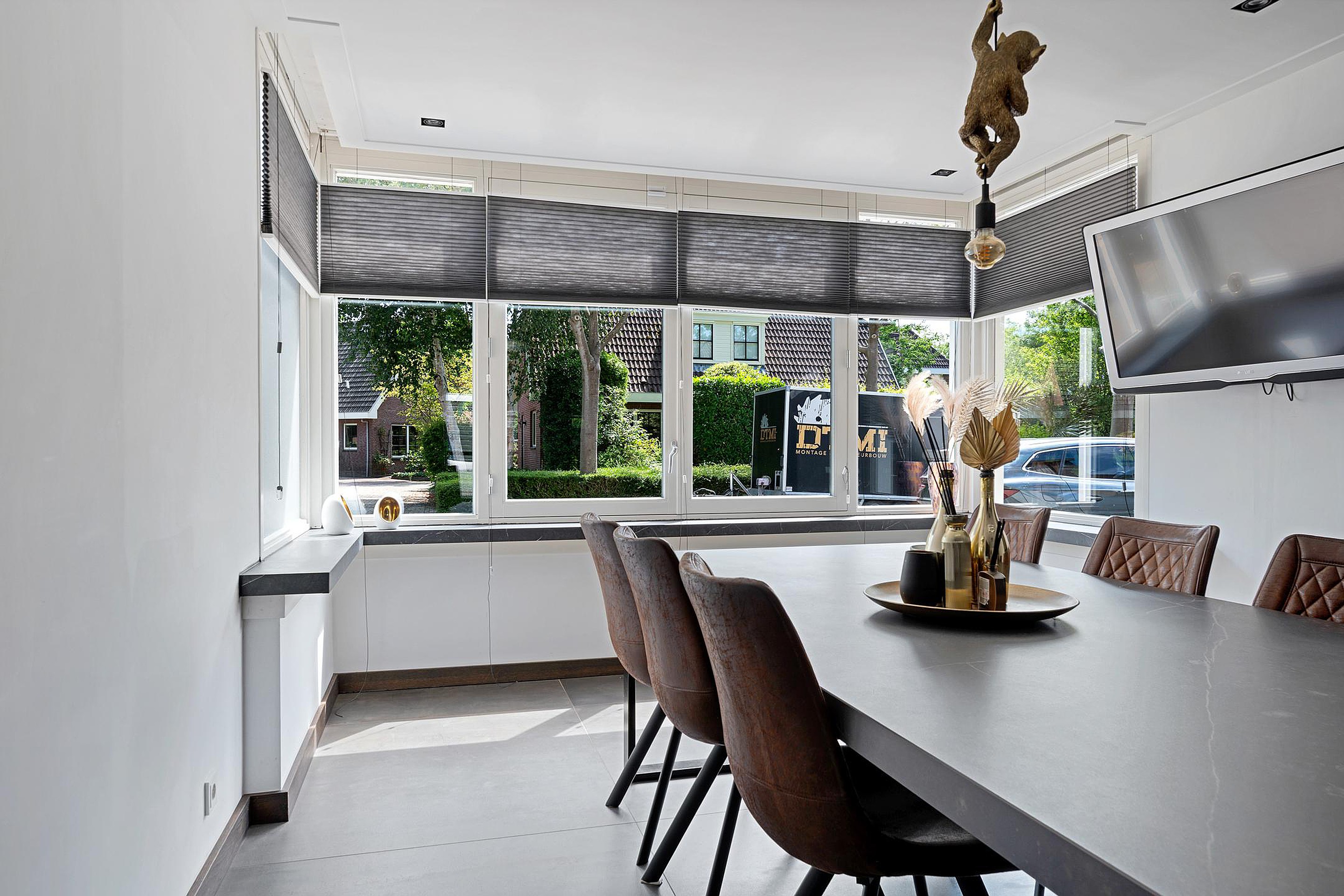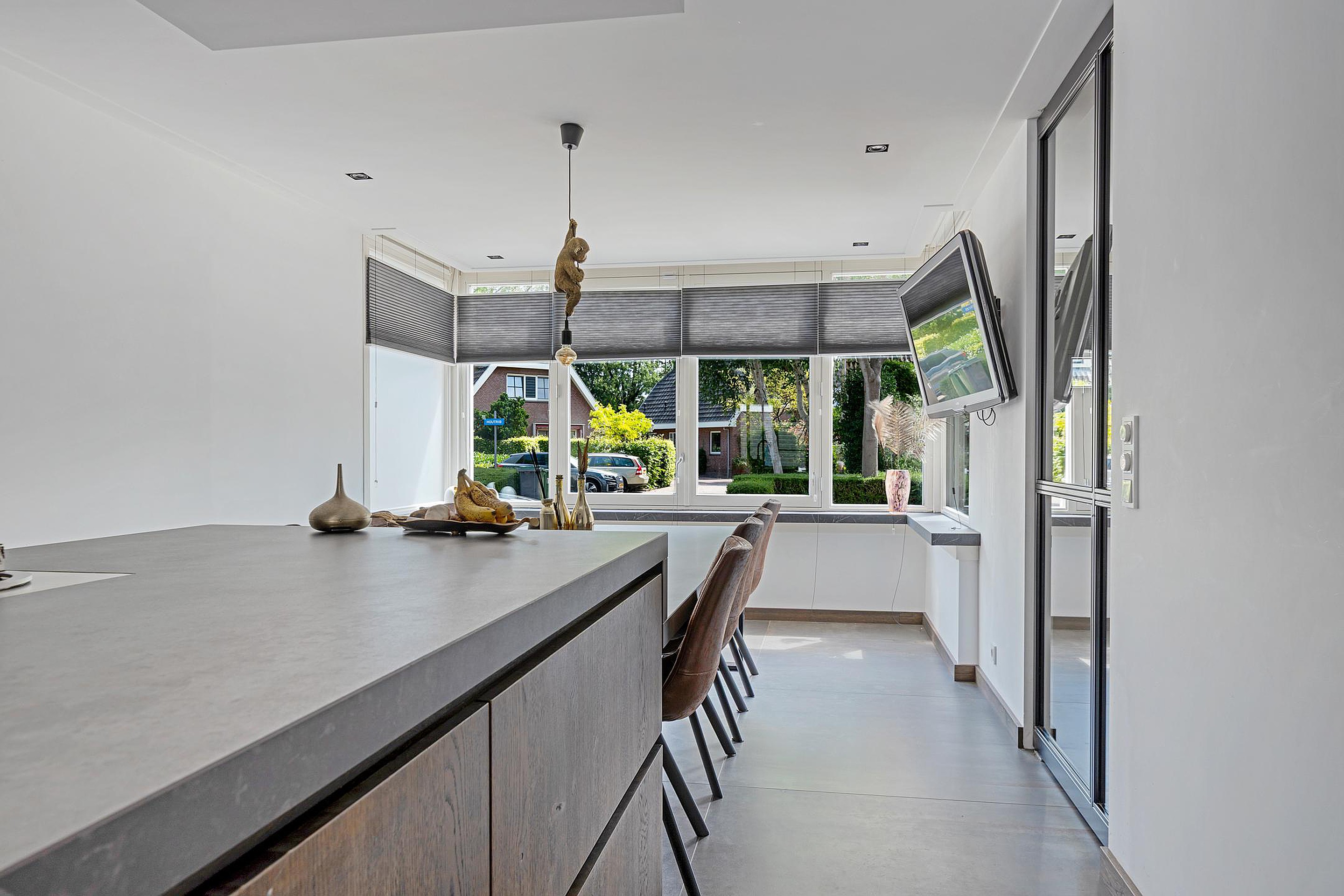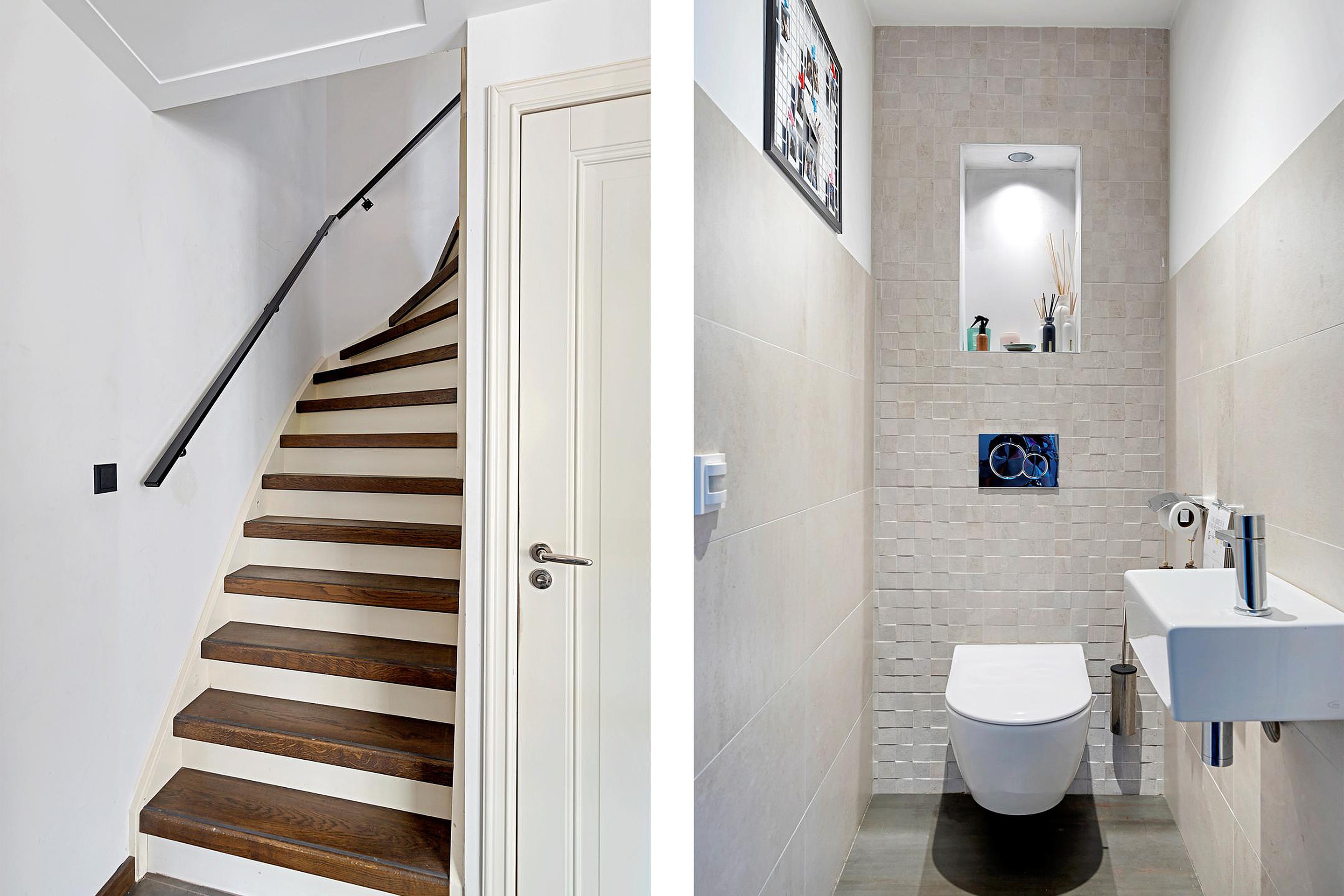De woning is zowel aan de voor- als achterzijde flink uitgebouwd, waardoor er bijzonder veel leefruimte is ontstaan op de begane grond. Via de hal, met nieuwe meterkast en zeer mooi afgewerkte toiletruimte, loop je via de stalen deur de grote woonkeuken aan de voorzijde van de woning in. Direct vallen de prachtige gietvloer en het stoere aanrechtblad van Dekton op. Dit onderhoudsvrije natuurstenen blad loopt door in een ruime eettafel. Een prachtig geheel. In deze moderne keuken ontbreekt het je uiteraard aan niets. Een dubbele koelkast met vriezer, een strak vormgegeven 4-pits gasfornuis, vaatwasser, koffiemachine, ruime klimaatkast voor alle wijnen, een oven, magnetron, hogedruk stoomoven en koffiemachine van Miele zijn in deze handgemaakte keuken te vinden.