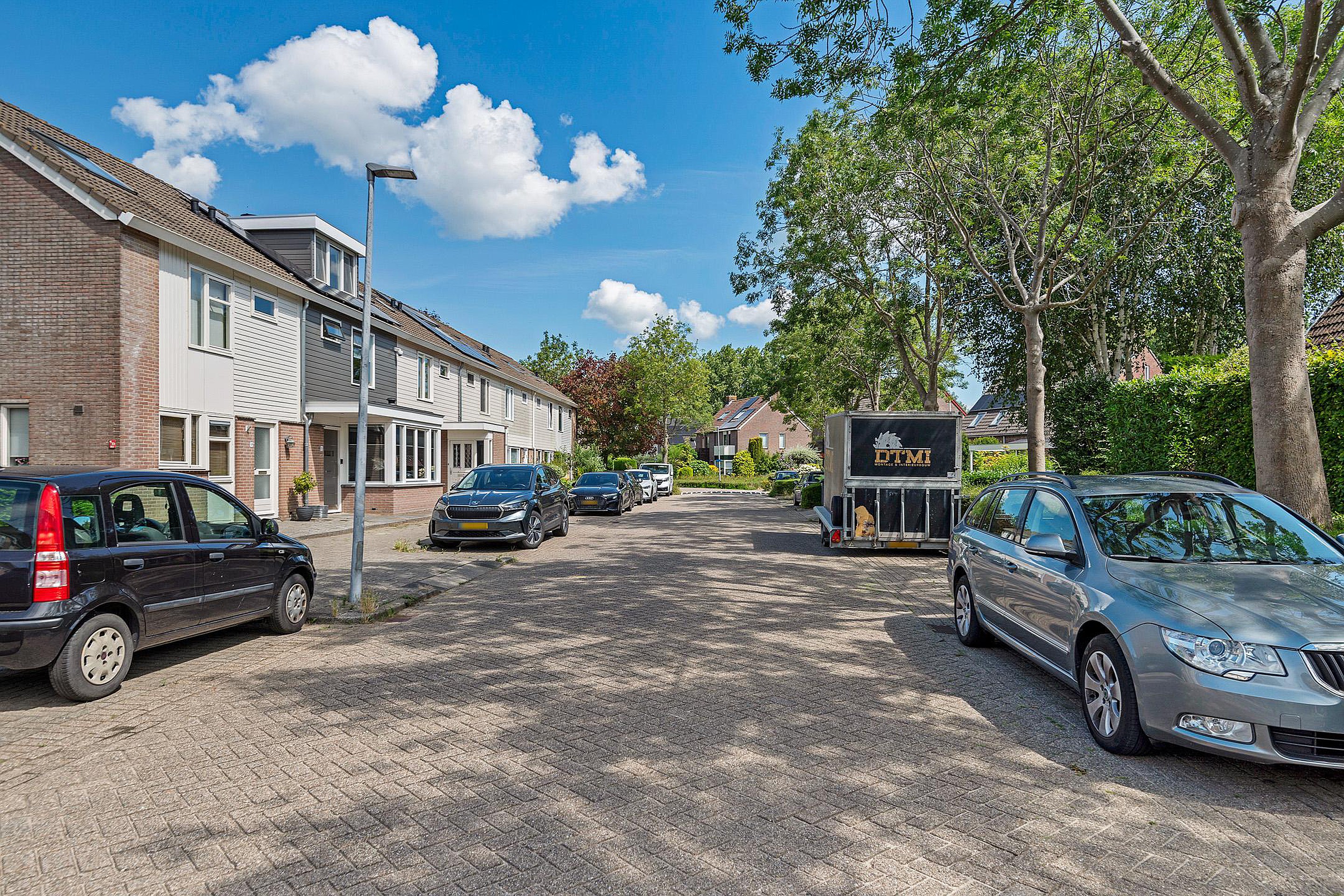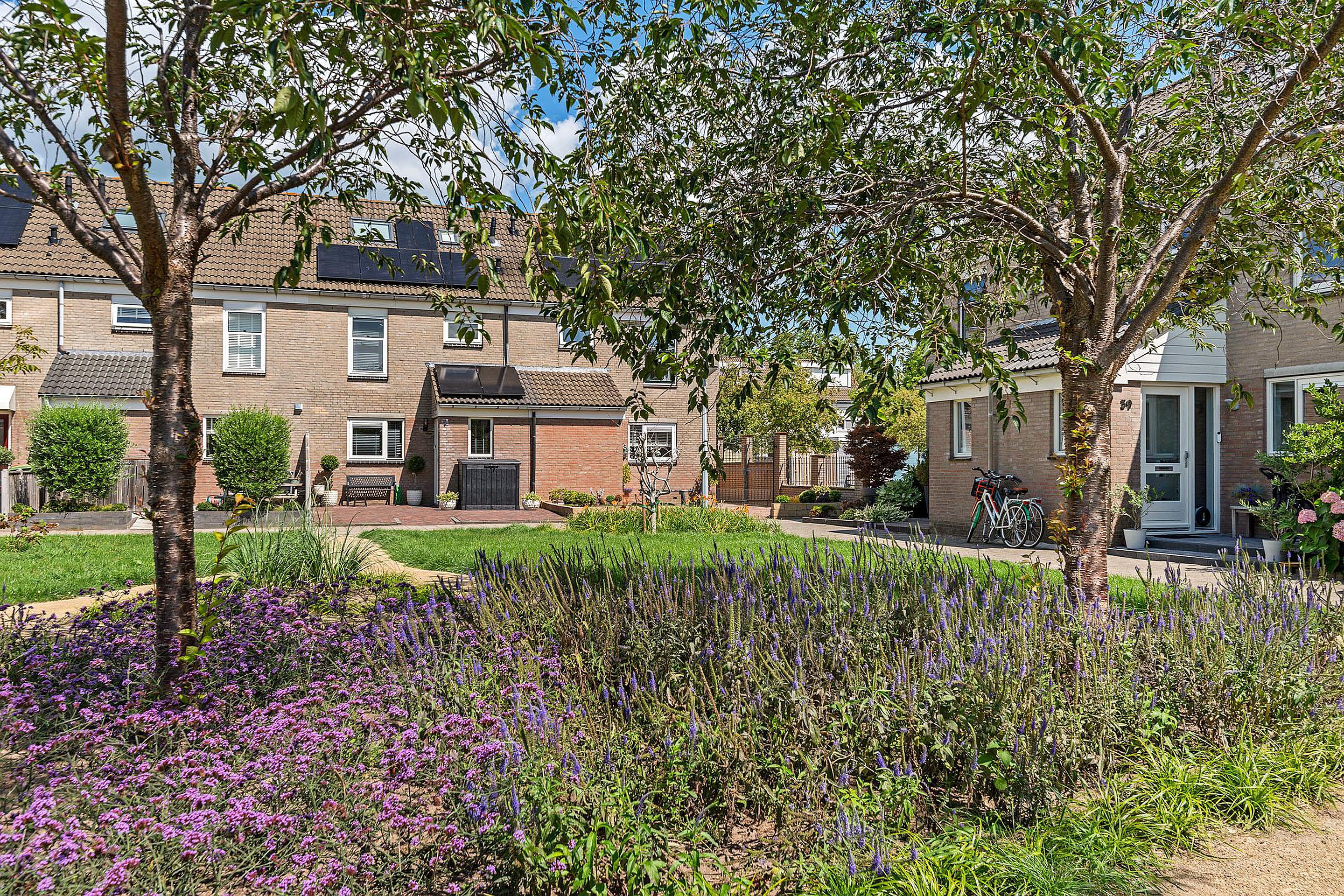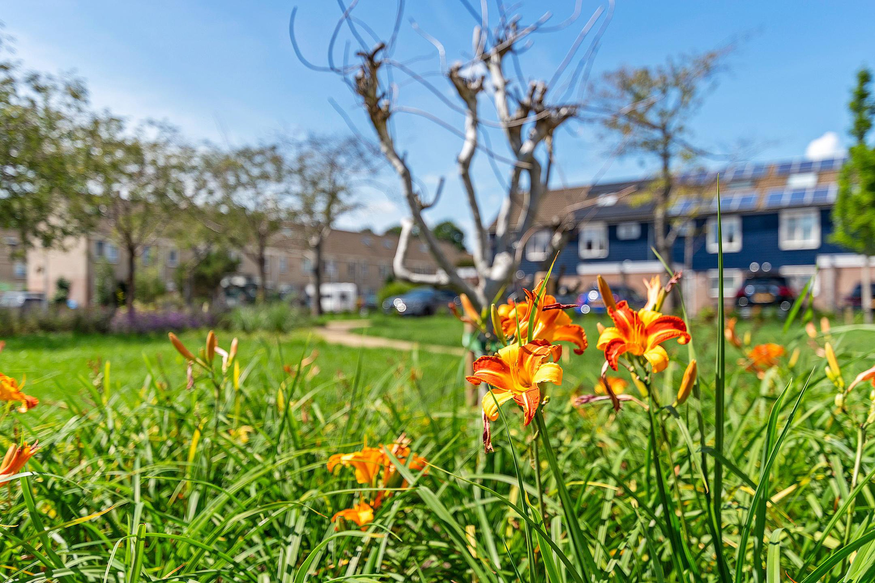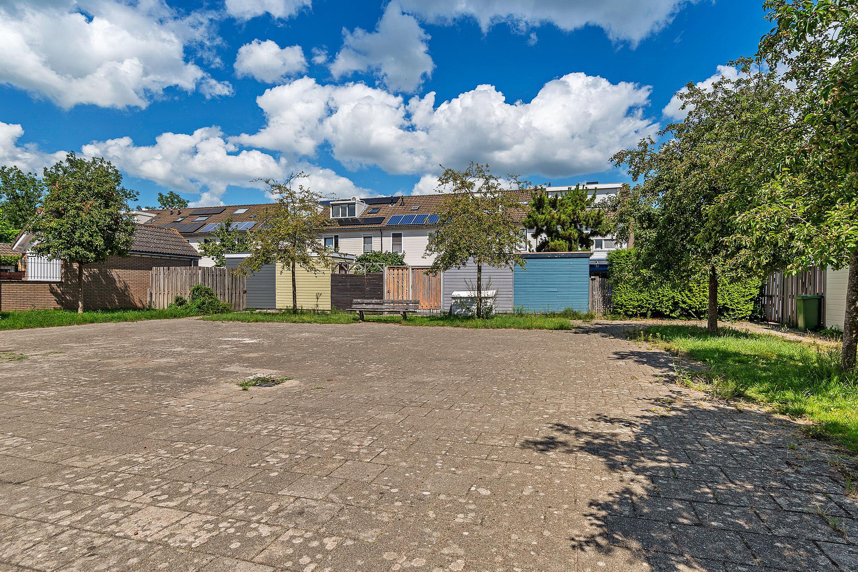 Aan de Houtrib is voldoende gratis parkeergelegenheid direct voor het huis. Je vindt hier altijd wel een plekje voor je auto op de openbare weg. De achtertuin op het noordwesten is bijna 9 meter diep en 5,5 meter breed en is geheel bestraat met grote grijze tegels en voorzien van een donkere schutting. Achterin de tuin bevindt zich een houten schuur, voorzien van elektra. Via de poort kom je uit op een groot plein waar kinderen veilig en naar hartenlust kunnen spelen.