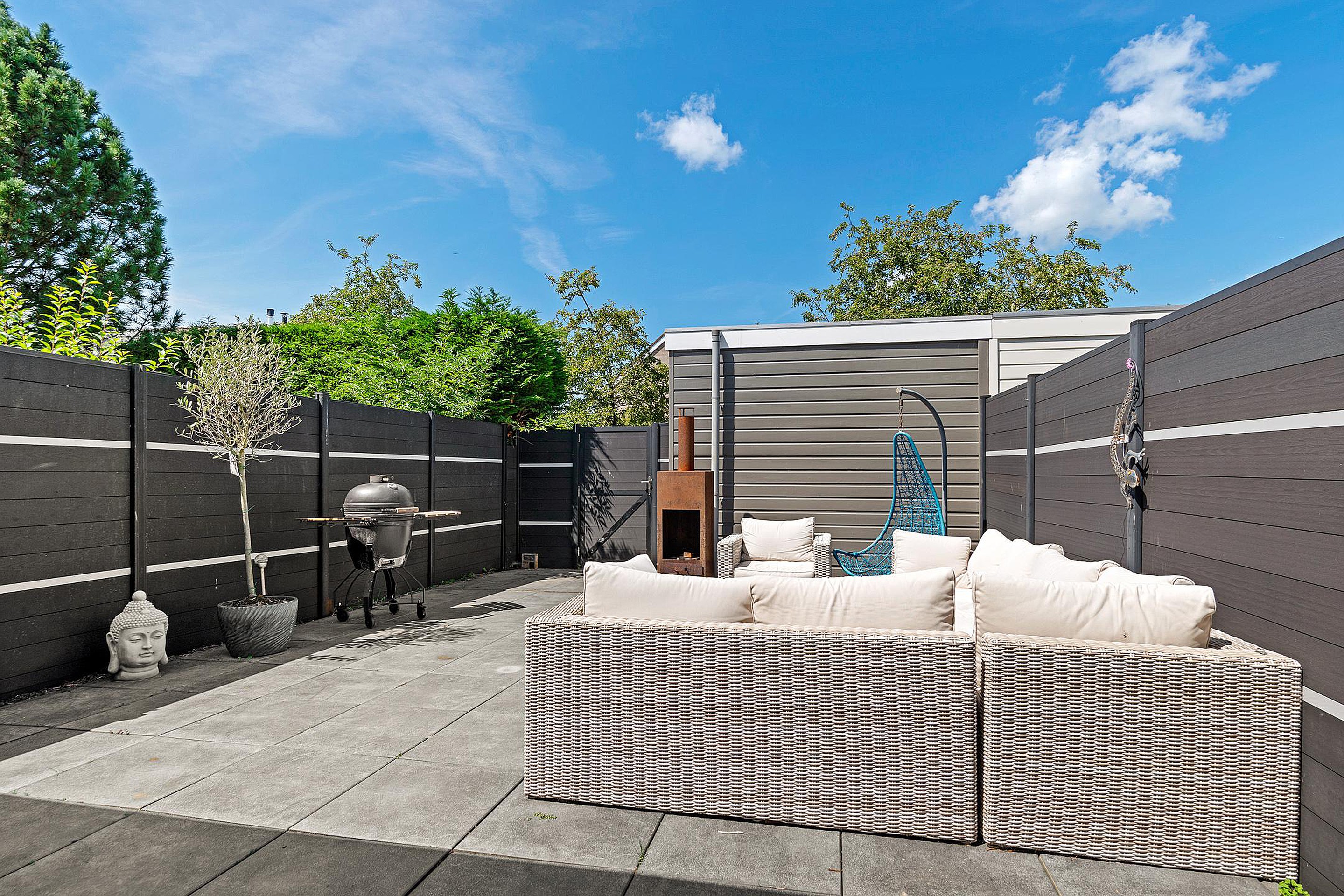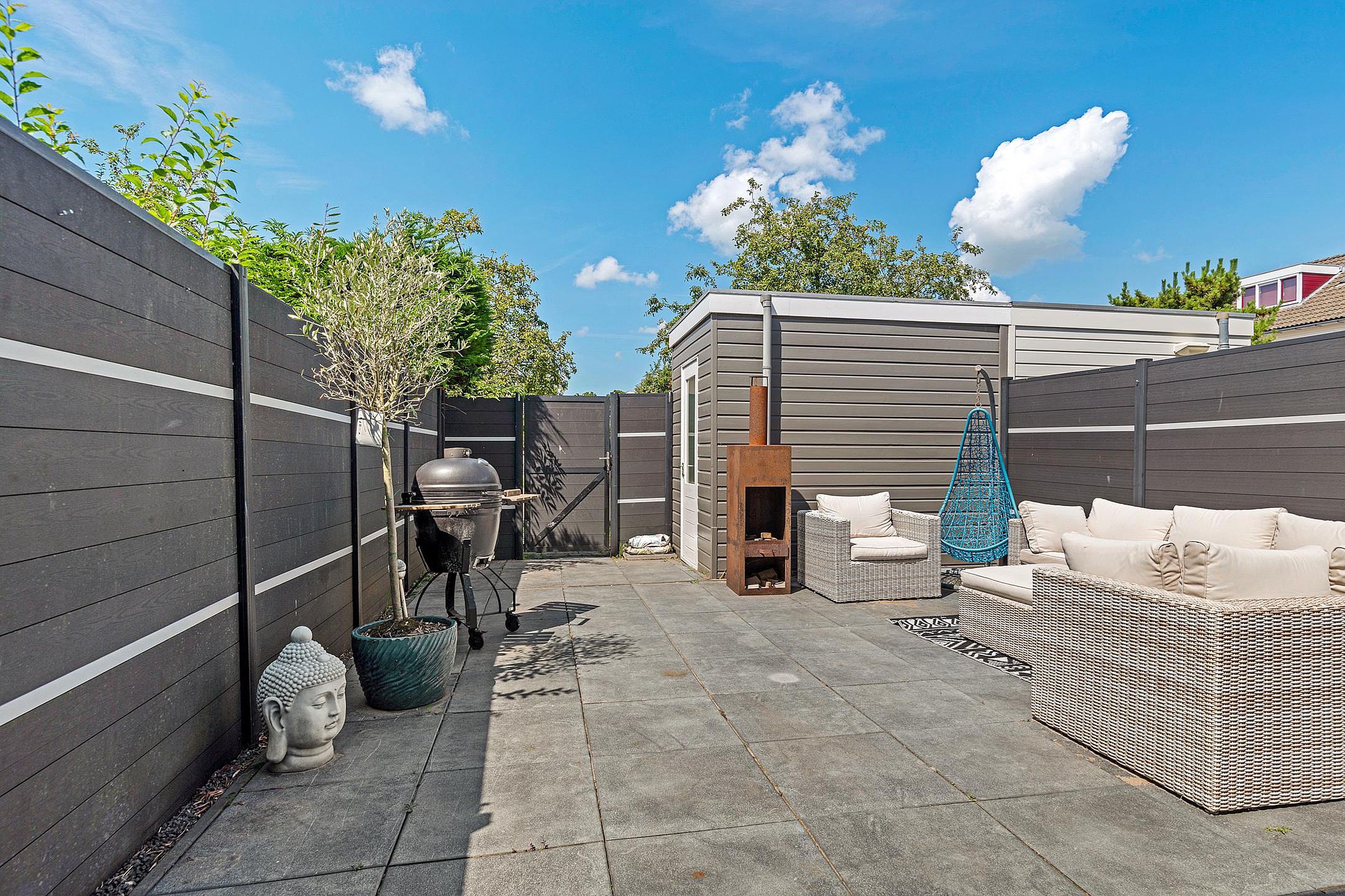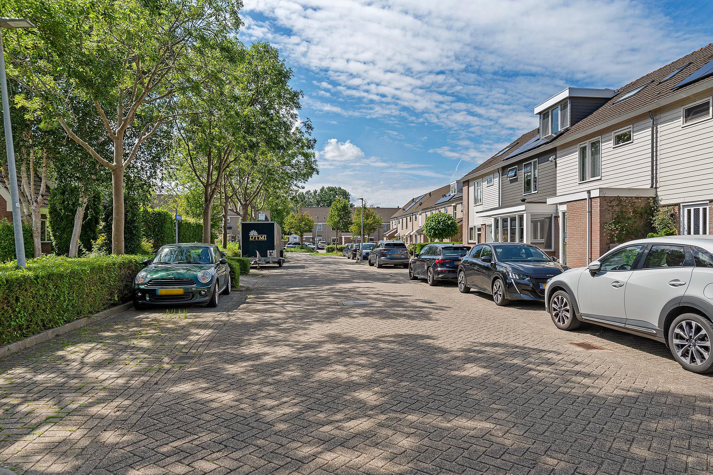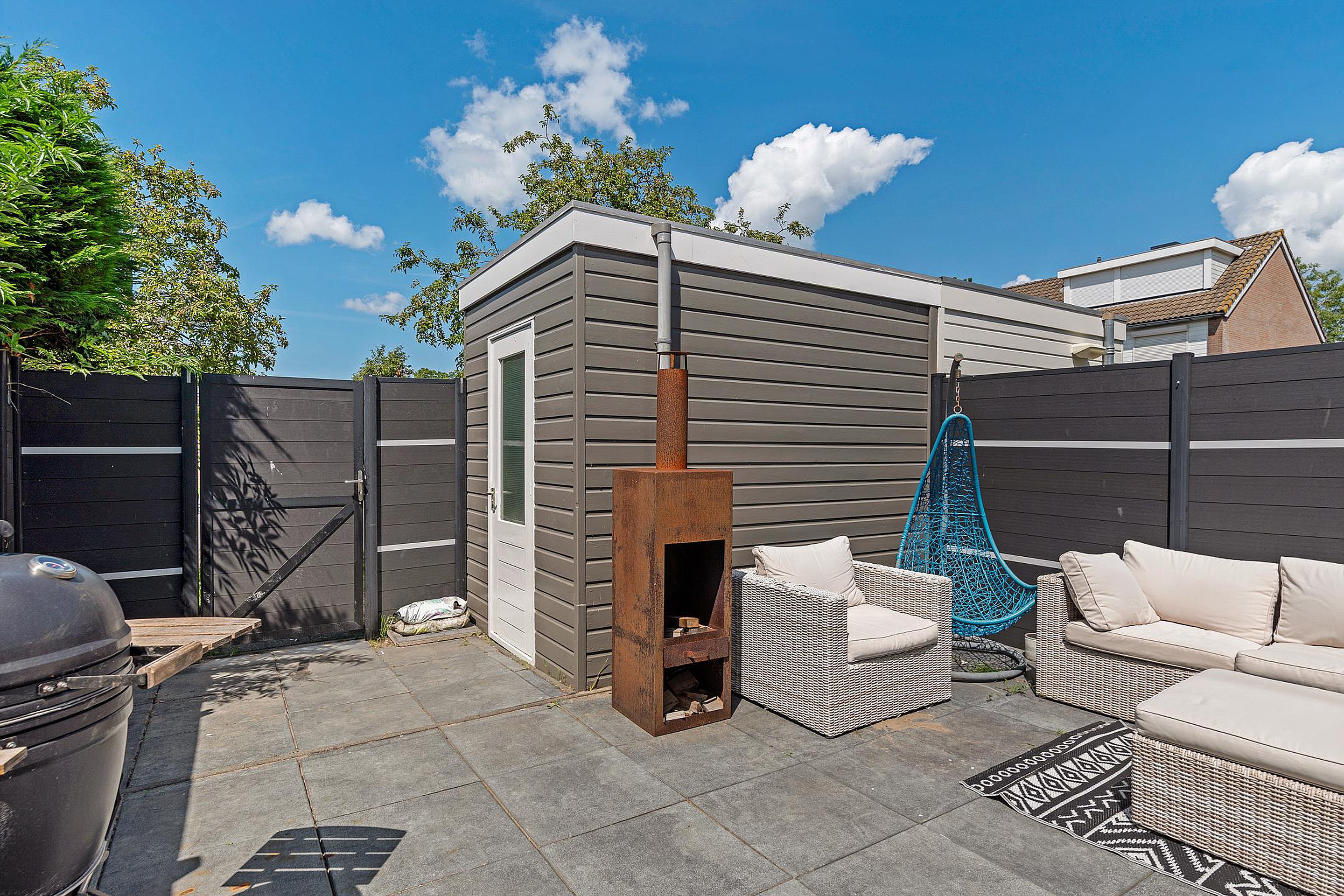 Aan de Houtrib is voldoende gratis parkeergelegenheid direct voor het huis. Je vindt hier altijd wel een plekje voor je auto op de openbare weg. De achtertuin op het noordwesten is bijna 9 meter diep en 5,5 meter breed en is geheel bestraat met grote grijze tegels en voorzien van een donkere schutting. Achterin de tuin bevindt zich een houten schuur, voorzien van elektra. Via de poort kom je uit op een groot plein waar kinderen veilig en naar hartenlust kunnen spelen.