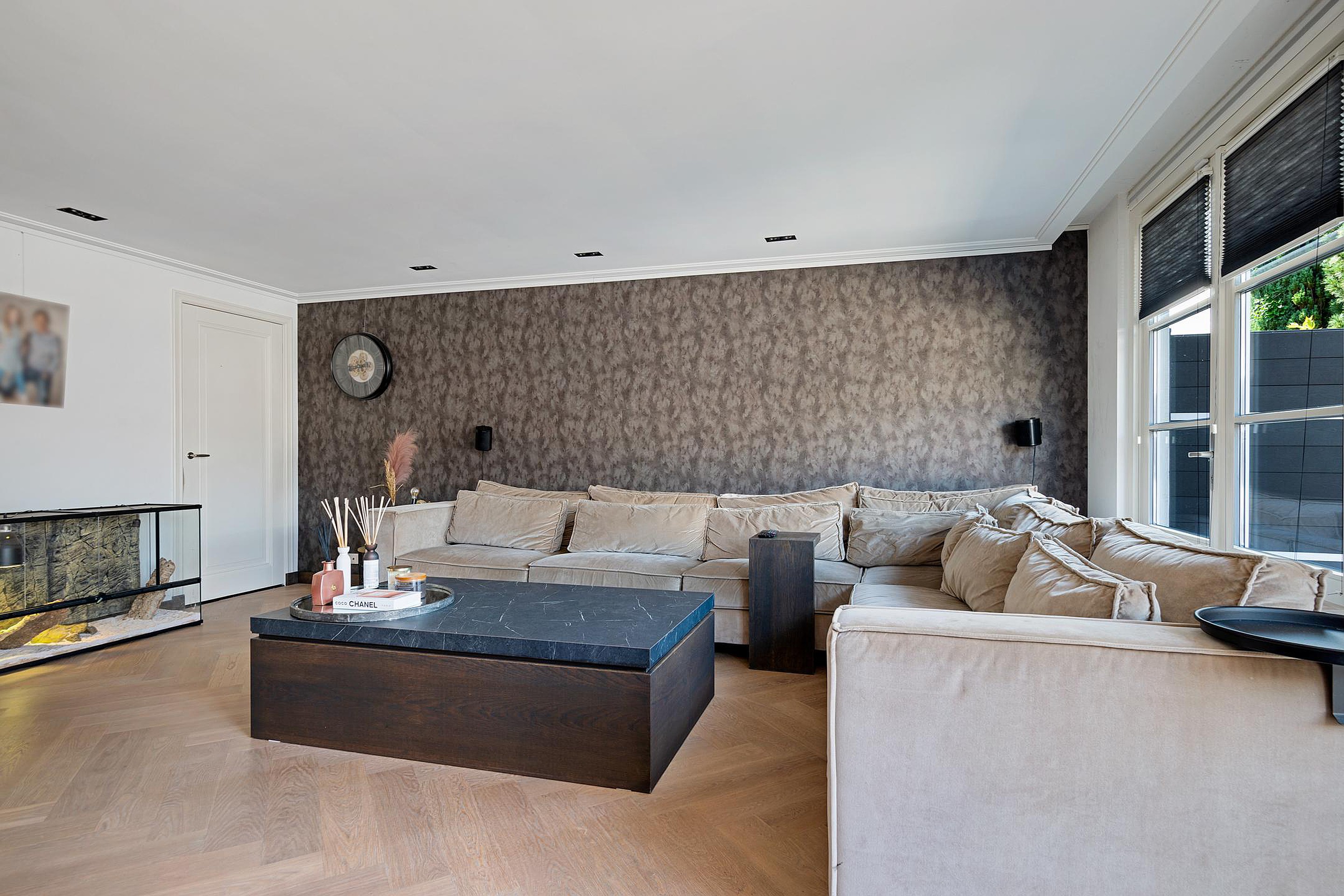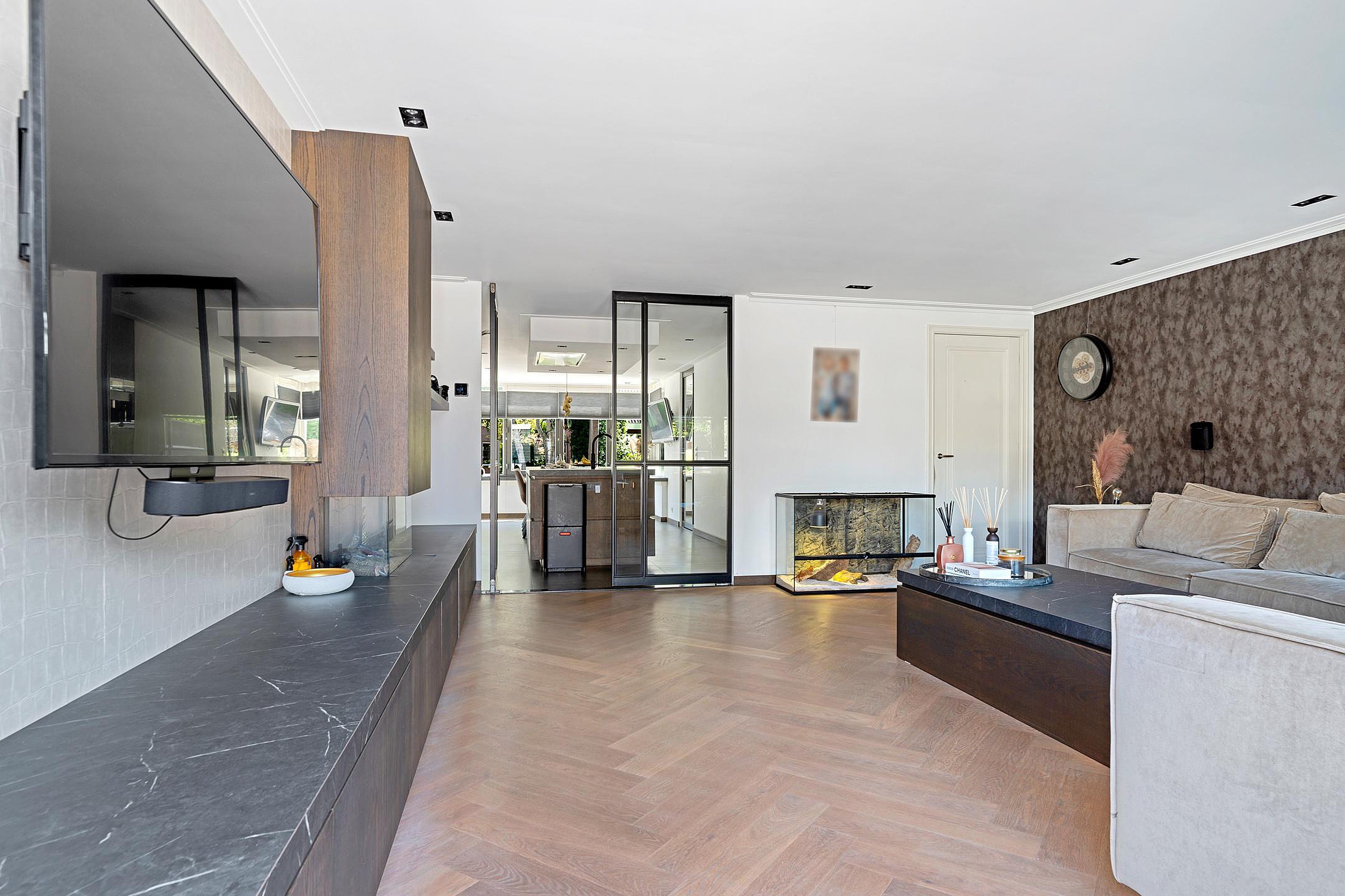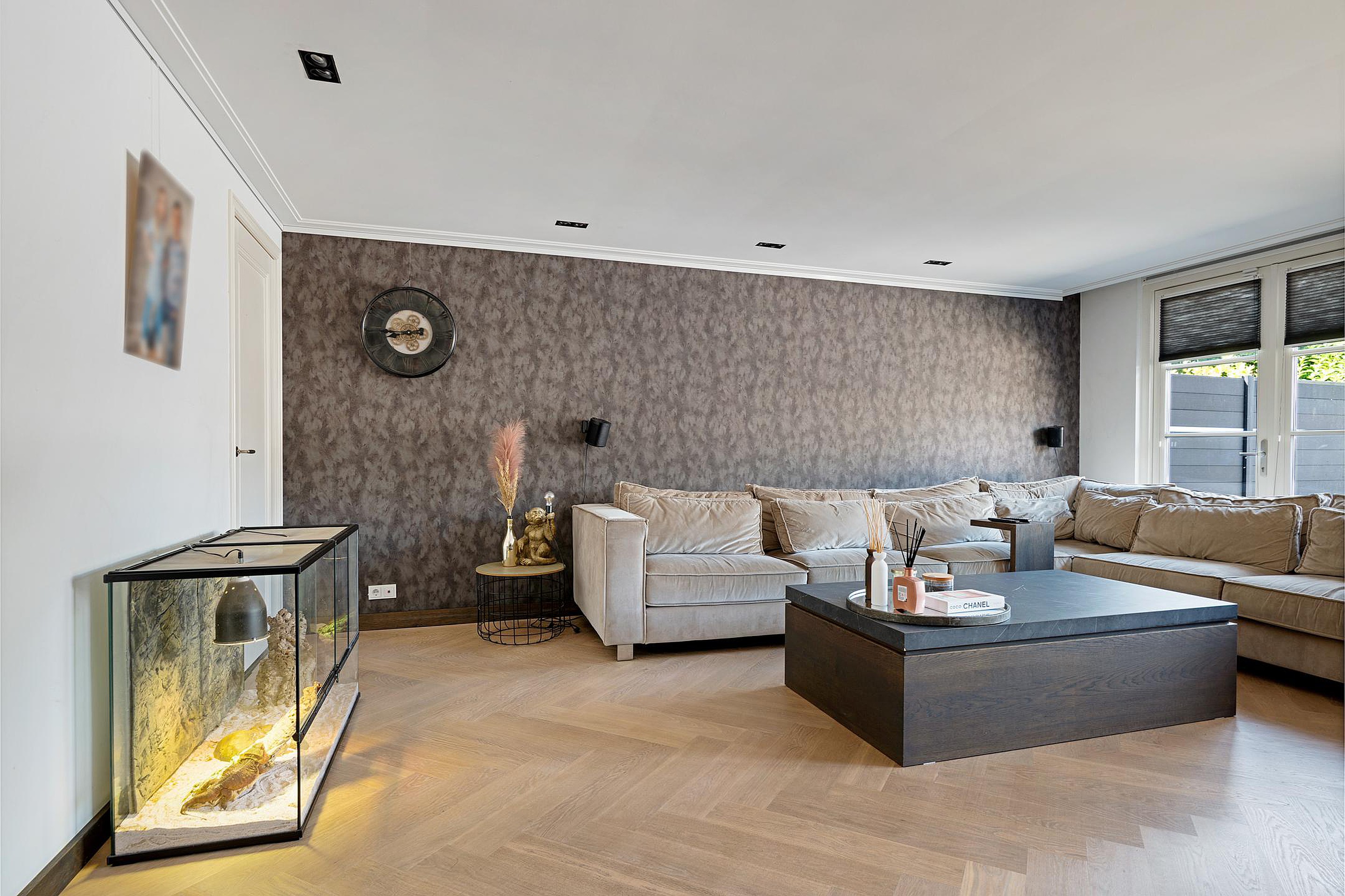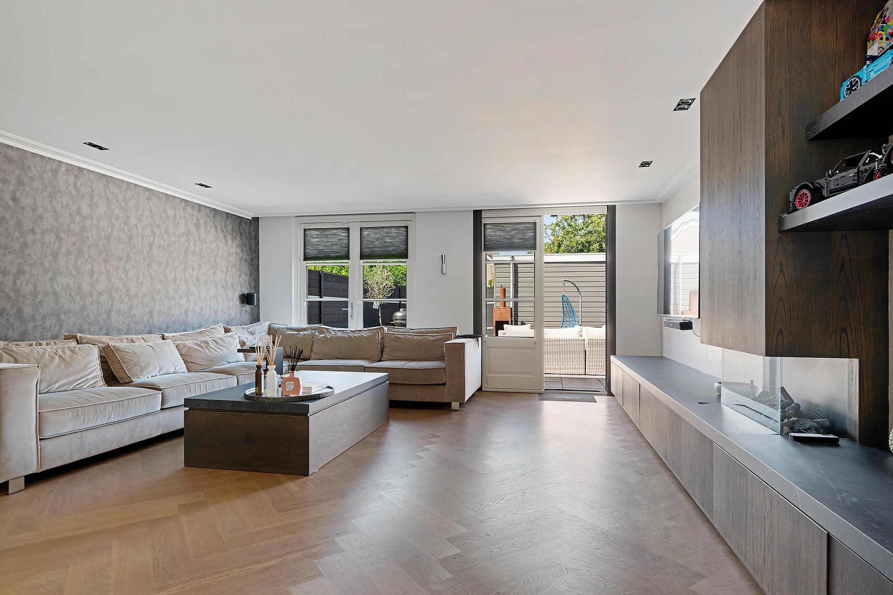 Via de openslaande stalen tussendeuren stap je van de woonkeuken zo de achtergelegen woonkamer in, die uitzicht biedt op de achtertuin. De woonkamer heeft dubbele openslaande deuren, waardoor er een zee van licht binnenkomt. De fraaie eikenhouten visgraatvloer geeft een bijzonder mooi effect. Vanuit de woonkamer is een grote voorraadkast onder de trap te bereiken. Net als in de keuken zijn wanden en plafonds strak gestuukt en voorzien van inbouwspots. Bovendien is de gehele begane grond voorzien van vloerverwarming.