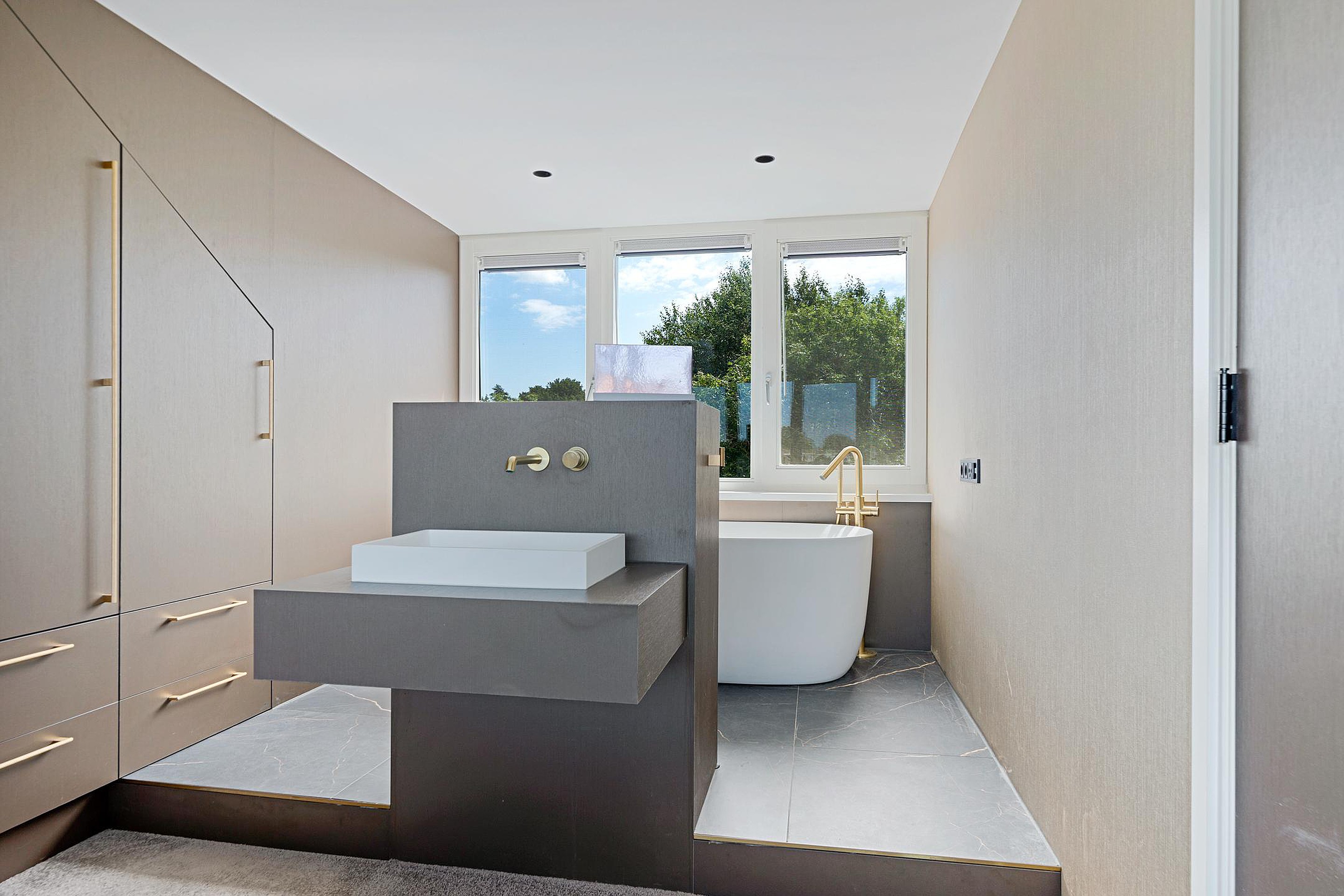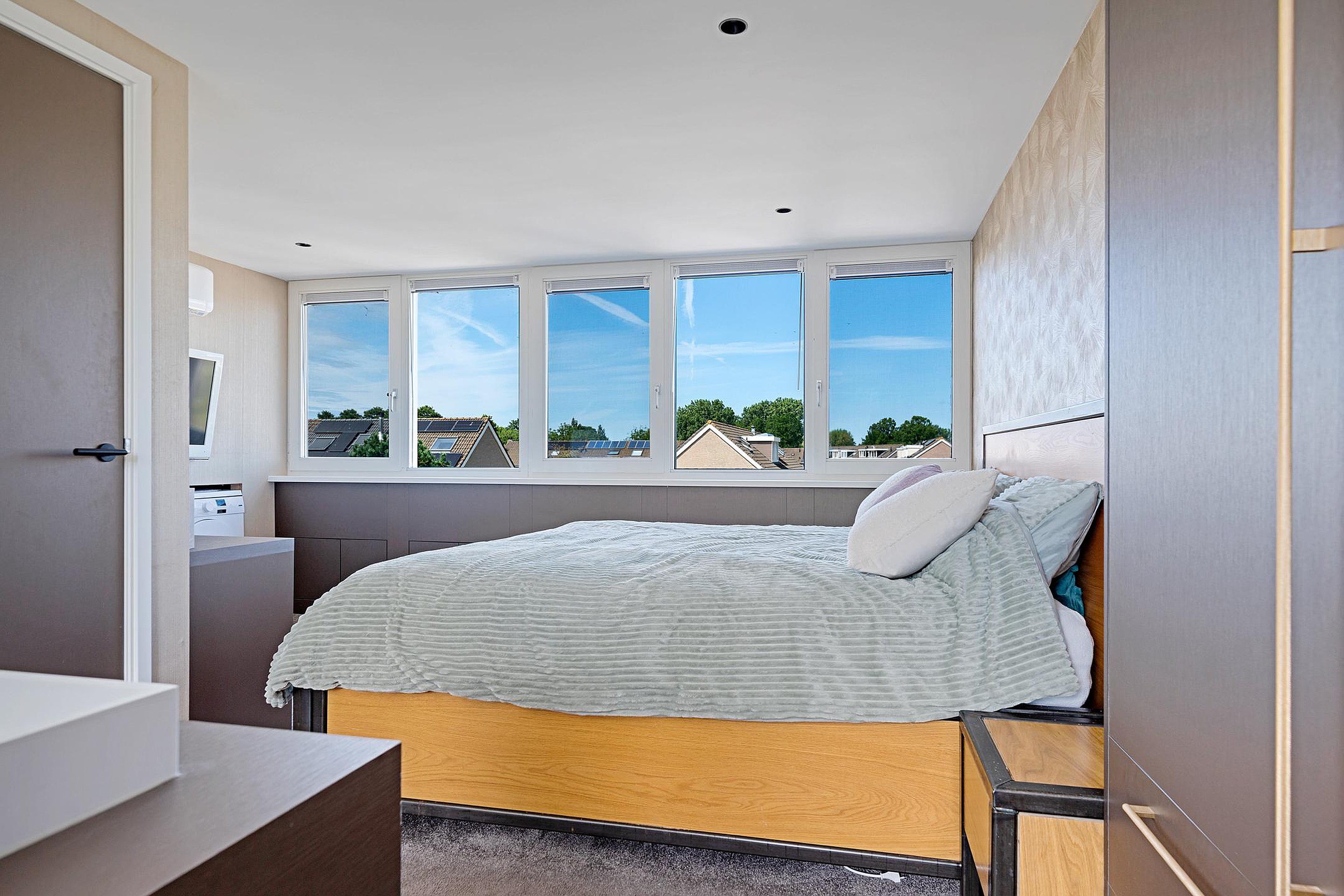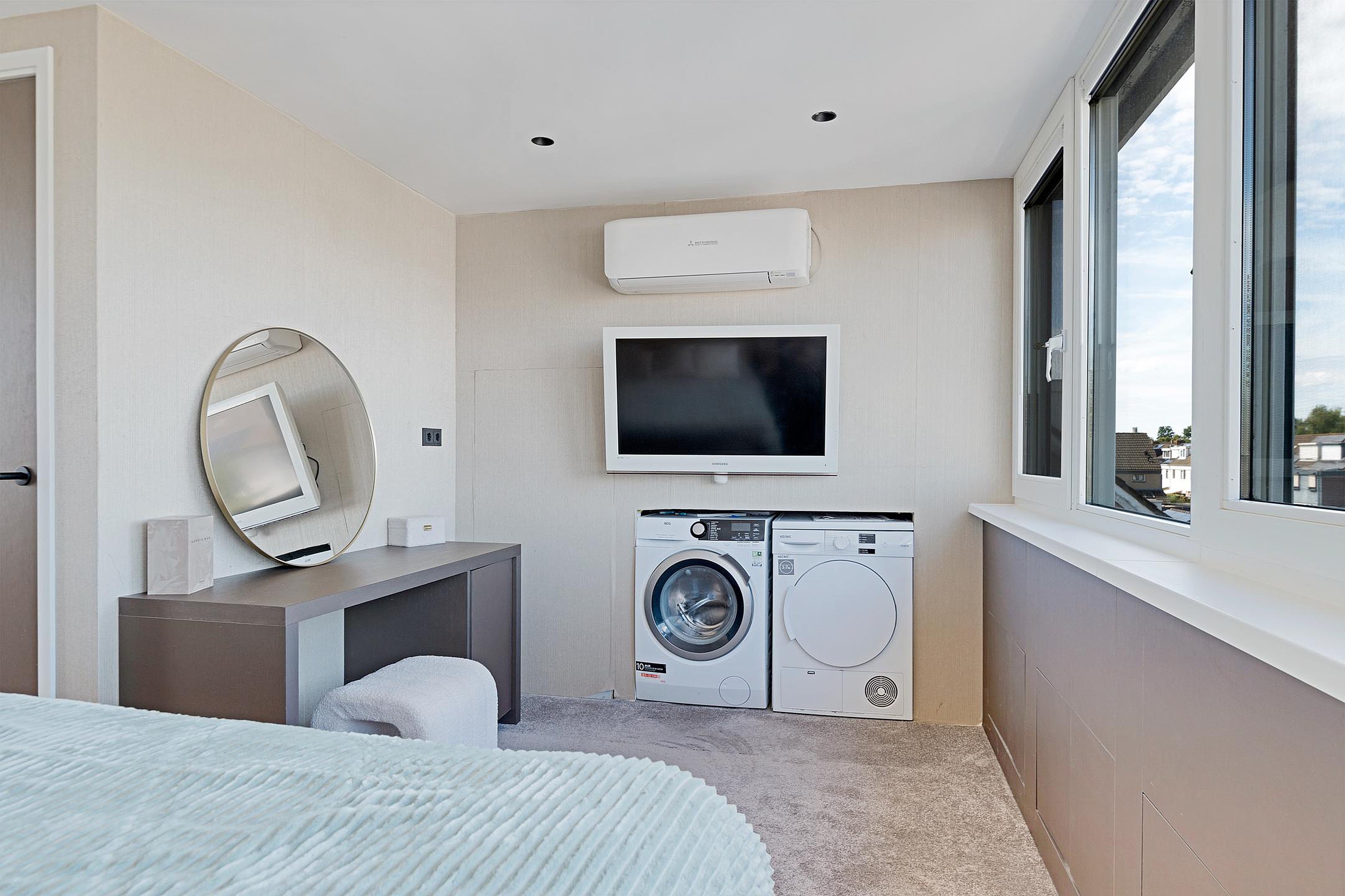Op de bovenste etage wacht je nog een verrassing: hier is een vierde slaapkamer gerealiseerd met een grote dakkapel aan de achterkant en een kleinere aan de voorzijde. Je vindt hier de ruime master bedroom met badkamer en-suite, voorzien van wastafel en ligbad. Door de airconditioning blijft deze etage ook op warme dagen heerlijk koel. Er is slim met de ruimte om gegaan, met een praktische, op maat gemaakte kastenwand onder het schuine dakvlak voor je kleding. Ook de Cv-ketel, wasmachine en droger zijn keurig weggewerkt.