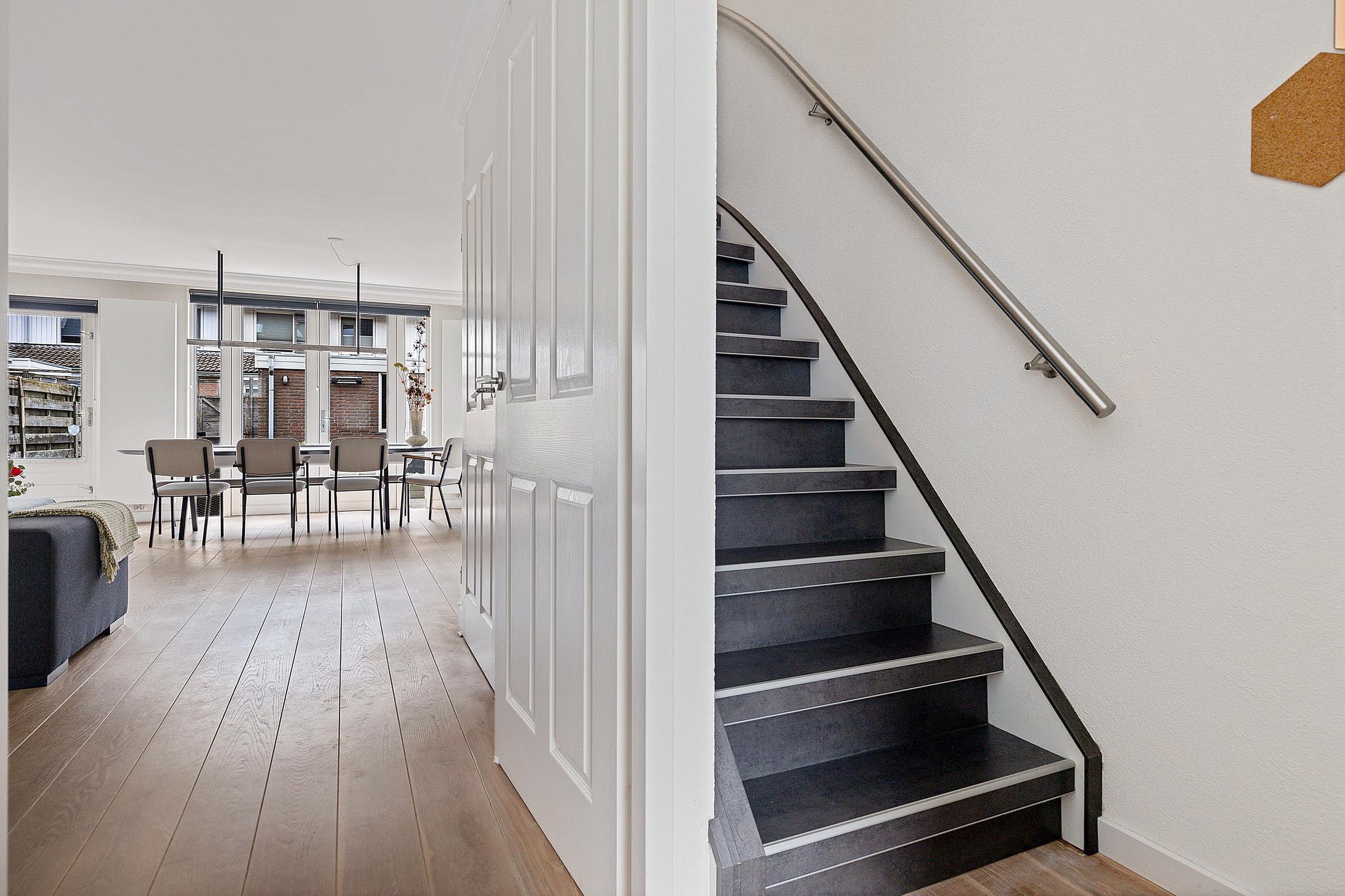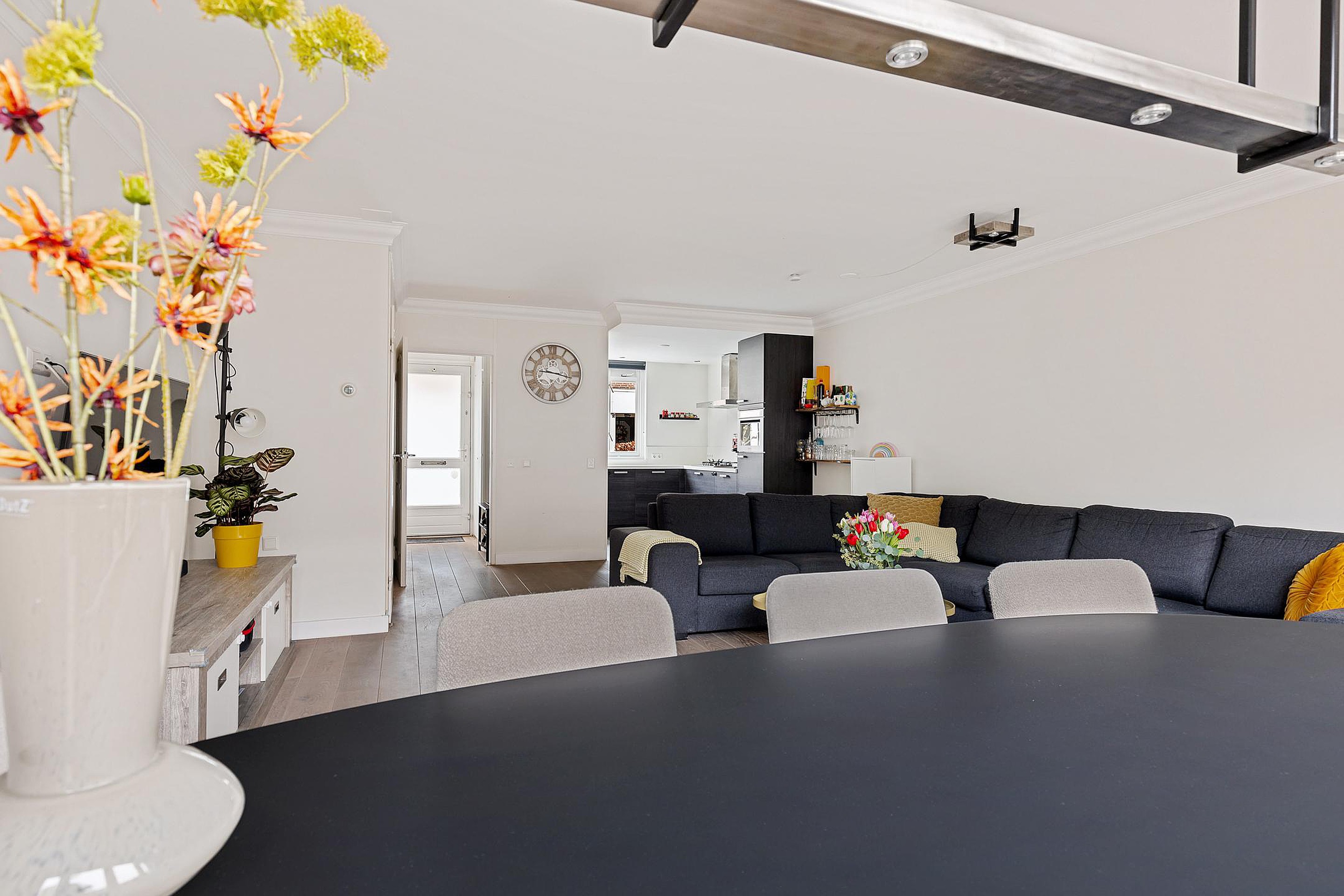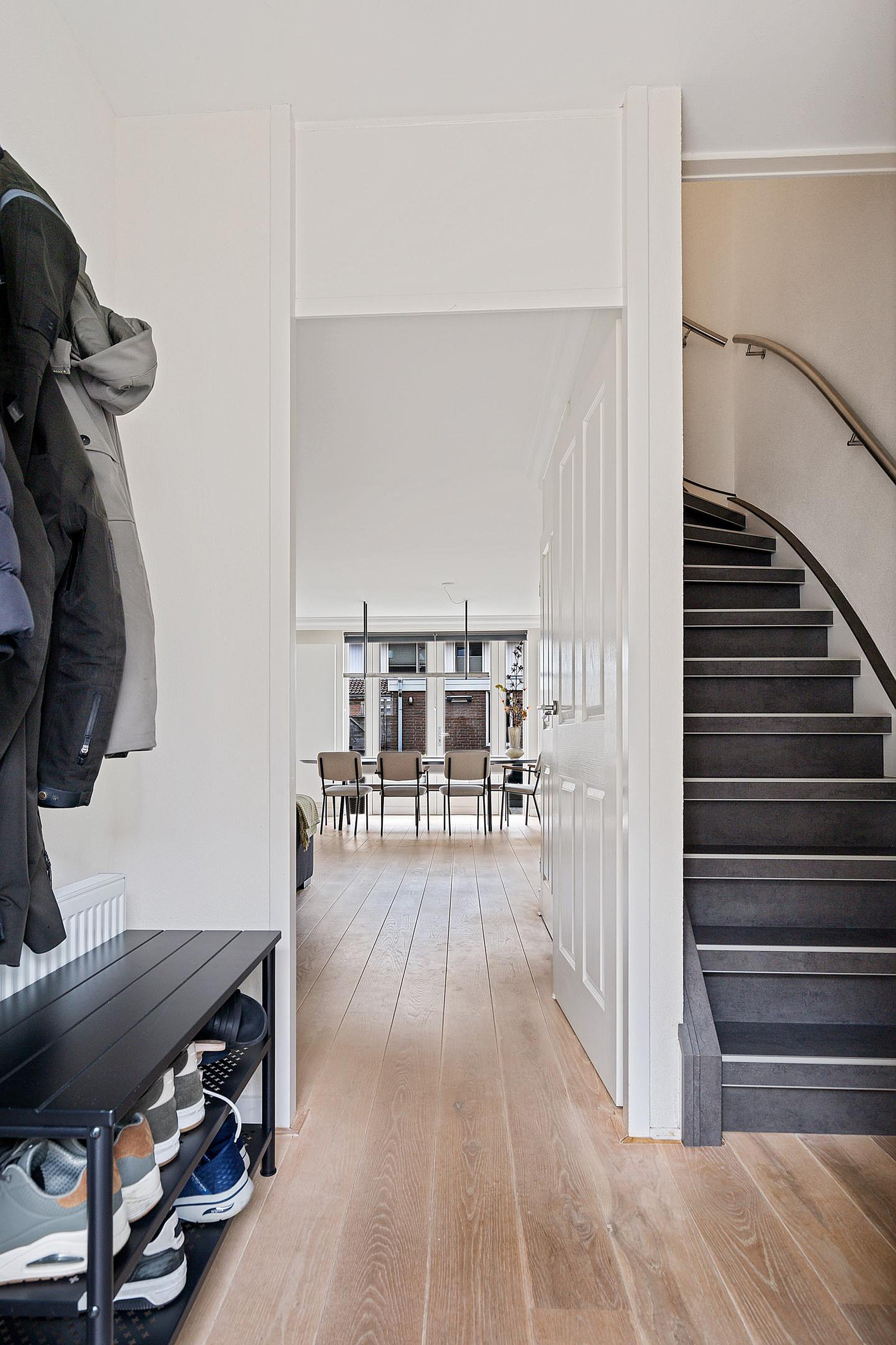 Via de hal, met 14-groeps meterkast, trapopgang en moderne toiletruimte voorzien van een fonteintje, stap je de royale woonkamer in, die is voorzien van een houten vloer en wanden en plafond in neutrale kleuren, inclusief een fraaie sierlijst. De leefruimte is aan de achterzijde gerealiseerd en heeft prettig veel lichtinval door de extra brede openslaande deuren. Je hebt hier alle ruimte voor een gezellige zit- en eethoek. Extra bergruimte gerealiseerd in de kast onder de trapopgang die vanuit de woonkamer toegankelijk is.