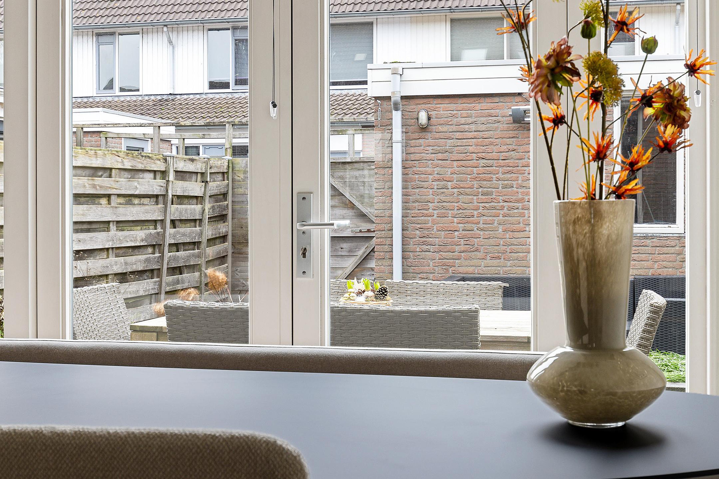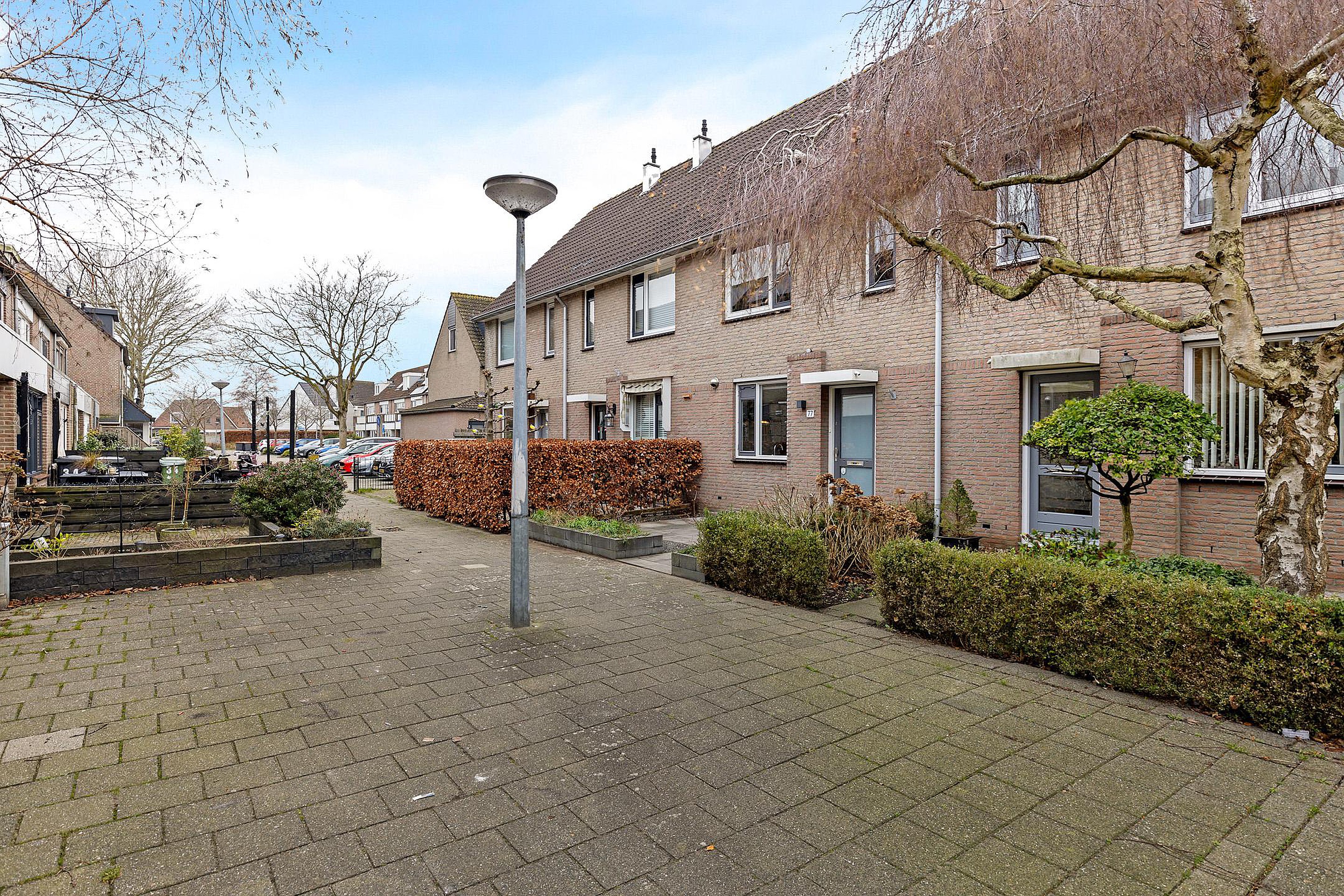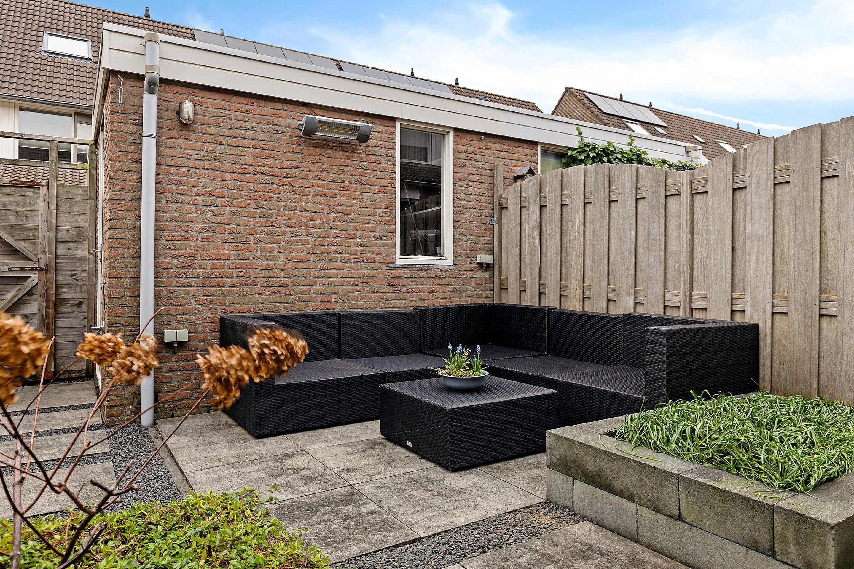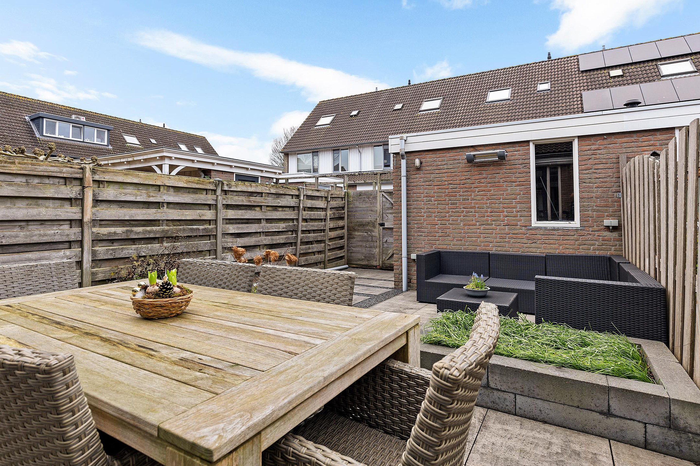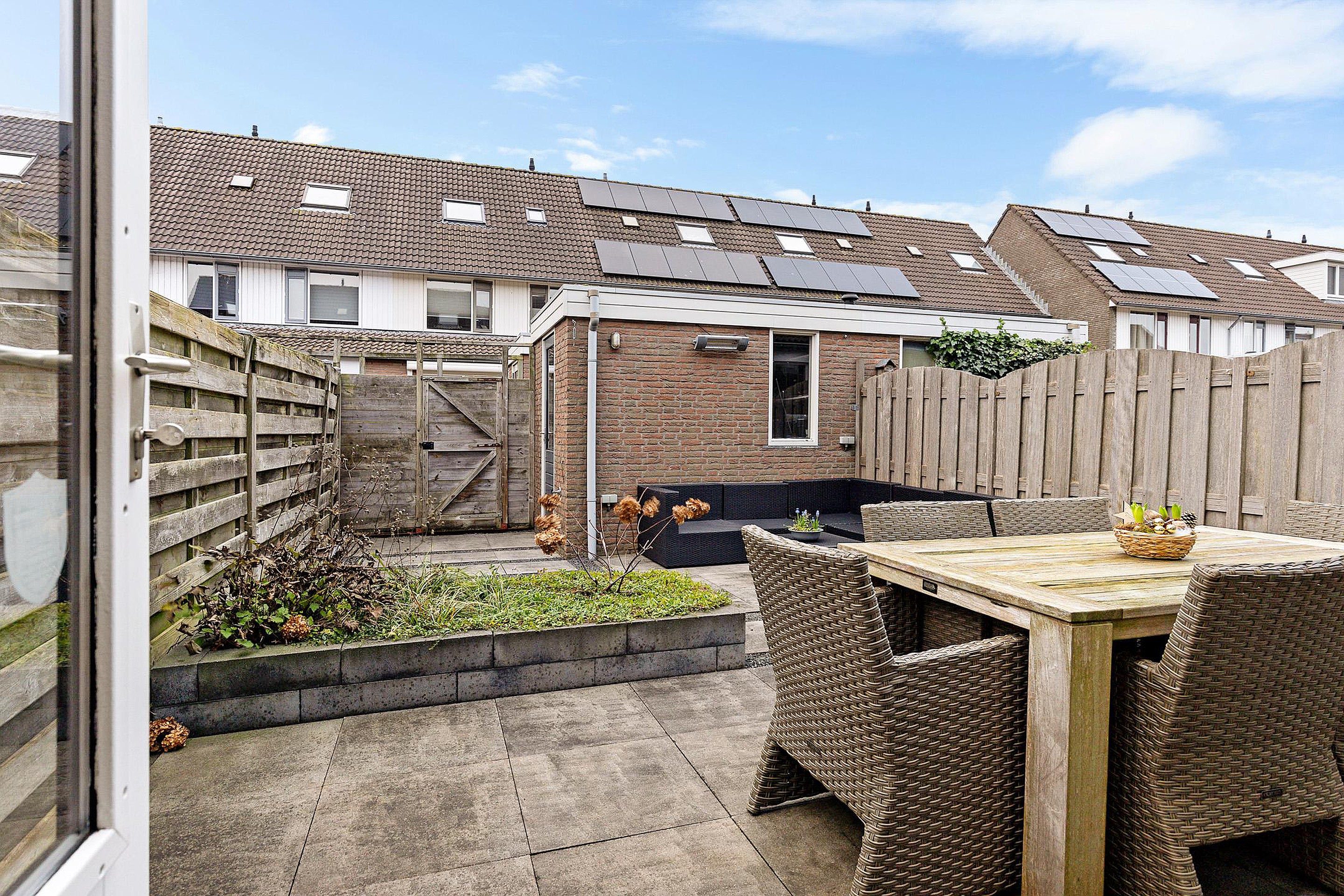 De woning is aan de voorzijde gelegen aan een rustig wandelpad. Parkeren kan hier aan de zijkant van het huizenblok op het centrale parkeerterrein. Groot voordeel is dat kinderen daardoor ongehinderd door verkeer voor de deur kunnen spelen. De voortuin op het zuidoosten is grotendeels bestraat en voorzien van groene borders. De achtertuin ligt op het noordwesten. Daardoor heb je zon tot de laatste stralen. Ook de achtertuin is onderhoudsarm: grotendeels bestraat en voorzien van groene afscheidingsborders tussen de twee terrassen. Achterin de tuin staat een stenen berging voorzien van elektra. De poort komt uit op de achtergelegen steeg.