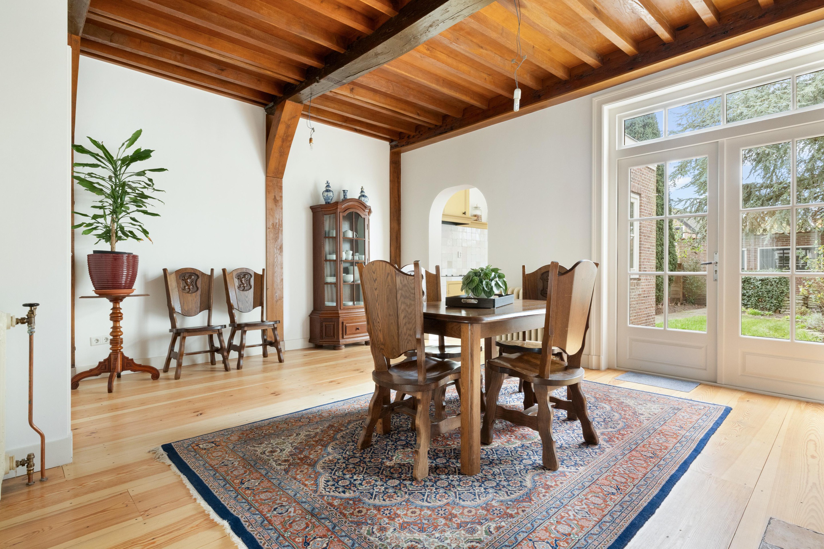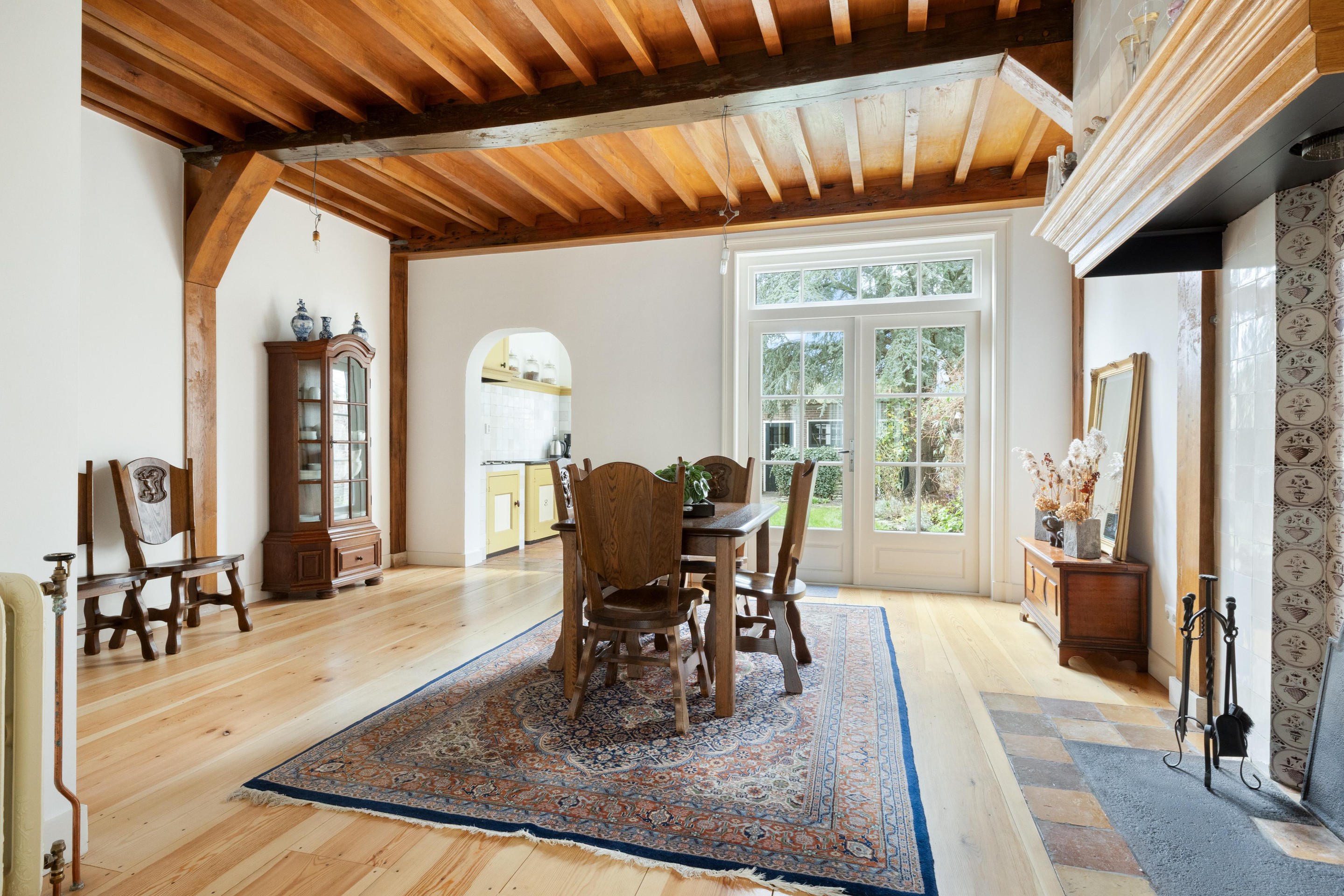De woonkamer is een heerlijke leefruimte met een indrukwekkende plafondhoogte van maar liefst 3,05 meter, wat zorgt voor een bijzonder ruimtelijk en licht gevoel. Vanuit hier geven openslaande deuren toegang tot de zonnige tuin.