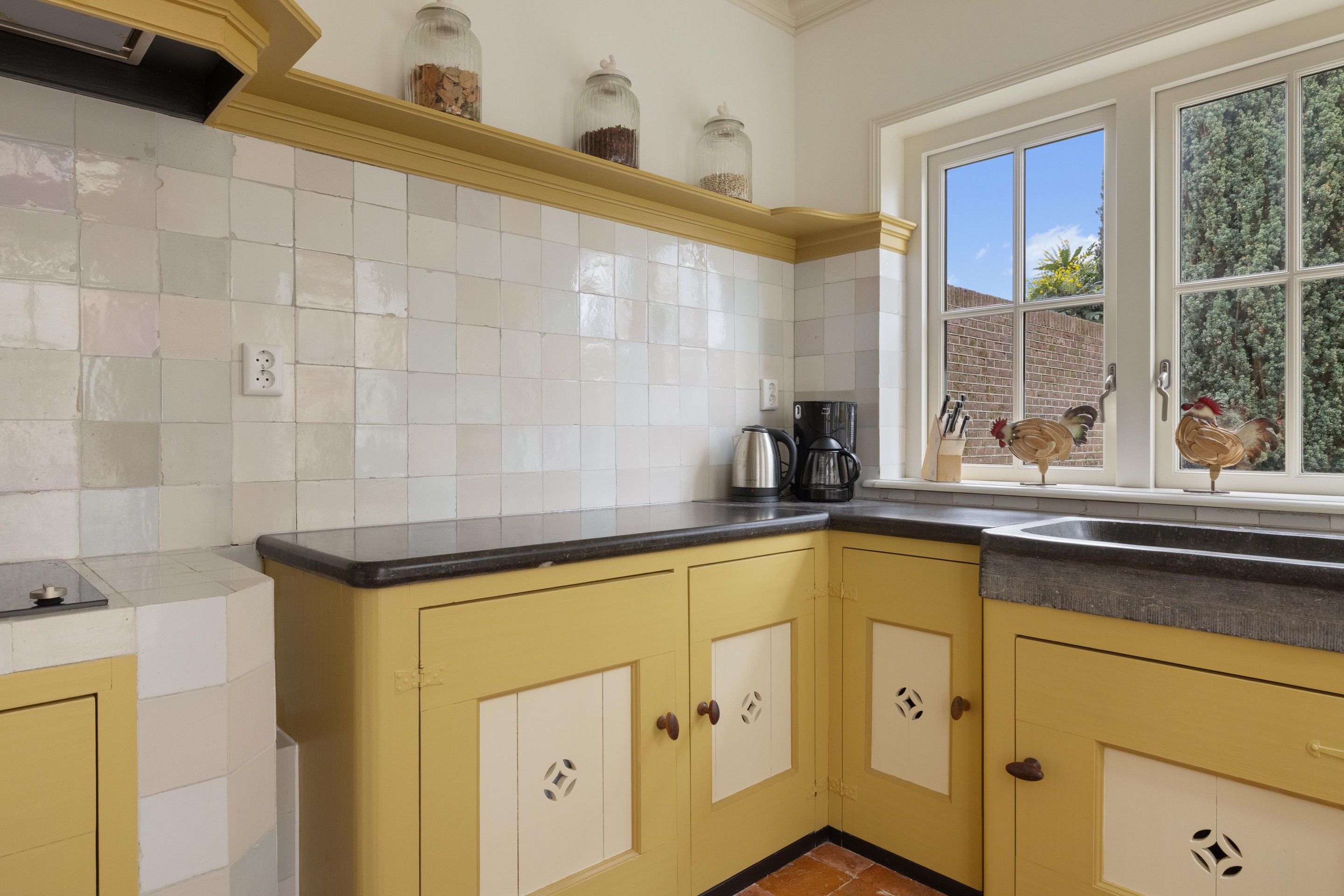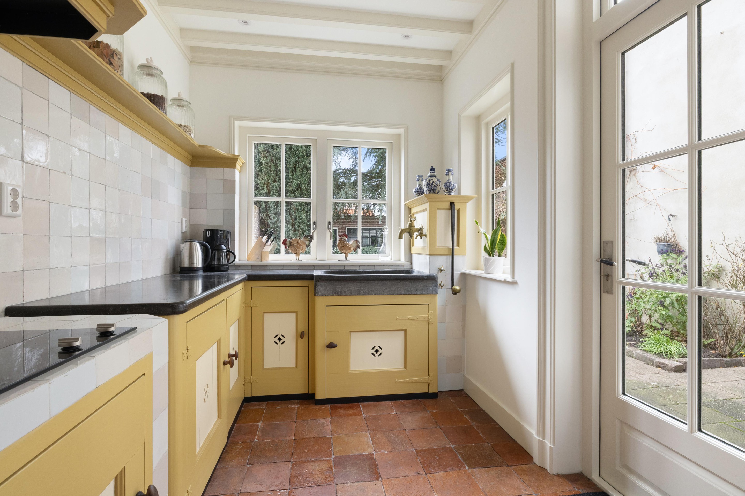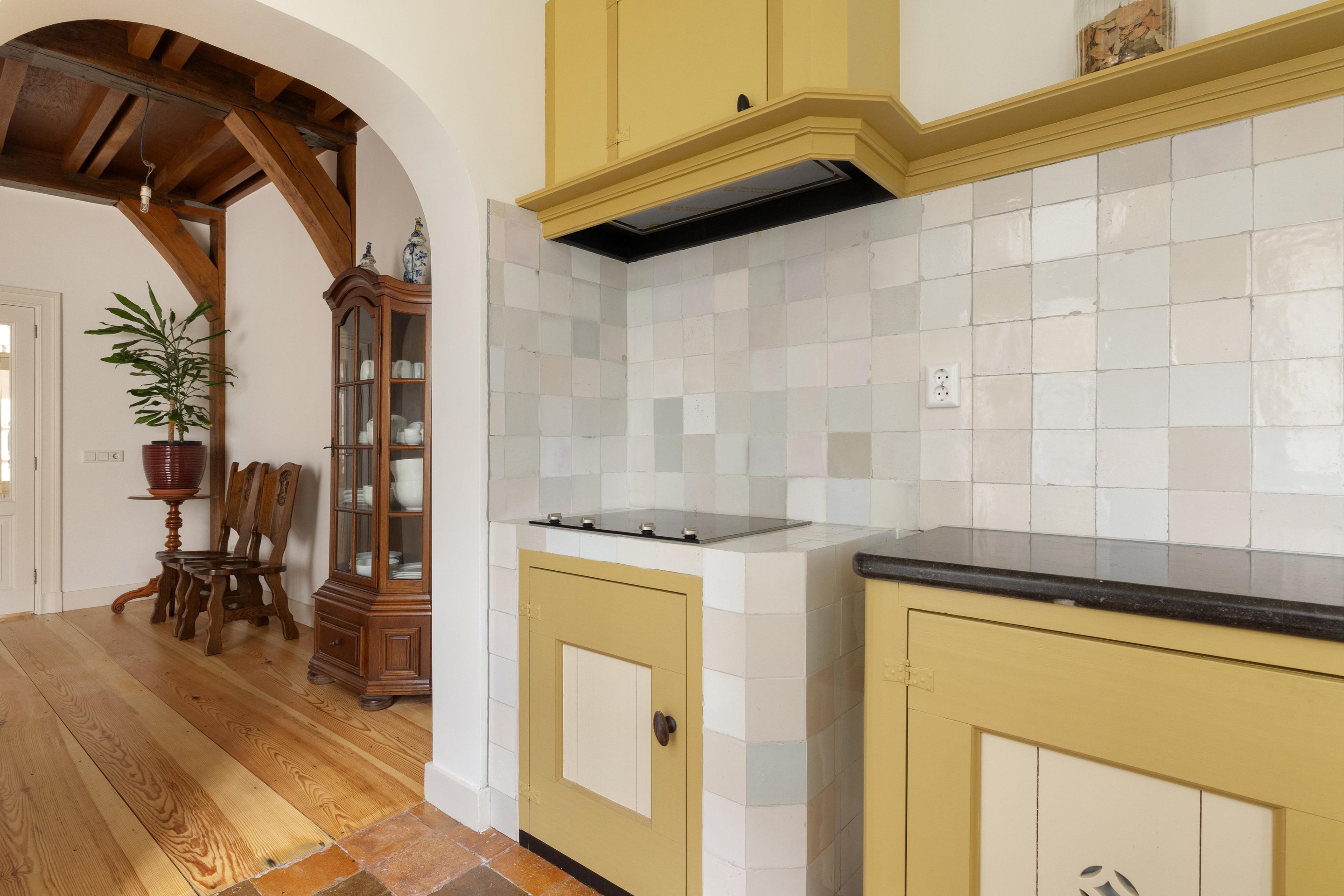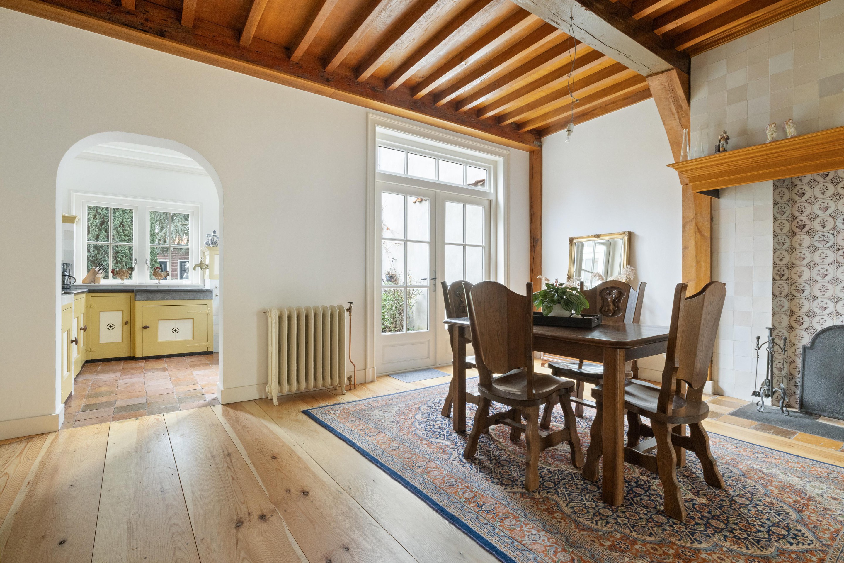 De prachtige, handgemaakte keuken voorzien van authentieke details is gesitueerd in de aanbouw aan de linkerzijde van de woning (niet over de volledige breedte), waardoor de indeling speels en praktisch is. De keuken is voorzien van vloerverwarming, beschikt over een deur naar de tuin en biedt prettig, direct contact met buiten.