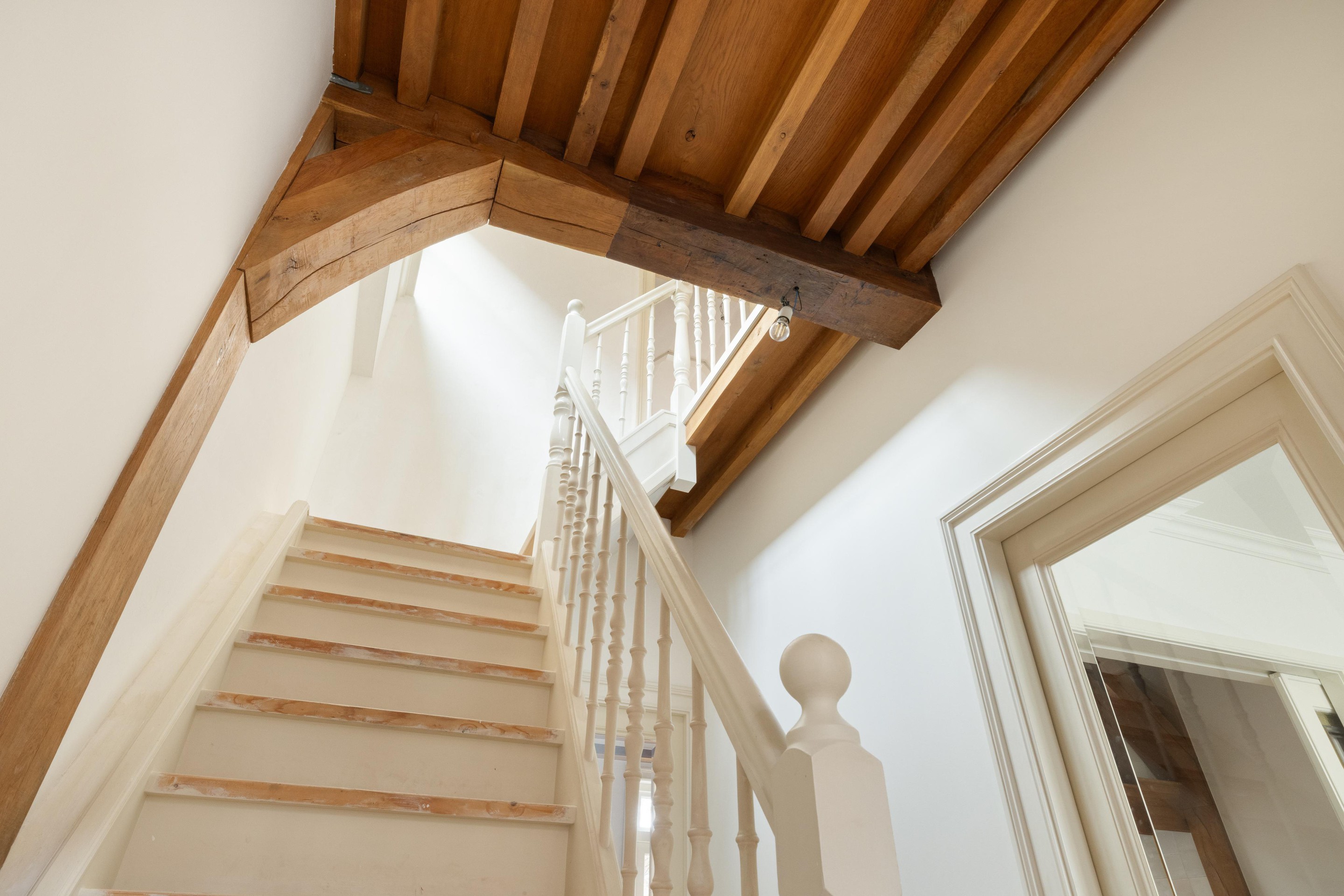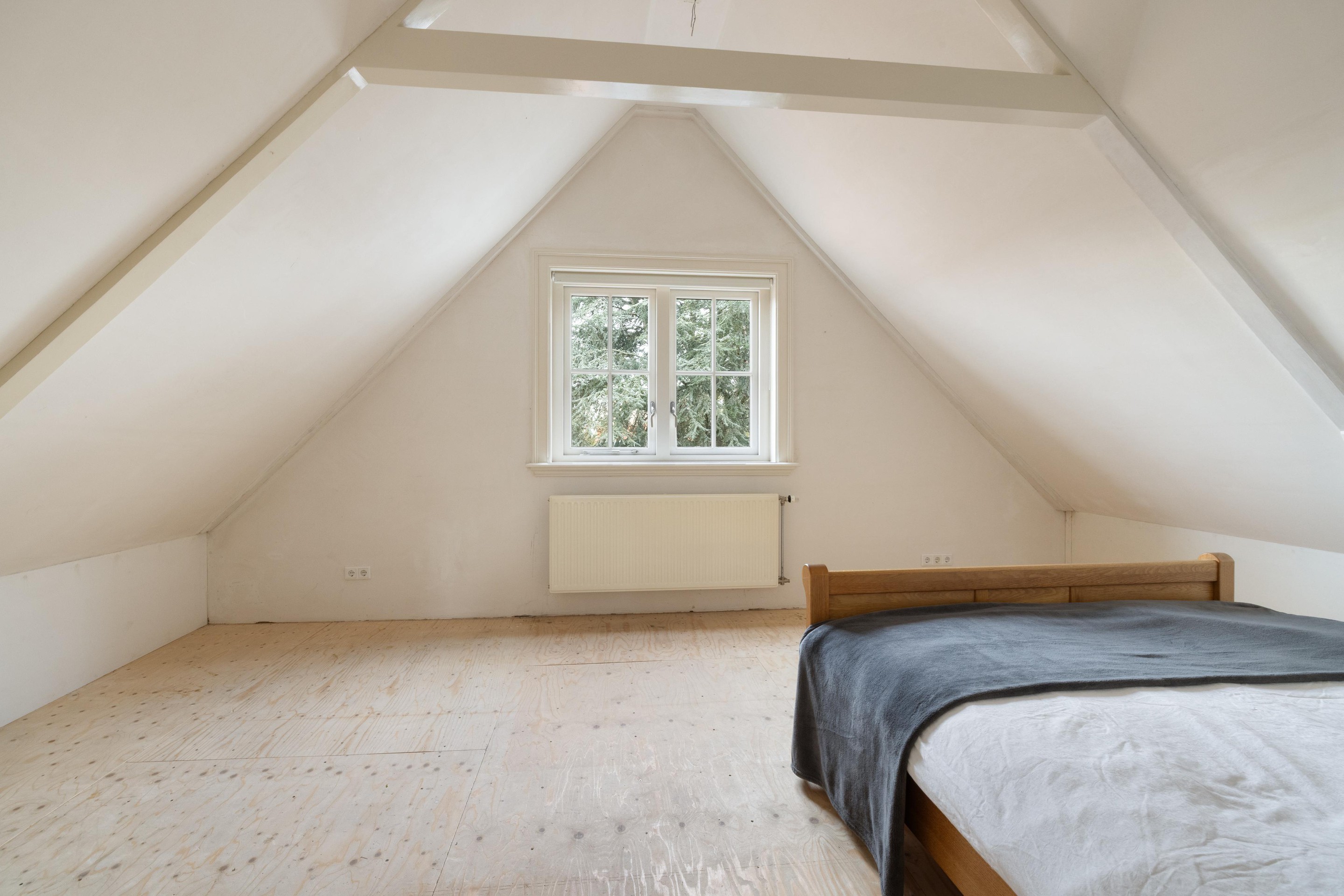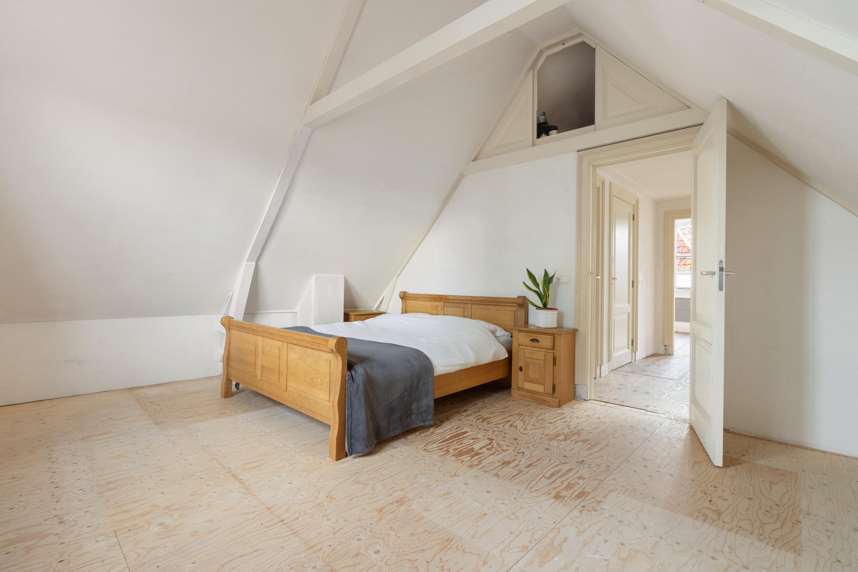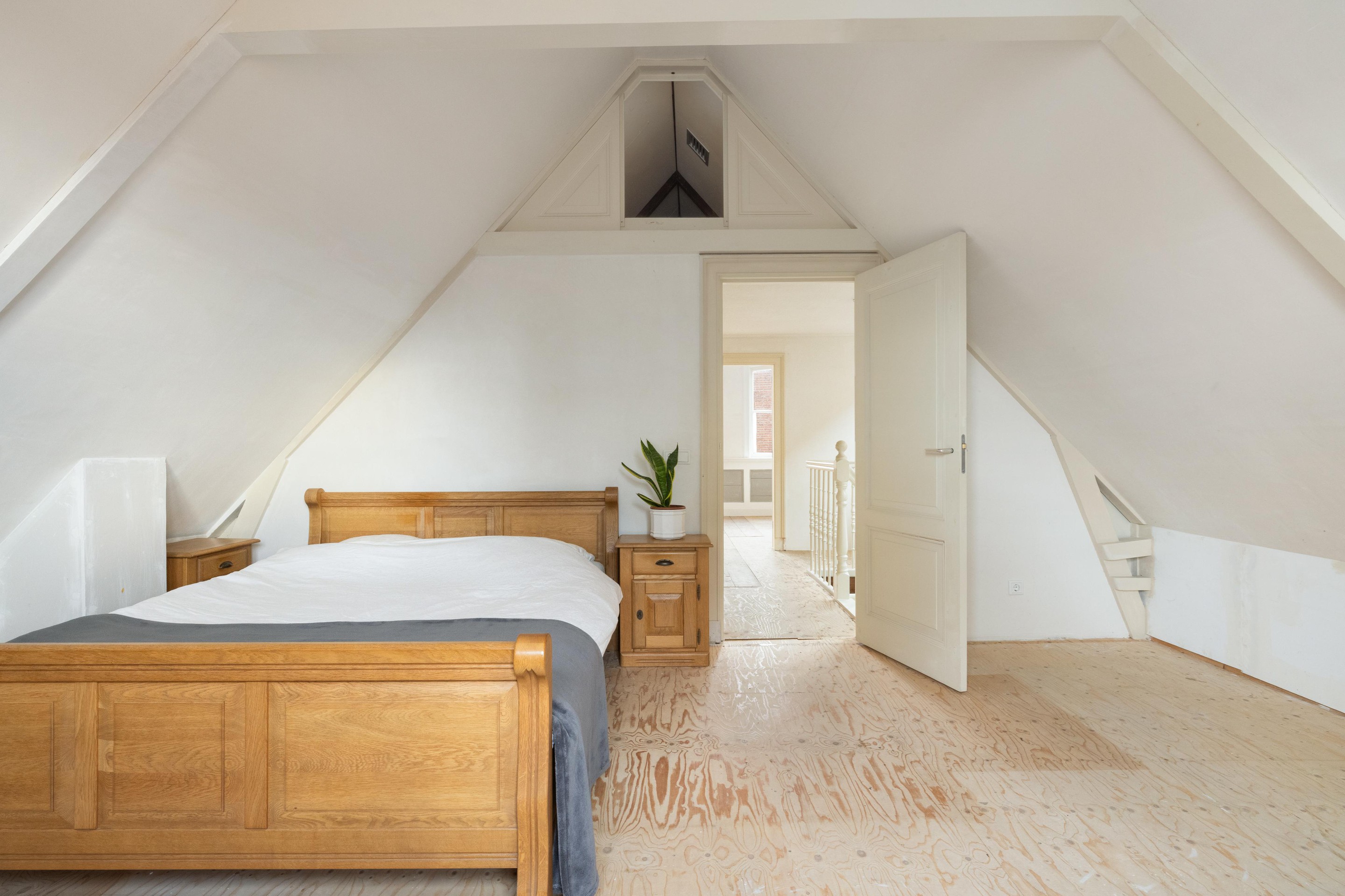 Op de eerste verdieping treft u een ruime overloop. Aan de achterzijde bevindt zich een zeer royale slaapkamer van ca. 22 m2, met een indrukwekkende nokhoogte van 3,43 meter. Vanuit deze slaapkamer is de vliering bereikbaar, gelegen boven de bergkast en badkamer, ideaal als extra bergruimte.