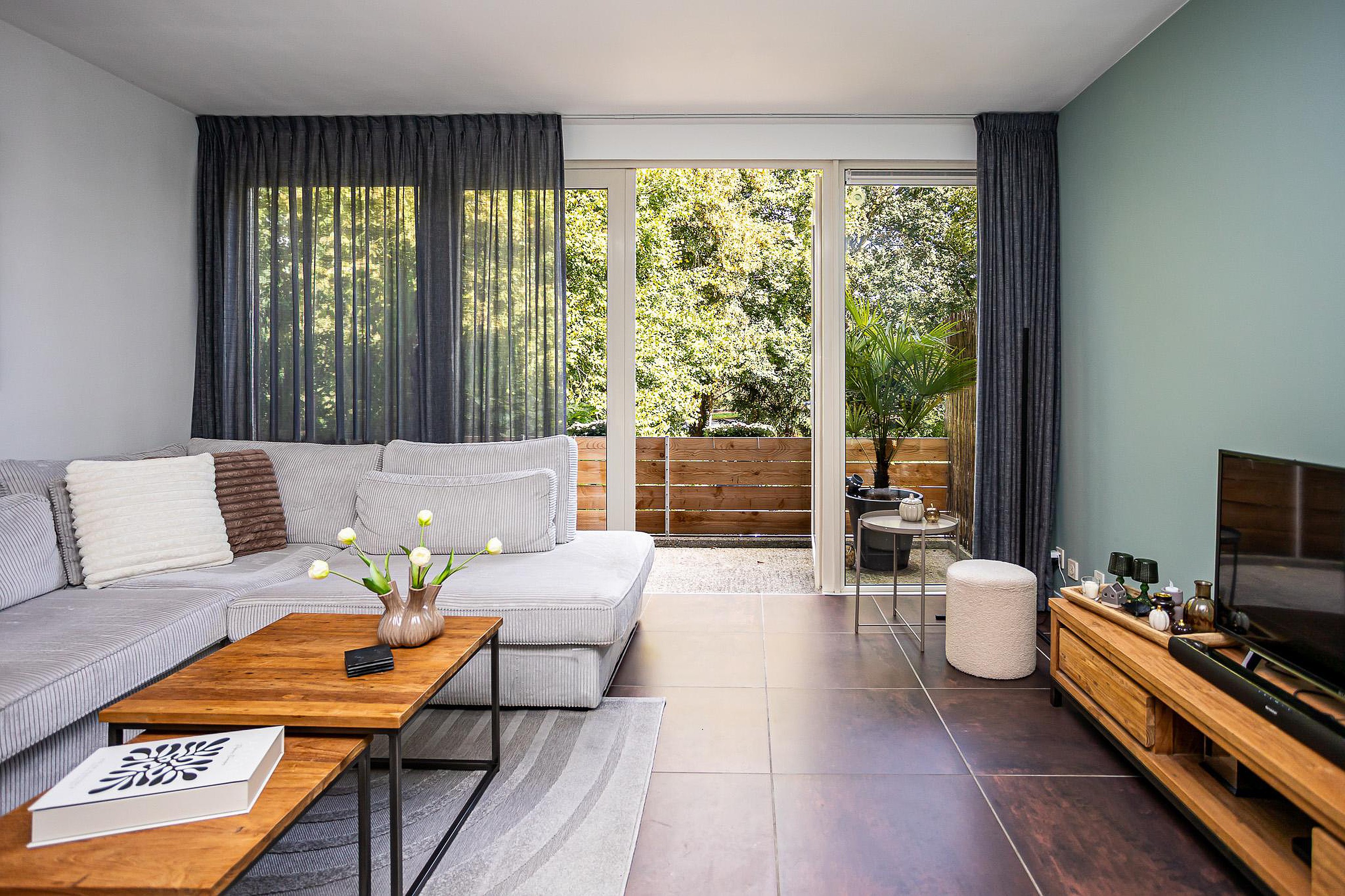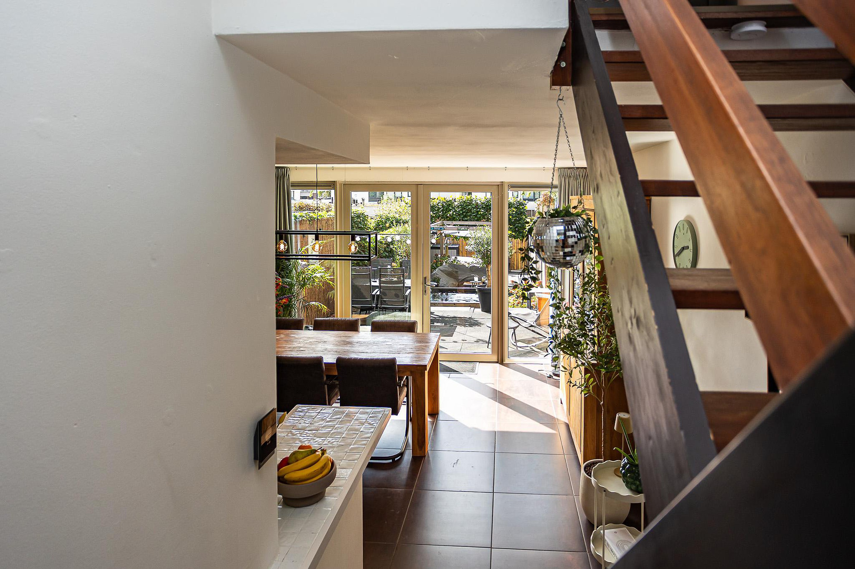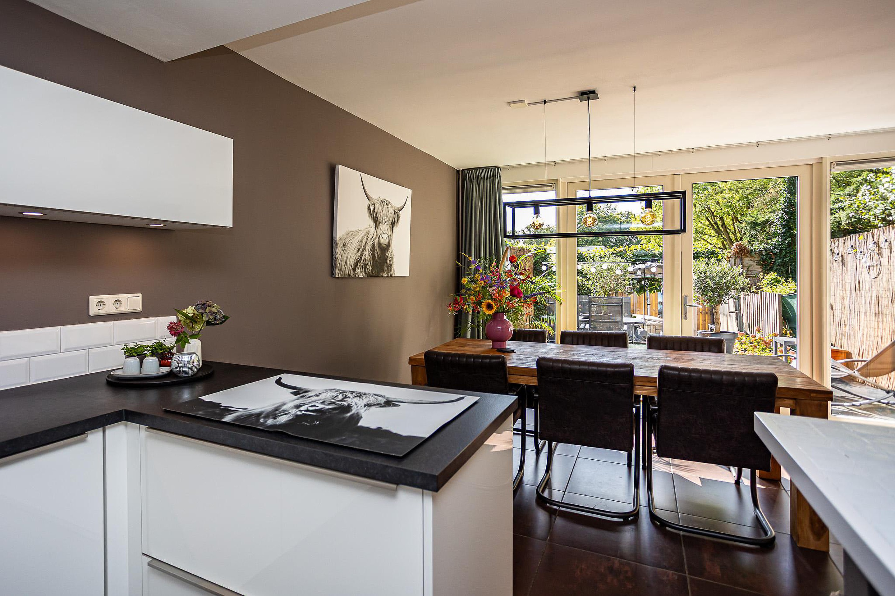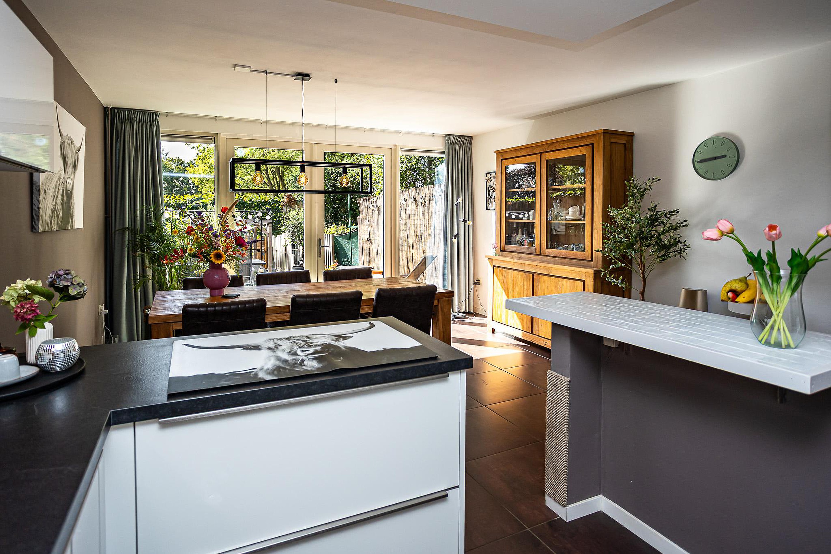 Ruime woonkeuken met luxe modern keukenblok (2019) in U-opstelling met diverse inbouwapparatuur, toegang tot terras en tuin middels openslaande deuren, woonkamer met spekkachel en toegang tot het balkon middels openslaande deuren.