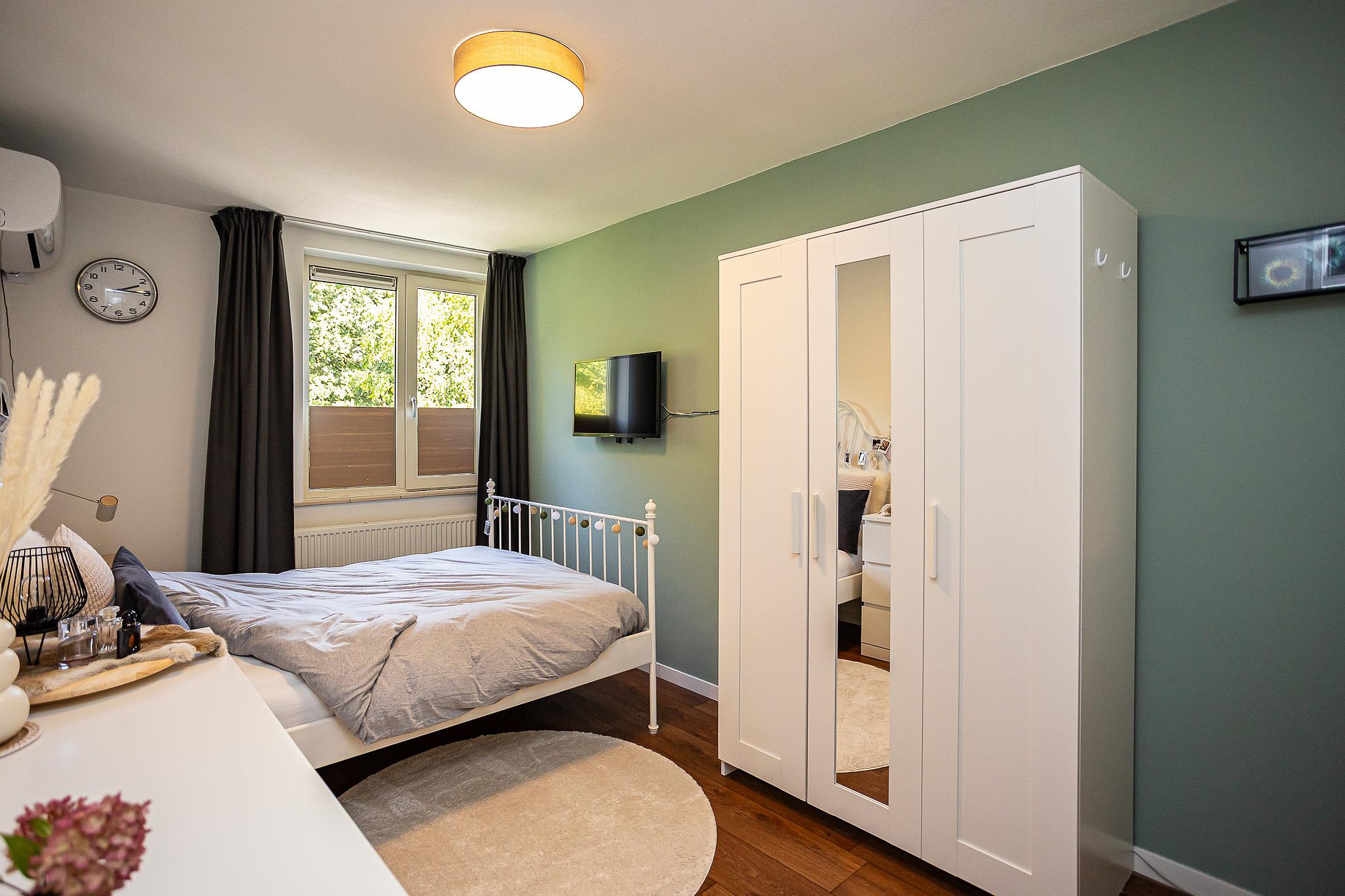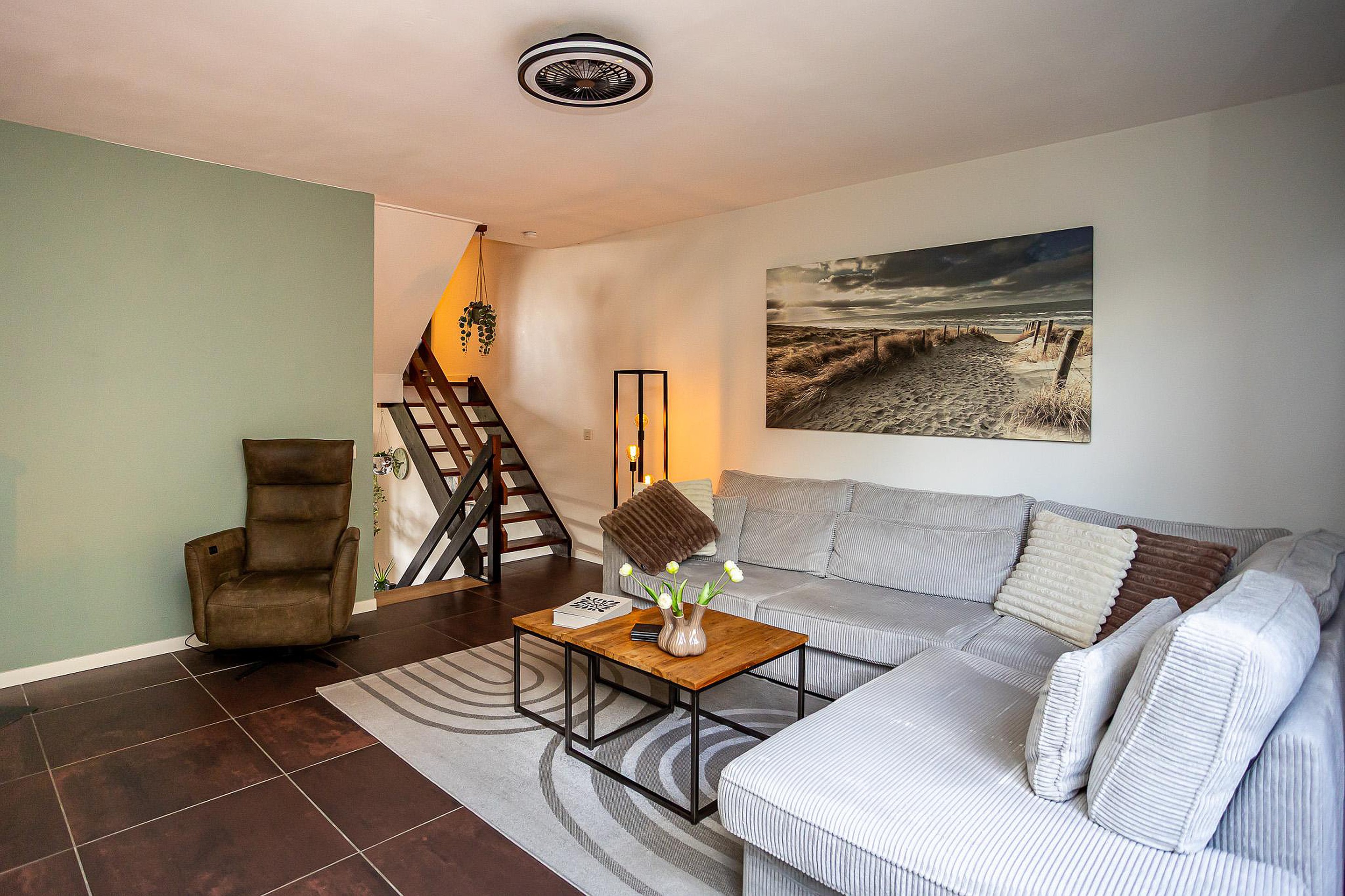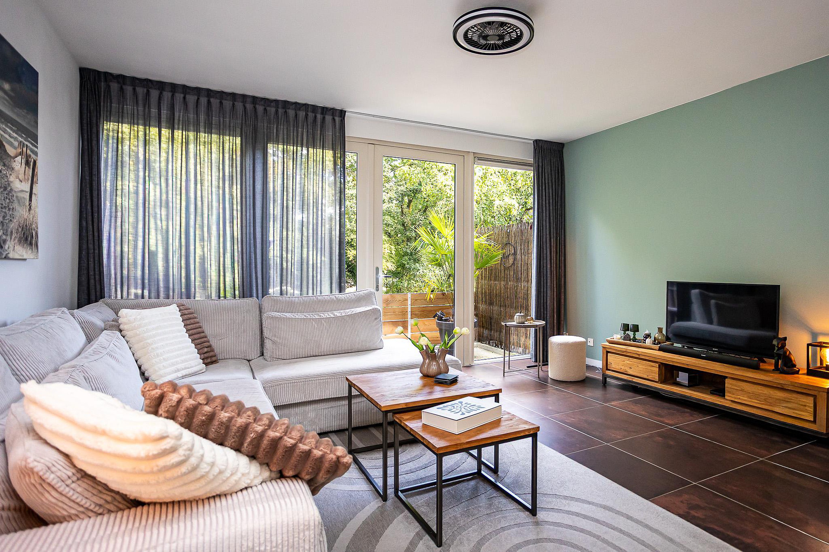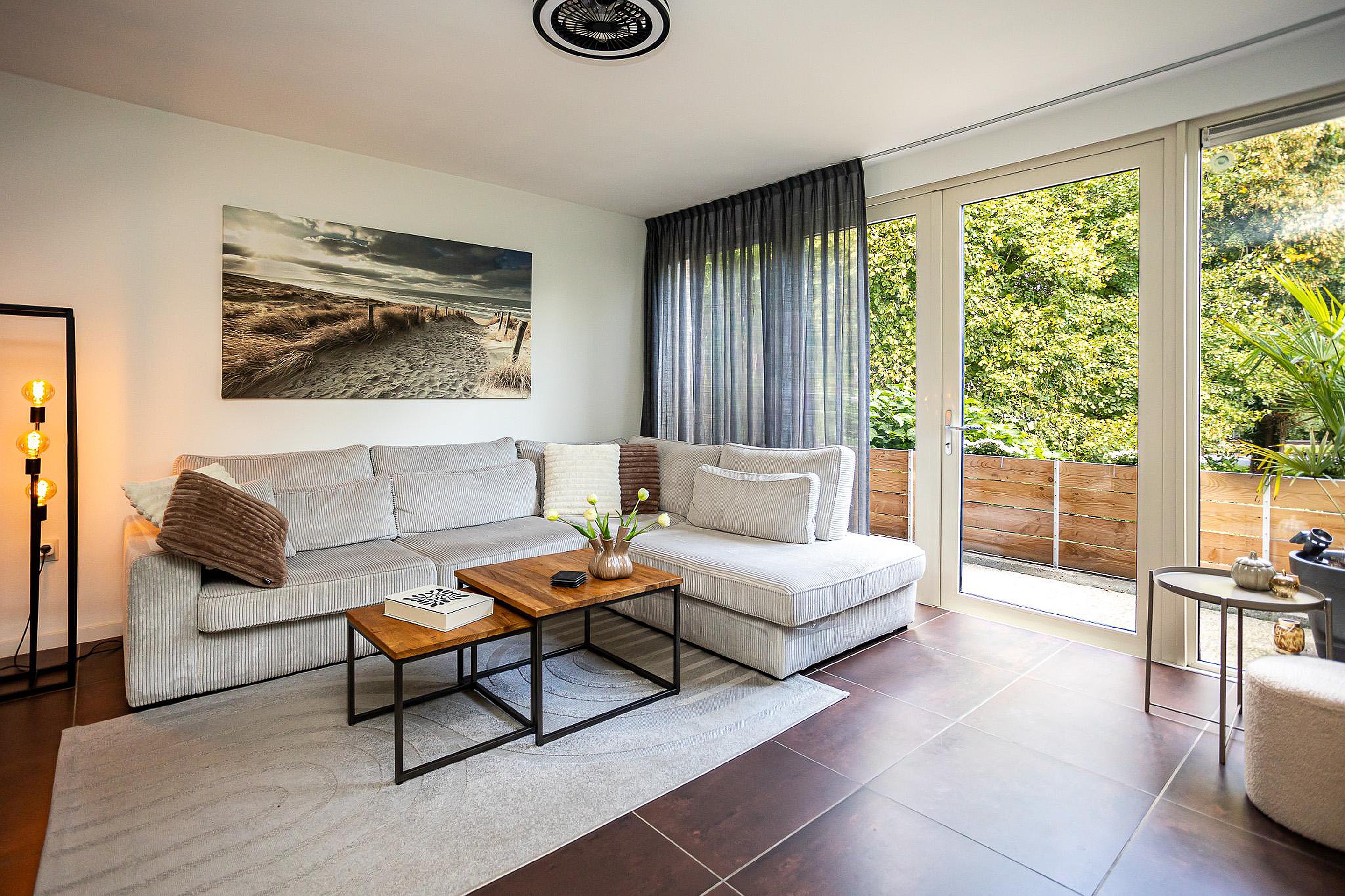 Ruime woonkeuken met luxe modern keukenblok (2019) in U-opstelling met diverse inbouwapparatuur, toegang tot terras en tuin middels openslaande deuren, woonkamer met spekkachel en toegang tot het balkon middels openslaande deuren.