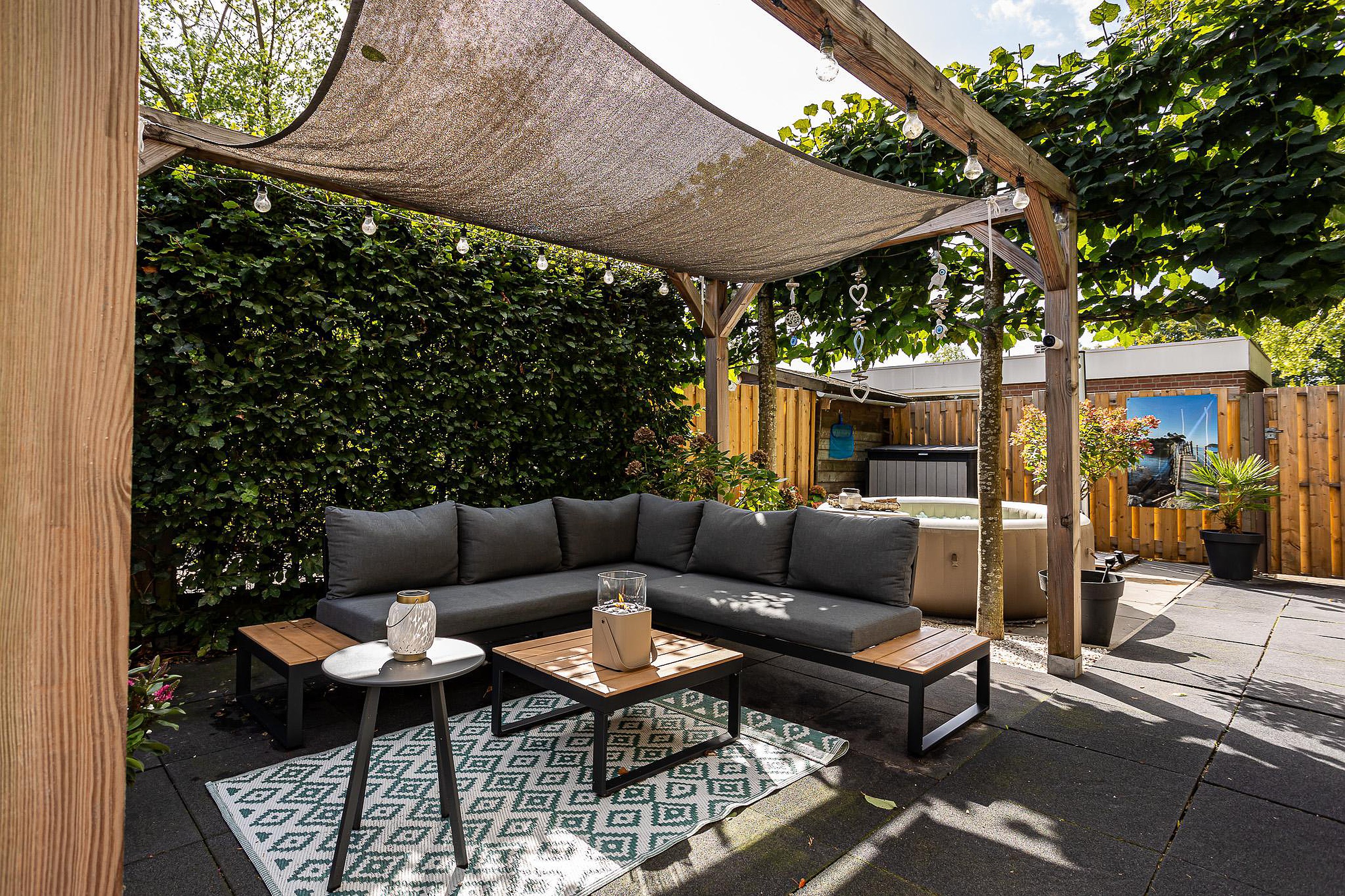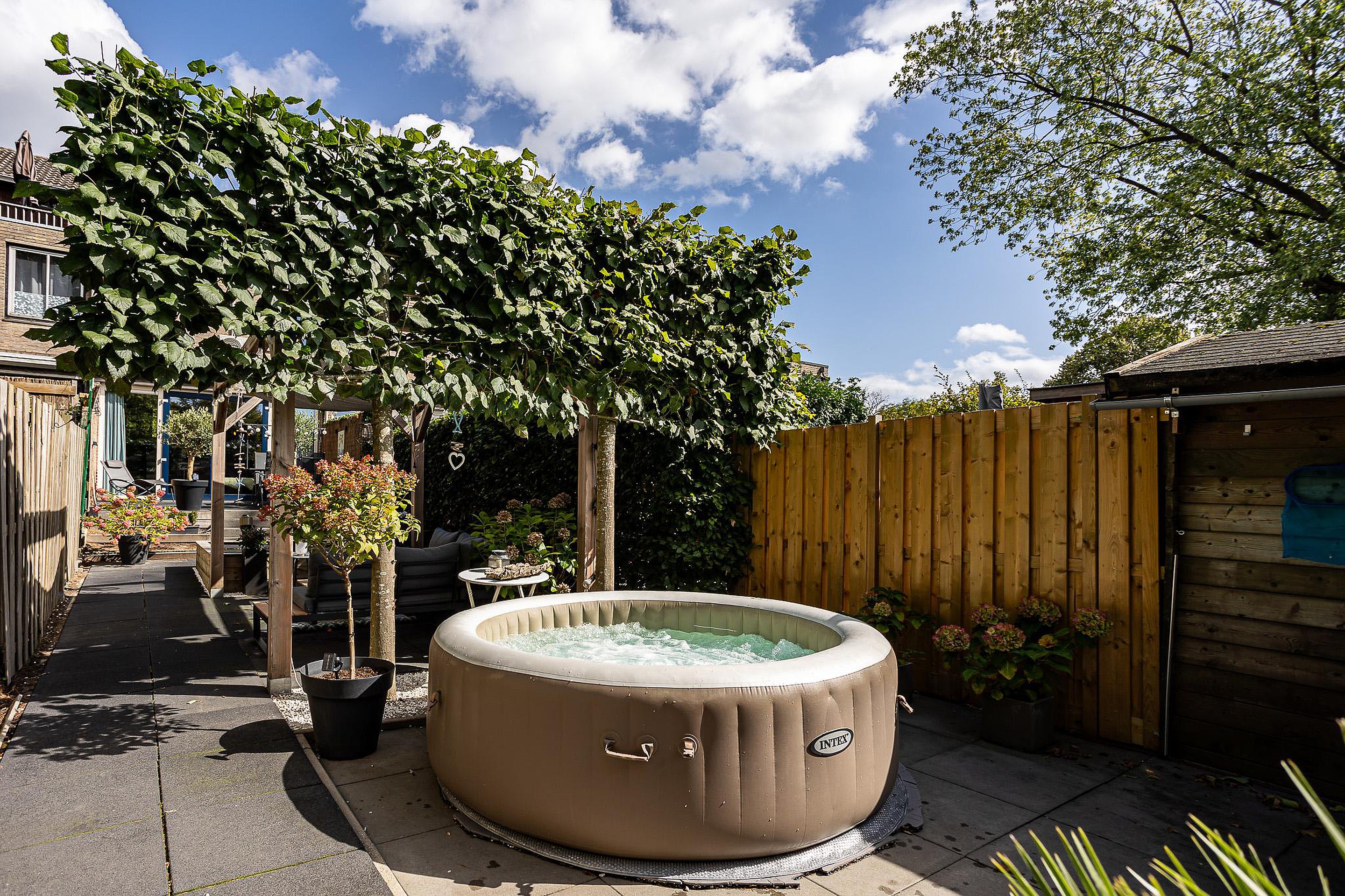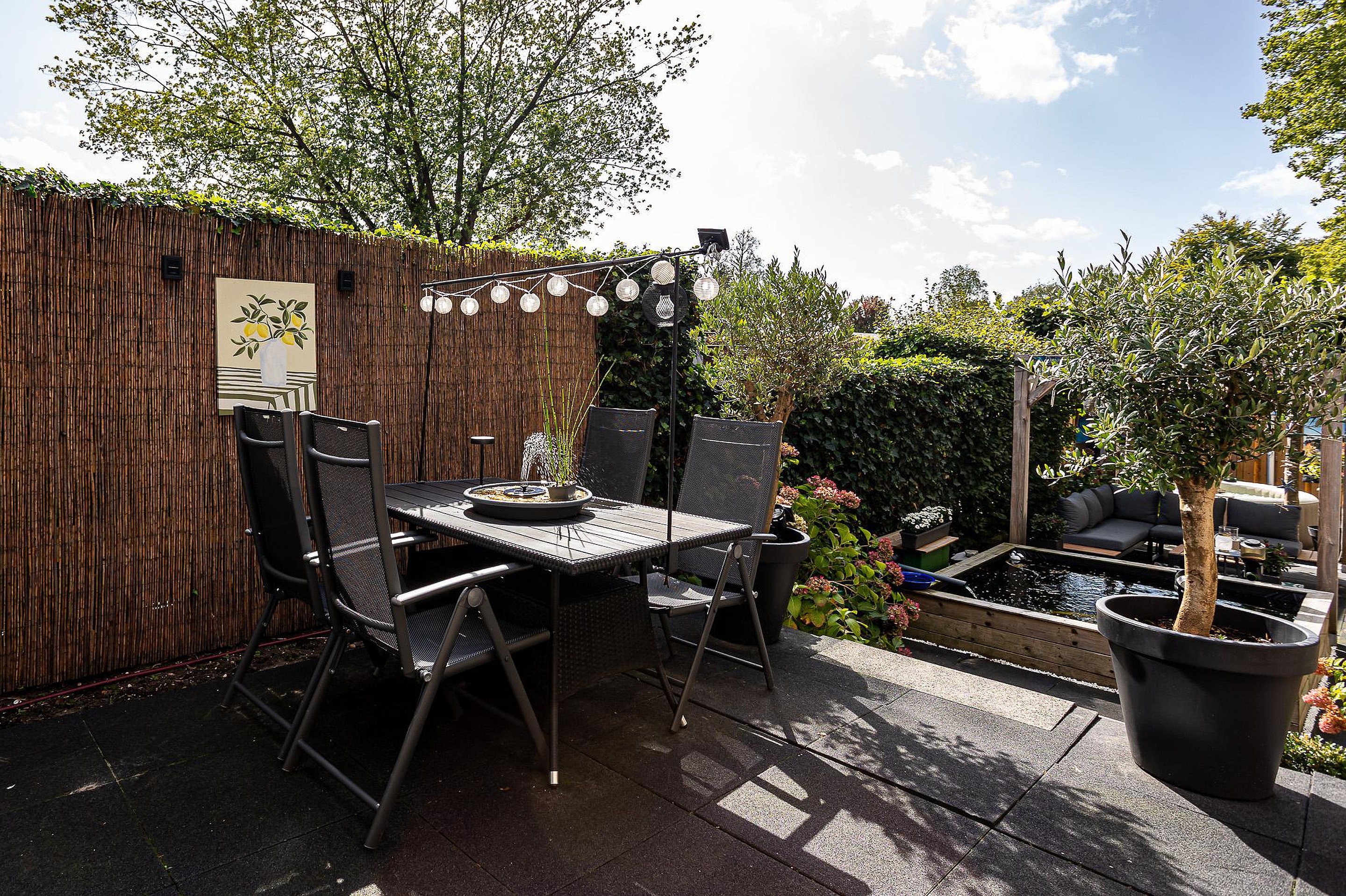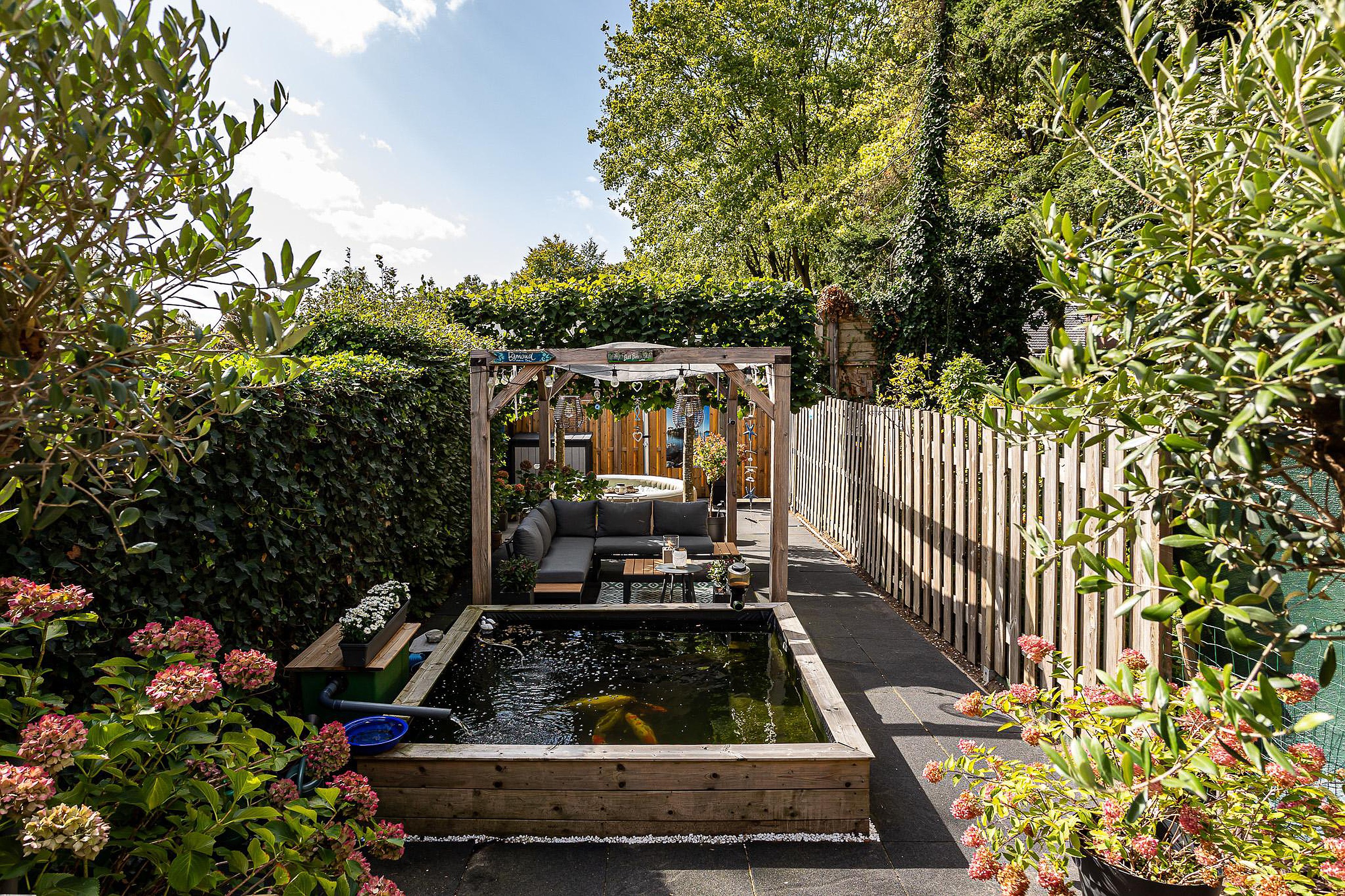 Ruime zonnige achtertuin (gelegen zuidwesten, circa 18 meter diep) met niveauverschil, twee terrassen, vijverpartij en achterom.