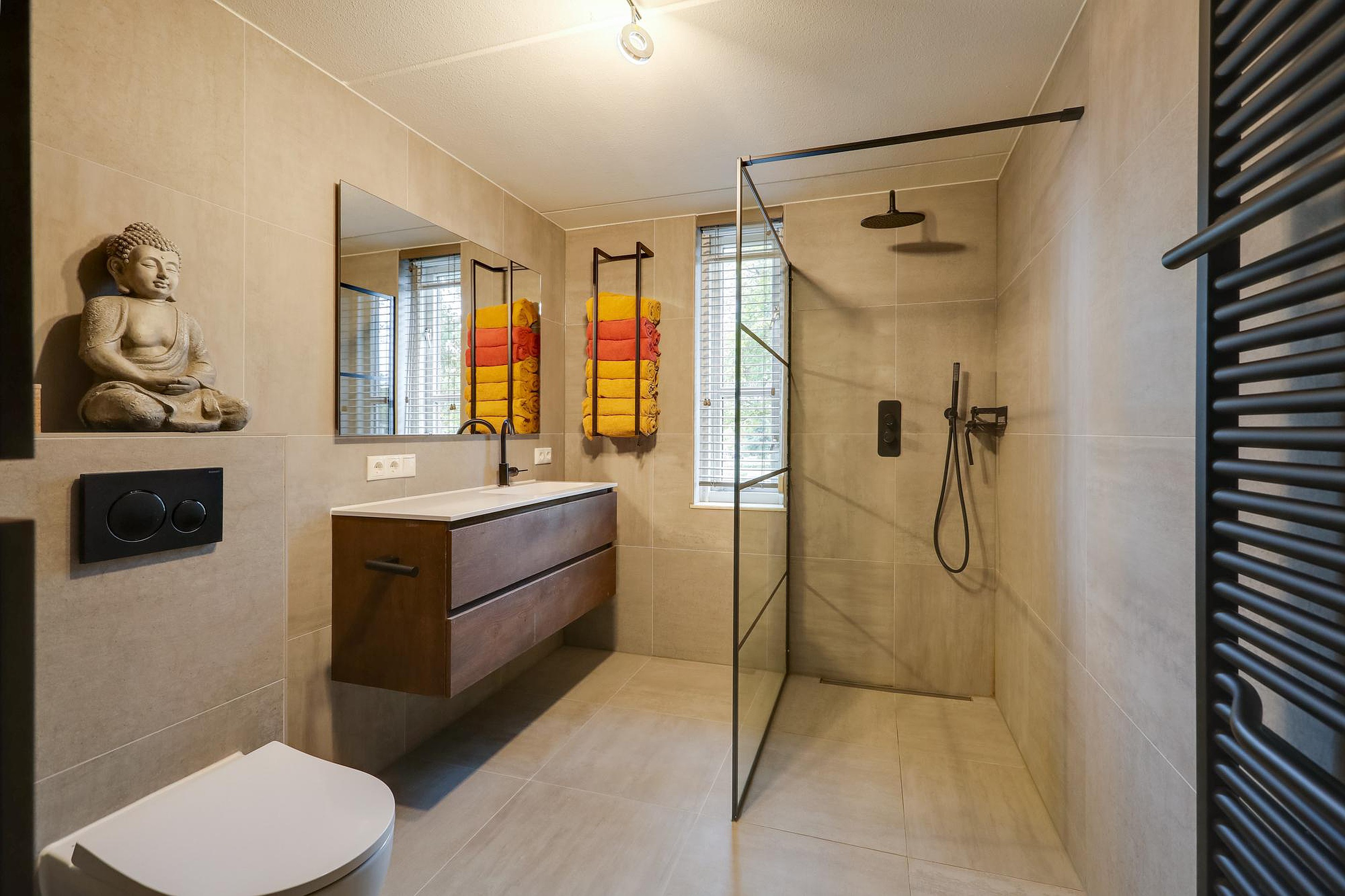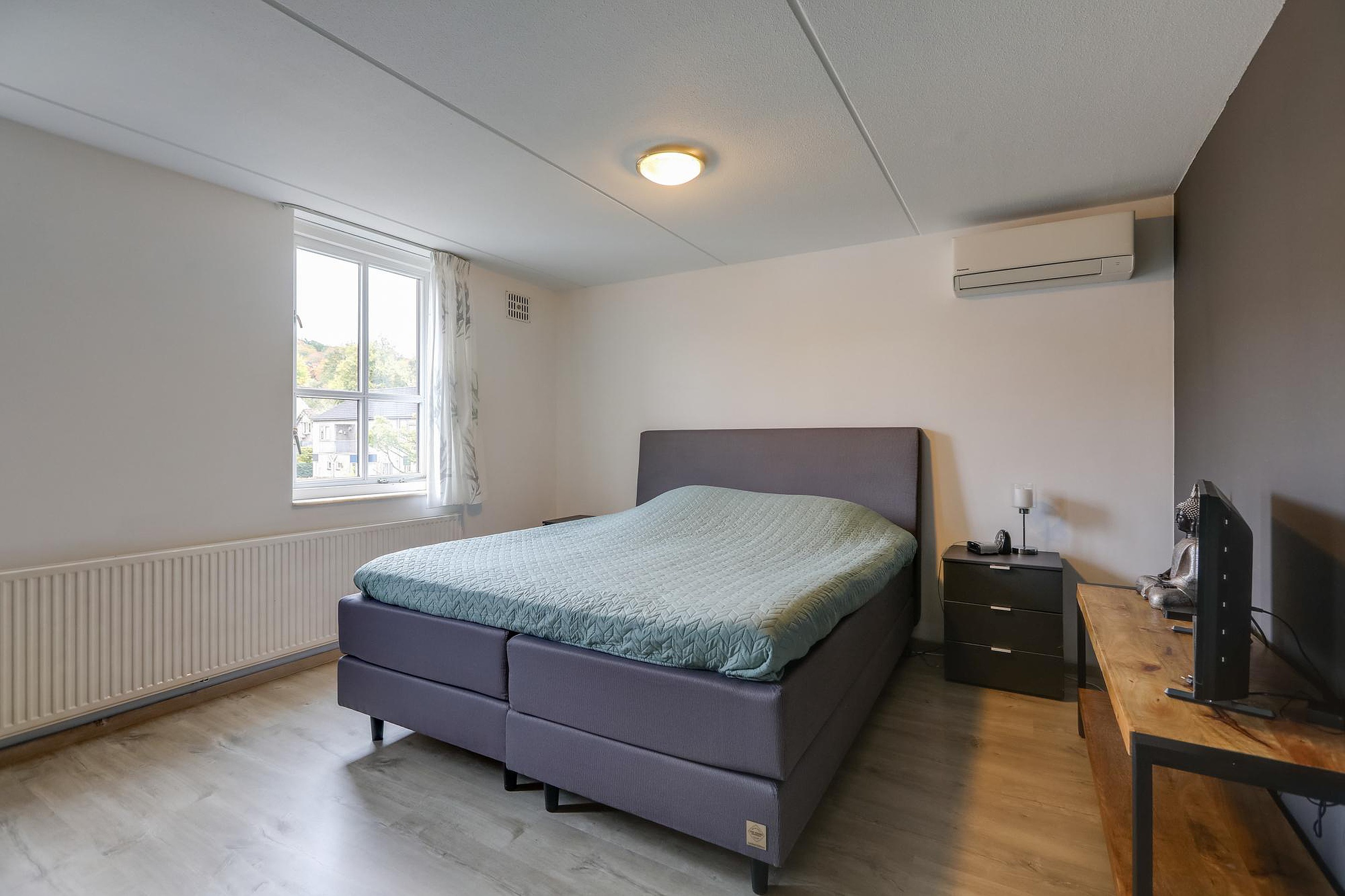 Op de eerste verdieping bevinden zich 2 slaapkamers (voormalig 3 slaapkamers) met laminaatvloer, radiatoren en houten kozijnen, rolluiken met dubbel glas. Slaapkamer aan de voorzijde is zelfs voorzien van een airconditioning en een grote vaste kast met schuifdeuren. De badkamer is in 2021 gemoderniseerd en beschikt over een inloopdouche, een wastafelmeubel, een designradiator, elektrische vloerverwarming en een tweede toilet.