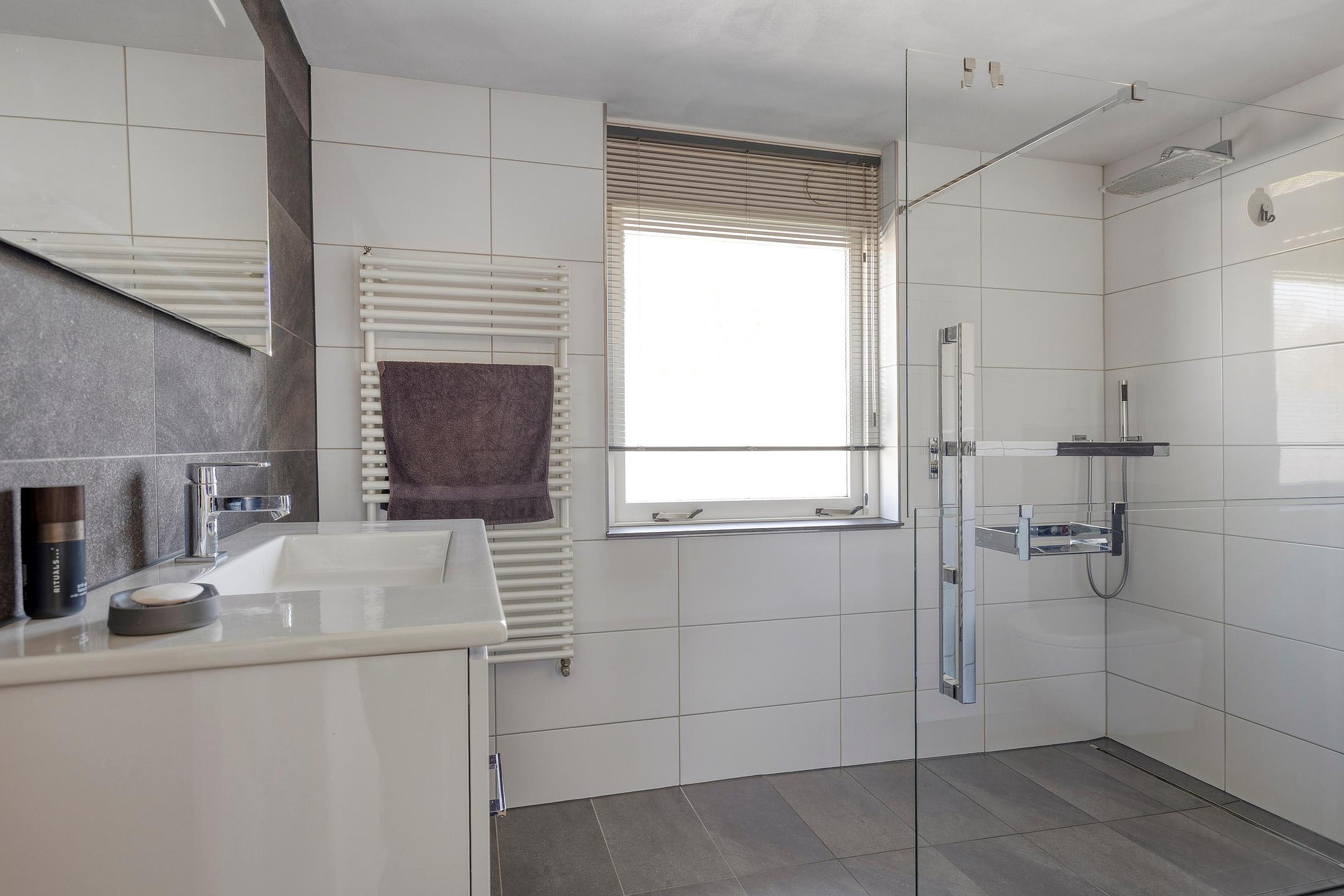 Eerste verdieping overloop, 3 slaapkamers en een badkamer ( modern betegeld) met inloopdouche wastafelmeubel en 2e toilet, vaste trap naar de 2e verdieping.