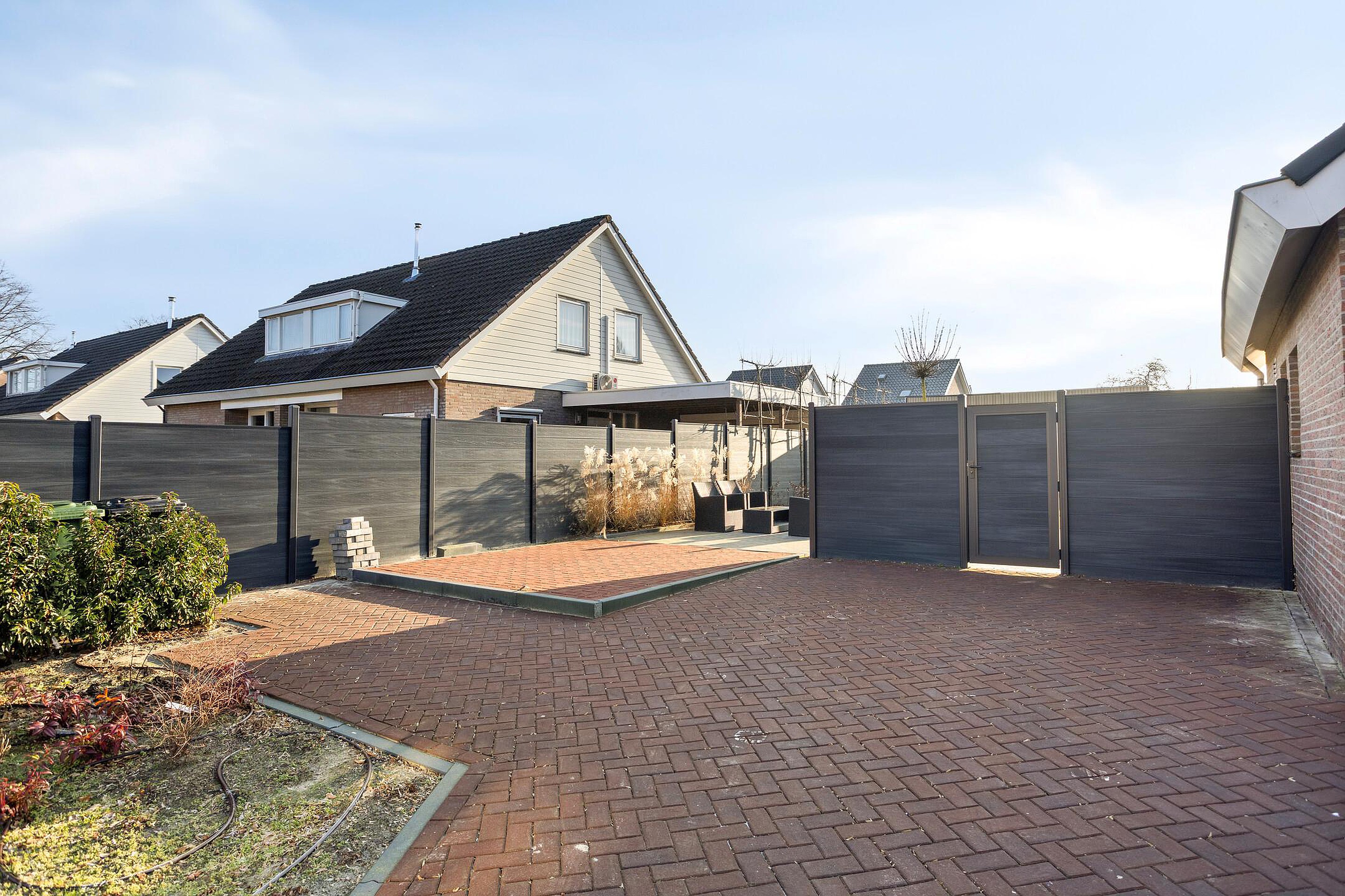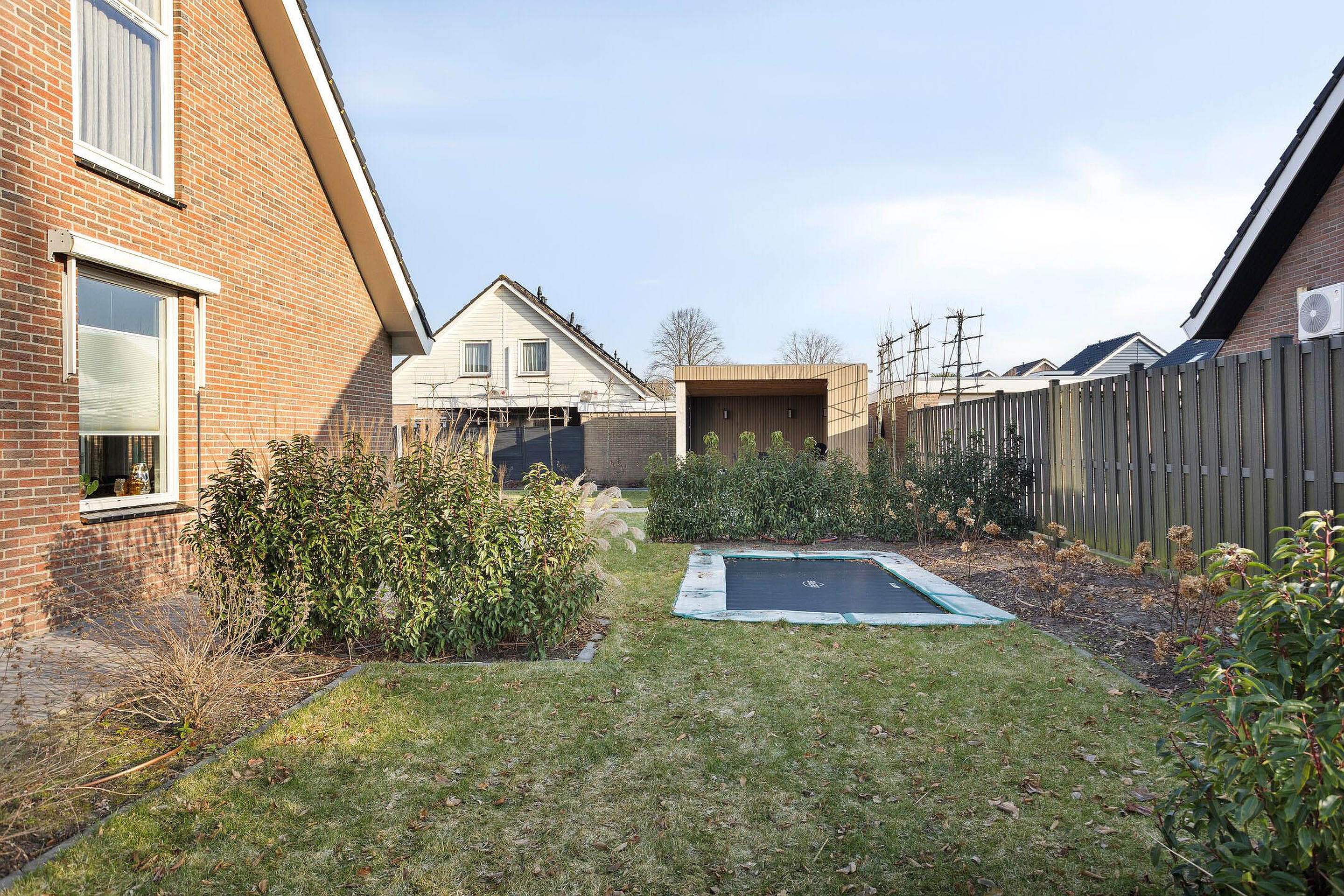 Onlangs mooi aangelegde tuin rondom met grote overkapping.