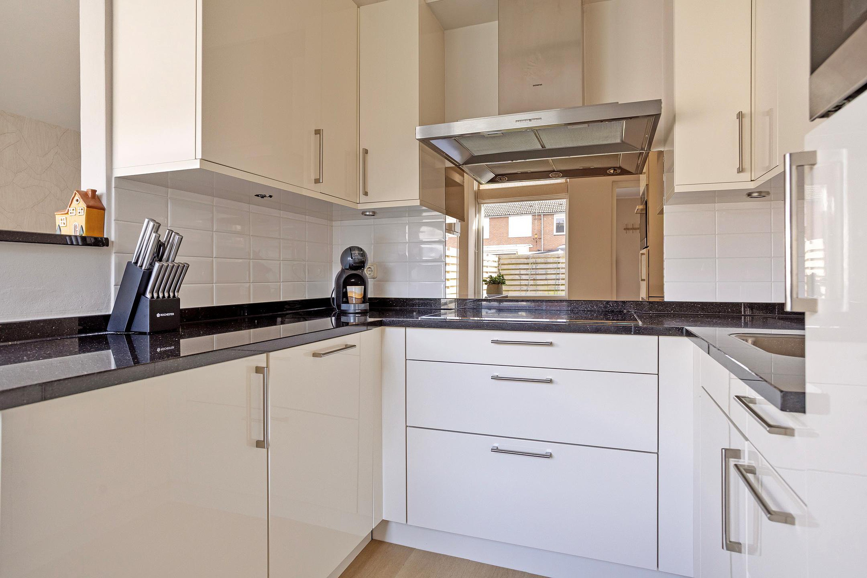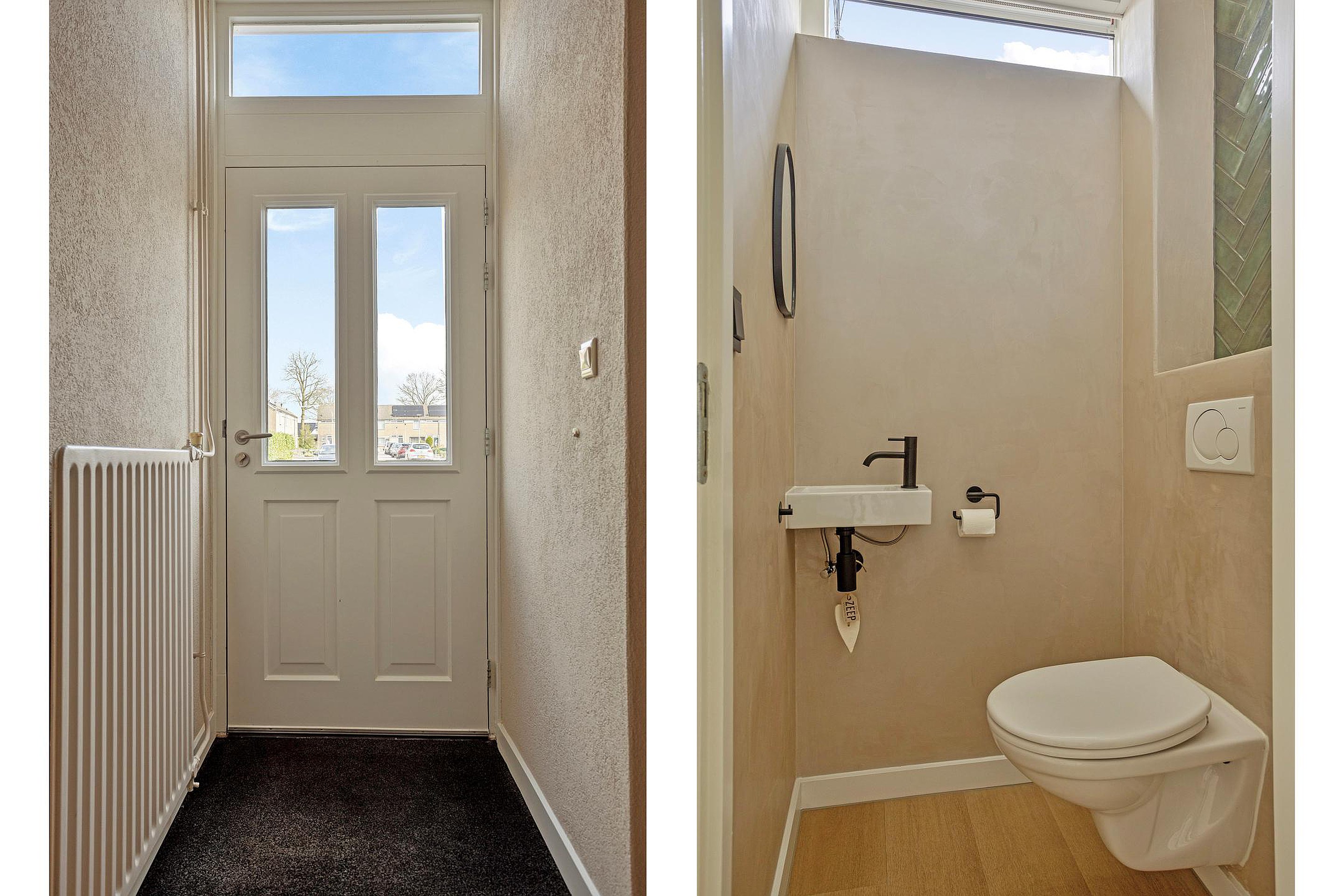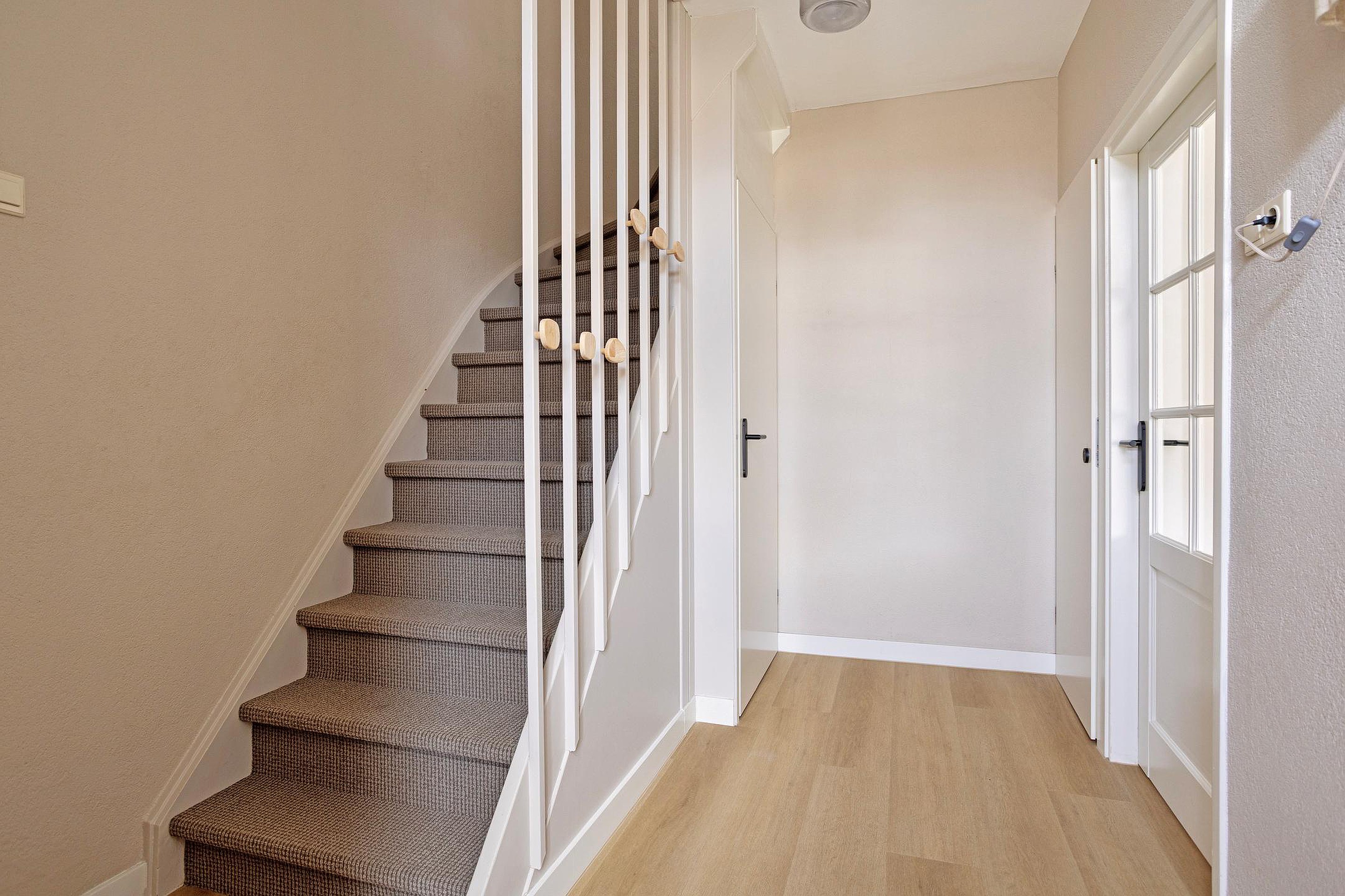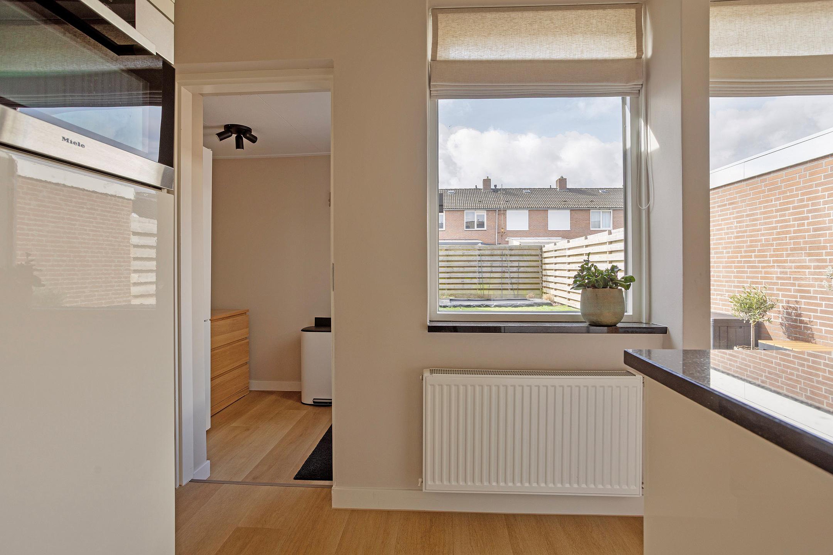 Via de entree kom je in de hal met een modern toilet en een praktische bergkast. De lichte doorzon woonkamer vormt een prettige leefruimte met veel daglicht. De halfopen keuken sluit hier mooi op aan en is compleet uitgevoerd met diverse inbouwapparatuur. Vanuit de keuken is er toegang tot de bijkeuken en de aangebouwde berging, wat zorgt voor extra praktische opbergruimte