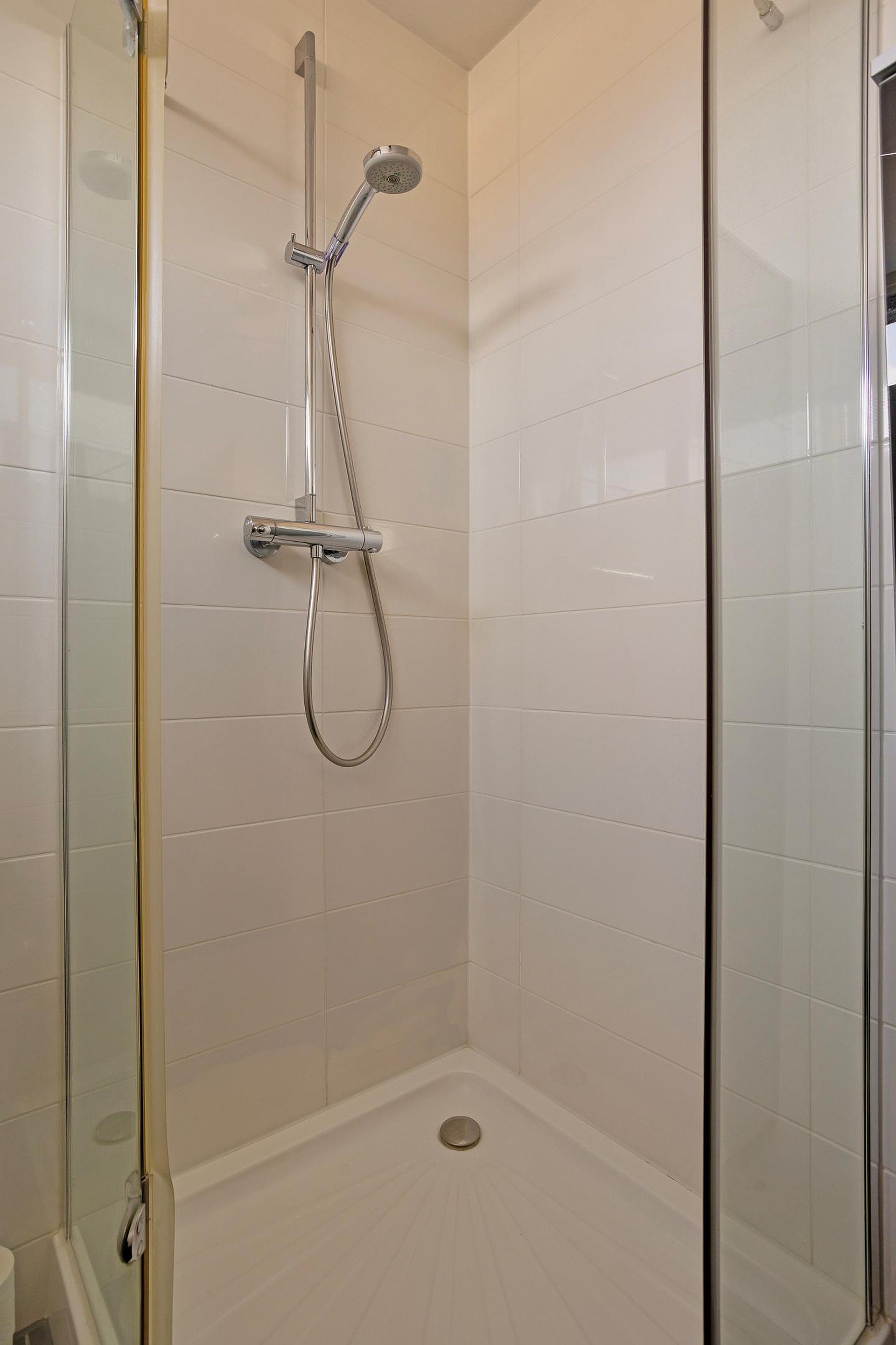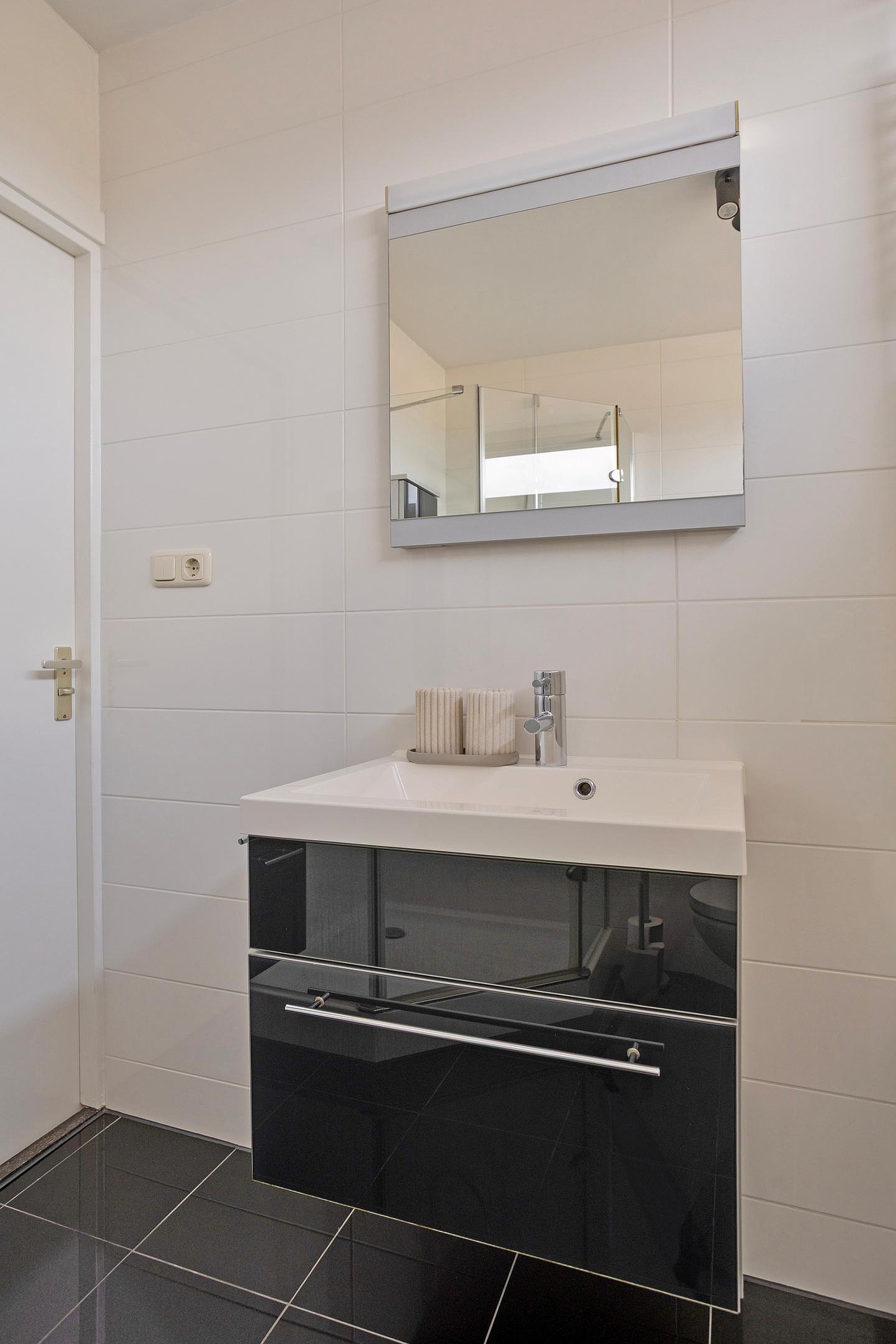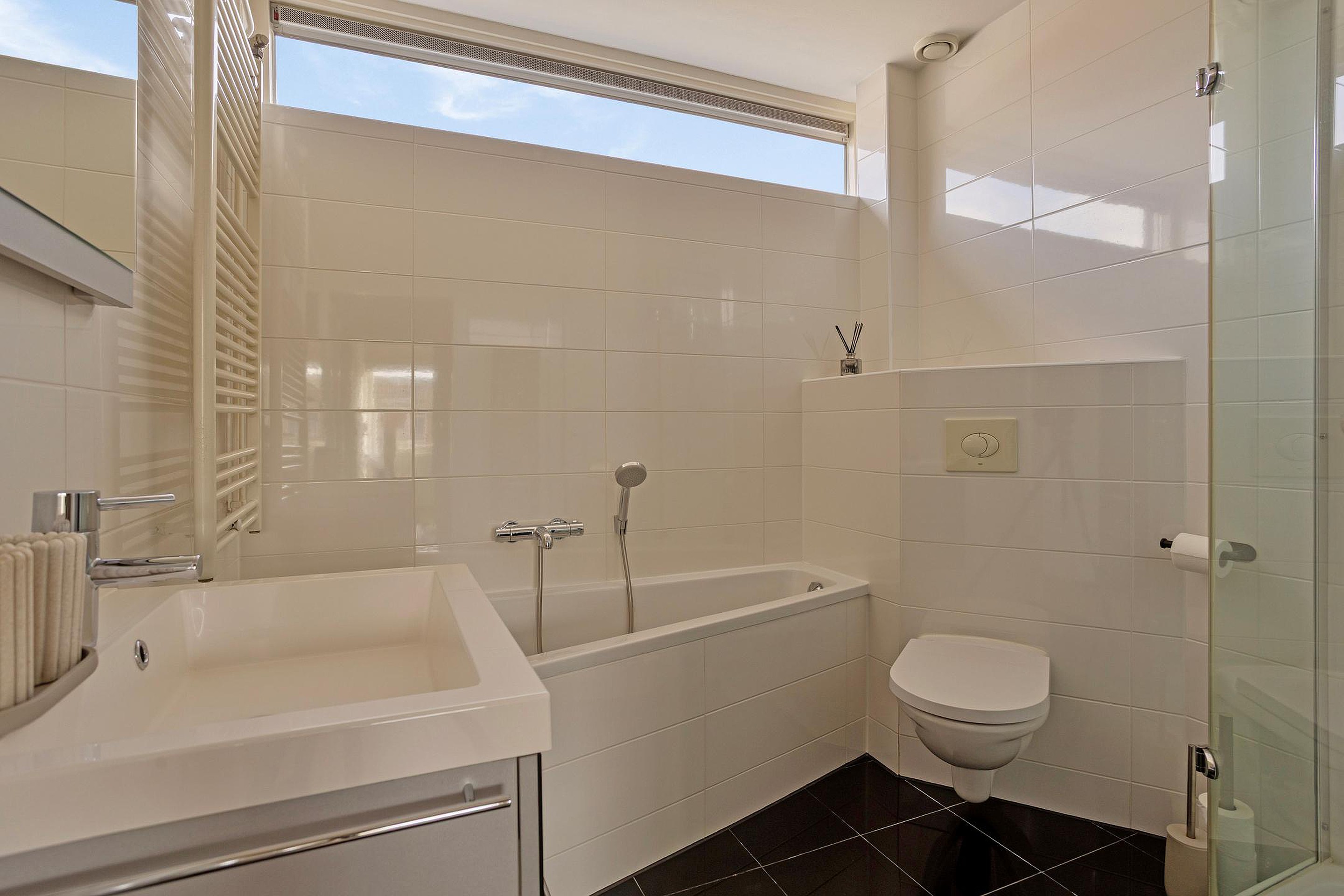 De overloop geeft toegang tot drie slaapkamers en een verzorgde badkamer. De badkamer is compleet ingericht met een douchecabine, ligbad, toilet en wastafelmeubel.