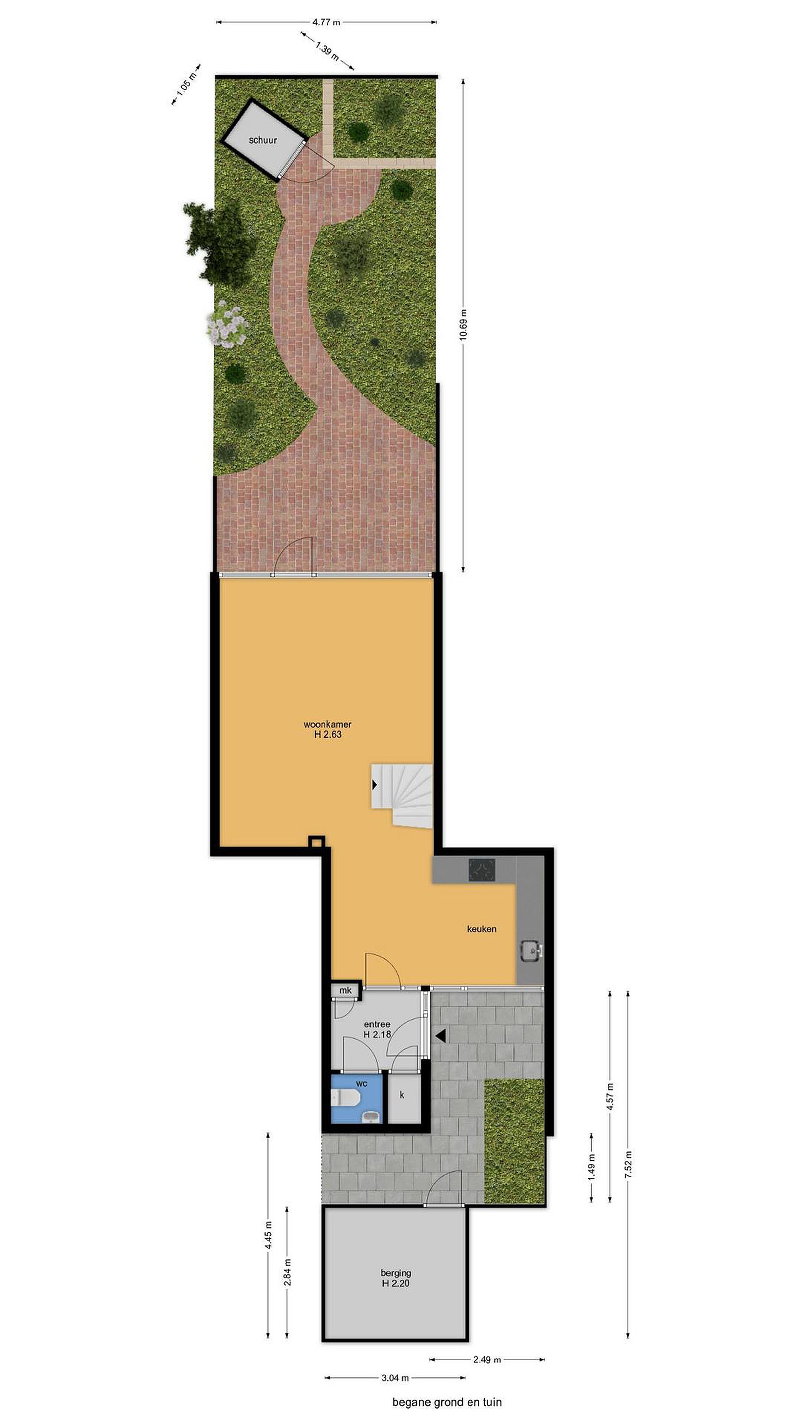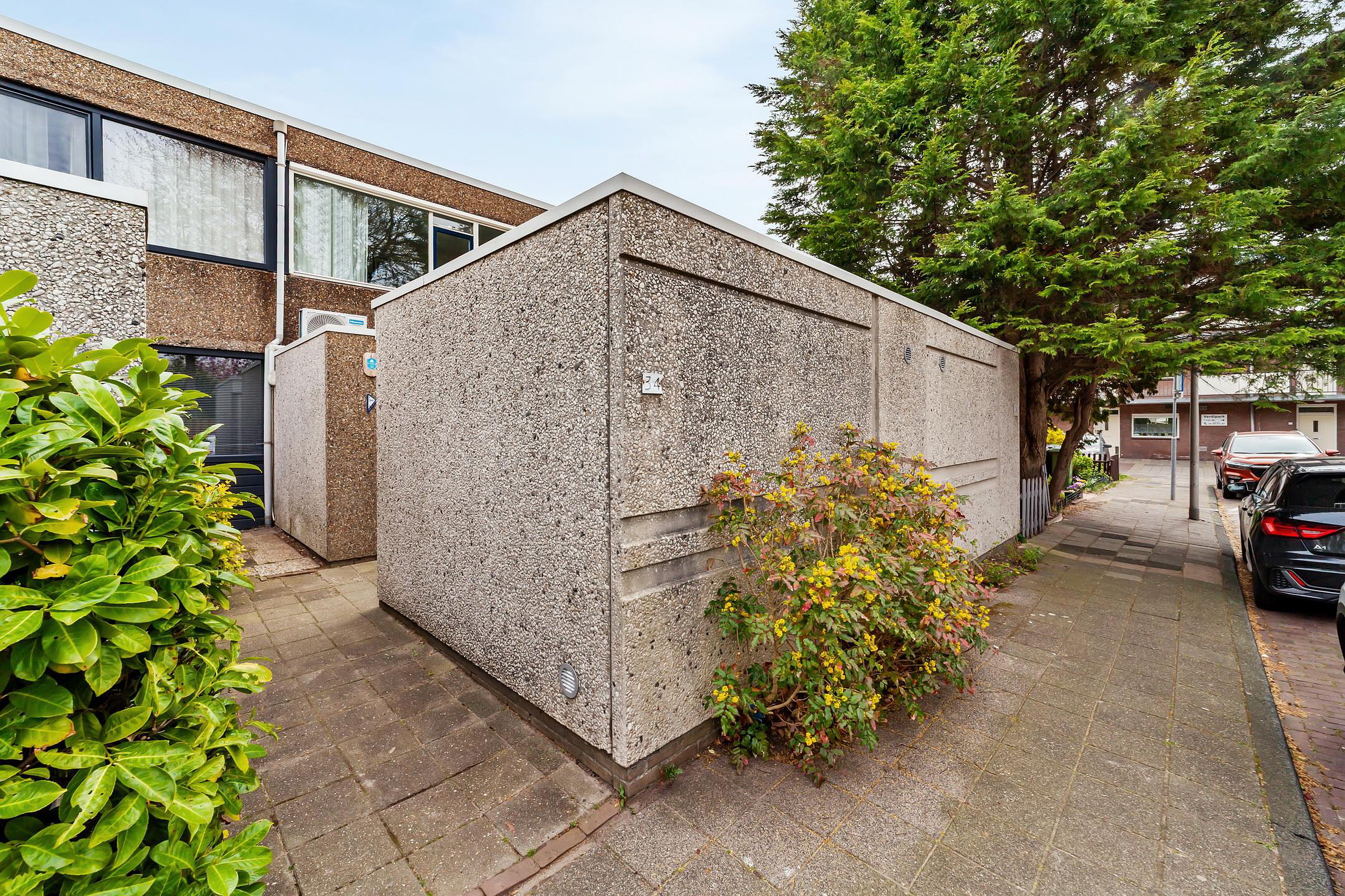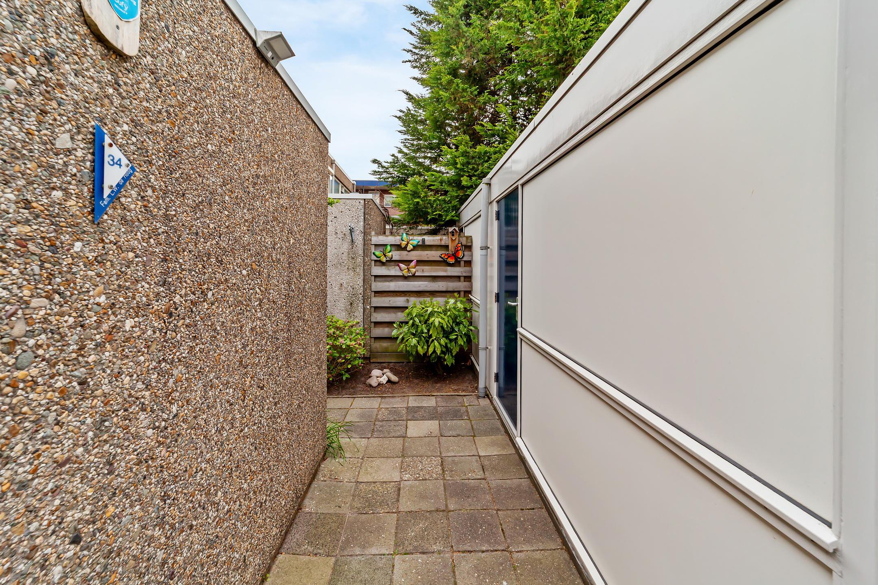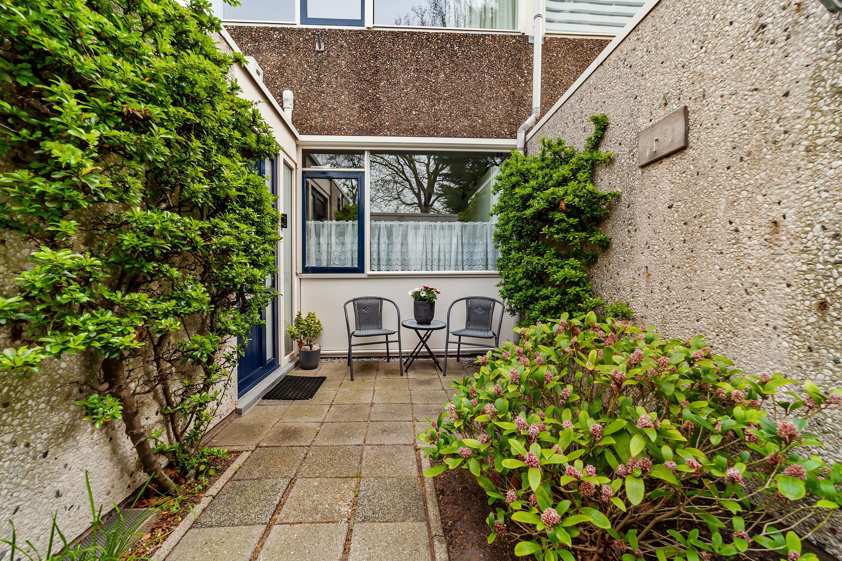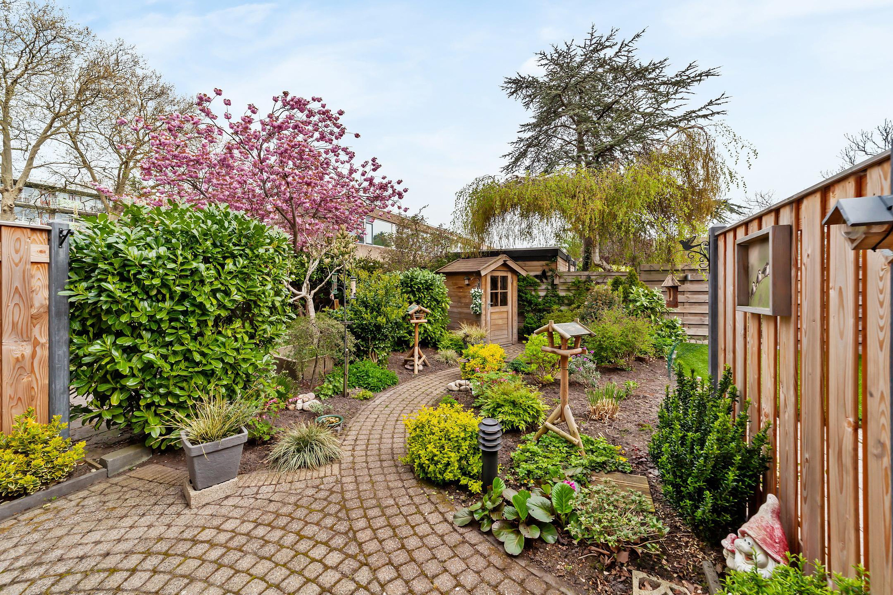 Entree via de grotendeels betegelde voortuin, waarin ook de stenen berging van ruim 10 m2 staat.