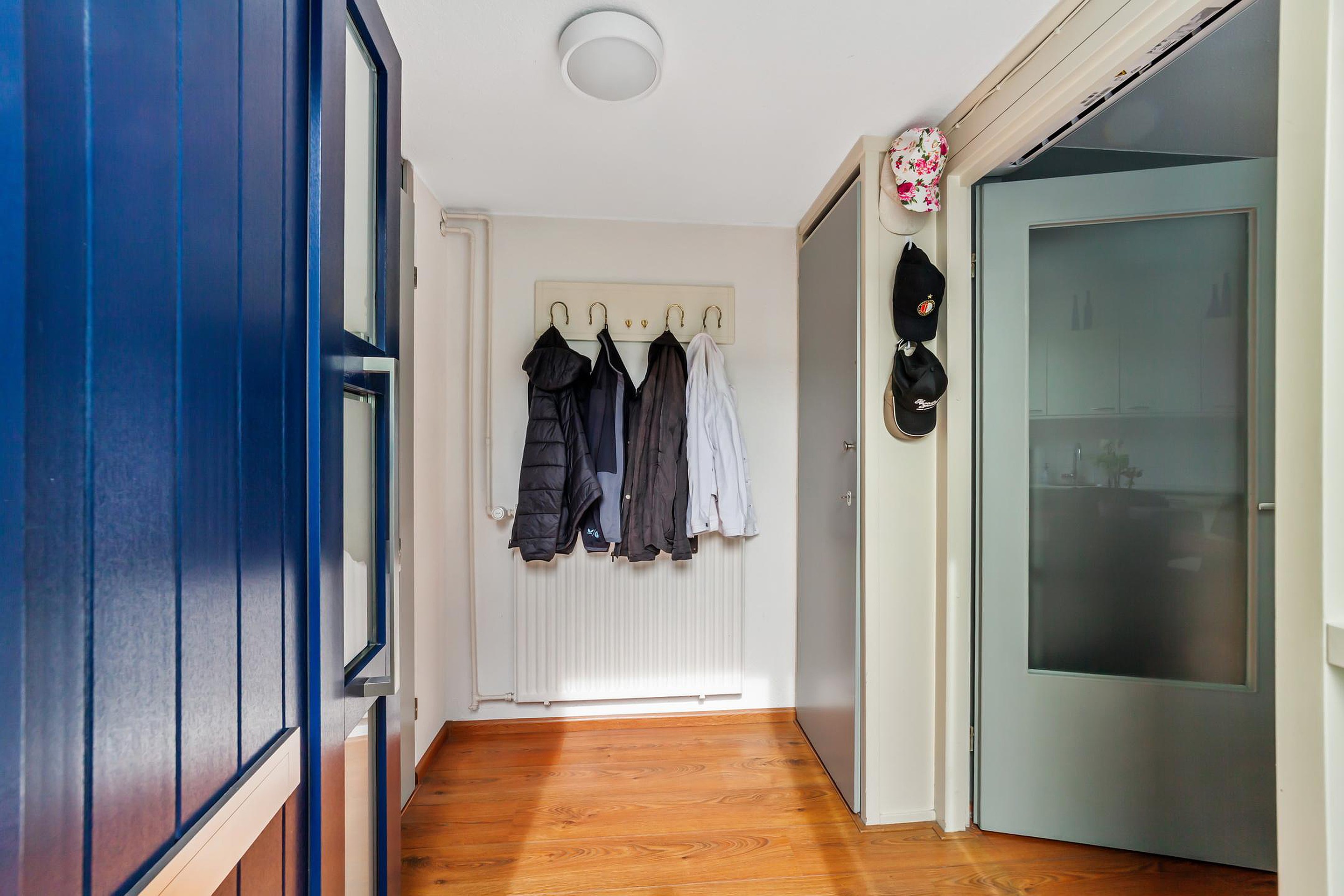 Binnenkomst in hal met garderobe, bergkast, toiletruimte, meterkast en deur naar de woonkamer met open (eet)keuken.