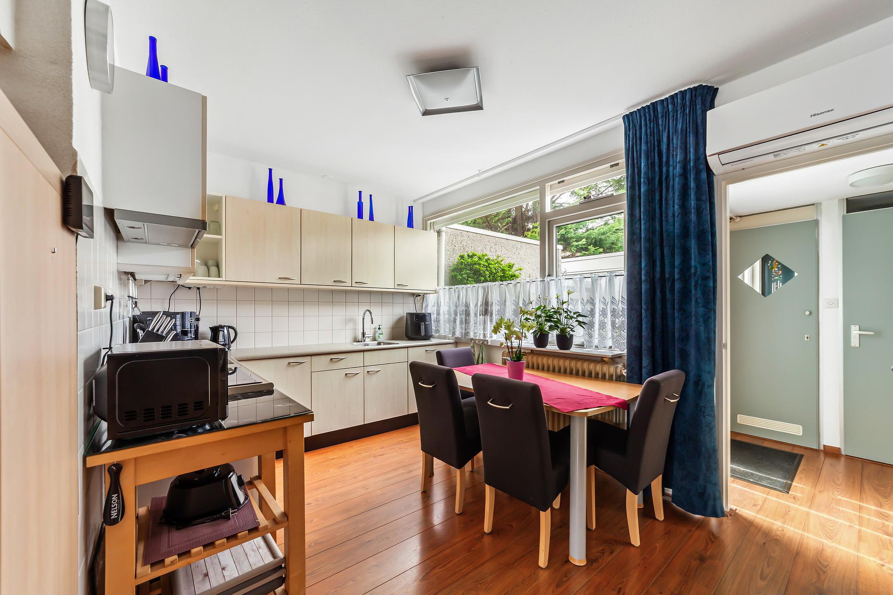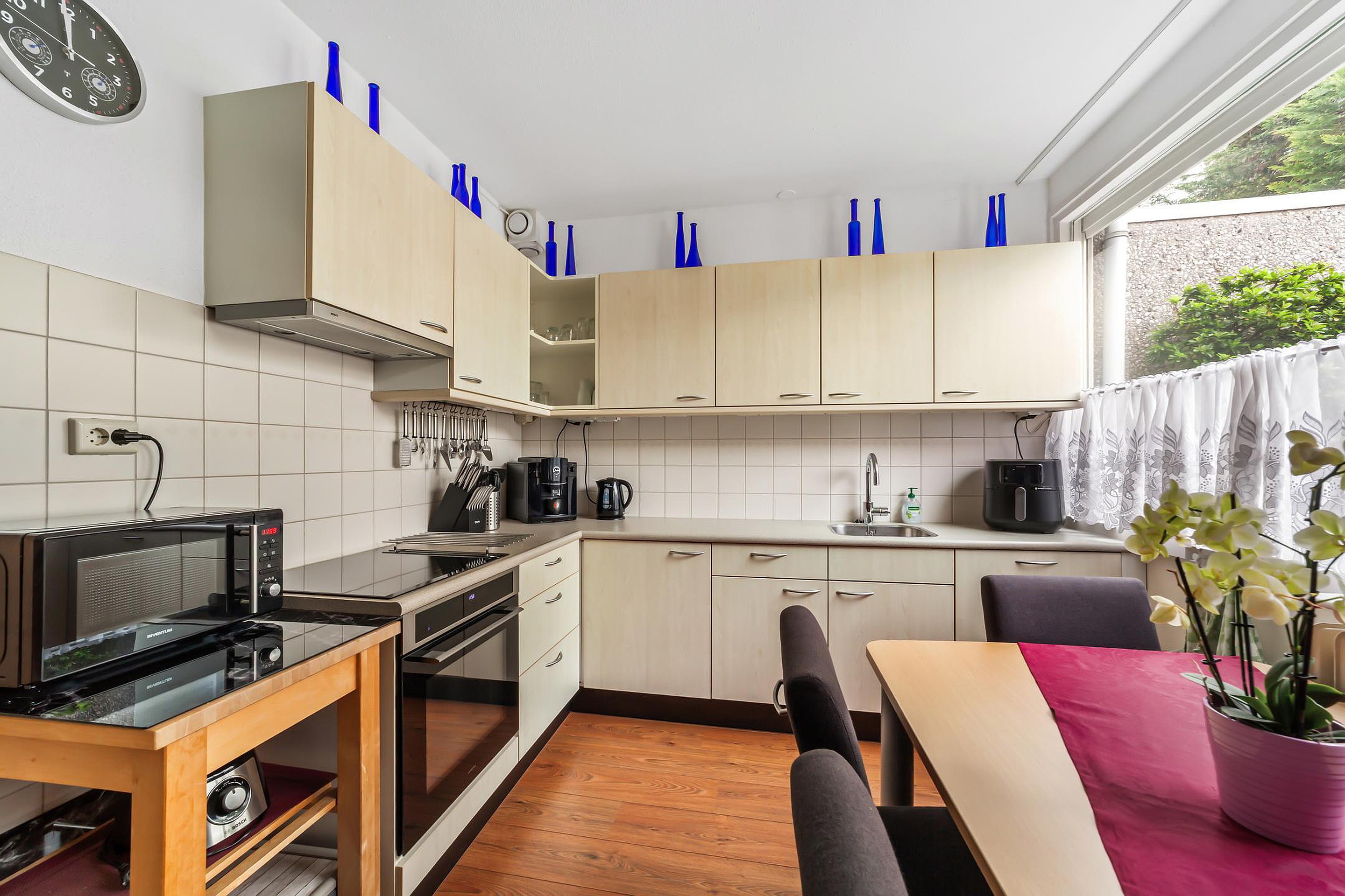 De keuken is in een hoek opgesteld en voorzien van de volgende inbouwapparatuur: elektrische kookplaat met afzuigkap, bakoven en vaatwasser.