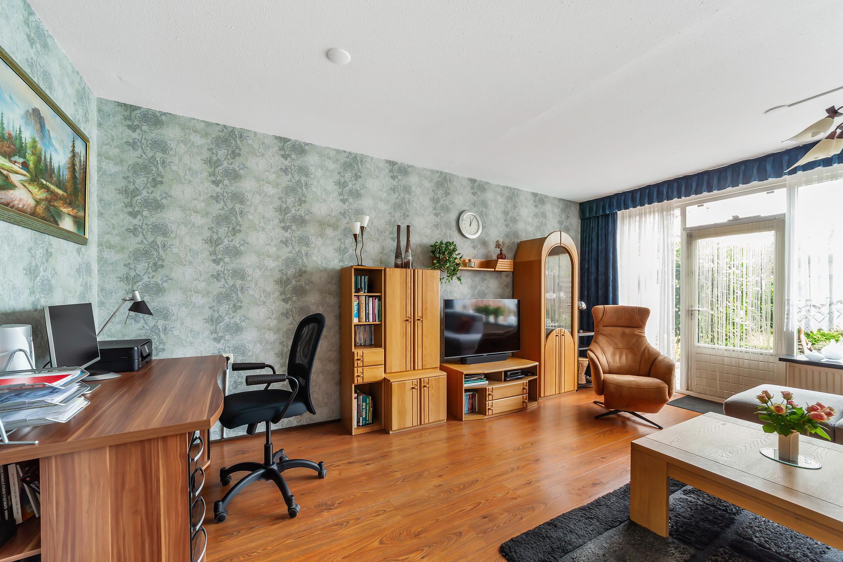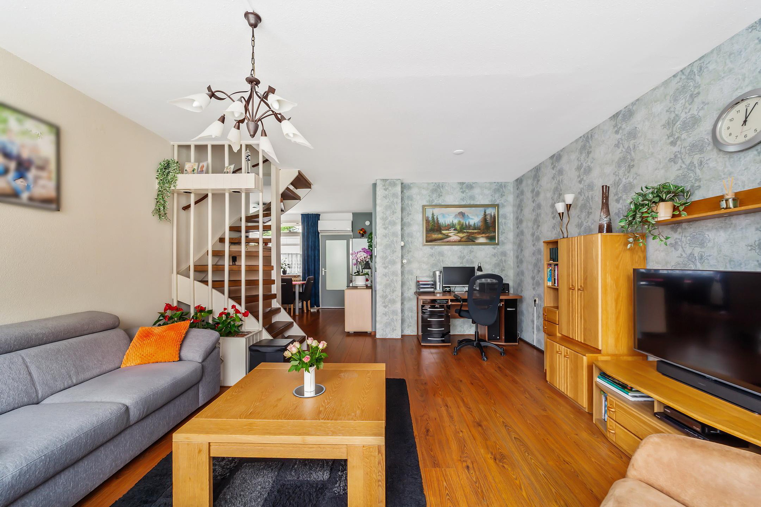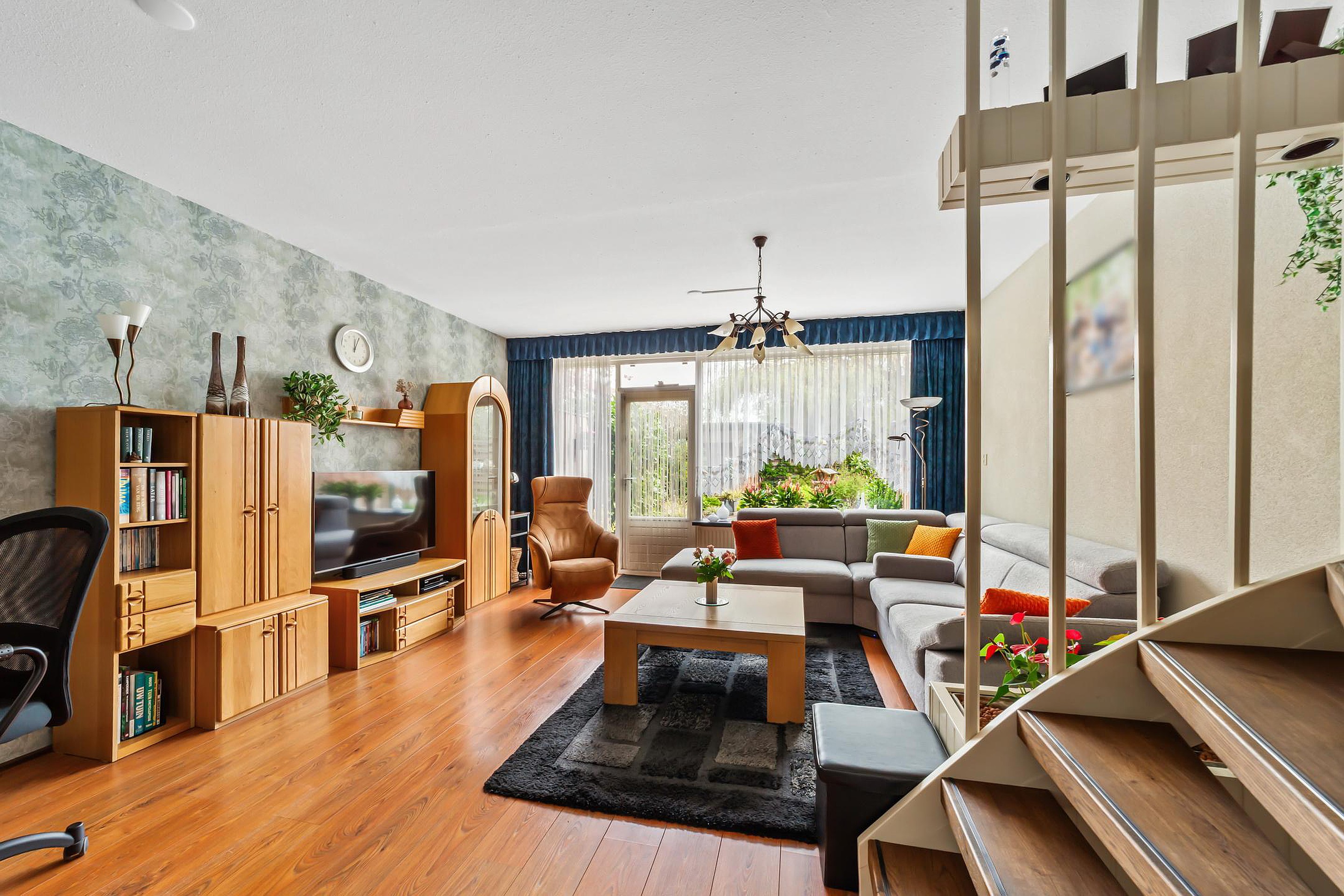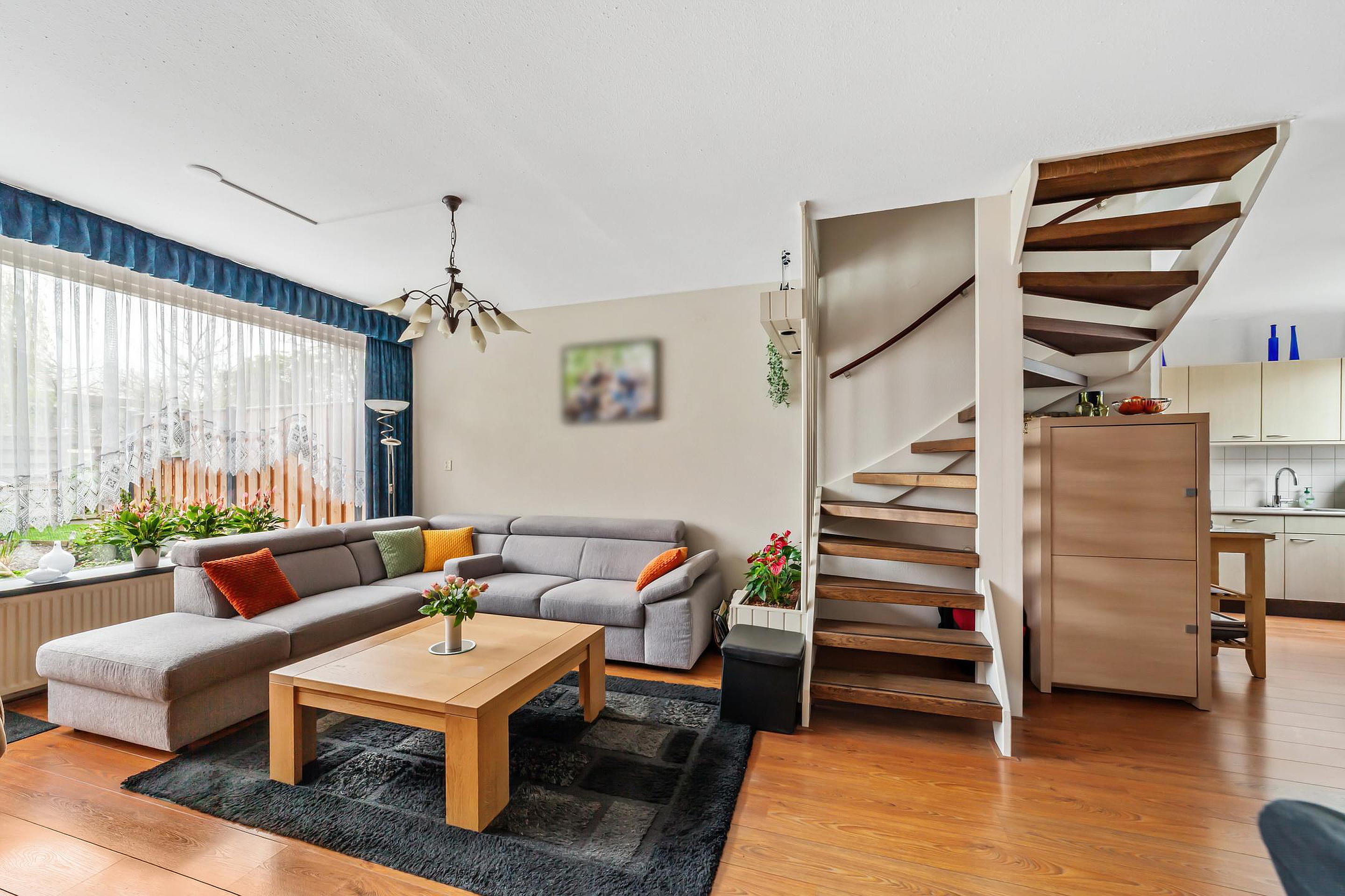 De gezellige woonkamer heeft een open trap naar de bovenverdieping en een deur naar de grote zonnige achtertuin.