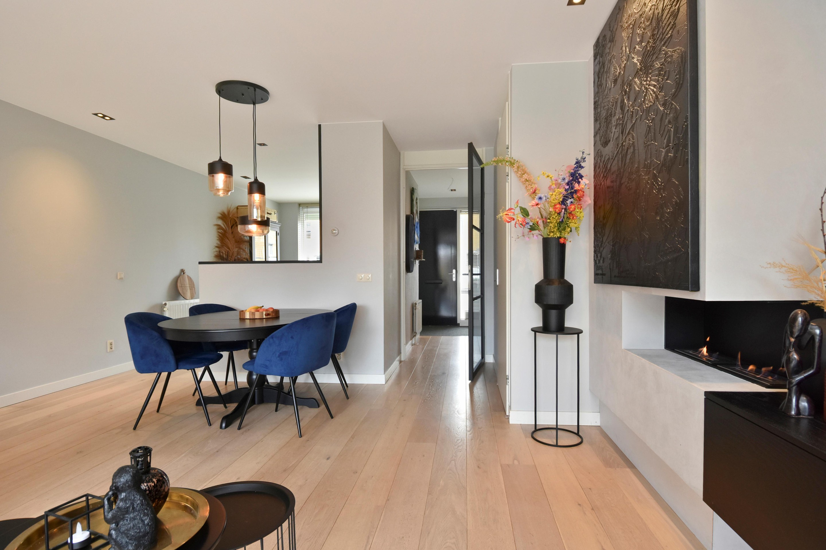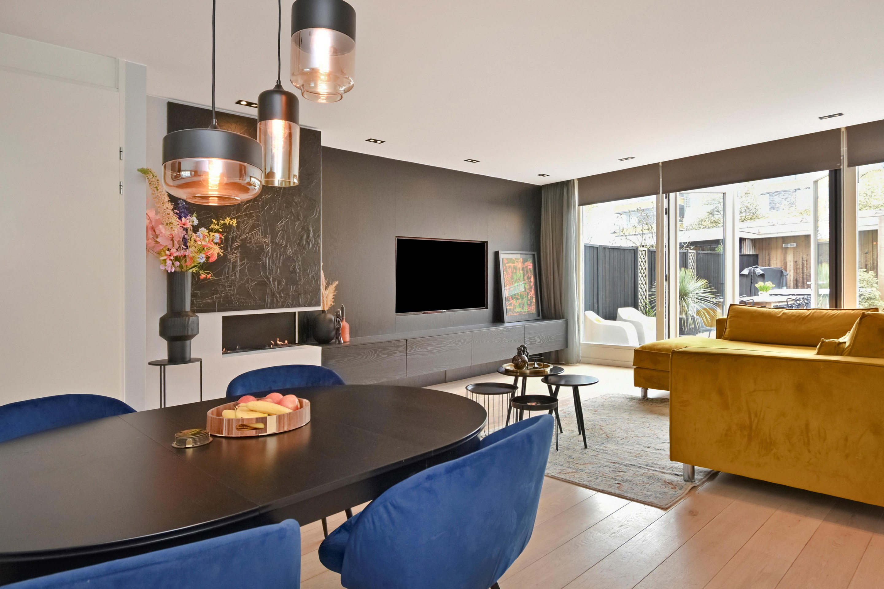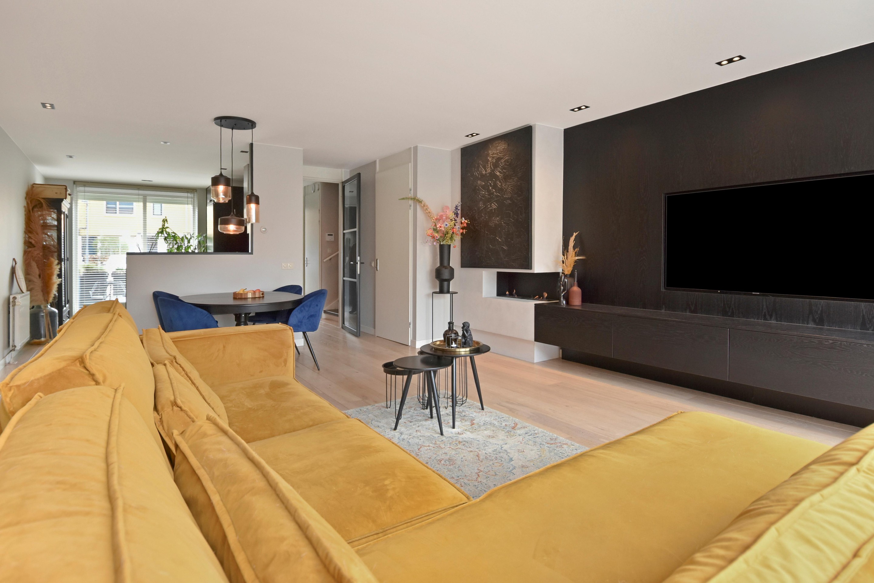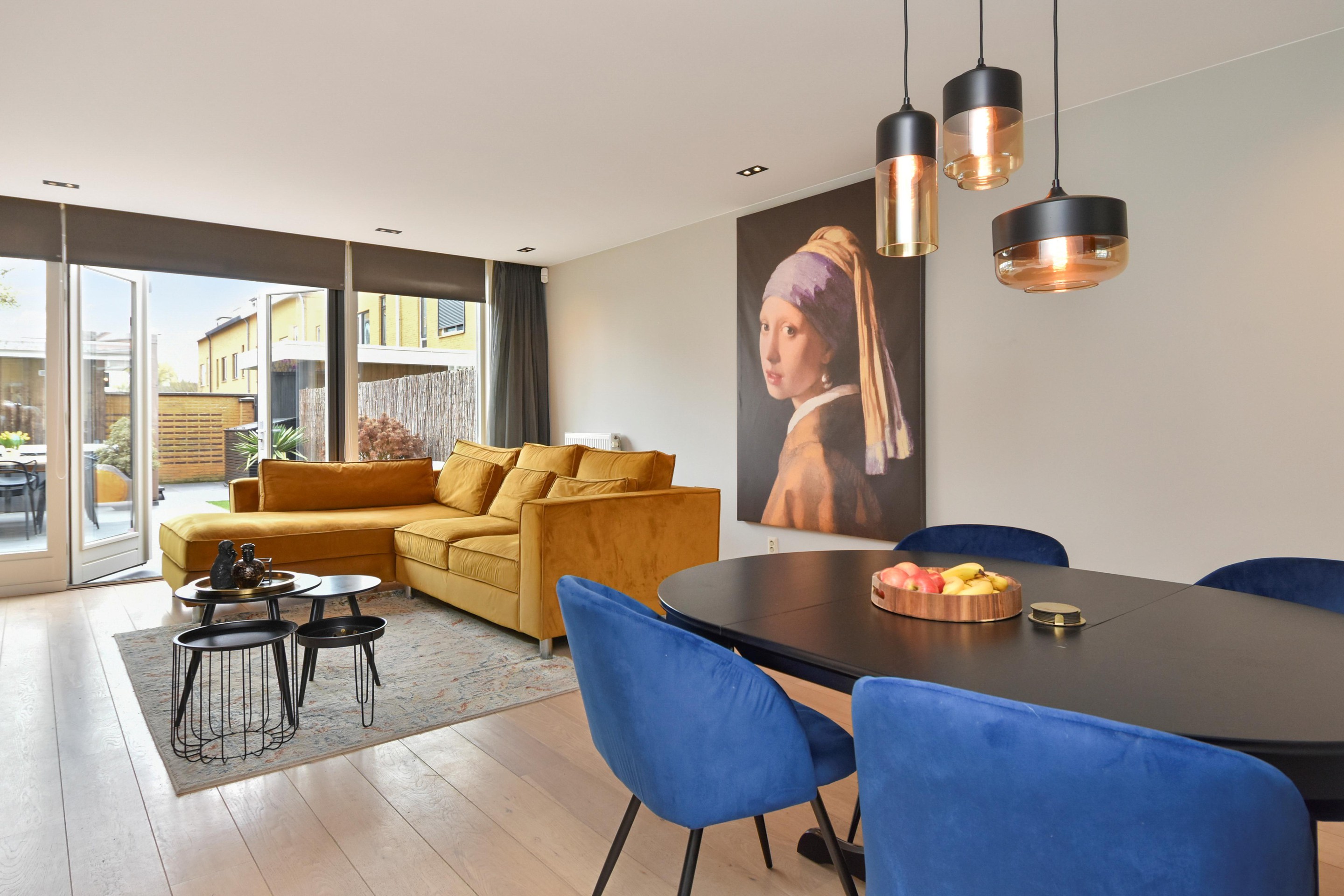 De uitgebouwde, tuingerichte woonkamer is royaal (ca. 34 m2) en kenmerkt zich door de fraaie houten vloer, sfeervolle bio-ethanol haard, praktische trapkast en openslaande deuren (met hor) naar de achtertuin.