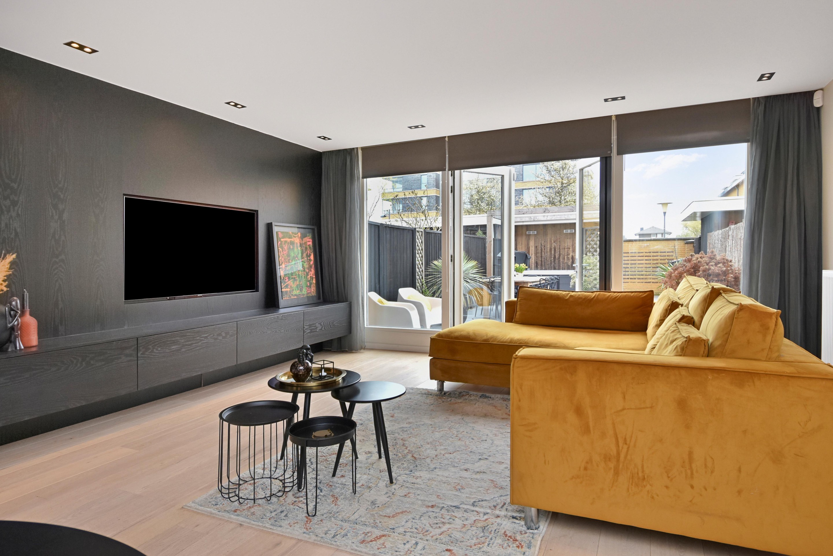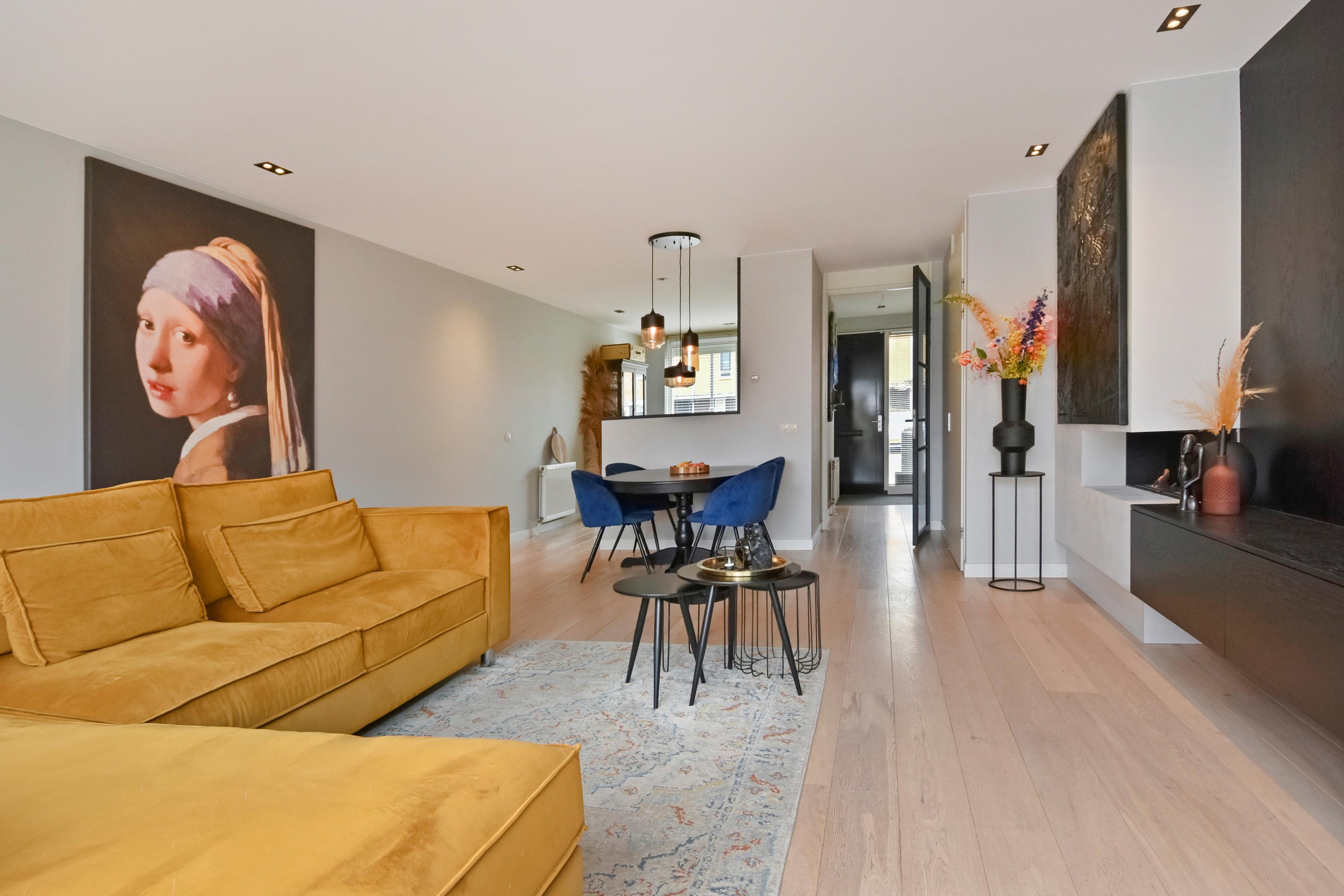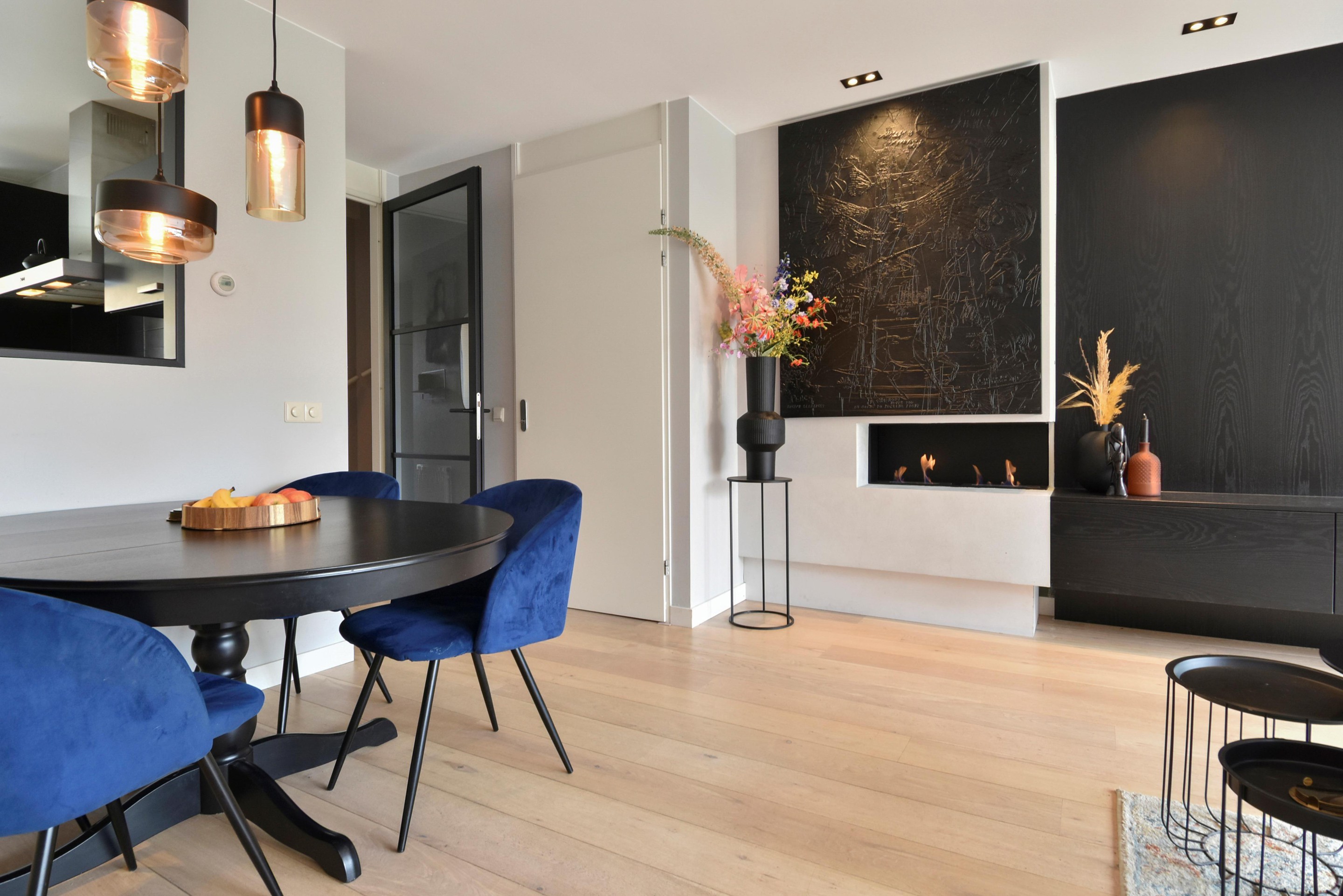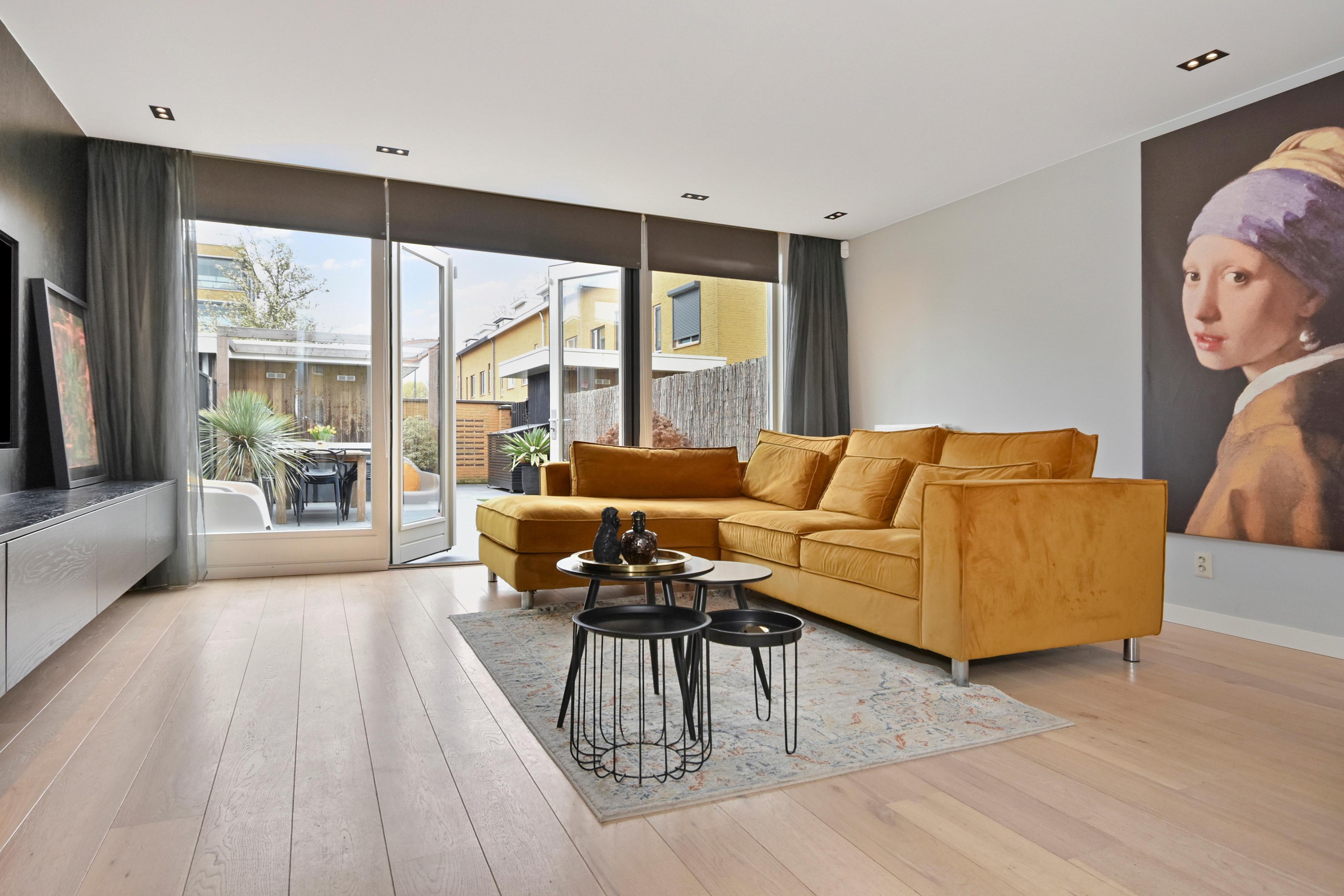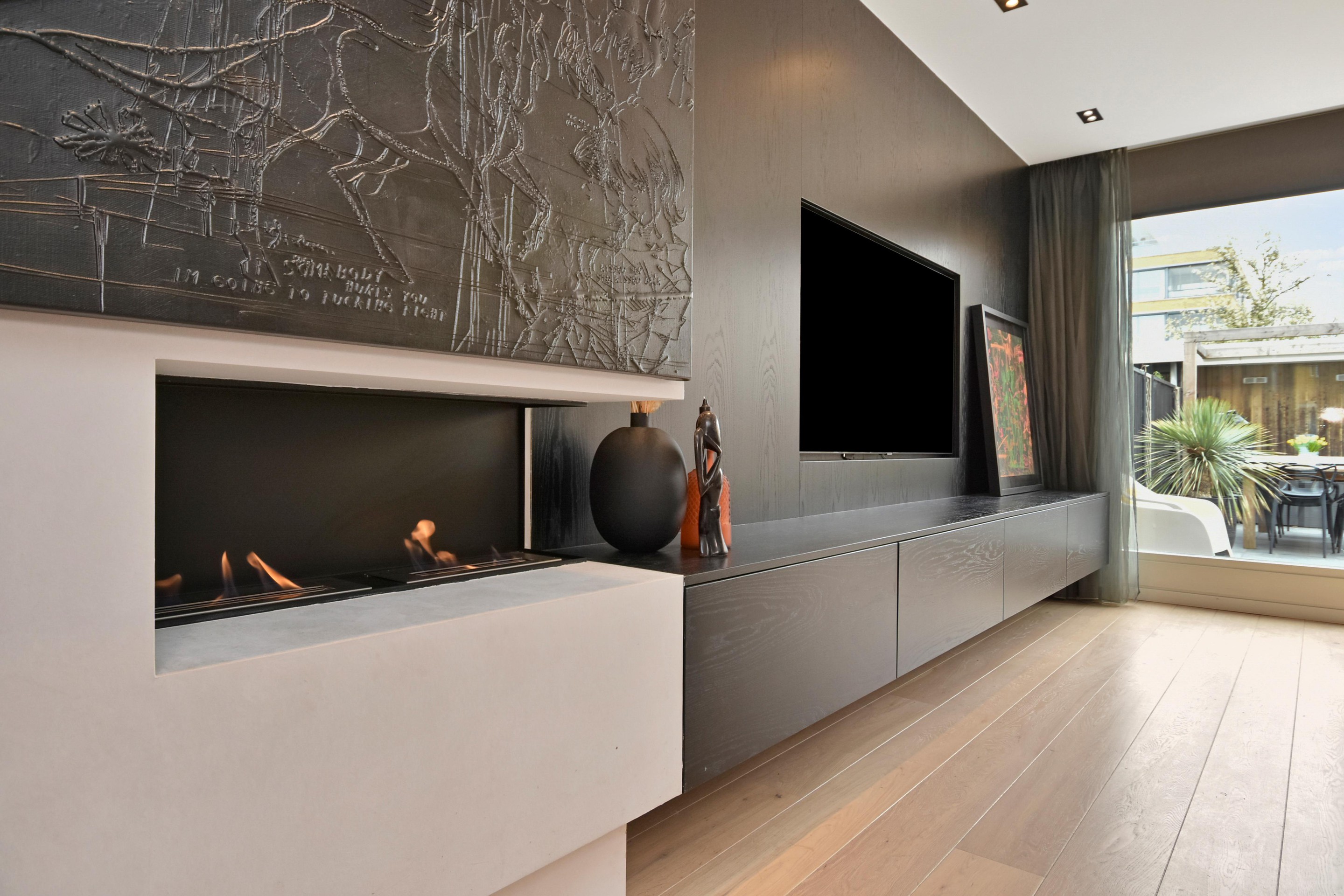 De uitgebouwde, tuingerichte woonkamer is royaal (ca. 34 m2) en kenmerkt zich door de fraaie houten vloer, sfeervolle bio-ethanol haard, praktische trapkast en openslaande deuren (met hor) naar de achtertuin.