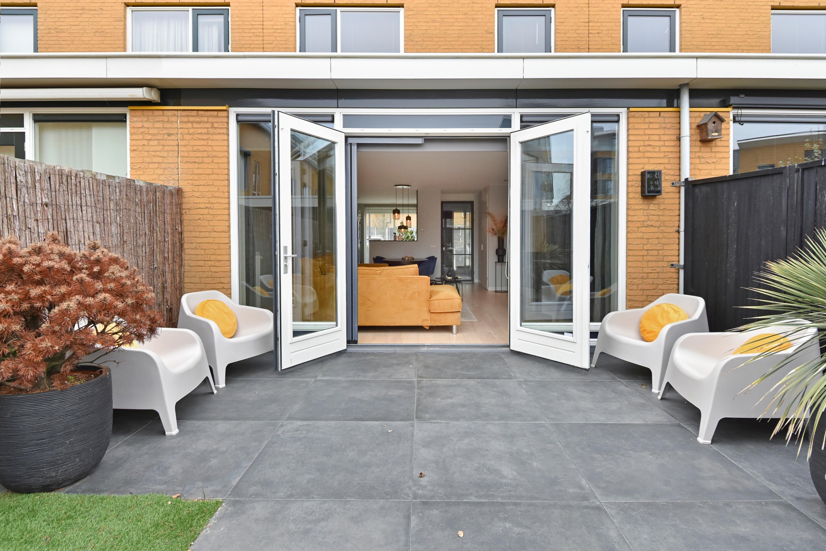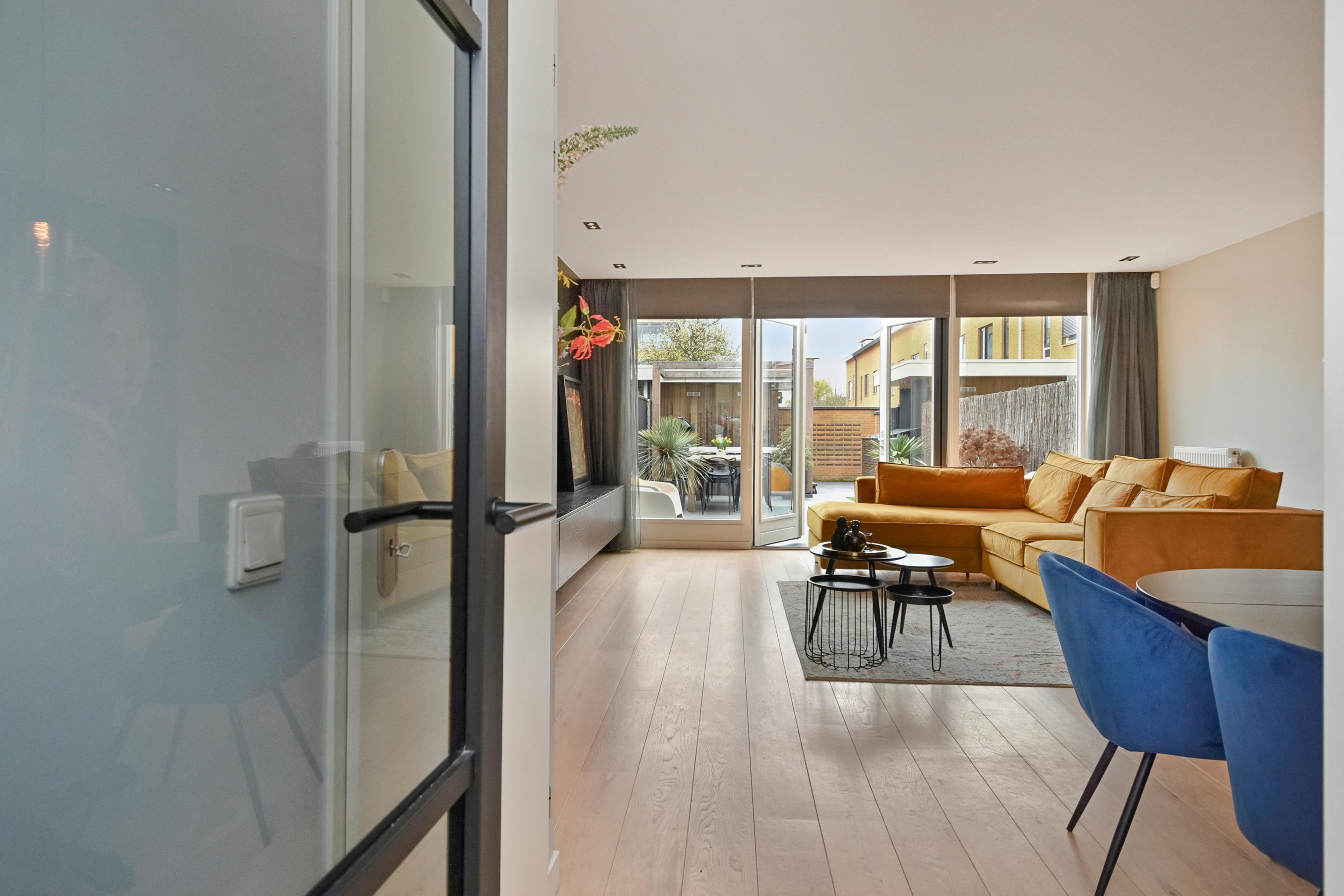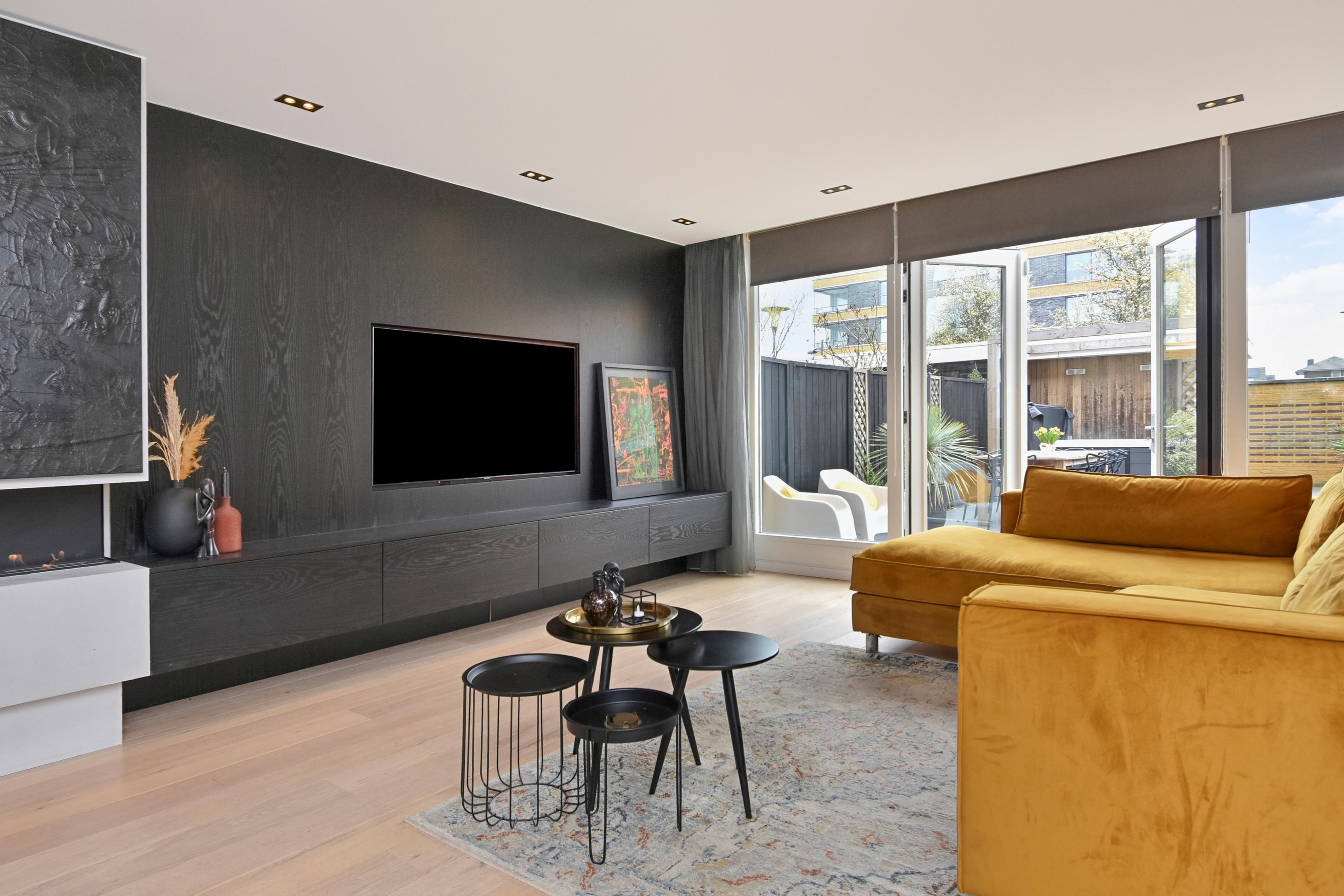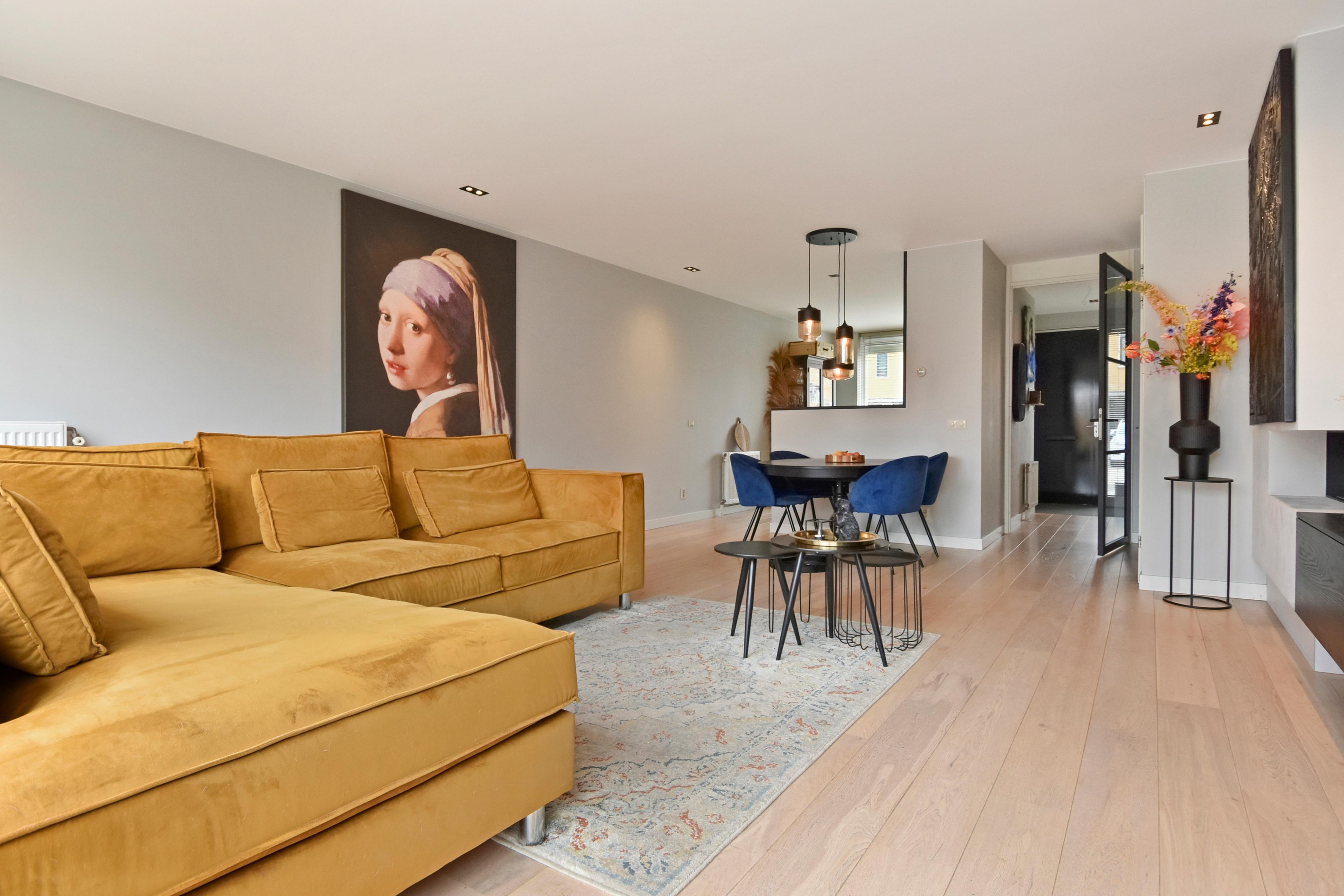 De uitgebouwde, tuingerichte woonkamer is royaal (ca. 34 m2) en kenmerkt zich door de fraaie houten vloer, sfeervolle bio-ethanol haard, praktische trapkast en openslaande deuren (met hor) naar de achtertuin.