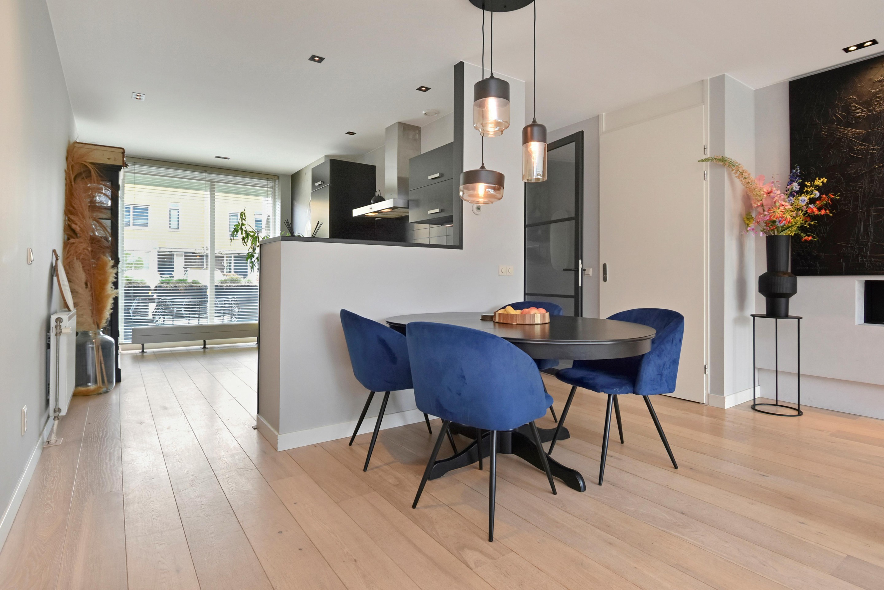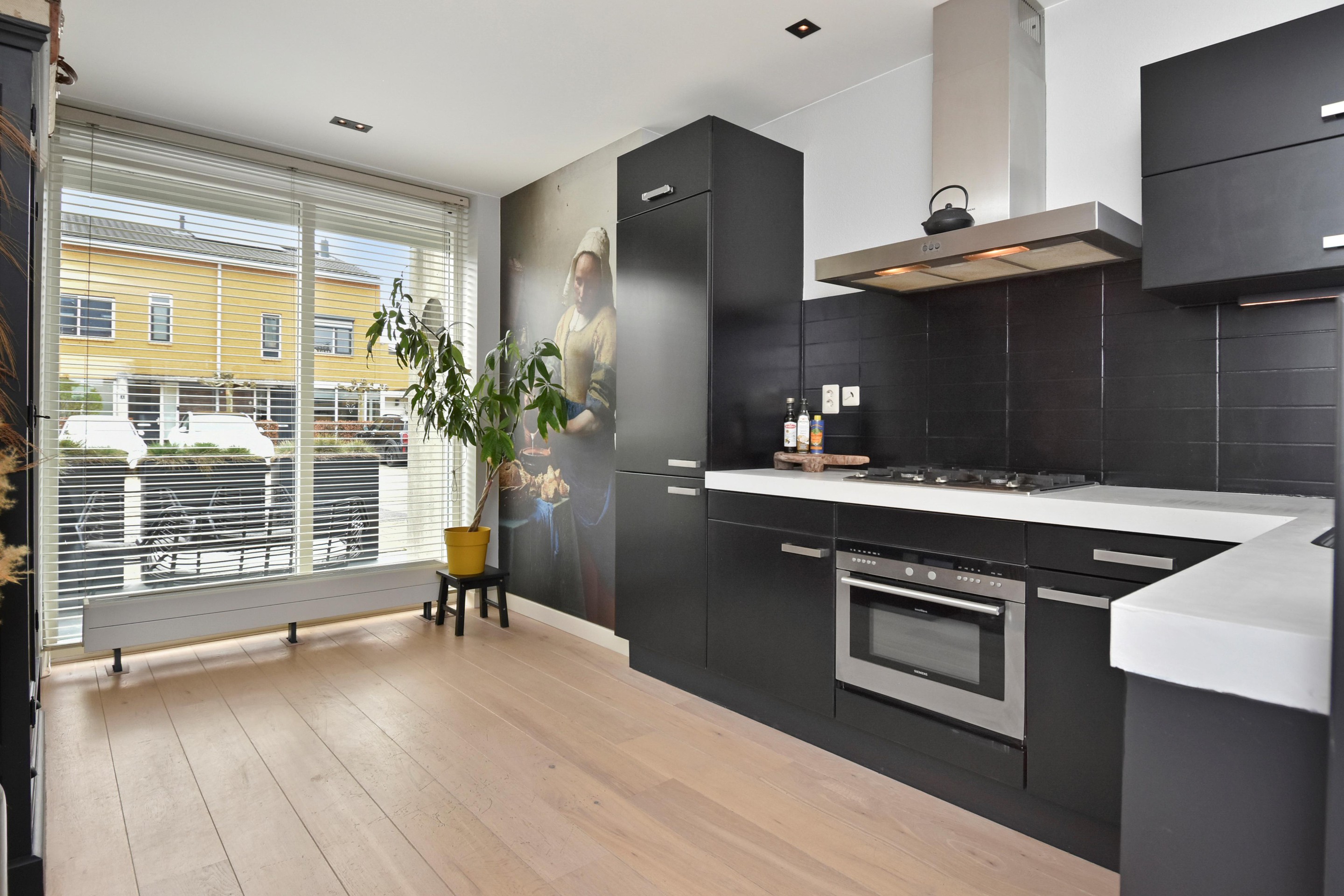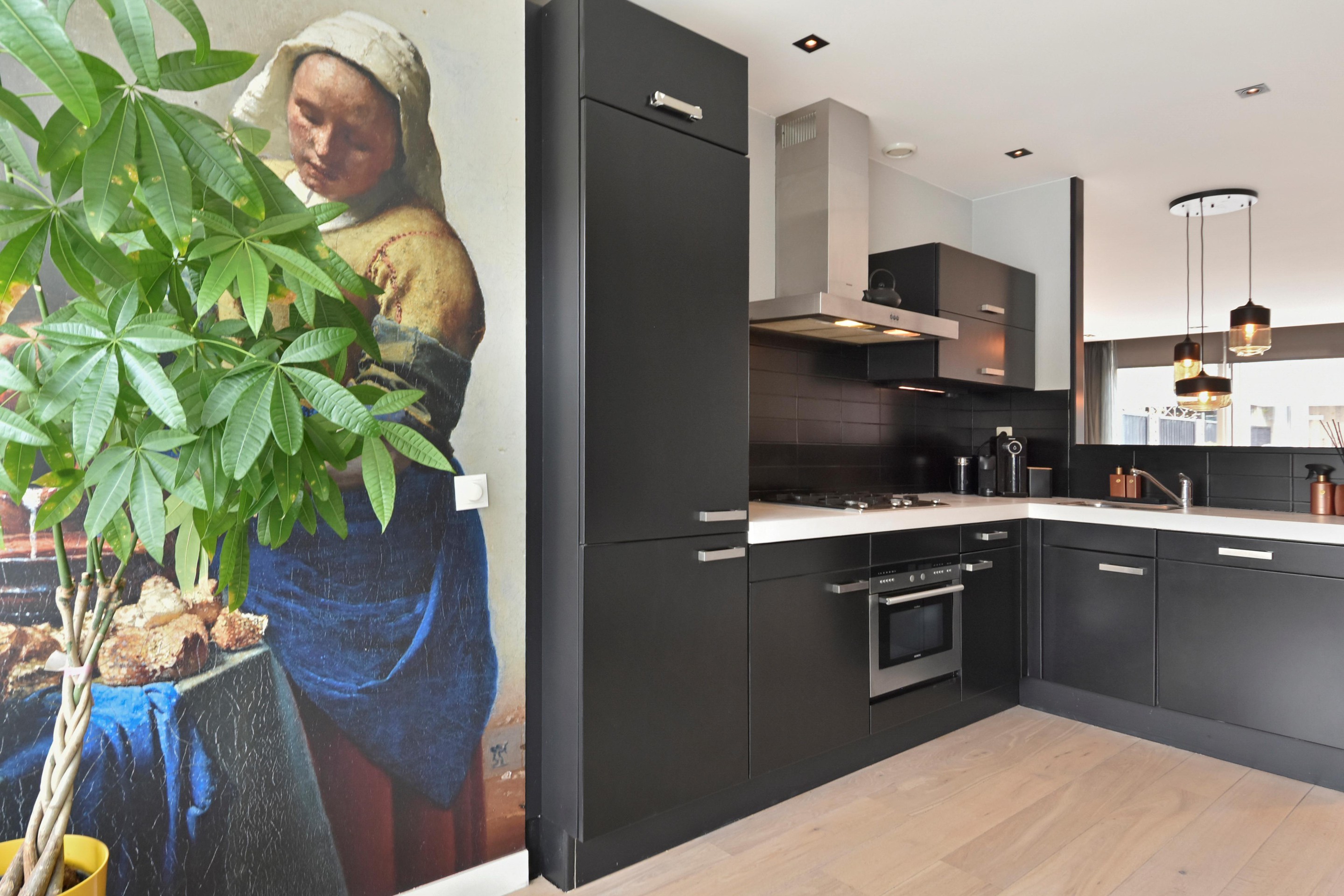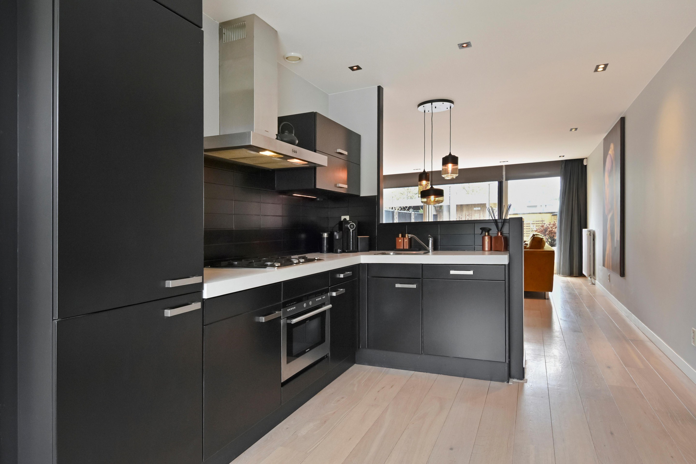 Aan de voorzijde bevindt zich de moderne keuken in L-opstelling, uitgevoerd in een donkere kleurstelling. De keuken beschikt over diverse inbouwapparatuur, waaronder een gaskookplaat, RVS afzuigkap, combi-oven, koelkast, vriezer en vaatwasser. Tevens is hier voldoende ruimte voor een gezellige eethoek.